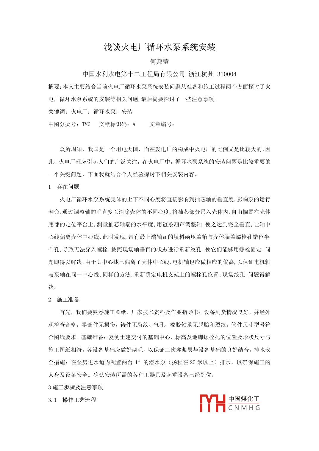 淺談火電廠循環(huán)水泵系統(tǒng)安裝何邦瑩中國水利水電第十二工程局有限公司浙江杭州310004摘要:本文主要結(jié)合當(dāng)前火電廠循環(huán)水泵系統(tǒng)安裝問題從準(zhǔn)備和施工過程兩個方面探討了火電廠循環(huán)水泵系統(tǒng)的安裝等相關(guān)問題,最后簡要探討了--些注意事項。關(guān)鍵詞:火電廠;循環(huán)水泵;安裝中圖分類號: TM6文獻(xiàn)標(biāo)識碼: A文章編號:眾所周知,我國是一個用電大國,而在發(fā)電廠的構(gòu)成中火電廠的比例又是比較大的,因此,火電廠理應(yīng)引起人們的廣泛關(guān)注,在火電廠中,循環(huán)水泵系統(tǒng)的安裝問題是比較重要的一個關(guān)鍵問題,下面我就結(jié)合個人經(jīng)驗探討下相關(guān)安裝內(nèi)容。.1存在問題火電廠循環(huán)水泵系統(tǒng)殼體的.上下不同心度將直接影響到抽芯軸的垂直度,影響泵的運行壽命,通過調(diào)整軸的垂直度以消除殼體的不同心度,將抽芯部分吊入殼體內(nèi),自由擱置在殼體底部的定位平臺上,測量抽芯軸端的水平度,用鏈條葫蘆調(diào)整軸,使之達(dá)到完全垂直,讓軸中心線偏離殼體中心線,此時發(fā)現(xiàn),帶有最上端軸瓦的填料函壓蓋箱與殼體端蓋螺栓孔錯位半個孔,導(dǎo)致無法穿入螺栓,按照現(xiàn)場軸垂直的狀態(tài)進(jìn)行重新絞孔,使它們能夠用螺栓固定,問題即得以解決。由于其中心線已偏離了殼體中心線,電機軸也應(yīng)做相應(yīng)的偏離,以保證電機軸與泵軸在同一中心線,同樣的方法,重新確定電機支架上的螺栓孔位置,現(xiàn)場絞孔,問題得解決。2施工準(zhǔn)備首先,我們要熟悉施工圖紙、廠家技術(shù)資料及作業(yè)指導(dǎo)書;設(shè)備到貨情況良好,并經(jīng)外觀檢查合格。零部件無損傷,鑄件無裂紋、氣孔,橡膠軸承無脫胎和裂紋。管件尺寸型號符合圖紙要求?;A(chǔ)準(zhǔn)備:復(fù)測土建交付的基礎(chǔ)中心、標(biāo)高及地腳螺栓孔的位置及形狀尺寸與施工圖紙相符。各設(shè)備基礎(chǔ)應(yīng)做好鑿毛,以保證二次灌漿層與設(shè)備基礎(chǔ)的良好結(jié)合。排水安全措施:在泵房進(jìn)水道內(nèi)配置兩臺4”的潛水泵(揚程在25米以上)排水,以確保施工的人身及設(shè)備安全。確認(rèn)安裝所需的各種工器具及起重設(shè)備已經(jīng)到位。3施工步驟及注意事項3.1操作工藝流程中國煤化工MHCNMH G設(shè)備清點、領(lǐng)用基礎(chǔ)驗收基礎(chǔ)檢查復(fù)測及砂漿墊塊配置↓砂漿塊檢查、驗收設(shè)備基礎(chǔ)部分就位調(diào)整設(shè)備基礎(chǔ)部分驗收|設(shè)備主體部分安裝就位輔助設(shè)備安裝就位設(shè)備管道安裝[ 管道水壓試驗單體設(shè)備調(diào)試循環(huán)水設(shè)備系統(tǒng)調(diào)試系統(tǒng)移交3.2循環(huán)水泵施 工方法和工藝1)對土建移交的基礎(chǔ)進(jìn)行復(fù)測,檢查預(yù)埋螺栓孔的中心線位置、形狀尺寸,以及基礎(chǔ)面的標(biāo)高尺寸,對過高的基礎(chǔ)面尺寸要求土建鑿至符合要求,基礎(chǔ)臺板的支承配制砂漿墊塊,砂漿塊制件方法:采用525#普通硅酸鹽水泥和干凈河砂(砂子粒度通過1. 5mm格篩,且粒度均勻)配制砂漿墊塊,砂漿材料比為水泥:砂:水=3: 3: 1。 打制砂漿前先根據(jù)砂漿塊的高度用5mm鋼板制作砂漿塊的模件。平墊鐵需自己加工,要求墊鐵邊角進(jìn)行輕微打磨,各接觸表面應(yīng)進(jìn)行機加工,使之光滑平整,平墊鐵規(guī)格為200X 100,厚度20mm。墊塊無設(shè)計布置圖,可現(xiàn)場在地腳螺栓孔旁布置兩塊砂漿塊,砂漿塊之間間隙必須大于50mm,砂漿必須搗實,在砂漿上放上平墊鐵,根據(jù)水泵的基礎(chǔ)圖,查出基礎(chǔ)墊板的二次灌漿標(biāo)高,用水準(zhǔn)儀進(jìn)行標(biāo)高的檢測,用2p榔頭柄在墊鐵上部敲打來調(diào)整墊鐵標(biāo)高、水平度,并保證墊鐵與混凝土接觸密實。取出模子后在砂漿塊外部再抹一層砂漿保證墊鐵布置的牢固,最后在砂漿塊中國煤化工外部劃上網(wǎng)格線。MHCNMH G注意點:砂漿塊需作強度試驗,試驗周期為28天,為不影響安裝工期,盡早進(jìn)行砂漿塊的制作;各平墊鐵的標(biāo)高控制在斜墊鐵可調(diào)范圍內(nèi),水平度控制為普通水平尺水泡居中,驗收合格保養(yǎng)7天后才能進(jìn)行基礎(chǔ)墊板的就位。砂漿塊制作3天后,檢查砂漿塊與基礎(chǔ)結(jié)合情況,未結(jié)合好的需重新制作。2)水泵安裝墊板安裝,將水泵墊板清理干凈,去除上面的防銹油、油漆等物,并檢查安裝墊板與基礎(chǔ)臺板結(jié)合面是否有損傷,如有損傷應(yīng)用銼刀修平。將安裝墊板吊放在基礎(chǔ)預(yù)留孔上,并穿上地腳螺栓,用斜墊鐵找平、找正,要求高程偏差< 5mm,中心偏差< 3mm,水平度< 1mm/m,然后用無收縮水泥進(jìn)行一-次灌漿, 待一次灌漿保養(yǎng) 7天以上后,可進(jìn)行水泵外.接管安裝。3)循泵外接管安裝,將已臨拋至現(xiàn)場的外接管結(jié)合面清理干凈,并檢查外接管是否有裂紋、砂眼,油漆是否良好。將葉輪室平置,然后用天車將導(dǎo)葉體吊起并連接,此時應(yīng)注意對準(zhǔn)廠家出廠時的預(yù)裝記號。(以下步驟都應(yīng)對牢記號,并在密封面上涂上密封膠,組裝完成后在結(jié)合面外側(cè)刷上防腐油漆。)將錐形接管放置水平(應(yīng)在下面放置軟墊物),小頭朝上,吊起外接管A,并將之與錐形接管相聯(lián)。將已連接好的外接