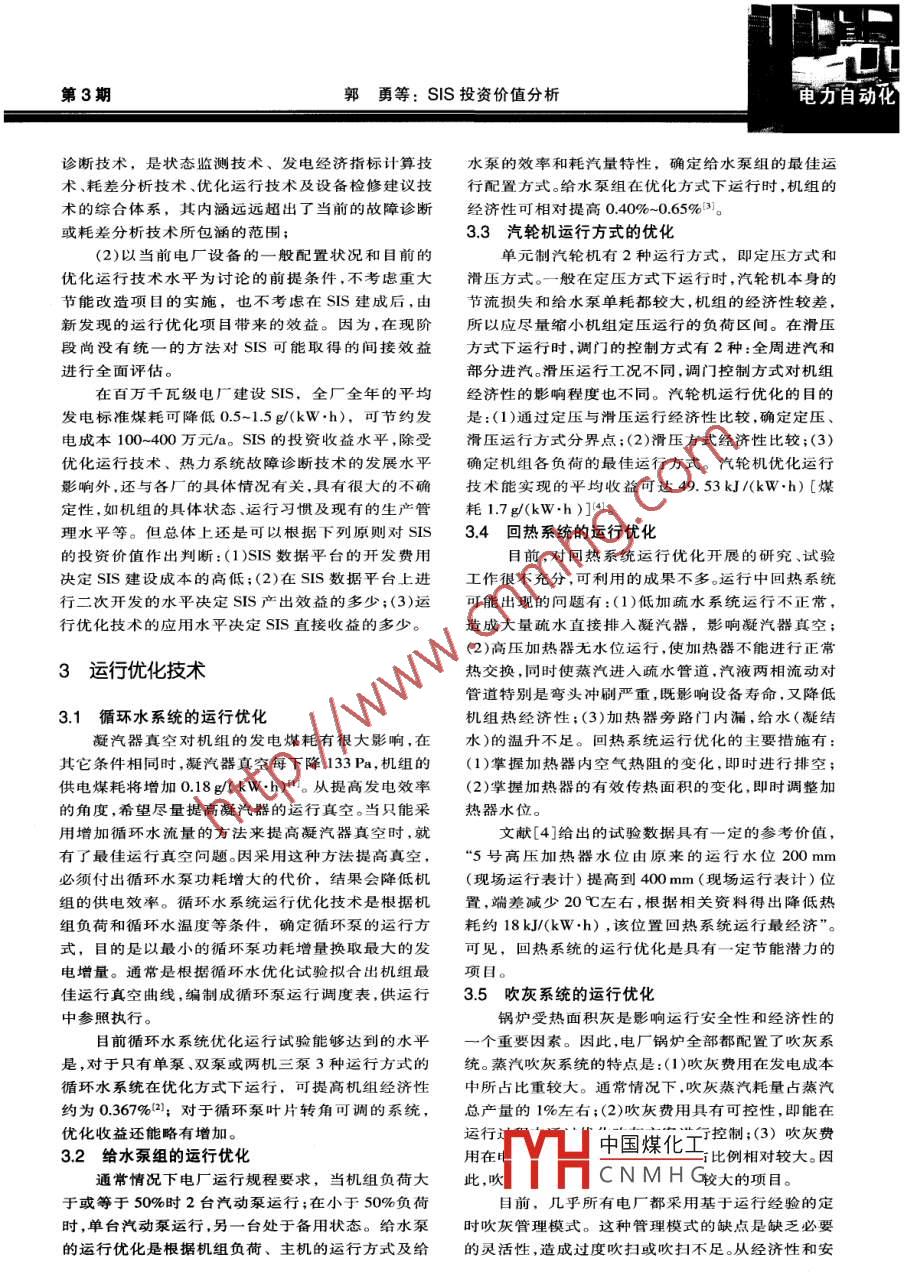第38卷第3期中國電力Vol. 38, No.3電力自動化2005年3月ELECTRIC POWERMar.2005SIS投資份值分析郭勇,楊波,李政(清華大學(xué)熱能工程系,北京100084)葡要:廠級監(jiān)控信息系統(tǒng)(SIS) 建設(shè)已逐步成為電廠信息化建設(shè)的重點項目。由于SIS的開發(fā)實施費用相對昂貴,在全部投資中所占比例也較高,因此,有必要在SIS基本功能得到實現(xiàn)的假設(shè)前提下,對SIS的投資價值進(jìn)行分析。SIS的投資收益水平取決于在SIS數(shù)據(jù)平臺上進(jìn)行的二次開發(fā)程度,特別是運行優(yōu)化技術(shù)應(yīng)用水平的高低。根據(jù)當(dāng)前鍋爐吹灰系統(tǒng)、循環(huán)水系統(tǒng)、給水泵組及汽輪機(jī)運行方式等的優(yōu)化技術(shù)的發(fā)展水平,估算SIS可能取得的投資收益是:在百萬千瓦級電廠建設(shè)SIS,全年平均發(fā)電標(biāo)準(zhǔn)煤耗可降低0.5~1.5g/(kW.h),可節(jié)約發(fā)電成本100-400萬元/a。關(guān)鍵詞:火電廠;廠級監(jiān)控信息系統(tǒng);優(yōu)化運行;投資收益中圖分類號: TM621; TM769; TK323文獻(xiàn)標(biāo)識碼: A文章編號: 1004-9649(2005 )03-0078-03廠花費巨資建設(shè)SIS,不應(yīng)僅是一塊發(fā)電成本表,還0引言應(yīng)是一臺發(fā)電成本分析儀。SIS 應(yīng)能準(zhǔn)確分析出造成成本增大的原因,利用現(xiàn)有的優(yōu)化運行技術(shù),最大現(xiàn)代大型火電廠無一例外地采用了“單元控制,限度地降低運行成本。如運行優(yōu)化措施取得的效果全廠管理”的經(jīng)營模式。在單元控制層(DCS層)和不理想,SIS還應(yīng)支持“發(fā)電成本擾動試驗”,即解除經(jīng)營管理層(MIS層)之間增加SIS層,進(jìn)行全廠生一些自動控制回路,人工調(diào)整機(jī)組的運行方式,有計產(chǎn)的實時管理是必然也是必要的。目前,針對SIS的劃地改變發(fā)電成本。通過發(fā)電成本擾動試驗,對DCS用途、功能及實施方案等問題進(jìn)行的研究逐漸增多、的參數(shù)控制曲線進(jìn)行優(yōu)化,開發(fā)出新的運行優(yōu)化項逐步深人且研究水平不斷提高。但就SIS投資價值目。從這個意義上,SIS應(yīng)能提供在線性能試驗功能。開展的研究工作尚顯不足。本文嘗試從應(yīng)用的角度,(3)SIS應(yīng)是一臺設(shè)備健康狀況的“顯微鏡"。即使SIS對SIS的投資收益及收益實現(xiàn)途徑等問題進(jìn)行探不能判斷出設(shè)備的剩余壽命,但至少應(yīng)能準(zhǔn)確地判討,目的是為電廠進(jìn)行SIS投資的決策提供參考。斷出管道、閥門的泄漏程度,換熱器的結(jié)垢.污染程度,為設(shè)備維護(hù)決策提供可靠的技術(shù)數(shù)據(jù)。1SIS的作用.2 SIS的投資價值目前,SIS的規(guī)劃功能盡管提法各異,但內(nèi)容基本相同。普遍認(rèn)為SIS應(yīng)該具備:狀態(tài)監(jiān)測、發(fā)電煤到目前為止,尚未能全面地對已完成的SIS項耗計算、熱力系統(tǒng)經(jīng)濟(jì)故障診斷(或耗差分析)、制定目進(jìn)行較深人的總結(jié)和分析,在這種情況下,能用來優(yōu)化運行策略及提供設(shè)備檢修建議等功能。SsIs 在直接驗證SIS投資價值的實際數(shù)據(jù)非常有限。因此,電廠應(yīng)發(fā)揮3個層次的作用:(1)SIS首先應(yīng)當(dāng)是一對SIS投資價值的探討在很大程度上是原則性的,塊“發(fā)電成本核算表”。sIs 計算的發(fā)電成本應(yīng)能像是對SIS投資價值的估算,盡管如此,這項工作仍是熱電偶測量的溫度一-樣準(zhǔn)確可靠、可信。這樣就可有意義和有價值的。為能將分析的不確定性減小到將發(fā)電成本核算表與發(fā)電功率表、汽輪機(jī)轉(zhuǎn)速表一最低,需做如下約定:起,掛在主控室最顯眼的地方,讓人隨時看到發(fā)電成(1)假設(shè)目前規(guī)劃的SIS功能基本能實現(xiàn),至少本。有了sIS,發(fā)電成本不再僅是生產(chǎn)報表中的一個要實中國煤化工故障診斷功能;否則數(shù)據(jù),而能成為一個重要的運行監(jiān)視參數(shù)。(2)SIS就s里所指的熱力系統(tǒng)應(yīng)是一臺在線的“成本分析儀”或“性能試驗機(jī)”。電故陴YHCNMHG臺的熱力系統(tǒng)故障收稿日期: 2004-10-15; 修回日期: 2004-12-30作者簡介:郭勇(1969-), 男,江蘇鎮(zhèn)江人,碩士研究生,從事熱力系統(tǒng)故障診斷研究。E-mail: guoyong02@mailstsinghua.edu.cn78第3期郭勇等: SIS投資價值分析電力自動化診斷技術(shù),是狀態(tài)監(jiān)測技術(shù)、發(fā)電經(jīng)濟(jì)指標(biāo)計算技水泵的效率和耗汽量特性,確定給水泵組的最佳運術(shù)、耗差分析技術(shù).優(yōu)化運行技術(shù)及設(shè)備檢修建議技行配置方式。給水泵組在優(yōu)化方式下運行時,機(jī)組的術(shù)的綜合體系,其內(nèi)涵遠(yuǎn)遠(yuǎn)超出了當(dāng)前的故障診斷經(jīng)濟(jì)性可相對提高0.40%~0.65%田?;蚝牟罘治黾夹g(shù)所包涵的范圍;3.3 汽輪機(jī)運行方式的優(yōu)化(2)以當(dāng)前電廠設(shè)備的一般配置狀況和目前的單元制汽輪機(jī)有2種運行方式,即定壓方式和優(yōu)化運行技術(shù)水平為討論的前提條件,不考慮重大滑壓方式。一般在定壓方式下運行時,汽輪機(jī)本身的節(jié)能改造項目的實施,也不考慮在SIS建成后,由節(jié)流損失和給水泵單耗都較大,機(jī)組的經(jīng)濟(jì)性較差,新發(fā)現(xiàn)的運行優(yōu)化項目帶來的效益。因為,在現(xiàn)階所以應(yīng)盡量縮小機(jī)組定壓運行的負(f