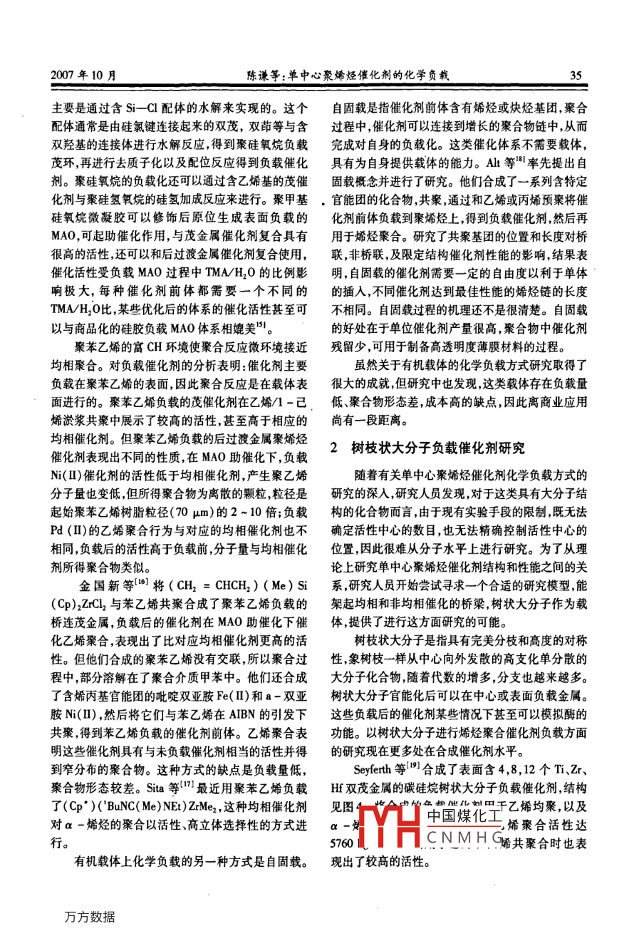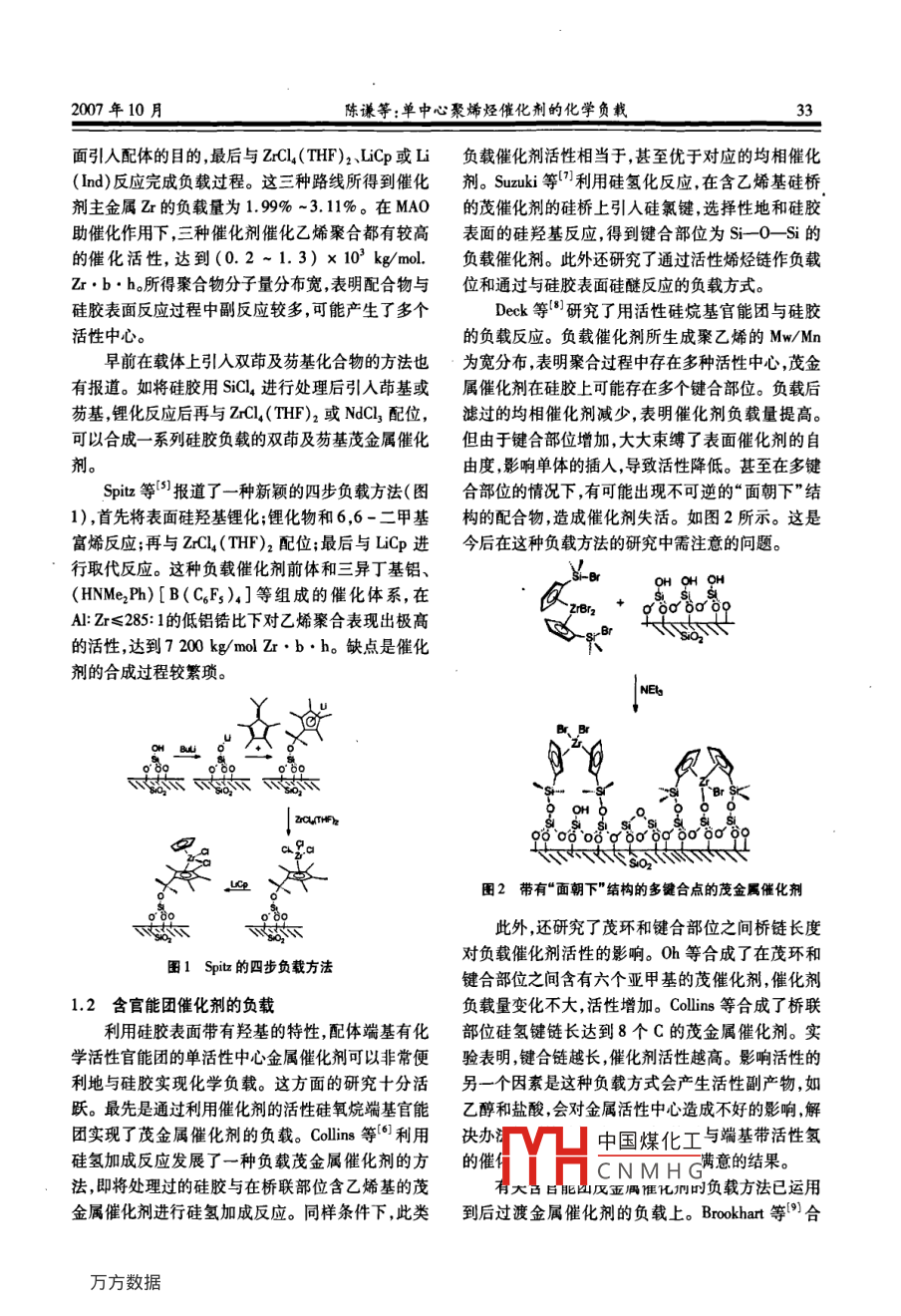化工科技市場第30卷第10期32CHEMICAL TECHNOLOGY MARKET2007年10月單中心聚烯烴催化劑的化學負載.陳謙',汪永強,孫淑坤'(1.中國石油大慶化工研究中心,黑龍江大慶163714;2.中國石油大慶石化總廠實業(yè)公司)摘要:本文介紹 了近幾年國內(nèi)外在單中心聚烯烴催化劑負載化方面的研究進展。關鍵詞:單中心催化劑;茂金屬催化劑;后過渡金屬催化劑;載體中圖分類號:TQ314.242文獻標識碼:A 文章編號 :1009 - 4725(2007)10 -0032 -006Research advances in supported single - site catalysts by chemical fashionChen Qian' ,Wang Yongqiang2 ,Sun Shukun'(1. Daqing Chemical Research Center ,Cnpc ,Daqing Heilongiang 163714, China;2. Longhua Newo Industry of Daqing Petrochemical Corporation,CNPC)Abstract:The recent advances in the chemical fashion spporting methods study of the single - site catalysts , includingthe melallocene catalyst and the late transition metal catalysts , are reviewed.Key words :single - site calytsmeallocenenetal catalyst;later transtion metal calytsupport茂金屬、后過渡金屬催化劑是近年來發(fā)展起來心的分布規(guī)律等進行了模擬研究,目前還處于概念的單活性中心催化劑,其具有初始活性高的特點,因階段。此為適應工業(yè)生產(chǎn)裝置要求,有關單活性中心聚烯1化學負載方式烴催化劑負載化的研究越來越受到重視。圍繞提高負載催化劑活性,負載催化劑形態(tài)優(yōu)化,提高產(chǎn)物的1.1 在載體表面引入配體的負載方式堆密度等問題,已研究探討了大量的負載化技術。1980年Slofildt - Ellingesn 等[1] 最先嘗試將早期研究的負載方式主要是物理方式,如物理吸附CpzZrCl2負載在硅膠上以來,硅膠仍是目前使用最法。研究中發(fā)現(xiàn),這種方式得到的負載催化劑,在聚多的無機載體。與其他載體相比,硅膠具有鹵化物合過程中活性中心脫落的現(xiàn)象比較嚴重,從而影響殘留低、無腐蝕性、聚合活性均一、催化劑生產(chǎn)成本到樹脂的顆粒形態(tài),因此近期有關負載單中心聚烯低等優(yōu)點。目前各種顆粒大小、各種孔徑和各種比烴催化劑的研究大多采用化學負載方式。目前單中表面積的SiO2用于催化劑載體的嘗試均見報道,最心催化劑的化學負載使用最多的仍是無機載體,主常用的SiO2顆粒大小為50 ~ 100 μm。國內(nèi)外的研要利用硅膠表面帶有羥基的特性實現(xiàn),主要有兩種究者們嘗試在硅膠表面上引人各種可能的反應基團化學負載方法:---種是先將硅膠表面羥基進行修飾,實現(xiàn)催化劑的負載。Pekkanen 等[2首先在硅膠表引入配體,再與金屬化合物反應,得到負載催化劑;面上引入茂環(huán),再將這種含茂環(huán)硅膠用BuLi處理,另一種方法是先合成帶選擇性反應官能團的催化最后與ZrCI,(THF)2,CpZrCl,或CrCI](THF);反應劑,再將其與硅膠表面進行反應而實現(xiàn)負載。利用得到負載催化劑前體。這樣逐步構建配體的方法,有機載體實現(xiàn)化學負載的研究嘗試也得以進行,但可有效地實現(xiàn)茂金屬催化劑前體在硅膠上的負載。與采用無機載體相比,總體負載效果不佳。為找到.Herm:中國煤化工茚環(huán),再與CpZr更好的單中心聚烯烴催化劑的化學負載方式,研究(NM:MHCN M H G化利前體:Boissos者們還利用樹狀大分子負載方法,對茂金屬和后過等[41將硅膠與SiMe,U2在NEt,存在下反應,再與渡金屬這類具有大分子結構的催化劑負載后活性中,LiCp或Li(Ind)進行置換反應,從而達到在硅膠表2007年10月陳謙等:單中心聚烯烴催化劑的化學負載33面引人配體的目的,最后與ZrCl,(THF)2、LiCp或Li負載催化劑活性相當于,甚至優(yōu)于對應的均相催化(Ind)反應完成負載過程。這三種路線所得到催化劑。Suzuki 等"利用硅氫化反應,在含乙烯基硅橋劑主金屬Zr的負載量為1.99% ~3. 11%。在MAO的茂催化劑的硅橋上引入硅氯鍵,選擇性地和硅膠助催化作用下,三種催化劑催化乙烯聚合都有較高表面的硅羥基反應,得到鍵合部位為Si-0- -Si 的.的催化活性,達到(0.2 ~ 1.3) x 103 kg/mol.負載催化劑。此外還研究了通過活性烯烴鏈作負載Zr. b. h。所得聚合物分子量分布寬,表明配合物與位和通過與硅膠表面硅醚反應的負載方式。硅膠表面反應過程中副反應較多,可能產(chǎn)生了多個Deck等['8]研究了用活性硅烷基官能團與硅膠活性中心。.的負載反應。負載催化劑所生成聚乙烯的Mw/Mn早前在載體上引入雙茚及芴基化合物的方法也為寬分布,表明聚合過程中存在多種活性中心,茂金有報道。如將硅膠用SiCl,進行處理后引入茚基或?qū)俅呋瘎┰诠枘z上可能存在多個鍵合部位。負載后芴基,鋰化反應后再與ZrCl,(THF)2或NdCl3配位,濾過的均相催化劑減少,表明催化劑負載量提高??梢院铣?-系列硅膠負載的雙茚及芴基茂金屬催化但由于鍵合部位增加,大大束縛了表面催化劑的自劑。由度,影響單體的插人,導致活性降低。甚至在多鍵Spitz等'報道了一種新穎的四步負載方法(圖合部位的情況下,有可能出現(xiàn)不可逆的“面朝下”結1),首先將表面硅羥基鋰化;鋰化物和6,6-二甲基構的配合物,造成催化劑失活。如圖2所示。這是富烯反應;再與ZrCI4(THF)2配位;最后與LiCp進今后在這種負載方法的研究中需注意的問題。行取代反應。這種負載催化劑前體和三異丁基鋁、Si-BrOH OH QH(HNMe2Ph) [B(CEs).]等組成的催化體系,在+σδo6o80A: Zτ≤285: 1的低鋁鋯比下對乙烯聚合表現(xiàn)出極高的活性,達到7200 kg/mol Zr .b.h。缺點是催化劑的合成過程較繁瑣。INEoaloe圈2帶有“ 面朝下”結構的
