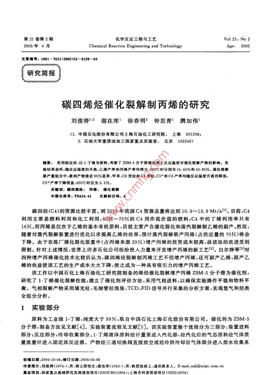 - 期刊名字:化學反應工程與工藝