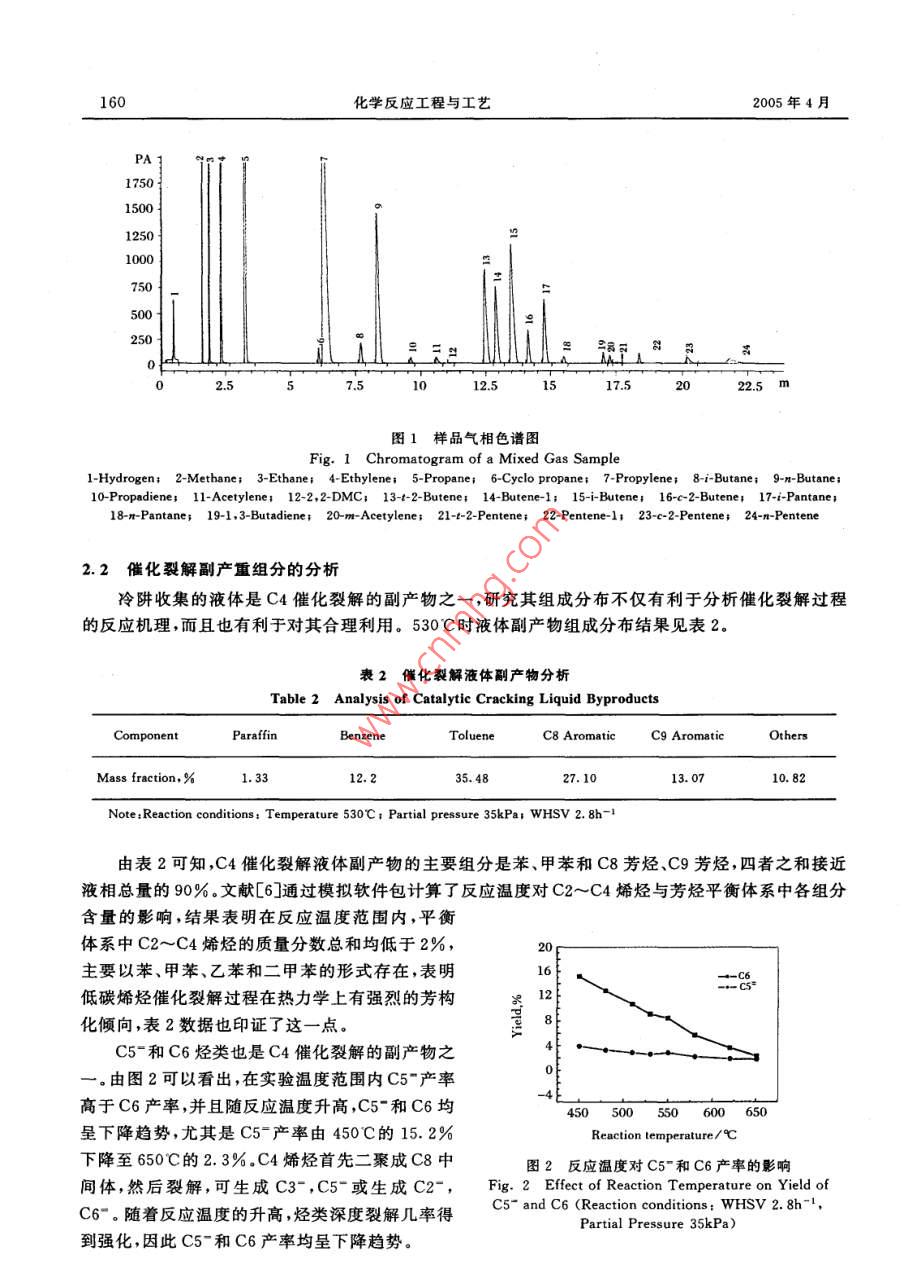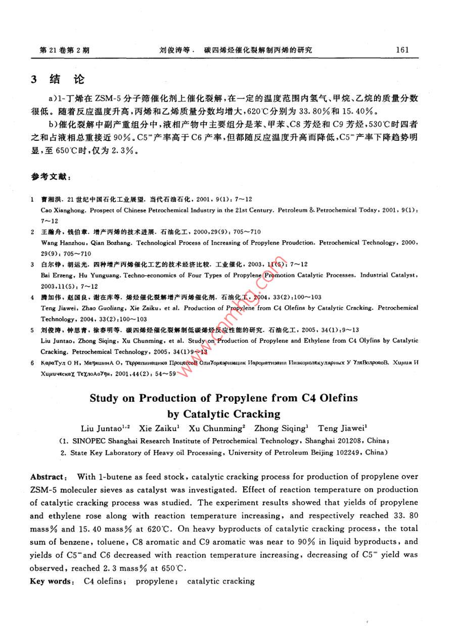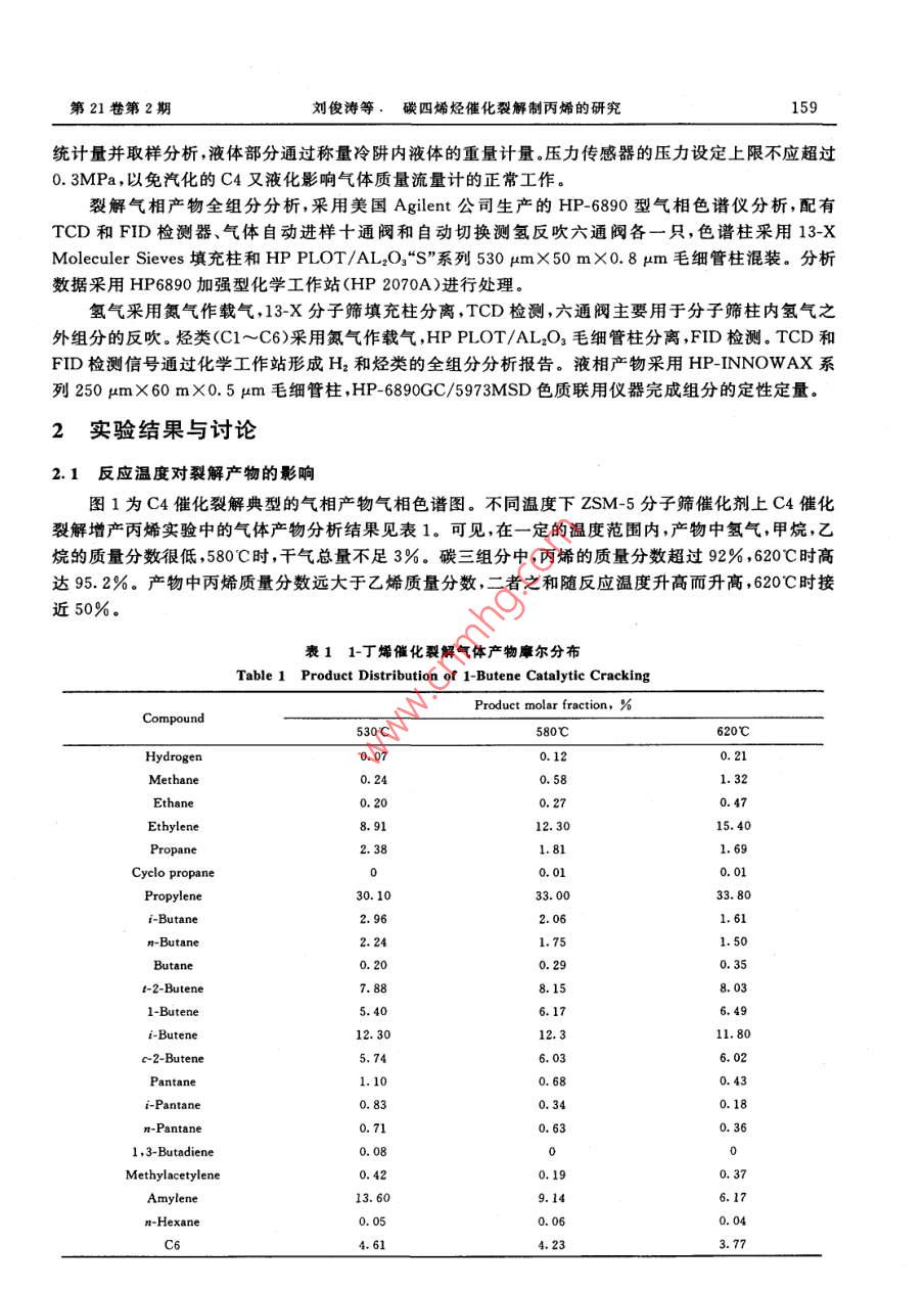 第21卷第2期化學反應工程與工藝Vol 21, No 22005年4月Chemical Reaction Engineering and TechnologyApr. 2005文章編號: 1001- 7631(2005)02 - 0158-04研究簡報碳四烯烴催化裂解制丙烯的研究劉俊濤).2謝在庫徐春明” 鐘思青l(xiāng) 騰加偉}(1.中國石化股份有限公司上海石油化工研究院,上海201208;2.石油大學重質(zhì)油加工國家重點實驗室,北京102249)摘要:采用固定床,以 1-丁烯為原料,考察了ZSM-5分子篩催化劑上反應溫度對催化裂解產(chǎn)物的影響。實驗結果表明,隨反應溫度的升高,乙烯產(chǎn)率和丙烯產(chǎn)率均增大,620C時分別為15. 40%和33. 80%。催化裂解副產(chǎn)重組分中,液相產(chǎn)物接近90%是苯、甲苯,C8芳烴和C9芳烴.C5-和C6產(chǎn)率均隨反應溫度升高而降低,C5-產(chǎn)率下降明顯,650C時僅為2. 3%.關鍵詞;碳四烯烴;丙燔; 催化裂解中國分類號: TE624.41文獻標識碼: A碳四烴(C4)的資源比較豐富。到2015年我國C4資源總量將達到10.9~13.9 Mt/a.目前,C4利用主要是燃料利用和化工利用, 60%~70%的C4用作低價值的燃料,C4中的丁烯利用率只有16%。而丙烯是僅次于乙烯的基本有機原料,目前主要產(chǎn)自催化裂化和蒸汽裂解制乙烯的副產(chǎn)。然而,隨著對蒸汽裂解裝置進行優(yōu)化以求提高乙烯的收率,預計蒸汽裂解聯(lián)產(chǎn)丙烯(占供應量的70%)將會下降。由于在煉廠催化裂化裝置中(占丙烯來源29%)增產(chǎn)丙烯的投資成本較高,故該法的改進受到限制。針對上述情況,世界上許多石化公司紛紛投人力量來開發(fā)增產(chǎn)丙烯的新工藝[2]。白爾錚等印對四種增產(chǎn)丙烯催化技術比較后認為,碳四烯烴裂解制丙烯工藝不但增產(chǎn)丙烯,還可副產(chǎn)乙烯,副產(chǎn)乙烯的收益使該工藝的生產(chǎn)成本大大下降,使之成為一種具有吸引力的增產(chǎn)丙烯工藝。該工作以中國石化上海石油化工研究院制備的烯烴催化裂解增產(chǎn)丙烯ZSM-5分子篩為催化劑,研究了1-丁烯催化裂解性能,建立了催化劑評價方法,采用氣相進料,以確保實驗操作平穩(wěn)和物料平衡。氣相裂解產(chǎn)物采用填充柱,毛細管柱混裝,TCD,FID信號并行采集的分析方案,實現(xiàn)氫氣和烴類全組分分析。1實驗部分原料為工業(yè)級1-丁烯,純度大于99%,取自中國石化上海石化股份有限公司。催化劑為ZSM-5分子篩,制備方法見文獻[4]。實驗裝置流程見文獻[5]。該實驗裝置整個流程分為三部分:裝置進料部分;反應部分;冷卻收集部分。1-丁烯液體原料經(jīng)計量泵送入汽化器,經(jīng)汽化后的氣態(tài)原料經(jīng)氣體質(zhì)量流量計進人固定床反應器。產(chǎn)物經(jīng)三通切換閥直接放空或經(jīng)冷阱冷卻后氣體部分進人排水收集系收稿日期:2004-10-04;修訂日期:2005-03-08作者簡介:劉俊濤(1974-),男,碩士研究生;謝在庫(1963-),男,教授級高工,通訊聯(lián)系人。E-mail :xzk@sript. com. cn基金項目:國家重點基礎研究發(fā)展規(guī)劃項目(2003CB615804);上海市科委資助項目(03D]14004)第21卷第2期劉俊濤等,碳四烯烴催化裂解制丙烯的研究159統(tǒng)計量并取樣分析,液體部分通過稱量冷阱內(nèi)液體的重量計量。壓力傳感器的壓力設定上限不應超過0.3MPa,以免汽化的C4又液化影響氣體質(zhì)量流量計的正常工作。裂解氣相產(chǎn)物全組分分析,采用美國Agilent 公司生產(chǎn)的HP-6890型氣相色譜儀分析,配有TCD和FID檢測器、氣體自動進樣十通閥和自動切換測氫反吹六通閥各一只,色譜柱采用13-XMoleculer Sieves填充柱和HP PLOT/AL2O3“S"系列530 μmX50 mX0.8 μm毛細管柱混裝。分析數(shù)據(jù)采用HP6890加強型化學工作站(HP2070A)進行處理。氫氣采用氦氣作載氣,13-X分子篩填充柱分離,TCD檢測,六通閥主要用于分子篩柱內(nèi)氫氣之外組分的反吹。烴類(C1~C6)采用氮氣作載氣,HP PLOT/AL2O3毛細管柱分離,FID檢測。TCD和FID檢測信號通過化學工作站形成H2和烴類的全組分分析報告。液相產(chǎn)物采用HP-INNOWAX系列250μmX60mX0.5μm毛細管柱,HP-6890GC/5973MSD色質(zhì)聯(lián)用儀器完成組分的定性定量。2實驗結果與討論2.1反應溫度對裂解產(chǎn)物的影響圖1為C4催化裂解典型的氣相產(chǎn)物氣相色譜圖。不同溫度下ZSM-5分子篩催化劑上C4催化裂解增產(chǎn)丙烯實驗中的氣體產(chǎn)物分析結果見表1??梢?在一定的溫度范圍內(nèi),產(chǎn)物中氫氣,甲烷,乙烷的質(zhì)量分數(shù)很低,580C時,千氣總量不足3%。碳三組分中,丙烯的質(zhì)量分數(shù)超過92%,620C時高達95.2%。產(chǎn)物中丙烯質(zhì)量分數(shù)遠大于乙烯質(zhì)量分數(shù),二者之和隨反應溫度升高而升高,620C時接近50%。表1 1-丁烯催化裂解氣體產(chǎn)物摩爾分布Table 1 Product Distribution of 1-Butene Catalytic CrackingProduct molar fraction, %Compound530C580C620CHydrogen0. 070.120.21Methane0.240.58Ethane0.200. 270.47Ethylene8.9112.3015.40Propane1.811. 69Cyclo propane00.01Propylene30.1033.0033. 80i-Butane2.962.061.61n-Butane1.751.50Butane0.290.351-2- Butene7.888.158.031-Butene5. 406.176.49i-Butene12. 3012. 311.80c-2-Butene5.746.036.02Pantane0.43i-Pantane0.830.340.18n-Pantane0.710.630.361,3- ButadieneMethylacetylene0.420.190.37Amylene13.60n-Hexane0. 050.04C64.613.77160化學反應工程與工藝2005年4月175015002501000750500250 te_ 強平0書2.57.5012.5517.52022.5 m圖1祥品氣相色譜圖Fig.1 Chromatogram of a Mixed Gas Sample1-Hydrogen; 2-Methane; 3-Ethane; 4-Ethylenei 5-Propane; 6-Cyclo propane; 7-Propylene; 8-i-Butane; 9-n-Butane;10-Propadiene; 11-Acetylene: 12-2,2-DMC; 13-+-2-Butene+ 14-Butene-