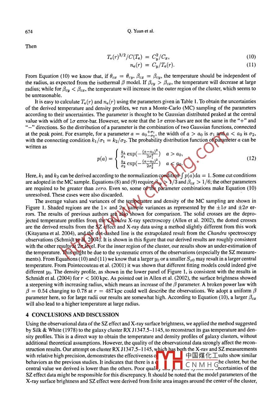 Chin. J. Astron. Astrophys. Vol. 8 (2008), No. 6, 671-676Chinese Journal of(tp://ww.chjaa.org)Astronomy andAstrophysicsReconstruction of Gas Temperature and Density Profiles of theGalaxy Cluster RX J1347.5-1145*Qiang Yuan;2, Tong Jie Zhang1,3 and Bao-Quan Wang4! Department of Astronomy, Beijing Normal University, Beiing 100875, China2 Key Laboratory of Particle Astrophysics, Institute of High Energy Physics, Chinese Academy ofSciences, Beijing 100049, China; tjzhang @ bnu.edu.cn3 Kavli Institute for Theoretical Physics China, Institute of Theoretical Physics, Chinese Academy ofSciences (KITPC/ITP-CAS), Bejing 100080, China4 Department of Physics, Dezhou University, Dezhou 253023, ChinaReceived 2008 January 7; accepted 2008 February 28Abstract We use observations of Sunyaev-Zel dovich effect and X ray surface brightnessto reconstruct the radial profiles of gas temperature and density under the assumption of aspherically symmetric distribution of the gas. The method of reconstruction, first raised bySilk & White, depends directly on the observations of the Sunyaev Zel'dovich effect and theX-ray surface brightness, without involving additional assumptions such as the equation ofstate of the gas or the conditions of hydrostatic equilibrium. We applied this method to thecluster RX J1347.5-1 145, which has both the Sunyaev-Zel 'dovich effect and X-ray observa-tions with relative high precision. It is shown that it will be an effective method to obtain thegas distribution in galaxy clusters. Statistical errors of the derived temperature and densityprofiles of gas were estimated according to the observational uncertainties.Key words: X-rays: galaxies: clusters一cosmology: theory - cosmic microwave back-ground一galaxies: clusters: individual (RX J1347.5- -1 145)1 INTRODUCTIONGalaxy cluster is known to be the largest virial gravitational bound system in the universe. The stronggravitational potential heats the gas (Hydrogen and Helium) to be fully ionized with a very high temperature~ 107 - 10*K. The thermal electrons collide with ions and emit bremsstrahlung radiation, which is mainly inX-ray band, making galaxy clusters strong X-ray sources. The intensity of thermal brermsstrahlung radiationis approximately proportional to Te ' n? (Birkinshaw 1999). So by measuring the X-ray surface brightness,we can obtain information about the gas temperature and density distributions of the galaxy cluster. Oneof the most popular models is the so-called isothermal β model (Cavaliere & Fusco-Femiano 1976), inwhich the temperature distribution as a function of radius is assumed to be constant and the density profletakes the form ne(R) = ne0(1 + R2/R2)- -3/2. This simple model gives good approximations to manygalaxy clusters. However, more and more observations indicate that the temperature distribution may notbe a constant over the whole galaxy. Hughes et al. (1988) introduced a revised model with a constanttemperature in a ranger < rigo and a decrease at large radi煤化字/ has a truncationat a radius rIim. This form provides an adequate description中國煤-ther modificationon the β model has been proposed to deal with the existen:TYHCNMHGterofthecluster(Fabian et al. 1984). .* Supported by the National Natural Science Foundation of China.672Q. Yuan et al.In order to get rid of the degeneracy between To and The, further assumptions like the hydrostaticequilibrium condition or the polytropic equation of state (EOS) of the electron gas (Cowie et al. 1987;Xue & Wu 2000; Wu & Chiueh 2001), or the spectrometric analysis (Jia et al. 2006) are needed. However,the results are still model dependent. A realistic reconstruction is expected to come directly from the obser-vations.The inverse Compton scattring between the electrons in clusters and the cosmic microwavebackground (CMB) photons, namely the Sunyaev-Zel'dovich (SZ) effect (Zeldovich & Sunyaev 1969;Sunyaev & Zeldovich 1970a, b), provides a possible way to achieve this goal. The distortion of the CMBspectrum is related to the electron temperature and density, and will provide another equation of Te and ne.Combining the SZ effect and the X-ray observations, one can obtain the electron temperature and densityprofiles. This method was first suggested by Silk & White (1978), but has not yet been put into practice dueto the limited instrumental sensitivity and resolution in the detection of the temperature fluctuation of CMB.Up to the 1990s some preliminary observational results of the radial temperature ditribution were obtainedfor a few clusters (Birkinshaw et al. 1991; Birkinshaw & Hughes 1994), but it was still dificult to obtainprecise reconstructions of the temperature and density profles because the data points were too sparse anduncertain (Wu 2003).In this paper, we try with this method to acquire some preliminary information about the gas tem-perature and density distribution. For simplicity, we assume a spherically symmetric distribution of thegas in the clusters. We adopt the ACDM model with Sm = 0.27, S2A = 0.73, and Hubble constantHo= 71km s-1 Mpc-1 (Spergel et al. 2003). This paper is organized as follows: we describe the methodof reconstruction in Section 2. In Section 3 we apply this method to the galaxy cluster RX J1347.5-1145to reconstruct its of temperature and density profiles, together with an estimate of the uncertainties. Theconclusions and discussion are presented in Section 4.2 METHOD OF RECONSTRUCTIONThe fuctuation of the temperature of CMB due to the thermal SZ effect is (Birkinshaw 1999)△TcmB(R)TcMB= 9(x)u(R),(1)where g(x) = xcoth(x/2) - 4 with x = hv/kgTcmB the dimensionless frequency, y(R) is theComptonization parameter as a function of the two-dimensional skymap radius R. In the Rayleigh-Jeanslimit,x《1,g(x)= -2, so we have△TcmB(R)/TcmB = -2y(R). The Comptonization parameter isrelated to the electron temperature and density byrdry(R)= 2AyTE()o()-√r2- R(2)where Ay = kpσr/mec2, kB is the Bolzmann constant, σr the Thomson cros