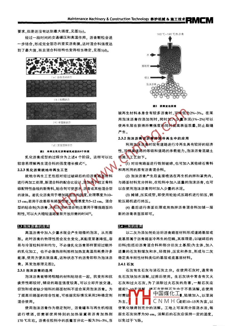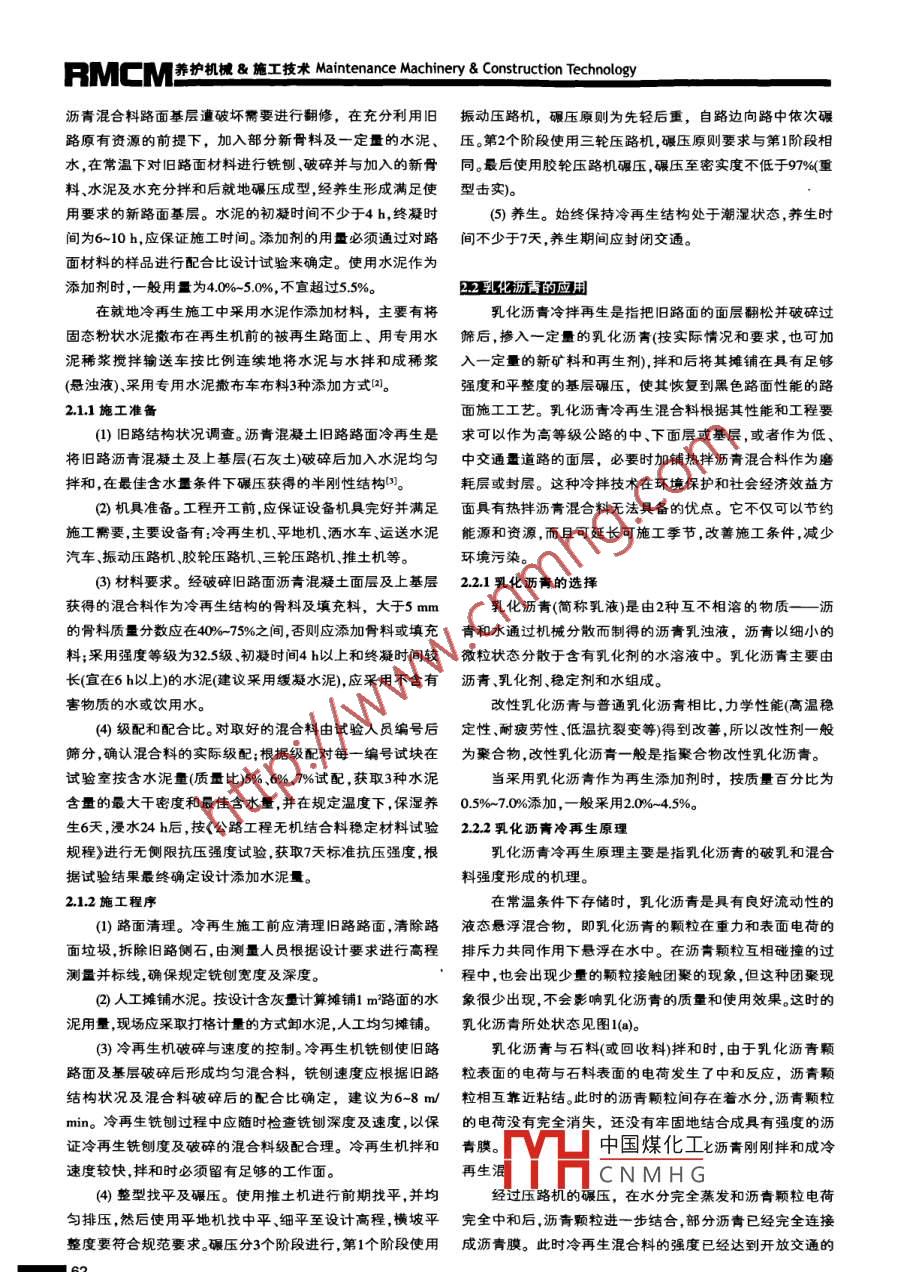 Maintenance Machinery & Construction Tchnology養(yǎng)護(hù)機(jī)槭&施工技術(shù)RMCM冷再生添加劑的應(yīng)用分析Analysis of Application on Cold Recycling Additive朱得斌,趙展",馬振海3ZHU De-bin', ZHAO Chen2, MA Zhen-hai?1.山西交通職業(yè)技術(shù)學(xué)院工程管理系,山西太原0300312.西安工業(yè)大學(xué)電子信息工程學(xué)院,陜西西安7100323.新疆公路管理局,新疆烏魯木齊8300001.Department of Engineering Management, Shanxi Vocational and Technical College of Communications,Taiyuan 030031,Shanxi, China2.School of Electronic and Information Engineering. Xi"an Technological University, Xi'an 710032, Shaanxi, China3.Highway Administration Bureau of Xinjiang, Urumqi 830000, Xinjiang, China|摘?jiǎng)t基于冷再生添加劑的應(yīng)用問題,對冷再生技術(shù)原理幾種冷再生添加劑的適用范圍,選用原則.再生機(jī)理及其施工工藝等進(jìn)行了系統(tǒng)分析。結(jié)果表明:冷再生添加劑在冷再生施工中起著關(guān)鍵作用,其應(yīng)用前景廣闊。L Abstract J Based on the problem that exists during the applying of cold recycling additive, the theory of coldrecycling technology, sphere of application, selection principle, recycling mechanism and construction technique ofseveral cold recycling additive are analyzed generally. The results show that the cold recycling additive plays animportant role in the cold recycling construction and has wide prospects.|關(guān)鍵詞|冷再生;添加劑;乳化瀝青;泡沫瀝青l(xiāng) Key words U cold recycling; additive; emulsified asphalt; foamed asphalt中圖分類號:U414.1文獻(xiàn)標(biāo)識碼:B文章編號:1000- -033X(2008)05- 0061- 040引言形成的摩擦阻力。在道路的使用過程中,瀝青面層材料會在溫度、車輛荷載.水等因素的影響下老化而失去粘聚作用,隨著公路交通事業(yè)的蓬勃發(fā)展,中國的公路網(wǎng)絡(luò)已基進(jìn)而基層材料也會遭到病害破壞。因此,冷再生添加劑的作本形成。2006年 年底中國公路通車總里程達(dá)到3.48x10* km用 就是恢復(fù)面層或基層材料中結(jié)合料的粘聚作用,進(jìn)-步(包括從2006年開始納入統(tǒng)計(jì)范疇的1.55x100 km村道),高恢復(fù) 其強(qiáng)度和穩(wěn)定性,恢復(fù)瀝青路面材料的路用性能。速公路達(dá)4.54x10* km。截至2007年年底,中國高速公路通車總里程已達(dá)5.36x10 km。伴隨著汽車工業(yè)的飛速發(fā)展,車2 常用添加劑的應(yīng)用輛的大型化、行車渠道化以及超載現(xiàn)象使中國公路在使用過程中出現(xiàn)不同程度的破壞,尤其在大修養(yǎng)護(hù)過程中,養(yǎng)護(hù)瀝青路面冷再生過程中,常用的添加劑主要有水泥、乳工作的質(zhì)量直接影響到道路的使用壽命。近年來,冷再生技化瀝青 、改性乳化瀝青、泡沫瀝青、石灰、粉煤灰和高爐爐渣術(shù)迅速發(fā)展起來,并在公路養(yǎng)護(hù)過程中得到了廣泛的應(yīng)用。等。 石灰、水泥以及它們與粉煤灰的混合物、高爐爐渣的添冷再生施工中,再生添加劑的加入起到了關(guān)鍵的作用。加可以采用預(yù)撒的方式,也可以通過機(jī)載-體式擻布裝置撒布。在實(shí)際應(yīng)甲時(shí)針對不同的且休情況可有不同的再生0再生添加劑的作用方式。中國煤化工主要用作基層,只是在低交YRCNMHG瀝青面層及基層的強(qiáng)度,一部分來 自于瀝青、水泥.石灰、二灰等材料發(fā)生一系列的物理、 化學(xué)反應(yīng)而形成的膠凝0 永泥漆加別的應(yīng)湖產(chǎn)物的粘聚作用;另-部分來自于骨料之間的嵌擠作用所水泥冷再生技術(shù)主要應(yīng)用于瀝青路面基層的施工中。61RMCM養(yǎng)護(hù)機(jī)槭&施工技術(shù)Maintenance Machinery & Construction Technology瀝青混合料路面基層遭破壞需要進(jìn)行翻修,在充分利用舊振動(dòng)壓路機(jī), 碾壓原則為先輕后重,自路邊向路中依次碾路原有資源的前提下,加入部分新骨料及-定量的水泥、壓。第2個(gè)階段使用三輪壓路機(jī),碾壓原則要求與第1階段相水,在常溫下對1舊路面材料進(jìn)行銑刨、破碎并與加入的新骨同。 最后使用膠輪壓路機(jī)碾壓,碾壓至密實(shí)度不低于97%(重料、水泥及水充分拌和后就地碾壓成型,經(jīng)養(yǎng)生形成滿足使型 擊實(shí))。用要求的新路面基層。水泥的初凝時(shí)間不少于4 h,終凝時(shí)(5)養(yǎng)生。始終保持冷再生結(jié)構(gòu)處于潮濕狀態(tài),養(yǎng)生時(shí)間為6~10 h,應(yīng)保證施工時(shí)間。添加劑的用量必須通過對路間不少 于7天,養(yǎng)生期間應(yīng)封閉交通。面材料的樣品進(jìn)行配合比設(shè)計(jì)試驗(yàn)來確定。使用水泥作為添加劑時(shí),一般用量為4.0%-5.0%, 不宜超過5.5%。2乳你瀝青的遠(yuǎn)制在就地冷再生施工中采用水泥作添加材料,主要有將乳化瀝青冷拌再生是指把舊路面的面層翻松并破碎過固態(tài)粉狀水泥撒布在再生機(jī)前的被再生路面上、用專用水篩后 ,摻入- -定量的乳化瀝青(按實(shí)際情況和要求,也可加泥稀漿攪拌輸送車按比例連續(xù)地將水泥與水拌和成稀漿入- 定量的新礦料和再生劑),拌和后將其攤鋪在具有足夠(懸濁液)、采用專用水泥撒布車布料3種添加方式2。強(qiáng)度和平整度的基層碾壓,使其恢復(fù)到黑色路面性能的路2.1.1施工準(zhǔn)備面施工工藝。乳化瀝青冷再生混合料根據(jù)其性能和工程要(1)舊路結(jié)構(gòu)狀況調(diào)查。瀝青混凝土舊路路面冷再生是求 可以作為高等級公路的中、