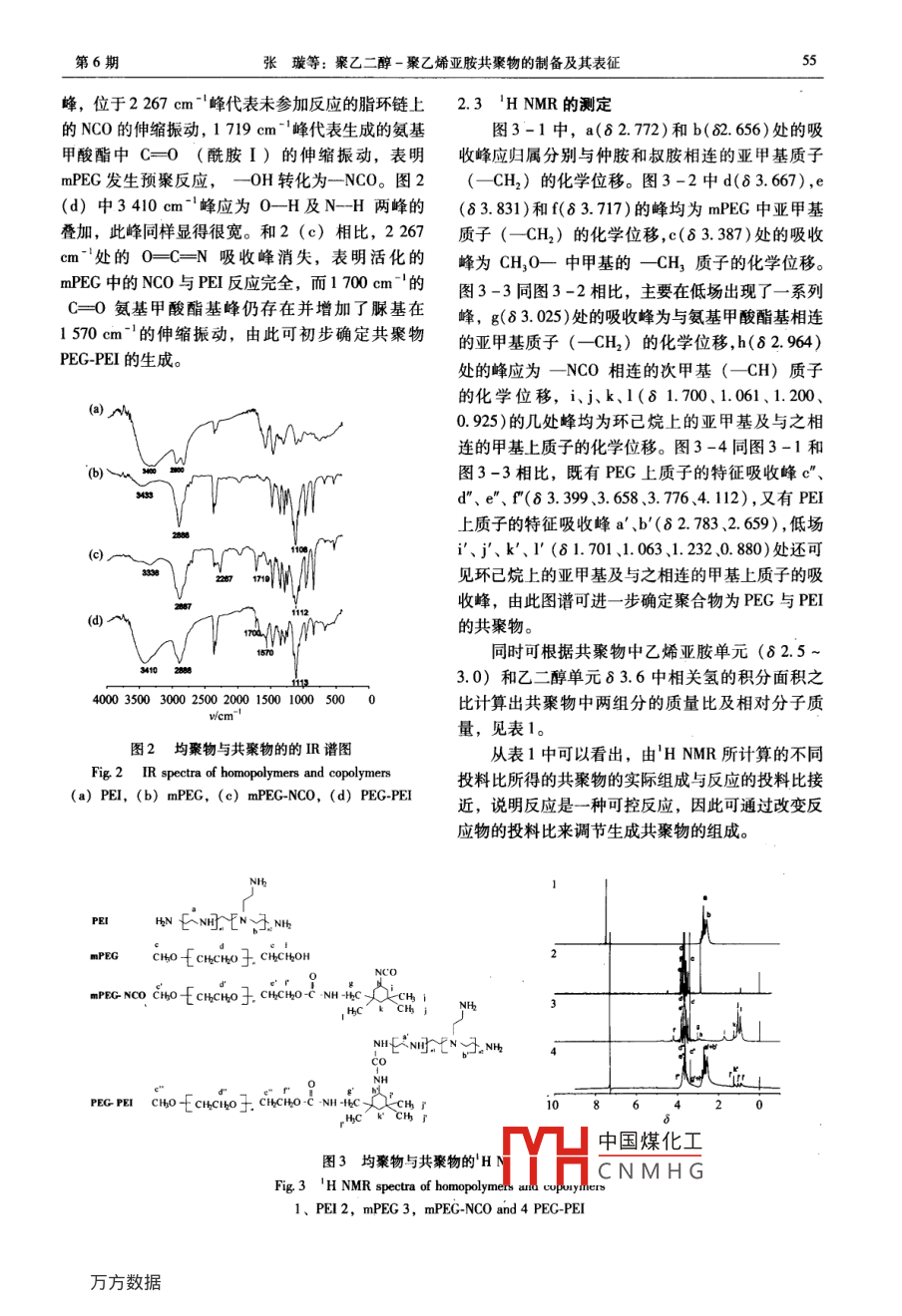 第45卷第6期中山大學(xué)學(xué)報(bào)( 自然科學(xué)版)Vol.45 No.62006年11 月ACTA SCIENTIARUM NATURALIUM UNIVERSITATIS SUNYATSENINov.2006聚乙二醇-聚乙烯亞胺共聚物的制備及其表征張璇,潘仕榮,呂澍,胡海梅,張未(中山大學(xué)附屬第一醫(yī)院,廣東廣州510080)摘要: 用親水的聚乙二醇對(duì)聚乙烯亞胺進(jìn)行改性,制備適用于基因轉(zhuǎn)染的非病毒類載體。以異佛爾酮二異氰酸酯活化聚乙二醇,再與聚乙烯亞胺反應(yīng),兩步法合成了聚乙二醇-聚乙烯亞胺(PEC-PE)嵌段共聚物,分別用IR、'H NMR、GPC、DSC對(duì)共聚物進(jìn)行了表征。在IR譜圖上可見mPEC-NCO中異氰酸基、及PEC-PEI中脈:基的特征峰;根據(jù)'H NMR譜圖計(jì)算表明,此聚合反應(yīng)為可控反應(yīng),通過調(diào)節(jié)PEC與PEI的投料比例可控制共聚物組成及相對(duì)分子質(zhì)量; CPC曲線上共聚物為-單峰,與PEG和PEI均聚物峰位置不同,表明產(chǎn)物是PBEC-PEI共聚物,DSC分析也表明共聚物T。較均聚物均有不同程度的下降,這是PEG和PEI兩種嵌段相互纏結(jié)的結(jié)果。因此證明成功合成了PEC-PEI 共聚物。關(guān)鍵詞:聚乙烯亞胺;聚乙二醇;共聚物;異佛爾酮二異氰酸酯中圖分類號(hào): 0632. 12文獻(xiàn)標(biāo)識(shí)碼: A文章編號(hào): 0529-6579 (2006) 06-0053-05隨著基因治療的不斷深人,非病毒基因載體的黏接劑, 具有柔軟、耐水、耐油、耐熱、無毒等特研究近年來取得了很大進(jìn)展。陽離子聚合物是被廣點(diǎn), 已獲得美國(guó)FDA的認(rèn)可。2002 年,Pelesen'"泛研究的非病毒載體之一,通過其分子鏈上的正電用己二異氰酸酯(HMDI)作偶聯(lián)劑制備了PEI-b-荷與DNA鏈上的負(fù)電荷的靜電作用締合并轉(zhuǎn)變成PEG。IPDI 同HMDI相比2個(gè)一NCO基團(tuán)的活性納米級(jí)復(fù)合體",保護(hù)DNA免受核酸酶降解。較低,反應(yīng)速度較平穩(wěn),毒性較低:穩(wěn)定性好、耐1995年,Bousift2-3) 首次報(bào)道了聚乙烯亞胺老化性能優(yōu)、原料易得、反應(yīng)簡(jiǎn)單,故用作本研究(polyethylenimine, PEI)可作為非病毒載體。PEI的偶聯(lián)劑。本研究開辟了一條PEC-PEI共聚物的結(jié)構(gòu)單體(- CH2- CH,-NH,-) 中每3個(gè)原子新的制備 方法。含-一個(gè)氮原子,可質(zhì)子化生成正電性氨基,成為與1實(shí)驗(yàn)部分基因復(fù)合的作用點(diǎn),在體內(nèi)有較高的轉(zhuǎn)染率。但是,因?yàn)镻EI強(qiáng)的滲透作用,破壞細(xì)胞的溶酶體1.1 實(shí)驗(yàn)原料膜,顯示出細(xì)胞毒性(4),為了改善PEI的生物性聚乙烯亞胺(PEI, M. 25 000, Aldricb-Sigma能,采用引入PEC對(duì)其進(jìn)行修飾,PEG 是無毒和公司產(chǎn)品,支鏈型,無水);聚乙二醇單甲醚抗免疫原性的水溶性大分子,有優(yōu)良的生物相容(mPEG, M.為2000和5000, Fluka公司); 異佛性,通過PEG修飾PEI形成共聚物即可克服PEI爾酮二異氰酸酯(IPDI, 廣州市匯采涂料化學(xué)品有DNA復(fù)合物溶解性差、細(xì)胞毒性大和傳送過程中限公司,進(jìn)口分裝);二月桂酸二丁基錫( DBTL,沉積等不足[4)。用PEG修飾PEI的方法,國(guó)外報(bào)廣東麗寶涂料助劑公司);氯仿(分析純,廣州試道多使用特異活性的PEG修飾劑,例如含琥珀酰劑二廠 ,用前用無水氯化鈣干燥過夜,再在60 C亞胺酯端基的PEC15-6), 含環(huán)氧化物湍基的與IPDI回流4h,以除去微量的水和乙醇);乙醚PEC[",含醛基端基的PEG,它們的制備復(fù)雜,來(分析純,廣州試劑二廠);石油醚(30 ~60 C,源缺少,所得PEG-PEI共聚物的產(chǎn)率較低。分析純,廣州試劑二廠)。異佛爾酮二異氰酸酯(IPDI) 屬脂環(huán)族二異1.2異氰酸酯單端基聚乙二醇的制備氰酸酯,其相對(duì)分子質(zhì)量大,蒸氣壓低,毒性小,將mPEG先110 C脫水處理4 h,再用定量氯并且有良好的耐候性、耐熱性和耐溶劑性8],以仿溶解。稱10倍摩爾量IPDI, 溶于氯仿,加入IPDI為原料制造的食品、醫(yī)藥、化妝品包裝袋用0. 6%n70的化化劉NRTT收上述兩溶液混合,中國(guó)煤化工TYHCNMHG收稿日期: 2006 -01 -22基金項(xiàng)目:國(guó)家自然科學(xué)基金資助項(xiàng)目(30570500)作者簡(jiǎn)介:張璇(1976 年生),女,博士研究生;通訊聯(lián)系人:潘仕榮; E-mail: gpshr@ 163. com54中山大學(xué)學(xué)報(bào)(自然科學(xué)版)第45卷75 C左右回流反應(yīng)8 h,所得產(chǎn)物在石油醚中沉.的NCO的活性大8~10倍。用作偶聯(lián)劑與PEG反淀,沉淀用氯仿溶解,再用石油醚沉淀,此操作重應(yīng)時(shí),脂鏈上的NCO在催化劑作用下先與- -0H復(fù)多次直至將過量的異佛爾酮去除干凈,真空干反應(yīng)后,脂環(huán)上的NCO就難于再與- -0H反應(yīng),燥,得白色蠟狀至粉末狀固體。故生成的預(yù)聚體副反應(yīng)少。加入過量的IPDI可使1.3 PEG-PEI嵌段共聚物的合成反應(yīng)進(jìn)行的更加完全。而Petersen[9!使用的HMDI將PE1用20倍(質(zhì)量比)氯仿溶解,磁力攪上的兩個(gè)NCO為對(duì)稱結(jié)構(gòu),活性相同,有可能同拌下將異氰酸酯活化的單甲氧基聚乙二醇的氯仿溶時(shí)和兩個(gè)mPEG反應(yīng)而無法再繼續(xù)與PEI反應(yīng),本液逐滴加人PEI溶液中,再加人0.6% ~0.7% 的實(shí)驗(yàn)采用IPDI做偶聯(lián)劑可避免此種情況。與PEI催化劑DBTL,置60 C回流反應(yīng)16 h,蒸去多余氯反應(yīng)前必須將過量的IPDI 除去,因?yàn)闅埩舻腎PDI仿,余下液體用大量乙醚沉淀,過濾,真空干燥,可使PEI大分子間形成交聯(lián)而至使溶解性下降。稱量。IPDI可溶于石油醚,而活化的PEG在