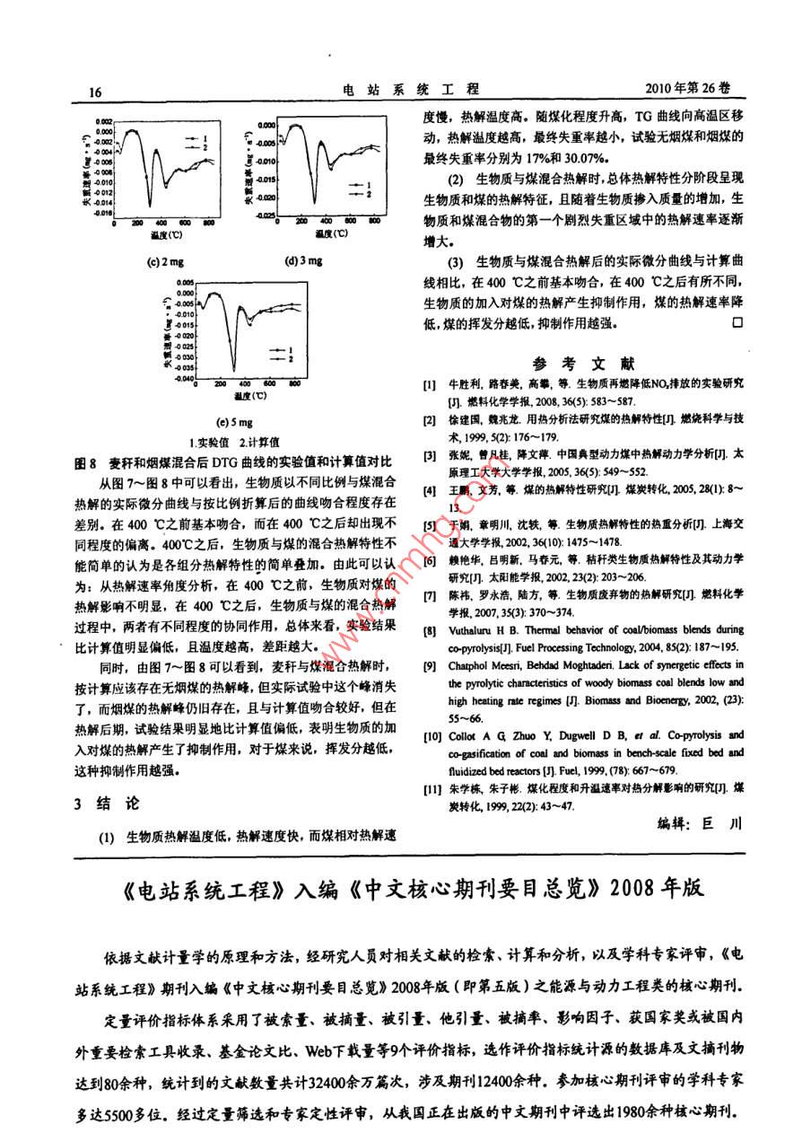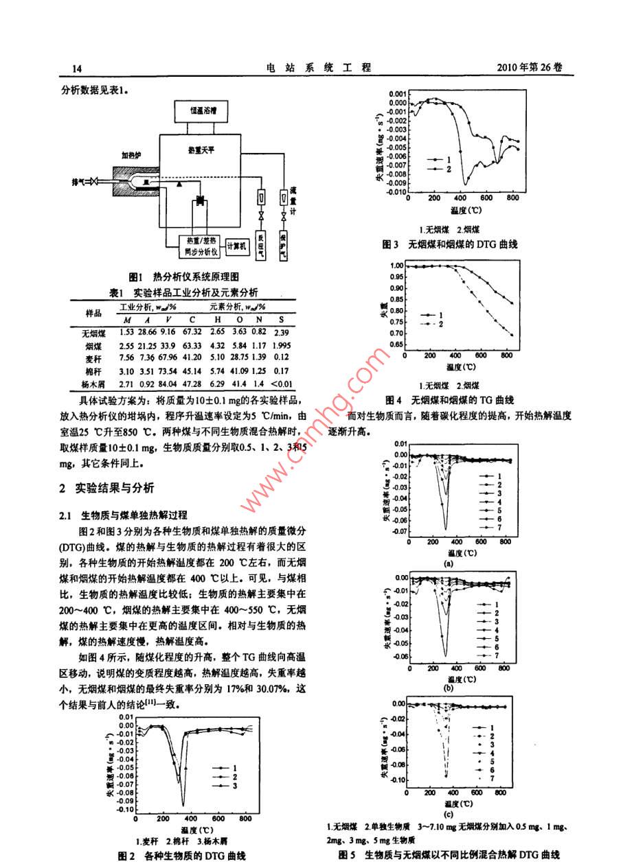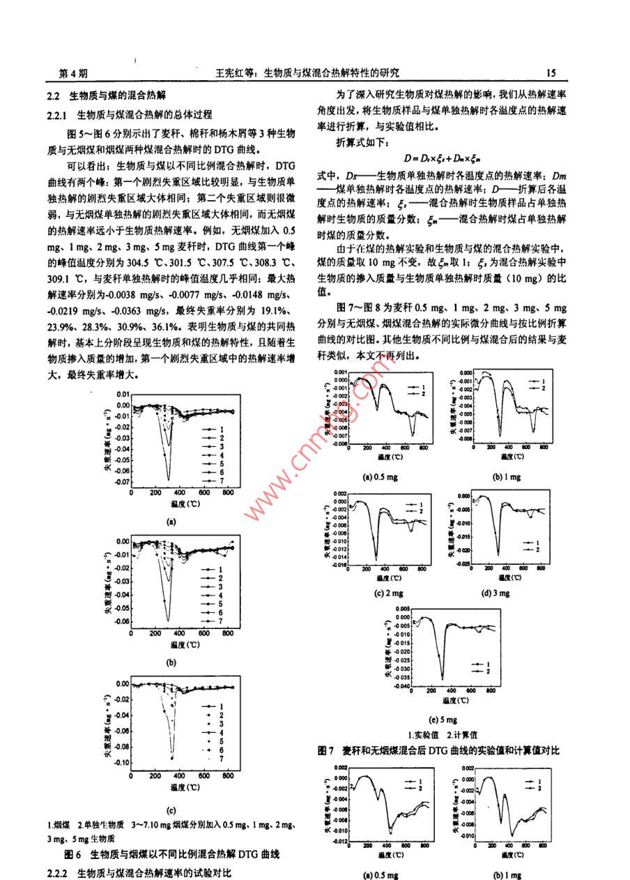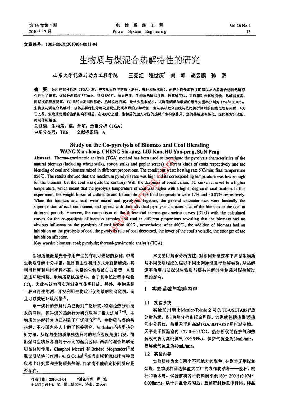 第26卷第4期電站系統(tǒng)工程2010年7月Power System Engineeri文章編號:1005-006X(2010)04001304生物質(zhì)與煤混合熱解特性的研究山東大學(xué)能源與動力工程學(xué)院王憲紅程世慶劉坤胡云鵬孫鵬摘要:采用熱重分析法(TGA)對幾種常見天然生物質(zhì)(麥稈、棉稈和楊木屑)、兩種不同變質(zhì)程度的煤以及兩者混合物的熱解特性進(jìn)行了研究·試驗(yàn)升溫速度5℃hmin,終溫850℃,結(jié)果表明:生物質(zhì)熱解溫度低,熱解速度快,而煤相對熱解速度慢,熱解溫度高隨煤變質(zhì)程度提高,TG曲線向高溫區(qū)移動,熱解溫度升高,最終失重半減小,試驗(yàn)無煙煤和煙煤的最終失重率分別為17%和3007%生物質(zhì)與煤混合熱解時,總體熱解特性分階段呈現(xiàn)生物質(zhì)和煤的熱解特征,但從實(shí)際微分曲線與按比例折算后的曲線比較結(jié)果看,400℃之前,生物質(zhì)對煤的熱解影響不明顯,在400℃之后,生物質(zhì)的加入對煤的熱解產(chǎn)生抑制作用,煤的熱解速率降低,煤的揮發(fā)分越低抑制作用越強(qiáng)關(guān)鍵詞:生物質(zhì):煤;熱解:熱重分析(TGA)中圖分類號:TK6文獻(xiàn)標(biāo)識碼:AStudy on the Co-pyrolysis of Biomass and Coal BlendingWANG Xian-hong, CHENG Shi-qing, LIU Kun, HU Yun-peng, SUN PengAbstract: Thermo-gravimetric analysis(TGA)method has been used to investigate the pyrolysis characteristics of theatural biomass (including wheat stalks, cotton stalks and poplar scraps), different kinds of coals respectively and theblending of coal and biomass mixed in different proportions. The conditions were: heating rate 5C/min; final temperature850C. The results showed that: the maximum pyrolysis rate was high and its coresponding temperature was low enoughfor the biomass, but the coal was quite the contrary. With the deepness of coalification, TG curve removed to a highertemperature, which meant that the pyrolysis temperature of coal was higher with a higher degree of coalification. In thisexperiment, the weight losses of anthracite and bituminite at the final temperature were 17% and 30.07% respectivelyWhen the biomass and coal were mixed and pyrolyzed together, the general characteristics were basically thesuperposition of each component, and agreed with the individual pyrolysis characteristics of the biomass or the coal atdifferent periods. However, the comparison of the differential thermo-gravimetric curves(DtG) with the calculatedurves for the co-pyrolysis of biomass samples and coal in different proportions revealing that the biomass hadbvious influence on the pyrolysis of coal before 400C, nevertheless, after 400C, the addition of biomass had aninhibition on the pyrolysis of coal, the pyrolysis rate of coal decreased, the lower of the coal s volatile, the stronger of theKey words: biomass; coal; pyrolysis; thermal-gravimetric analysis (TGA)生物質(zhì)能源是光合作用產(chǎn)生的有機(jī)可燃物的總稱,中國本文采用熱重分析方法,對相同升溫速率下常見生物質(zhì)生物質(zhì)資源十分豐窩,但日前主要利用方式為直接燃燒,其與不同變質(zhì)程度的煤以不同比例摻混進(jìn)行熱解實(shí)驗(yàn),從熱解利用程度和利用率不高,大量的生物質(zhì)被白白浪費(fèi),且易速率角度出發(fā)探討生物質(zhì)與煤共熱解時生物質(zhì)對煤熱解過造成環(huán)境污染。生物質(zhì)是低碳燃料,由于其生長過程中吸收程的影響cO2,因此被認(rèn)為可實(shí)現(xiàn)溫室氣體零排放。另外,生物質(zhì)是一種可再生能源,開發(fā)利用生物質(zhì)不僅能緩解能源危機(jī),而1實(shí)驗(yàn)系統(tǒng)與實(shí)驗(yàn)內(nèi)容且可以減輕環(huán)境污染叫單一煤種的熱解行為己得到廣泛研究,特別是熱分析技1.1實(shí)驗(yàn)系統(tǒng)術(shù)的應(yīng)用,使得煤的熱解行為研究取得了很大進(jìn)展,生實(shí)驗(yàn)采用瑞士Mler- Toledo公司的 TGASDTA851熱物質(zhì)的熱解行為也已得到了廣泛研究,生物質(zhì)與煤的共分析系統(tǒng),圖為熱分析系統(tǒng)原理圖該系統(tǒng)包括熱重差熱熱解,不少國內(nèi)外人士做了相關(guān)研究, vuthalurul'應(yīng)用熱分析方法,從煤與生物質(zhì)單獨(dú)熱解時的對應(yīng)溫度角度出發(fā),得天平處于恒溫室內(nèi)(220±0℃)。熱分析儀的保護(hù)氣和熱出煤與生物質(zhì)各自處于不同的溫度區(qū)間,兩者的混合熱解無解載氣皆為高純氮?dú)?99%),保護(hù)氣流量為30mL/min明顯協(xié)同作用; Chatphol Mee和 Behdad Moghtaderil)熱解載氣流量為40mL/min現(xiàn)無明顯協(xié)同作用: A. G Coll在固定床和流化床兩種反12實(shí)驗(yàn)內(nèi)容應(yīng)器上研究煤和生物質(zhì)共熱解,作者尚不能確定協(xié)同反應(yīng)是實(shí)驗(yàn)煤樣為來自兩個不同地方的煤種,分別為無煙煤和否存在煙煤,生物質(zhì)樣品選擇量大面廣的農(nóng)作物稍稈—麥稈、棉收稿日期:2010024·通訊作者:程世慶稈和楊木屑。試驗(yàn)前將各種物料摩細(xì)至180~200日074~王憲紅(1984),女,碩士研究生,濟(jì)南,2500610098mm),烘干并混合均勻后,放到密封器皿中待用。樣品電站系統(tǒng)工程2010年第26卷分析數(shù)據(jù)見表1忸溫浴熱重天平排氣→40.010200400600800熱重/費(fèi)L「L步分析人計(jì)算機(jī)圖3無煙煤和煙煤的DTG曲線熱分析儀系統(tǒng)原理圖表1實(shí)驗(yàn)樣品工業(yè)分析及元素分析工業(yè)分析,w。%元素分析,w/%0.75無煙煤15328669166732265363082239煙煤25521.253963334325841.171.995麥稈7567366796412051028751390.12棉稈31035173.5445.145.7441.091250.17楊木屑27109284044723862941414<0011無煙