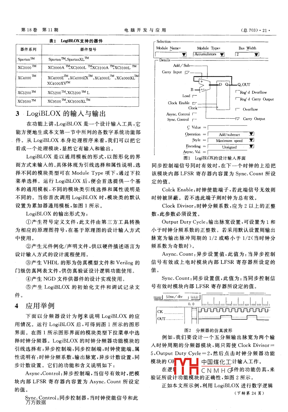 ·20·(總702)LogiBlOX的特點(diǎn)及應(yīng)用文章編號:1003-5850(2005)11-0020-02LogiBLOX的特點(diǎn)及應(yīng)用Features and application of LogiblOX沈祖斌(江漢大學(xué)數(shù)學(xué)與計算機(jī)科學(xué)學(xué)院武漢430056)【摘要】詳細(xì)地介紹了 Xilinx公司的一種數(shù)宇系統(tǒng)設(shè)計輸入工具 LogiBLOX,闡明了 LogiBLOX的功能和特點(diǎn),總結(jié)了 LogiBLOX的輸入和輸出形式,并通過一個設(shè)計輸入實(shí)例說明了 LogiBLOX在數(shù)字系統(tǒng)設(shè)計輸入中的應(yīng)用?!娟P(guān)鍵詞】 LogiBLOX,EDA,設(shè)計輸入,功能仿真中圖分類號:TN79文獻(xiàn)標(biāo)識碼:AABSTRACT This paper particularly presents LogiBLOX, which is one of the digital system design tools produced by Xilinx corpo-ration. The functions and features of the LogiBLOX are described, and the input and output forms are summarized. Its application inthe digital system design entries are discussed through a real design entry example.KEYWORDS LogiBLOX, EDA, design entry, function simulation在EDA應(yīng)用中,數(shù)字系統(tǒng)設(shè)計的輸入是一個重?zé)o需等到邏輯實(shí)現(xiàn)后才去驗(yàn)證其功能正確性,從而保要的環(huán)節(jié)。如今數(shù)字產(chǎn)品的成本中設(shè)計成本變得越來證了整個設(shè)計的正確完成④圖形化、交互性的設(shè)計界越重,產(chǎn)品的上市時間越來越短。因此,在EDA應(yīng)用面,使繁雜的數(shù)字邏輯設(shè)計變得輕松、便捷,有利于設(shè)中,良好的設(shè)計輸入工具是各大EDA及PLD公司必計成本和設(shè)計時間的降低。⑤支持基于原理圖的和基須提供的,也是現(xiàn)代電子設(shè)計工程師必須熟練掌握的。于硬件描述語言的設(shè)計輸入方式。⑥與諸多EDA開在 Xilinx公司的EDA開發(fā)軟件 Foundation中,提供發(fā)商的設(shè)計輸入方式兼容,即由 LogiBLOX生成的功了一種 LogiBlox的交互式圖形化的高級功能模塊能部件(以各種標(biāo)準(zhǔn)的文件形式體現(xiàn),如EDF文件)輸入工具,它能使數(shù)字系統(tǒng)設(shè)計的輸入過程變得輕松、可方便地轉(zhuǎn)換并嵌入到這些EDA平臺的設(shè)計文檔便捷。中。⑦支持“與器件無關(guān)性”,在 LogiBlOX圖形界面1 LogiBlOX的功能和特點(diǎn)中,器件不支持的特點(diǎn)及功能,圖形界面中的選項變灰色,即不可使用,因此設(shè)計者可忽略器件的結(jié)構(gòu)特點(diǎn)。LogiBlOX可產(chǎn)生的功能部件有:累加器、加法器⑧由 LogiBLOX生成的功能模塊經(jīng)過了預(yù)優(yōu)化處理,/減法器、分頻器、比較器、常數(shù)器、計數(shù)器、數(shù)據(jù)寄存可充分利用器件的結(jié)構(gòu)特點(diǎn),例如:快速進(jìn)位邏輯和片器、譯碼器、輸入/輸岀模塊、存儲器、數(shù)據(jù)選擇器、焊節(jié)上RAM以實(shí)現(xiàn)怏速運(yùn)算模塊和快速輸人輸岀端口。盤端口、移位寄存器、各種門電路、三態(tài)緩沖器等。LogiBLOX有如下特點(diǎn):2 LogiBLOX支持的器件及可配合使①在 LogiBLOX中提供的是上述各功能部件的用的EDA工具通用模板,設(shè)計者可根據(jù)實(shí)際需要定義諸如:總線寬LogiBlOX支持的器件可見表1。度,同步還是異步,加法還是減法等,以滿足實(shí)際設(shè)計在基于原理圖的設(shè)計輸入方式中,由 LogiBLOX輸入的需要,有效地彌補(bǔ)了僅利用Xinx提供的統(tǒng)生成的功能模塊可在如下公司的原理圖輸入編輯器中標(biāo)準(zhǔn)元件庫輸入方式的不足之處。②在 LogiBloX中使用,它們是: Aldec, View logic, Mentor Graphic和嵌人了一DRC檢錯功能,能非常有效地檢査并提示 Cadence。在基于硬件描述語言的設(shè)計輸入方式中,由設(shè)計者在設(shè)計中的錯誤,使設(shè)計者很快便能察覺并迅 LogiBlOX生成的功能模塊能與許多第三方綜合工具速糾正,有利于設(shè)計的順利進(jìn)行。③當(dāng)用 LogiBLOX配合使用,neue FPGA Compiler, Xilinx生成功能部件后,馬上可仿真驗(yàn)證其功能的正確性,而 Foundation中國煤化工CNMHG2005-04-02收到,2005-09-12改回“基金項目:武漢市科技計劃項目(20015007090)資助?!啊吧蜃姹?男,1964年生,碩士,研究方向:EDA應(yīng)用設(shè)計等。第18卷第11期電腦開發(fā)與應(yīng)用(總703)·21·表1 LogiBLOX支持的器件器件系列器件型號Module NameModule TypeBus WidthSpartanOSpartanTM, SpartanXL7 Accumulators 2XC3000XC3000AMXC3000LMXC3100AXC3100LAdd/ SubCarry InpuXC4000TM XC4000EM, XC4000EX M, XC400OLTM, XC4O00XLTOUTXC5200TMTM, XC5200 TMLXC9500 MTM, XC9500XLTM廠 Reg d Carry OutputClock Enable r廠 Overflow3 LogiBLOX的輸入與輸出Async, control「Sync Control r-fv Carry Output在功能上講, LogiBlOX是一個設(shè)計輸入工具,它C Value能方便地生成本文第一節(jié)中所列的各數(shù)字系統(tǒng)功能部Operation= Add/subtract件。從 LogiBLOX本身處理程序來看,我們可以把它syle=「 Maximum speed看成一個處理模塊,顯然它有輸入和輸出。ncoding eLogiBLOX是以通用模板的形式,以圖形化的界圖1 LogiBlo的設(shè)計輸入界面面方式來輸入的。具體體現(xiàn)為引線選擇和屬性說明選同步控制端信號同時有效時,在下一個時鐘的上沿把擇不同的模塊類型可在 Module Type項下,通過下拉該模塊內(nèi)部LFSR寄存器內(nèi)容置為Sync, Count所設(shè)菜單選擇。運(yùn)行 LogiBLOX后,便會首選提供一個基定的值本的通用模板,不同的模塊類引線選擇和屬性說明是Colck enable:時鐘使能端子,若此端信號無效則不同的。當(dāng)你首次調(diào)用 LogiBLOX時,