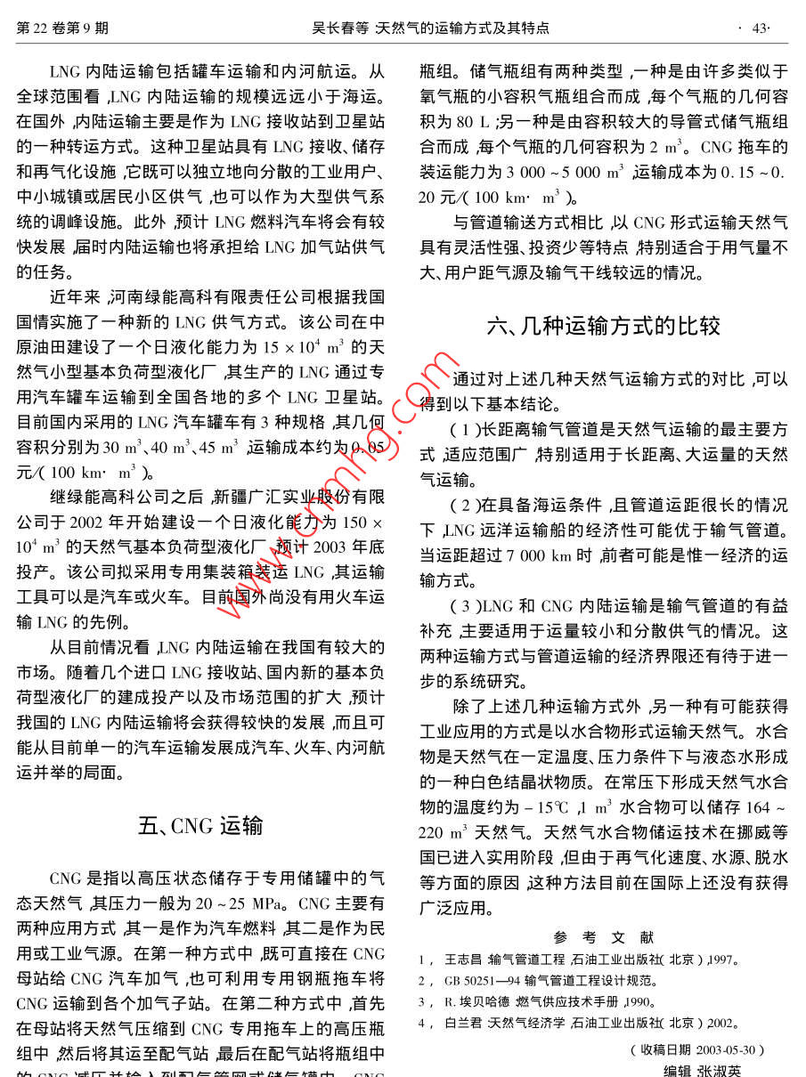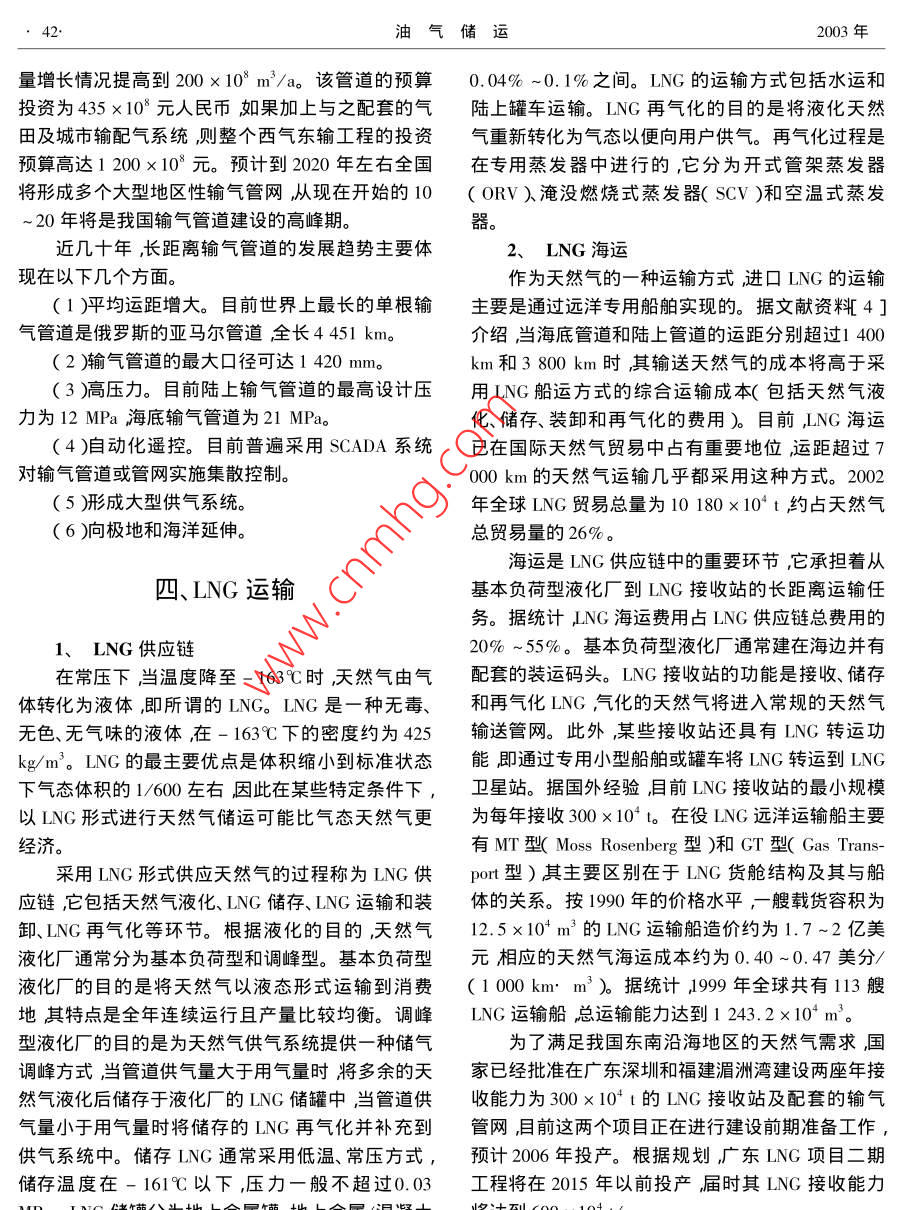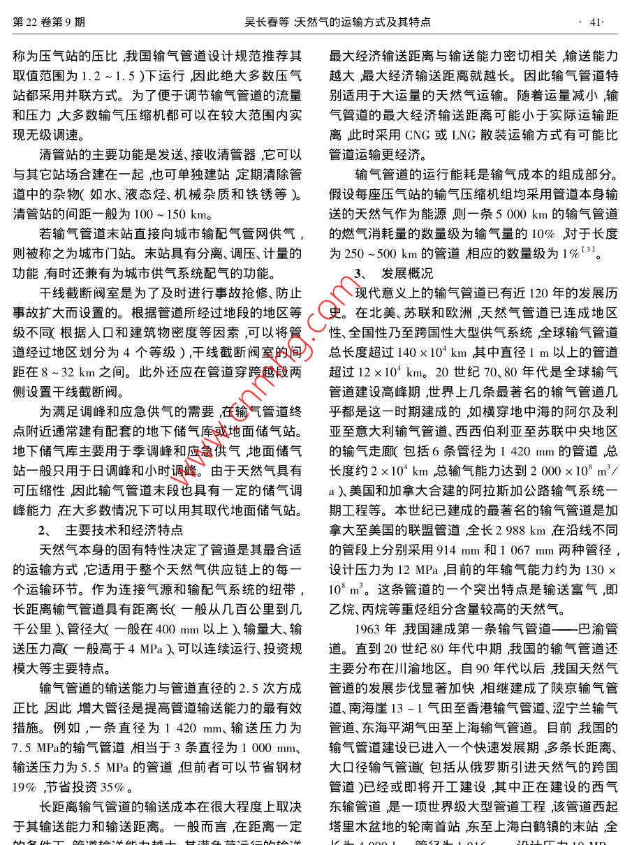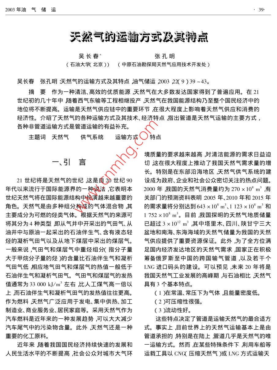 2003年油氣儲(chǔ)運(yùn)天然氣的運(yùn)軸方式及其特點(diǎn)吳長(zhǎng)春張孔明石油大敩北京))(中原石油勘探局天然氣應(yīng)用技術(shù)開(kāi)發(fā)處)吳長(zhǎng)春張孔明天然氣的運(yùn)輸方式及其特點(diǎn)油氣儲(chǔ)運(yùn)2003229)39~43摘要作為一種清潔、高效的優(yōu)質(zhì)能源天然氣在大多數(shù)發(fā)達(dá)國(guó)家得到了普遍應(yīng)用。在21世紀(jì)初的幾十年中隨著西氣東輸?shù)裙こ滔嗬^投產(chǎn)天然氣在我國(guó)能源結(jié)構(gòu)乃至整個(gè)國(guó)民經(jīng)濟(jì)中的地位將不斷提高。運(yùn)輸是天然氣供應(yīng)鏈中的重要環(huán)節(jié)在很大程度上影響著天然氣供應(yīng)和消費(fèi)的經(jīng)濟(jì)性。介紹了天然氣的各種運(yùn)輸方式及其技術(shù)、經(jīng)濟(jì)特點(diǎn)指出管道是天然氣運(yùn)輸?shù)闹饕绞?各種非管道運(yùn)輸方式是管道運(yùn)輸?shù)挠幸嫜a(bǔ)充。主題詞天然氣供氣系統(tǒng)運(yùn)輸方式特點(diǎn)境質(zhì)量的要求越來(lái)越高對(duì)清潔能源的需求日益迫引言切這在很大程度上推動(dòng)了我國(guó)天然氣需求量的增長(zhǎng)。特別是在東部沿海地區(qū)天然氣供氣系統(tǒng)的建21世紀(jì)將是天然氣的世紀(jì)這是自20世紀(jì)90設(shè)成為政府、企業(yè)和社會(huì)公眾密切關(guān)注的熱點(diǎn)問(wèn)題年代以來(lái)流行于國(guó)際能源界的一種說(shuō)法,它表明本2000年我國(guó)的天然氣消費(fèi)量約為270×103m3有世紀(jì)天然氣將在國(guó)際能源結(jié)構(gòu)中扮演越來(lái)越重要的關(guān)部門(mén)的預(yù)測(cè)資料表明2005年、2010年和2015年角色。天然氣是由多種組分構(gòu)成的氣體混合物其的需求量將分別達(dá)到643×108m3、1123×10°m3和主要成分為可燃的烴類氣體。根據(jù)天然氣的來(lái)源可1752×10°m3。目前我國(guó)探明的天然氣地質(zhì)儲(chǔ)量將其分為4種類型即從氣井中開(kāi)采出的氣田氣、從已超過(guò)3×10"2m3其中塔里木、四川、陜甘寧三大油井中與原油一起采岀的石油伴生氣、含有液態(tài)輕盆地和南海、東海海域的天然氣儲(chǔ)量為我國(guó)的天然烴的凝析氣田氣以及從地下煤層中采岀的煤層氣。氣供應(yīng)提供了重要資源保證。此外,為了全方位滿般來(lái)說(shuō)氕氣田氣和煤層氣中重?zé)N組分(指分子量足國(guó)內(nèi)經(jīng)濟(jì)發(fā)達(dá)地區(qū)的天然氣需求國(guó)家正在積極大于甲烷分子量的烴〕的含量比石油伴生氣和凝析籌備俄羅斯至中國(guó)的跨國(guó)輸氣管道,以及若干個(gè)氣田氣低相應(yīng)地氣田氣和煤層氣的熱值一般低于LNG進(jìn)口碼頭的建設(shè)??梢灶A(yù)見(jiàn),未來(lái)20年將是石油伴生氣和凝析氣田氣。氣田氣和煤層氣的發(fā)熱我國(guó)天然氣工業(yè)發(fā)展的高峰期與石油相比天然氣值通常為33000kJ/m3左右比人工煤氣高一倍以具有3個(gè)基本特點(diǎn)。上而石油伴生氣和凝析氣田氣的發(fā)熱值往往更高。(1)在常溫、常壓下為氣體且能量密度低作為燃料天然氣廣泛應(yīng)用于發(fā)電、集中供熱、加工(2)可壓縮性很強(qiáng)。制造業(yè)商業(yè)服務(wù)業(yè)、居民家庭等。采用天然氣作為(3)流動(dòng)性好。汽車燃料是近年來(lái)的一種發(fā)展趨勢(shì)可以大大減少這些特點(diǎn)決定了管道是運(yùn)輸天然氣的最合適方汽車尾氣中的污染物含量。此外天然氣還是一種式。事實(shí)上目前世界上的天然氣運(yùn)輸基本上是由重要的化工原料。管道承擔(dān)的特別是在陸上管道幾乎是天然氣的唯近年來(lái)隨著我國(guó)國(guó)民經(jīng)濟(jì)持續(xù)快速的發(fā)展和運(yùn)輸方式。然而在某些特殊條件下利用車船等人民生活水平的不斷提高社會(huì)公眾對(duì)城市大氣環(huán)運(yùn)載工具以CN壓縮天然氣)或LNG方式運(yùn)輸天油氣儲(chǔ)運(yùn)2003年然氣可能比管道更經(jīng)濟(jì)。作為天然氣供應(yīng)鏈中的重在運(yùn)行壽命期內(nèi)壓力變化大等特點(diǎn)。長(zhǎng)距離輸氣管要環(huán)節(jié)運(yùn)輸方式的選擇將在很大程度上影響天然道的仼務(wù)是將凈化處理后的天然氣輸送到城市門(mén)站氣供應(yīng)和消費(fèi)的經(jīng)濟(jì)性。鑒于此將結(jié)合天然氣的或大型工業(yè)用戶。天然氣城市輸配管網(wǎng)的任務(wù)是將特性概要介紹它的各種運(yùn)輸方式及其技術(shù)、經(jīng)濟(jì)特來(lái)自長(zhǎng)輸管道或其它氣源的天然氣輸送、分配到毎點(diǎn)對(duì)我國(guó)天然氣運(yùn)輸方式的選擇和供氣系統(tǒng)規(guī)劃用戶。大城市的輸配氣管網(wǎng)的規(guī)??赡芟喈?dāng)大具有參考價(jià)值。以至于其建設(shè)工程量和投資可能會(huì)超過(guò)為它供氣的長(zhǎng)輸管道。這類管道的壓力等級(jí)和管徑范圍均較二、天然氣供氣系統(tǒng)寬超高壓配氣干線的壓力可達(dá)4MPa而入戶管道的壓力不超過(guò)5kPa配氣干線的直徑可達(dá)1m以天然氣從油氣田井囗到終端用戶的全過(guò)程稱為上而入戶管道的直徑一般只有20mm天然氣供應(yīng)鏈這條供應(yīng)鏈所涉及的所有設(shè)施構(gòu)成雖然礦場(chǎng)集輸和城市輸配也屬于天然氣運(yùn)輸?shù)牡南到y(tǒng)稱為天然氣供氣系統(tǒng)。一個(gè)完整的天然氣供范疇但由于這兩個(gè)環(huán)節(jié)幾乎只采