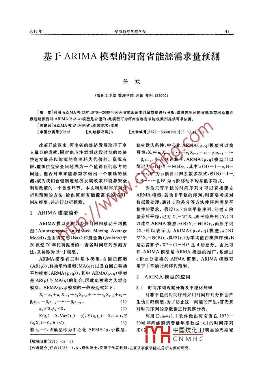 2010年安陽師范學(xué)院學(xué)報(bào)41基于ARIMA模型的河南省能源需求量預(yù)測(cè)任歡(安陽工學(xué)院數(shù)理學(xué)院,河南安陽455000[摘要]利用 ARIMA模型對(duì)1979-2009年河南省能源需求總量數(shù)據(jù)進(jìn)行分析,結(jié)果表明河南省能源需求總量在做短期預(yù)測(cè)時(shí)ARIMA(2,2.,4)模型是合理的.此模型可為河南省制定節(jié)能政策用提供可靠依據(jù)。[關(guān)鍵詞]ARIMA模型;河南省;能源需求;預(yù)測(cè)[中圖分類號(hào)]0212[文獻(xiàn)標(biāo)識(shí)碼]A[文章編號(hào)]1671- 5330(2010)05- 0041-03改革開放以來,河南省的經(jīng)濟(jì)發(fā)展取得了令缺省默認(rèn)條件,中心化ARMA(p,q)模型可以簡(jiǎn)人矚目的成就,同時(shí)也應(yīng)注意到這段時(shí)期的經(jīng)濟(jì)快速發(fā)展是以能源的高消耗為代價(jià)的。資源有一Ber-g,引入延遲算子,ARMA(p,q)模型可以限,能源供應(yīng)安全問題成為一個(gè)值得我們思考的簡(jiǎn)記為:a(B)X,= 0(B)en,其中a(B)=1-aB-問題。能否對(duì)未來能源需求做出一個(gè)準(zhǔn)確的預(yù).-a,BP為p階自回歸系數(shù)多項(xiàng)式,日(B)=1-.測(cè),成為我們合理制定經(jīng)濟(jì)發(fā)展政策和能源安全βB--β.B°為q階移動(dòng)平均系數(shù)多項(xiàng)式。利用政策的一個(gè)重要環(huán)節(jié)。本文利用時(shí)間序列分因?yàn)橹挥衅椒€(wěn)的時(shí)間序列才可以直接建立析和預(yù)測(cè)的方法,給出河南省能源需求的ARI-ARMA模型,若為非平穩(wěn)的序列,則需要考慮對(duì)MA模型,并進(jìn)行分析預(yù)測(cè)。數(shù)據(jù)做處理,通過d階差分等方法使序列滿足平穩(wěn)性的要求。假設(shè){x}為非平穩(wěn)序列,經(jīng)過d階1 ARIMA 模型簡(jiǎn)介差分后平穩(wěn),記為Y,=V°X,則平穩(wěn)序列{Y,}可ARIMA模型全稱為差分自回歸移動(dòng)平均模以建立ARMA模型:a(B)Y.=0(B)e,.而原序列型( Autoregressive Integrated Moving Average{X,}可以表示為ARIMA(p,d,q)模型:a(B)Model),是由博克思(Box)和詹金斯(Jenkins)于V°X, =0(B)e. ,其中{e,}為零均值白噪聲序列,B20世紀(jì)70年代初提出的一著名時(shí)間序列預(yù)測(cè)方是后裔算子,V“=(1-B)“是d階差分。由此可法,又被稱為B-J模型。知,ARIMA模型是ARMA模型的推廣, 是經(jīng)過ARIMA模型有三種基本類型:自回歸模型d階差分變換的ARMA模型。ARIMA模型可(AR(p))、移動(dòng)平均模型(MA(q))以及自回歸移動(dòng)用于非平穩(wěn)時(shí)間序列預(yù)測(cè)。平均模型(ARMA(p,q)),其中ARMA(p,q)模型2 ARIMA 模型的應(yīng)用是AR(p)與MA(q)的組合,因此也被稱之為混合模型。ARMA(p,q)模型的一般表達(dá)式如下:2.1時(shí)間序列觀察分析及平穩(wěn)化處理X.=ao+aX-:+azX-+..+apX.-.+e.-對(duì)非平穩(wěn)的時(shí)間序列采用時(shí)間序列分析會(huì)產(chǎn)β:e-1- Bx∈:z- "- Be1-q,(1)生偽回歸模型,為了防止這一問題的產(chǎn)生,首先要ap≠0,β≠0,對(duì)時(shí)間序列的原數(shù)據(jù)進(jìn)行觀察分析。E(e)=0, Var(e)=o',E(ee)=0,s≠t,E利用Eviews3.1軟件做出河南省在1979一(e,X,)=0,Vs