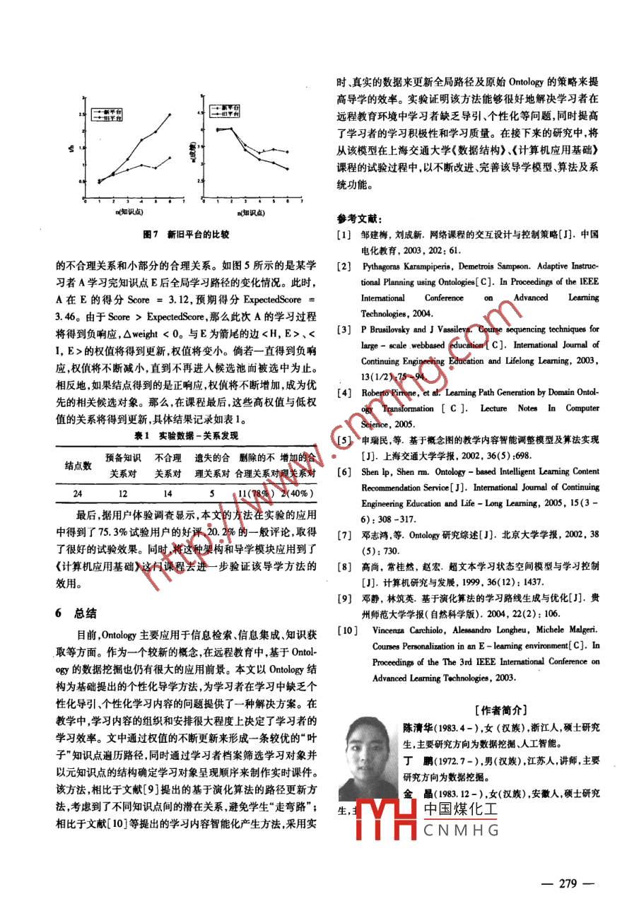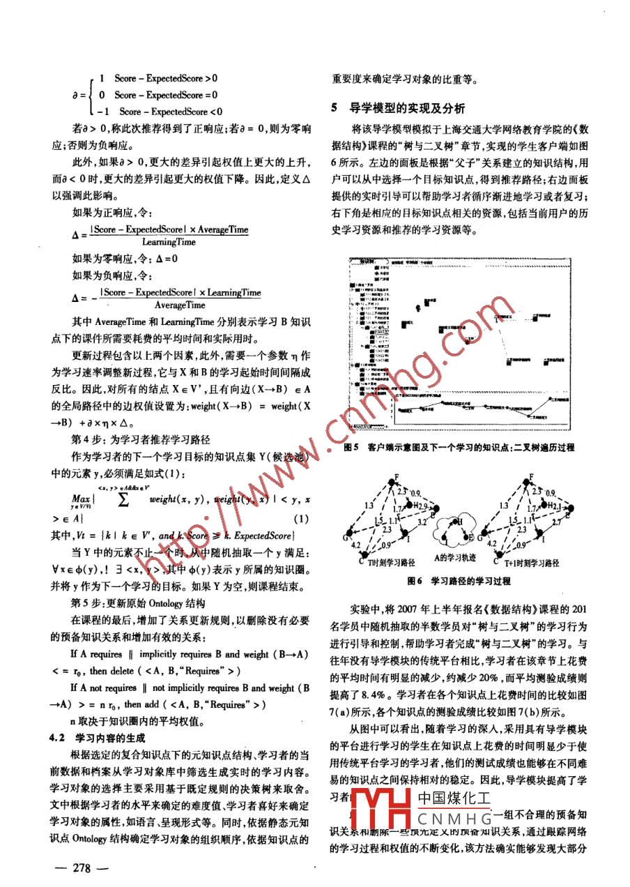 第25卷第10期計(jì)算機(jī)仿真2008 年10月文章編號(hào):1006 - 9348(2008)10-0275 -05學(xué)習(xí)指導(dǎo)的設(shè)計(jì)與實(shí)現(xiàn)陳清華,丁鵬,金晶(_上海交通大學(xué)計(jì)算科學(xué)與工程系,上海200240)摘要:針對(duì)遠(yuǎn)程教育平臺(tái)中,因缺乏有效的學(xué)習(xí)控制、個(gè)性化的引導(dǎo)、調(diào)節(jié)等而導(dǎo)致平均學(xué)習(xí)效率低下的問(wèn)題,提出了一種基于知識(shí)點(diǎn)架構(gòu)的個(gè)性化課程導(dǎo)學(xué)模型。該模型根據(jù)課程中知識(shí)點(diǎn)的本體結(jié)構(gòu)、資源檔案以及學(xué)習(xí)者的檔案和學(xué)習(xí)行為等,通過(guò)知識(shí)點(diǎn)本體結(jié)構(gòu)與圖的轉(zhuǎn)換、路徑權(quán)值更新、路松搜索內(nèi)容篩選、本體更新等步驟,實(shí)時(shí)地定制出適合于學(xué)習(xí)者個(gè)體的學(xué)習(xí)內(nèi)容。在實(shí)驗(yàn)中,方法應(yīng)用于上海交通大學(xué)網(wǎng)絡(luò)教育學(xué)院的《數(shù)據(jù)結(jié)構(gòu)》課程。經(jīng)分析與研究說(shuō)明,算法不僅能夠幫助學(xué)習(xí)者完成課程的學(xué)習(xí),并能有效地控制引導(dǎo)學(xué)習(xí)者對(duì)資源的訪向和課程的學(xué)習(xí),達(dá)到了提高學(xué)習(xí)者學(xué)習(xí)質(zhì)量和學(xué)習(xí)興趣的月的;同時(shí),該方法也能夠發(fā)現(xiàn)課程初始本體結(jié)構(gòu)中不合理的關(guān)系。關(guān)鍵詞:遠(yuǎn)程教育;個(gè)性化服務(wù);課程編例;學(xué)習(xí)控制;學(xué)習(xí)路徑;本體中圈分類號(hào):TP391.7文獻(xiàn)標(biāo)識(shí)碼:ADesign and Implementation of Learning GuidanceCHEN Qing - hua , DING Peng,JIN Jing(Depl. of Computer Sci, and Eng. ,Shanghai Jjiaotong Univ. , Shanghai 200240, China)ABSTRACT: 'This paper describes a novel methodology to generate personalized learning guidance content for e-learners according to course ontology and their profiles. Through ontology - graph transformnation, weight updating al-gorithm, content customization and ontology update, the methodology implements an automatic - adapted relationshipwith gradually enhanced leaning control. After a period of learning, the ontology can be updated to achieve a moreaccurate personalization. The proposed methodology is applied to the implementation of a web based leaming systembased upon the course‘Data Structure' . Experimental results show that the model can not only help the e - learmersfinish their course , but also can achieve the purpose of increasing learming eficiency and quality through the way ofcotrlling their access to leaning resources and giving them efective guidance.KEYWORDS: E - learning; Personalized service; Course 8equencing; Lerming control; Learming path; Ontology問(wèn)題。1引盲根據(jù)對(duì)上海交通大學(xué)網(wǎng)絡(luò)教育學(xué)院的專項(xiàng)調(diào)查顯示,具隨著計(jì)算機(jī)、多媒體技術(shù)的飛速發(fā)展和廣泛應(yīng)用,遠(yuǎn)程有相似學(xué)習(xí)興趣的學(xué)員趨向于需求相同的學(xué)習(xí)資源,并對(duì)它教育(E - Learning)突破了傳統(tǒng)教學(xué)方式的物理限制,為更多們有類似的評(píng) 分;而具有相近學(xué)習(xí)順序的學(xué)員在同等成績(jī)的人提供了豐富的學(xué)習(xí)資源和方便、靈活的教學(xué)環(huán)境。然下,花費(fèi)的時(shí)間 相近。學(xué)習(xí)材料的選擇學(xué)習(xí)順序的制定影而,在享受遠(yuǎn)程教育帶來(lái)的優(yōu)勢(shì)的同時(shí),也伴隨著新的需求響學(xué)習(xí)質(zhì)量,如果學(xué)員能夠?qū)?nèi)容的學(xué)習(xí)有一個(gè)合理的組織和問(wèn)題。目前,很多遠(yuǎn)程教育機(jī)構(gòu)都只注重資源的宣傳,缺和安排,可大大提高 學(xué)員的學(xué)習(xí)效率。在相關(guān)研究中, Py-乏學(xué)習(xí)控制"和個(gè)性化的學(xué)習(xí)指導(dǎo)。面對(duì)學(xué)生數(shù)目龐大、學(xué)thagoras 等[23提出了一-種基于本體( Ontology)的課程編例['3生之間水平參差不齊學(xué)生缺乏教師直接指導(dǎo)的遠(yuǎn)程教育環(huán)通用體系,該方法通過(guò)將學(xué)習(xí)者檔案作為參數(shù)對(duì)學(xué)習(xí)對(duì)象進(jìn)境,如何利用學(xué)習(xí)者在網(wǎng)絡(luò)課堂中的學(xué)習(xí)活動(dòng)記錄、測(cè)試記行過(guò)濾產(chǎn)生虛擬學(xué)習(xí)對(duì)象池,最后根據(jù)領(lǐng)域Ontology和教學(xué)錄及學(xué)習(xí)者的留言等反饋信息指導(dǎo)學(xué)習(xí)者并進(jìn)行有效的學(xué)計(jì)劃從她中洗取對(duì)爭(zhēng)并產(chǎn)生個(gè)姓化理程;Roberto等[4]提出習(xí)控制"、引導(dǎo)和調(diào)節(jié)成了遠(yuǎn)程課程教學(xué)方式中亟待解決的中國(guó)煤化工成方法,將課程架構(gòu)成三層|YHC N M H G文檔) ,先將Ontology基金項(xiàng)目:國(guó)家自然科學(xué)基金項(xiàng)目(60372078)轉(zhuǎn)換成權(quán)重圖,并從圖中搜索達(dá)到特定目標(biāo)的學(xué)習(xí)路徑。收稿日期:2007 -09-17修回日期:2007 -10-03Shen Ip等0則提出了一-種基于Ontology的智能化學(xué)習(xí)內(nèi)容-275-推薦算法。上述方法以O(shè)nlology()]) 為基礎(chǔ),通過(guò)知識(shí)挖掘、發(fā)現(xiàn)潛在RoquiresRequiresLeaming的關(guān)系的過(guò)程以達(dá)到適應(yīng)性學(xué)習(xí)的目的。然而,上述方法尚Is-forResources處在理論階段,缺乏有效的實(shí)驗(yàn)數(shù)據(jù)來(lái)證實(shí)其可用性。另外/CompoundAlE-方面,雖然它們
