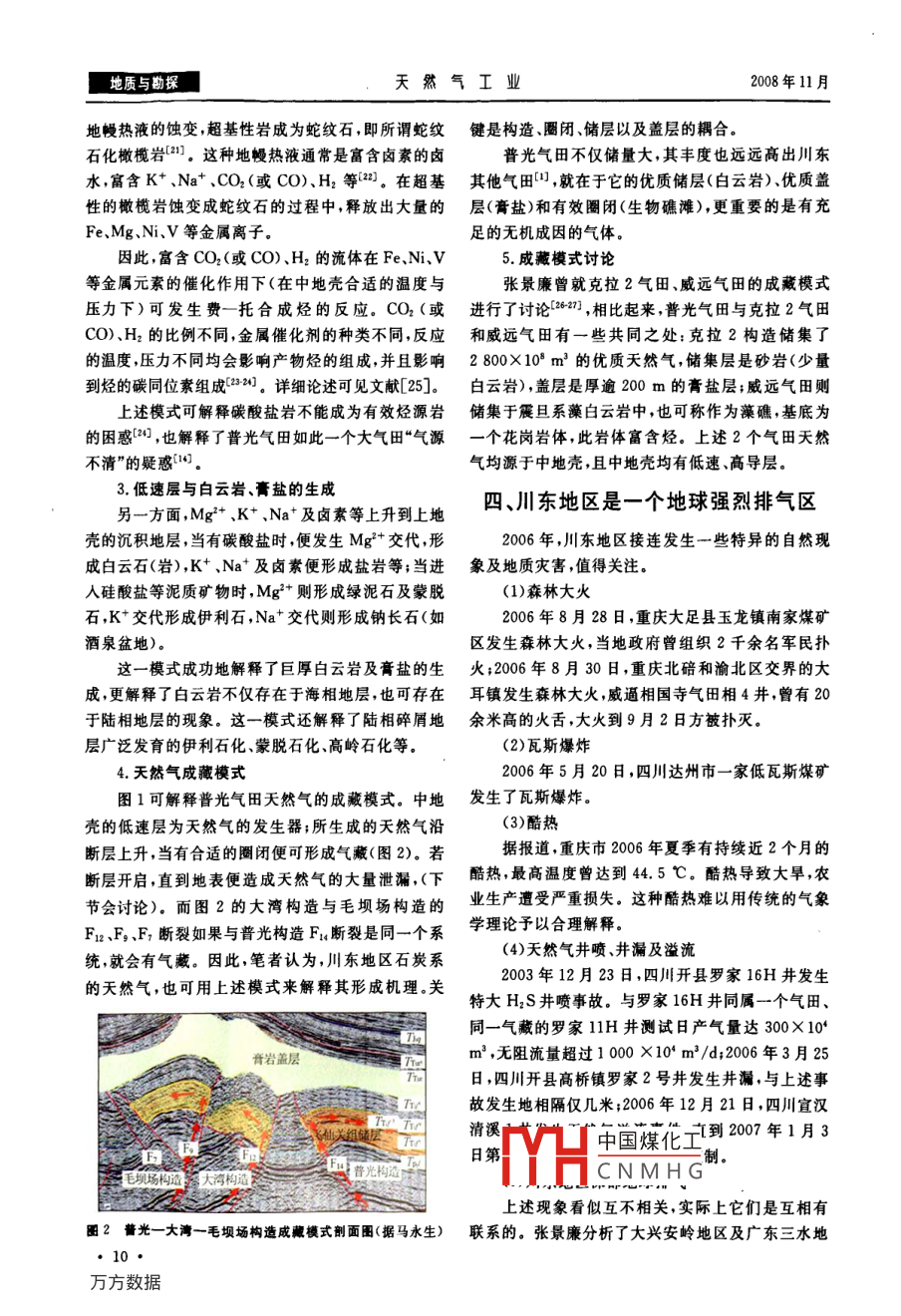 地質(zhì)與探天然氣工業(yè)2008年11月普光氣田的天然氣可能是無機(jī)成因的石蘭亭12鄭榮才1張景廉2衛(wèi)平生2張虎權(quán)2(1.成都理工大學(xué)2.中國石油勘探開發(fā)研究院西北分院)石蘭事等,普光氣田的天然氣可能是無機(jī)成因的.天然氣工業(yè),2008,28(11):8-1摘要普光氣田天然氣的成因由于地質(zhì)儲量和氣源等認(rèn)識有待深入備受關(guān)注。普光氣田的深部中地殼存在一個(gè)低速層,該低速層是一個(gè)塑性層,具流變性質(zhì),是充滿氣體及離子的熱液流體。一方面,熱液流體與橄欖巖等超基性巖發(fā)生蝕變反應(yīng),生威Fe2'、Mg2'及V、Ni等;另一方面,CO2(或CO)與H2在中地殼的恰當(dāng)溫度、壓力下在VNi等金屬的催化下,發(fā)生費(fèi)一托合成烴的反應(yīng)。這時(shí),攜帶K+、Na·、Cl-、Fe2+、Mg的熱液體上升到沉積地層,當(dāng)通到碳酸鹽巖時(shí),便發(fā)生Mg2交代或Fe2+、Mg2交代形成鐵白云石及鹽巖等,當(dāng)通到碎屑巖(硅酸鹽)時(shí),便發(fā)生綠泥石化(Mg2+交代)、伊利石化(K+交代),蒙脫石化(Mg2+交代)作用并生成鹽類礦物。費(fèi)一托反應(yīng)生成的烴可沿?cái)嗔严到y(tǒng)上升到儲層中(如白云巖及砂巖)而成藏,研究結(jié)果表明普光氣田天然氣的成因及成藏模式可能就是通過上述途徑實(shí)現(xiàn)的,即普光氣田的天然氣可能是無機(jī)成因的。川東地區(qū)還是一個(gè)地球強(qiáng)烈排氣的區(qū)城那些尚沒有團(tuán)閉成藏的天然氣影響了當(dāng)?shù)貧夂?如酷熱、森林大火等)。結(jié)論認(rèn)為:尋找普光氣田型的天然氣藏(生物礁一白云巖一膏鹽組合)是21世紀(jì)四川盆地天然氣勸探的主要目標(biāo)。主題詞普光氣田氣藏形成無機(jī)成因低速帶塑性流體費(fèi)一托反應(yīng)生物礁白云巖引言烷的碳同位素值難以確定其氣源鑒于上述情況,金之鈞教授等曾撰文認(rèn)為“普光最近,馬永生教授撰文,論述了“四川盆地普光氣田的氣源不清1。并指出這是海相油氣勘探的大型氣田的形成機(jī)制”1,筆者擬從新的視角來分析主要問題之一。因此,深入探討普光氣田天然氣的普光氣田的深部地質(zhì)地球物理背景,并論述普光氣氣源及成因十分必要。田的天然氣可能是無機(jī)成因的自普光氣田發(fā)現(xiàn)以來,以馬永生教授為主的項(xiàng)普光氣田的儲層與蓋層目組先后在《地質(zhì)論評》、《地質(zhì)學(xué)報(bào)》、《石油實(shí)驗(yàn)地普光氣田是一個(gè)生物礁灘型氣田。質(zhì)》《石油大學(xué)學(xué)報(bào)》、《石油與天然氣地質(zhì)》、《地學(xué)1.白云巖儲層前緣》《海相油氣地質(zhì)》等刊物發(fā)表了一系列論普光構(gòu)造位于碳酸鹽巖臺地邊緣,主要發(fā)育鮞文21,全面論述了普光氣田的沉積、層序地層、儲粒白云巖殘余鮞粒白云巖和糖粒狀殘余鮞粒白云層、礁灘及成藏模式,也有專門論述二疊系長興組生巖。這種白云巖總厚度約250m,為普光氣田的主物礁的。但深人討論普光氣田氣源的文章則還沒力儲層。如此巨厚的白云巖Mg2+的來源一直困惑有。蔡勛育等從瀝青地球化學(xué)的角度認(rèn)為該氣田氣著沉積學(xué)家及石油地質(zhì)學(xué)家(孫樞、張景廉,《白云體源于上二疊統(tǒng)烴源巖干酪根;馬永生根據(jù)烴源石、白云巖成因研究述評》,2004年)。根據(jù)筆者的研巖的演化史、儲層流體包裹體分析資料所卻確定的究,當(dāng)?shù)蒯嵋荷仙降妆儆诨◢弾r層與玄武巖層油氣成藏期提出普光氣田的主力烴源巖為中、下志的超基性巖時(shí),會發(fā)生廣泛的蛇紋石化,釋放出大量留統(tǒng)及二疊系1,但這種分析有諸多的不確定性。的Mg2與Fe2。這種熱液繼續(xù)上升,如進(jìn)入碳酸馬永生在文獻(xiàn)[12]中認(rèn)為,普光氣田天然氣干燥系鹽巖地層便發(fā)生自云石化鐵自云石化;如上升到硅數(shù)大,乙烷含量過低,無法準(zhǔn)確分析碳同位素組成,酸鹽中國煤化工陸相地層也有碳而天然氣又受到TSR的蝕變和改造。因此僅憑甲酸鹽丬CNMHG達(dá)木盆地西部的作者簡介:石蘭亭,1963年生高級工程師博士研究生;主要從事石油地質(zhì)、油氣藏描述等工作。地址:(730020)甘肅省蘭州市雁兒灣路535號。電話:(0931)8686135.E-mail:lanzhouslt@163.com第28卷第11期天然氣工業(yè)地質(zhì)與勘探古近系濟(jì)陽坳陷古近系、江漢盆地古近系、南陽盆需要找生物礁灘(有好的構(gòu)造),第二找礁體內(nèi)白云地古近系及酒泉盆地下白堊統(tǒng)的白云巖。在普光巖(好的儲集體)第三找巨厚的膏鹽(好的封蓋氣田埋深500m的白云巖孔隙度最大可達(dá)27.9%,層)1。普光氣田就滿足上述條件最大滲透率可達(dá)1000×10pm2,而這種熱液交代的白云巖在國內(nèi)尚不多見1。、普光氣田深部地殼構(gòu)造特征2.膏鹽蓋層1.宣漢一靈寶地質(zhì)地球物理剖面四川盆地的三疊紀(jì)是一個(gè)主要的成鹽期。對于20世紀(jì)80年代,原地質(zhì)礦產(chǎn)部第一綜合物探大膏鹽,一直被認(rèn)為是蒸發(fā)成因的,幾乎從未被懷隊(duì)第二綜合物探大隊(duì)進(jìn)行了四川宣漢到河南靈寶疑過。剖面的地質(zhì)地球物理調(diào)查工作隨著油氣勘探的深入,發(fā)現(xiàn)含鹽盆地的古氣候從圖1可以看出:①商丹斷裂一帶有正磁異常;并非干早,而是十分濕熱,鹽巖分布受深大斷裂控②在宣漢一帶有一個(gè)重力低異常;③從四川宜漢到