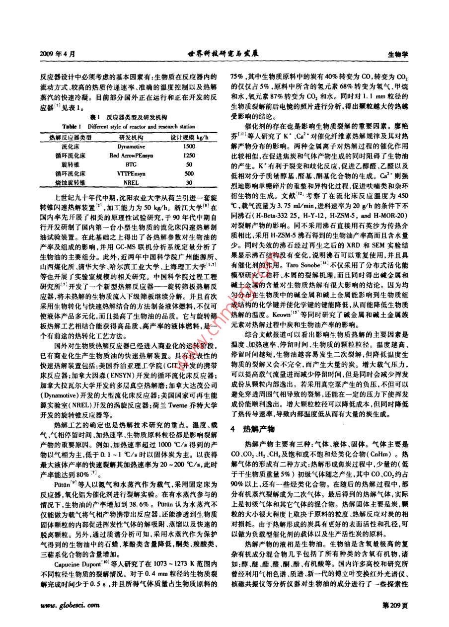 第31謄第2期世界科技研憲與發(fā)展Vol. 31No.22009年4月208 -210頁(yè)WORLD SCI-TECH R&DApr. 2009 pp. 208 -210纖維素類(lèi)生物質(zhì)熱解研究進(jìn)展王通洲高虹(沈陽(yáng)理工大學(xué)環(huán)境與化學(xué)工程學(xué)院,沈陽(yáng)理工大學(xué)新型能源技術(shù)開(kāi)發(fā)中心,沈陽(yáng)110168)摘要:從熱解的機(jī)理、工藝 、反應(yīng)器等方面綜述了國(guó)內(nèi)外對(duì)纖雛素類(lèi)生物質(zhì)越解研究的現(xiàn)狀,討論了生物質(zhì)熱解產(chǎn)物的組成及其理化特性,重點(diǎn)介紹了然解制備生物油技術(shù)。生物油既可以作為燃料油直接燃燒又可以進(jìn)一步通過(guò)加氫或者裂解制備其它精細(xì)化學(xué)品,還可以從中提取有用的化學(xué)原材料。因此,纖維素類(lèi)生物質(zhì)熱解制取生物油技術(shù)被看作是最有發(fā)展前景的生物質(zhì)利用技關(guān)鍵詞:纖維素類(lèi)生物質(zhì);熱解;生物油中國(guó)分類(lèi)號(hào):Q65文獻(xiàn)標(biāo)識(shí)碼:AResearch Progress in Cellulosic Biomass PyrolysisWANG Tonghou GAO Hong(Scbool of Eovironmental and Chemical Engineering, Reseurch & Center Developroent d New EoergyTchnology ,Shenyang Ligong Univerity ,Shemyung 110168)Abstrec:This peper inoduced the rearch progress of euleie biomnses prolyeis from the mechanism, the proges in the word and thereactor of biomass pyrolysis. The composition , physical and chemical characteristic of the pyrolyeis product are discused bere. This paper alsofocused on pyrolysis techology which uwsed to produce bio-oil. The bio-oil is not only used酗fuel oil but also can be used 1o produce otherchemical productions by bydrogenation or cmacking. So the ellulosic biomas prolyie technology is the one that has the moot devedopingprospect,Key wordselluloic biomss pylyis;iooil解:半纖維素在225 ~350 C分解、纖維素在325 -375 C分1引言解.木質(zhì)素在250 ~500 C進(jìn)行分解”。通過(guò)熱重分析表明,生物質(zhì)是地球上廣泛存在的可再生資源之一。纖維素生物質(zhì)在熱解的初始階段( 100 C左右)有輕微失重,這和通類(lèi)生物質(zhì)是植物通過(guò)光合作用將空氣中的二氧化碳和水轉(zhuǎn)過(guò)工業(yè)分析所得生物質(zhì)的水分含量能夠吻合。Babu BV!°等化成的有機(jī)質(zhì)。由于其具有產(chǎn)量巨大、可再生性、能進(jìn)行碳人認(rèn)為生物質(zhì)熱解經(jīng)過(guò)五步完成:第-步,來(lái)自加熱源的熱循環(huán)、可液化獲得液體燃料.可熱解獲得多種高附加值的化量預(yù)熱反應(yīng)器內(nèi)部生物質(zhì);第二步,溫度繼續(xù)升高,生物質(zhì)中學(xué)產(chǎn)品和生物油等優(yōu)點(diǎn)而成為國(guó)內(nèi)外研究人員的研究熱的揮發(fā)成份釋放、焦油形成;第三步,熱量在熱的揮發(fā)成份和點(diǎn)。冷卻器之間進(jìn)行傳導(dǎo),沒(méi)有裂解的生物質(zhì)隨揮發(fā)成份流出;纖維素類(lèi)生物質(zhì)主要指植物的秸稈,如樹(shù)木、農(nóng)作物秸第四步,揮發(fā)成份冷凝形成生物油,沒(méi)有來(lái)得及冷凝的部分稈、草類(lèi)以及工農(nóng)業(yè)產(chǎn)品的廢料甘蔗渣、橄欖瀆等,其主要成隨不可冷凝氣體排出;第五步,由于交互式的自催化作用生分是纖維素、半纖維素、木質(zhì)素。目前對(duì)于纖維素類(lèi)生物質(zhì)物油在反應(yīng)器內(nèi)發(fā)生二次裂解。浙江大學(xué)王樹(shù)榮,等通過(guò)的處理方法主要有生物轉(zhuǎn)換法.物理轉(zhuǎn)換法、熱化學(xué)轉(zhuǎn)換法,在線紅外分析認(rèn)為裂解初期產(chǎn)物主要為酸類(lèi)、醇類(lèi)、酮類(lèi)醛其中熱化學(xué)轉(zhuǎn)換包括直接燃燒、氣化.熱解。直接燃燒儀能類(lèi)、酯類(lèi)水分和小分子氣體等,隨后大分子物質(zhì)又二次降解獲得生物質(zhì)總能量的10 - 20% ,采用新型設(shè)計(jì)的省柴灶能提為一氧化碳為主的氣體產(chǎn)物。Anta'2! 等人認(rèn)為纖維素在裂高到40- 45%: ,目前主要在農(nóng)村被使用以及用于直燃發(fā)解初期先經(jīng)過(guò)脫水作用形成脫水纖維素,脫水纖維素進(jìn)一步電。氣化可以獲得甲烷,一氧化碳、氫氣以及小分子氣態(tài)烴,分解產(chǎn)生大多數(shù)的炭和一些揮發(fā)物。但在相對(duì)稍高溫度下,既可以直接燃燒提供熱量又可以做為原料合成甲醇等燃料。脫水纖維隸解聚會(huì)產(chǎn)生左旋葡萄糖焦油的反應(yīng)和其競(jìng)爭(zhēng)。熱解是在隔絕或少量供給氧氣的條件下,加熱生物質(zhì)分解獲閃速熱解由于采用高升溫速率,高反應(yīng)溫度短的停留時(shí)間得炭、液體油、氣體的過(guò)程。熱解產(chǎn)物炭可以做為生產(chǎn)活性使纖維素完全轉(zhuǎn)化為生物油和裂解氣,慢速裂解則由于較長(zhǎng)炭的原材料;液體生物油含有多種化工行業(yè)所必須的原材料的停留時(shí)間使得左旋葡萄糖主要轉(zhuǎn)化為炭’6。以及高附加值的產(chǎn)品并改性后直接用于透平機(jī);氣體可以合目前國(guó)內(nèi)外對(duì)生物質(zhì)熱解機(jī)理的研究都側(cè)重于采用熱成甲醇等燃料)]。通過(guò)熱解可以將低能量密度的生物質(zhì)轉(zhuǎn)分析或者熱分析紅外聯(lián)用技術(shù)在線分析不同溫度下裂解產(chǎn)化為高能量密度的氣液固產(chǎn)品,便于儲(chǔ)存運(yùn)輸。此外采用物,但沒(méi)有深人研究纖維素.半纖維素、木質(zhì)素的結(jié)構(gòu)并從理纖維索類(lèi)生物質(zhì)做為熱解原料不