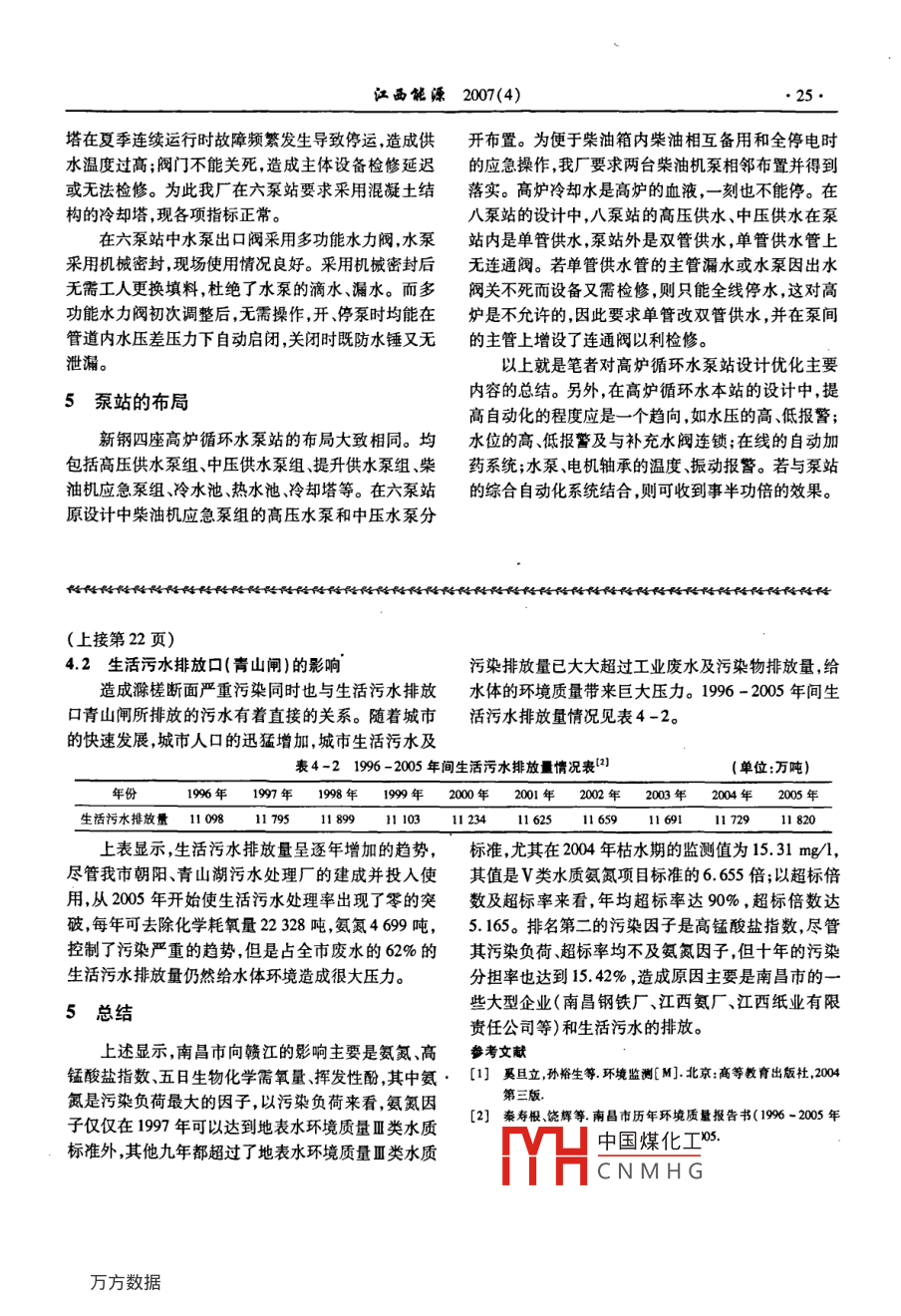 江西能賑2007(4)·23高爐循環(huán)水泵站的設計優(yōu)化鄒穎戈文金(江西新余鋼鐵有限責任公司第一動力廠江西新余338001)摘要:高爐冷卻水泵站是高爐的重要配套設施。文章總結了新鋼已建三個循環(huán)水泵站的建設經(jīng)驗對新建的6#高爐循環(huán)水泵站的設計方面作了較全面的優(yōu)化。在循環(huán)水泵站的設計和管理方面有很好的借鑒意義關鍵詞:高爐循環(huán)水泵站;設計運行方式;優(yōu)化中圖分類號:T284.7文獻標識碼:B文章編號:10057676(200)040303Abstract: The circulating-water pump house of blast fumace is the important accessorial facilities. The construction expe-rience of three circulating-water pump houses which has been built are summarized in this paper. The design for the newlybuilt circulating-water pump house of the No, 6 blast fumace is overall optimized. These design and management can be usedKey words: circulating-water pump house of blast fumace; design; running method; optimization新余鋼鐵公司近幾年新建了五座高爐配套設計備,即一段電源帶泵站所有的負荷另一段備用,在建設了4個高爐循環(huán)水泵站。按高爐建設的先后順用電失電時,通過電源柜自切實現(xiàn)安全供電。序,泵站名分別為八泵站、三泵站、七泵站六泵站。筆者認為該供電方式有欠妥之處,主要原因有:除了三泵站對應1#2#爐外,其他泵站名稱均與高爐若在用電源失電備用電源自投回路故障不能自投,名稱對應。這四個循環(huán)水泵站均由第一動力廠負責則泵站全面失電;若電機發(fā)生故障電機柜發(fā)生拒跳,管理?;螂姎夤收习l(fā)生在母線上,引起在用電源跳閘失電,在新建的四個高爐循環(huán)水泵站中,以最后投運的而備用電源自投會造成備用電源再次跳閘失電則泵六泵站最為完善。這主要是該廠通過在總結八站全面失電;若泵站外部電氣故障在用電源失電,而七泵站投運的經(jīng)驗,逐步對高爐循環(huán)水泵站的設計進該電源進線柜拒跳,造成備用電源不能自投,則泵站行完善和優(yōu)化的結果。下面就安全運行方式設計、吸全面失電?!沧?該廠中置式高壓斷路器因機械電氣水池設計、泵站布局等方面的完善和優(yōu)化做簡要介等原因多次出現(xiàn)不能動作的故障〕以上情況均嚴重紹:影響到高爐的正常供水。筆者認為七泵站兩段電源1安全運行方式設計都應投入且分段運行(七泵站配電簡圖見圖一,八三、六泵站的配電與七泵站類同),I段帶高壓泵組三、六、七八泵站均是高爐水系統(tǒng)自循環(huán)的泵中的二臺,中壓泵組中的兩臺,提升泵組中的一臺;Ⅱ站,運行模式相近且都相對平穩(wěn)。三六、八泵站高壓段帶高壓泵組中的三臺,中壓泵組中的二臺,提升泵泵、中壓泵提升泵各三臺,七泵站高壓泵五臺、中壓組中的兩臺。泵組內(nèi)的水泵間設定備自投。同一泵泵四臺、提升泵三臺。每個泵站有高壓、中壓供水柴組內(nèi)的水泵事故跳閘,則該泵組內(nèi)備用泵自啟動。當油機應急供水泵各一臺。各泵站水泵日常運行情況一段電源失電時,備用泵或柴油機應急泵自啟動,然見表一后查明原因決定是否倒換電源這樣高爐的正常供11供電及運行方式水不中國煤化工「供水的安全性。在七泵站的原設計中,原設計是兩段供電,一用CNMHG收稿日期:20070806作者簡介:鄒穎(1972-)男湖南醴陵人,畢業(yè)于包頭鋼鐵學院給排水專業(yè),工程師現(xiàn)從事給排水專業(yè)技術及管理工作24江西能賑2007(4)研究探討2柴油機應急泵的運行方式進水,熱水由提升泵送冷卻塔回冷水池,熱水無法直接進入冷水池。若發(fā)生大面積停電,外部補充水供給在泵站的原設計中,柴油機應急泵啟動是在兩段不上,高爐雖有水塔和柴油機應急泵供水,但如果恢電源失電的情況下自啟動,為高爐提供保安用水。筆復供電的時間過長,則可能發(fā)生的情況是:高爐循環(huán)者認為宜根據(jù)每段電源所帶水泵臺數(shù)決定柴油機應水泵站從冷水池經(jīng)柴油機應急泵送出去的水從高爐急泵的啟動方式,即對八、三、六泵站而言高〔中壓回到熱水池不斷的溢出外排,外部又無大量的補水,柴油機應急泵的失電自啟動應與帶兩臺高〔中〕壓電冷水池的水位急劇下降,造成最終的停泵。且在恢復機泵的電源進線柜實現(xiàn)失電連鎖啟動,當帶兩臺高壓供電后又不能迅速供水(因水泵此時無法排氣)。筆電機泵的電源失電,帶一臺高壓電機泵的電源上的水者認為應在冷熱水池間增設連通管(見圖二中的方泵保持運行或者自啟動同時高壓柴油機泵自啟動,式一)或連通孔(見圖二中的方式二),且是在最高運高爐的高壓供水保持恒定。中壓泵組類同。同理其行水位處連通。在全停電時,高爐回熱水池的冷卻水他泵站類同(示例如圖一的七泵站配電簡圖所示:七經(jīng)高位連通管或孔溢流至冷水池確保系統(tǒng)內(nèi)的水量泵站的中壓供水泵是二開二備,中壓柴油機應急泵的不損失,備用泵也因水位恒定隨時可在恢復供電時具失電啟動可在I段,也可在Ⅱ段的進線柜實現(xiàn)失電連備啟動條件。鎖啟動。但高壓供水泵組是三開二備,高壓柴油機應急水泵的失電啟動則應在Ⅱ段的進線柜實現(xiàn)失電的Ⅱ段PrI段進線連鎖啟動)。這樣擴大了柴油機應急泵的使用范圍Ⅱ段進線I段PT柴油機應急泵既可在兩段電源失電自啟動,也可在單2#電容補償1#電容補償2#提升泵1#提升泵段電源失電自啟動,使其由單一的應急功能擴