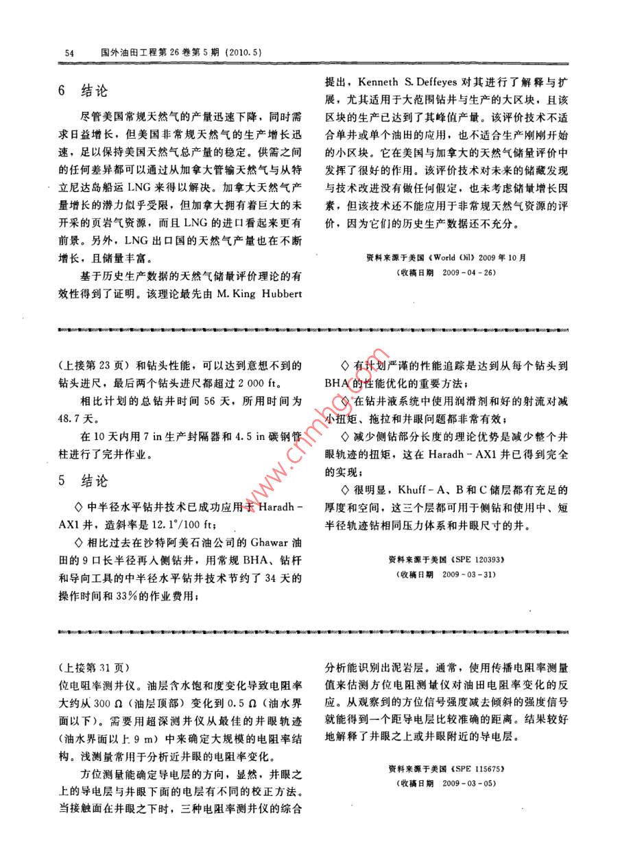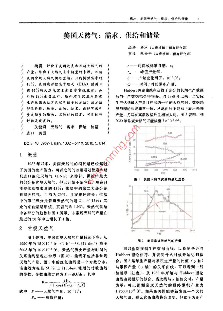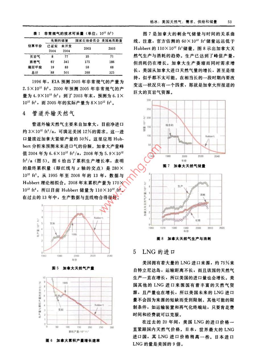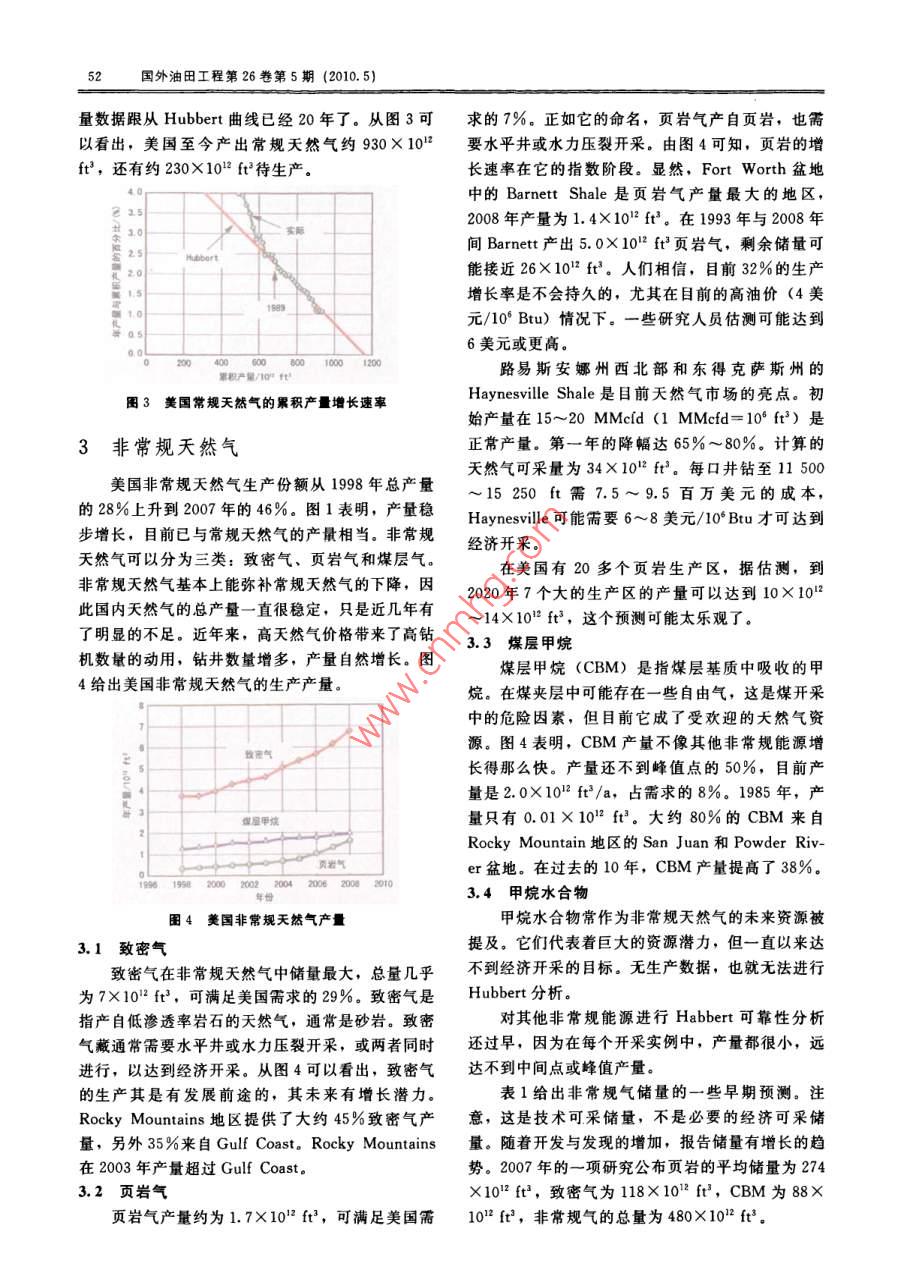 楊冰:美國(guó)天然氣:需求、供給和儲(chǔ)量美國(guó)夭然氣:需求、供給和儲(chǔ)量編譯:楊冰(大慶油田工程有限公司)審校:張興平(大慶油田工程有限公司)摘要評(píng)價(jià)了美國(guó)過(guò)去和目前天然氣的t—時(shí)間或標(biāo)準(zhǔn)日期,a;產(chǎn)量,給出了天然氣未來(lái)儲(chǔ)量的來(lái)源。目前tm—峰值產(chǎn)量年;美國(guó)常規(guī)夭然氣供給緊縮,只能提供需求的b—產(chǎn)量變化因子,101ft3;43%。美國(guó)能源信息管理局(EIA)預(yù)測(cè)目Q—時(shí)間t時(shí)的累積產(chǎn)量。前44%的天然氣需求來(lái)自非常規(guī)能源,另Hubbert理論曲線在獲得了充分的長(zhǎng)期生產(chǎn)數(shù)據(jù)外的13%來(lái)自進(jìn)口。還介紹了僅應(yīng)用歷史后與生產(chǎn)數(shù)據(jù)擬合得很好。自1989年以來(lái),當(dāng)實(shí)際生產(chǎn)數(shù)據(jù)來(lái)估算天然氣儲(chǔ)量的方法,該方法生產(chǎn)達(dá)到最大產(chǎn)量且產(chǎn)出約一半的天然氣時(shí),數(shù)據(jù)趨涉及價(jià)格、地質(zhì)、政治、技術(shù)、最終可采氣勢(shì)與理論曲線非常一致,從此曲線不能馬上看出未來(lái)量或儲(chǔ)量的增長(zhǎng),不做任何假定,可見(jiàn)這種產(chǎn)量,尤其在離散數(shù)據(jù)數(shù)量相當(dāng)大時(shí)。圖2表明,到評(píng)估是現(xiàn)實(shí)的2020年常規(guī)天然氣可能減至7×102f關(guān)鍵詞天然氣需求供給儲(chǔ)量進(jìn)口美Dol:10.3969/ issn.1002-641X2010.50141概述凈進(jìn)口1987年以來(lái),美國(guó)天然氣的消耗量已經(jīng)超過(guò)了美國(guó)的生產(chǎn)能力,兩者之間的差距通過(guò)管道和船00520102015只進(jìn)口液化天然氣(LNG)來(lái)彌補(bǔ)。供給中最大的部分是常規(guī)天然氣,但已開(kāi)始不斷降低,現(xiàn)在只1美國(guó)天然氣資源的最近走勢(shì)能提供總需求量的43%;供給中的第二大部分是致密天然氣,目前為29%,且在迅速增長(zhǎng);供給中的第三部分是管道天然氣的進(jìn)口,占12%;其余的來(lái)自煤層甲烷、頁(yè)巖氣和LNG。天然氣供給中各部分的趨勢(shì)如圖1所示。非常規(guī)天然氣產(chǎn)量在最近的20年中已增長(zhǎng)了4倍。2常規(guī)天然氣1表明,美國(guó)常規(guī)天然氣產(chǎn)量持續(xù)下降,從1990年的15×1012ft(1ft2=38.317dm3)降至圖2美國(guó)常規(guī)天然氣的產(chǎn)量2008年的10×102ft3。天然氣歷史產(chǎn)量與時(shí)間的可以重新描制生產(chǎn)數(shù)據(jù)曲線,以檢測(cè)是否與關(guān)系曲線呈現(xiàn)出鐘形(圖2),曲線不包括非常規(guī) Hubbert理論相符,并表明什么時(shí)候開(kāi)始達(dá)到似天然氣產(chǎn)量。圖2中的紅色曲線是一個(gè)對(duì)數(shù)分布,合。圖3是年生產(chǎn)量與累積生產(chǎn)量的比值(y軸)該曲線方程是 M. King Hubbert使用的對(duì)數(shù)曲線與累積產(chǎn)量(x軸)的關(guān)系曲線,可以看到一線的導(dǎo)數(shù)。導(dǎo)數(shù)曲線方程為P=dQ/dt,其中性圖形(紅色),從1989年開(kāi)始與 Hubbert理論曲線達(dá)到很好的似合。當(dāng)此線與x軸相交時(shí),產(chǎn)量P-1+cosH[b(L-t)為零,可以預(yù)測(cè)常規(guī)天然氣的最終累積產(chǎn)量為式中P—天然氣產(chǎn)量,102ft3;1200×102ft3。如果在美國(guó)能夠新發(fā)現(xiàn)一個(gè)大的峰值產(chǎn)量;天然氣田,那么這條曲線將會(huì)改變,但迄今為止產(chǎn)國(guó)外油田工程第26卷第5期(2010.5)量數(shù)據(jù)跟從 Hubbert曲線已經(jīng)20年了。從圖3可求的7%。正如它的命名,頁(yè)巖氣產(chǎn)自頁(yè)巖,也需以看出,美國(guó)至今產(chǎn)出常規(guī)天然氣約930×1012要水平井或水力壓裂開(kāi)采。由圖4可知,頁(yè)巖的增ft,還有約230×1012ft待生產(chǎn)。長(zhǎng)速率在它的指數(shù)階段。顯然, Fort Worth盆地中的 Barnett Shale是頁(yè)巖氣產(chǎn)量最大的地區(qū),2008年產(chǎn)量為1.4×102ft3。在1993年與2008年封名碳間 Barnett產(chǎn)出5.0×102ft3頁(yè)巖氣,剩余儲(chǔ)量可能接近26×1012ft3。人們相信,目前32%的生產(chǎn)增長(zhǎng)率是不會(huì)持久的,尤其在目前的高油價(jià)(4美元/10°Btu)情況下。一些研究人員估測(cè)可能達(dá)到6美元或更高。60080010001200路易斯安娜州西北部和東得克薩斯州的圖3美國(guó)常規(guī)天然氣的累積產(chǎn)量增長(zhǎng)速率Haynesville Shale是目前天然氣市場(chǎng)的亮點(diǎn)。初始產(chǎn)量在15~20MMcd(1 MMcfd=10°ft3)是3非常規(guī)天然氣正常產(chǎn)量。第一年的降幅達(dá)65%~80%。計(jì)算的天然氣可采量為34×10ft3。每口井鉆至11500美國(guó)非常規(guī)天然氣生產(chǎn)份額從1998年總產(chǎn)量15250ft需7.5~9.5百萬(wàn)美元的成本,的28%上升到2007年的46%。圖1表明,產(chǎn)量穩(wěn)Haynesville可能需要6~8美元/10°Btu才可達(dá)到步增長(zhǎng),目前已與常規(guī)天然氣的產(chǎn)量相當(dāng)。非常規(guī)經(jīng)濟(jì)開(kāi)采天然氣可以分為三類(lèi):致密氣、頁(yè)巖氣和煤層氣。在美國(guó)有20多個(gè)頁(yè)巖生產(chǎn)區(qū),據(jù)估測(cè),到非常規(guī)天然氣基本上能彌補(bǔ)常規(guī)天然氣的下降,因2020年7個(gè)大的生產(chǎn)區(qū)的產(chǎn)量可以達(dá)到10×1012此國(guó)內(nèi)天然氣的總產(chǎn)量一直很穩(wěn)定,只是近幾年有14×1012ft3,這個(gè)預(yù)測(cè)可能太樂(lè)觀了。了明顯的不足。近年來(lái),高天然氣價(jià)格帶來(lái)了