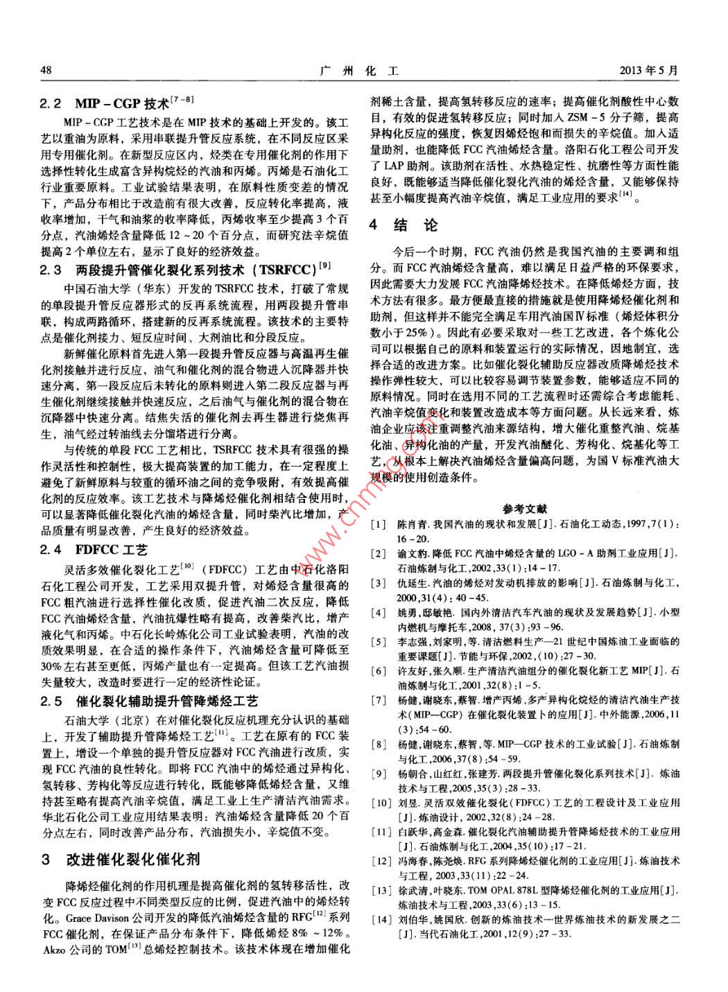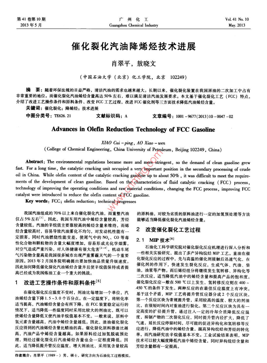 第41卷第10期廣州化工Vol. 41 No. 102013年5月.Guangzhou Chemical IndustryMay. 2013催化裂化汽油降烯烴技術(shù)進(jìn)展肖翠平,敖曉文(中國(guó)石油大學(xué)(北京)化工學(xué)院,北京102249)摘要: 隨著環(huán)保法規(guī)的日益嚴(yán)格,清潔汽油的需求也越來(lái)越大。長(zhǎng)期以來(lái),催化裂化裝置在我國(guó)原油的二次加工中占有非常重要的地位。而催化裂化汽油烯烴含量高達(dá)50%左右,難以滿足清潔汽油發(fā)展要求。本文基于催化裂化工藝(FCC)特點(diǎn),介紹了改進(jìn)工藝操作條件和原料條件、改變FCC工藝過(guò)程,改進(jìn)FCC催化劑等三方面技術(shù)降低汽油烯烴含量。關(guān)鍵詞:催化裂化;降烯烴;技術(shù)進(jìn)展中圖分類號(hào): TE626. 21文獻(xiàn)標(biāo)識(shí)碼: A文章編號(hào): 1001 -9677(2013)10 -0047 -02Advances in Olefin Reduction Technology of FCC GasolineXIAO Cui -ping, AO Xiao - wen(College of Chemical Engineering, China Universty of Petroleum, Beijing 102249, China)Abstract: The environmental regulations became more and more stringent, so the demand of clean gasoline grewfast. For a long time, the catalytic cracking unit occupied a very important position in the secondary processing of crudeoil in China While olefin content of the catalytic cracking gasoline up to about 50% , it was diffcult to meet the require-ments of the development of clean gasoline. Based on the characteristics of fluid catalytic cracking ( FCC) process,technology of improving the operating conditions and raw material conditions , changing the FCC process , improving FCCcatalyst were introduced to reduce the olefin content of FCC gasoline.Key words: FCC; olefin reduction; technical progresses我國(guó)汽油組成的70%以上來(lái)自催化裂化汽油,而重整汽油的原料油, 對(duì)較為劣質(zhì)的原料油進(jìn)行一定的加氫預(yù)處理等方法僅占5%左右",因此,我國(guó)車用汽油中烯烴含量較高,芳烴能夠適 當(dāng)降低催化裂化汽油烯烴含量。含量較低。汽油的辛烷值主要靠較高的烯烴含量來(lái)維持。而烯烴含量較高時(shí),容易導(dǎo)致汽油霧化不均勻,對(duì)發(fā)動(dòng)機(jī)性能有一2改變催化裂化工藝過(guò)程定損害,同時(shí)汽油燃燒性能變差,使尾氣中的NO,、CO等毒2.1 MIP技術(shù)[6]性化合物和顆粒物的含量大幅度增加,容易形成光化學(xué)煙霧,石油化工科學(xué)研究院對(duì)催化裂化反應(yīng)機(jī)理進(jìn)行深入分析和對(duì)空氣造成嚴(yán)重污染,對(duì)人體健康有很大危害[2-41。機(jī)動(dòng)車尾一些相關(guān)實(shí)驗(yàn)研究,提出了多產(chǎn)異構(gòu)烷烴MIP工藝。重油在催氣污染物含量高是我國(guó)很多城市出現(xiàn)嚴(yán)重霧霾天氣的- - 個(gè)重要化裂化反應(yīng)的過(guò)程中,先與高溫的催化劑接觸后迅速氣化,在原因。2013年2月國(guó)務(wù)院明確提出要加快油品質(zhì)量升級(jí)速度。催化劑的作用下,快速發(fā)生裂化反應(yīng),生成氣體、汽油、柴因此如何降低催化裂化汽油烯烴含量并且使辛烷值保持或者提油,油漿等產(chǎn)物。而后烯烴組分將繼續(xù)發(fā)生氫轉(zhuǎn)移、異構(gòu)化等高已經(jīng)成為我國(guó)煉油工業(yè)-一個(gè)重大的挑戰(zhàn)。二次反應(yīng),適當(dāng)降低汽油中的烯烴含量和提高產(chǎn)品的飽和度。1改進(jìn)工藝操作條 件和原料條件[5]催化裂化反應(yīng)-般在500 C以上發(fā)生,氫轉(zhuǎn)移反應(yīng)則在400 ~在催化裂化反應(yīng)溫度不變時(shí),劑油比每增加-一個(gè)單位,汽.450 C的條件下發(fā)生。兩種反應(yīng)的在最佳反應(yīng)溫度上有沖突。油烯烴含量下降1.5~3.0個(gè)百分點(diǎn)。在-定溫度下,將轉(zhuǎn)化率基于這個(gè)矛盾,MIP工藝將提升管反應(yīng)器分成2個(gè)反應(yīng)區(qū)塊。適當(dāng)提高,汽油烯烴含量會(huì)有所下降。在FCC裝置穩(wěn)定運(yùn)行的第一個(gè)反應(yīng)區(qū)塊為常規(guī)提升管,采用較高的溫度、較大的劑油.情況下,適當(dāng)降低--些溫度同時(shí)采用比較大的劑油比,既可以比,在很短時(shí)間內(nèi)對(duì)重油進(jìn)行裂化。第二個(gè)反應(yīng)區(qū)塊為具有一-使烯烴含量降低又使汽油辛烷值基本不變。-般來(lái)說(shuō),原料中定高度的擴(kuò)徑提升管,通過(guò)注人一定的冷卻介質(zhì)降低反應(yīng)溫氫元素含量越高,汽油中烯烴含量越低。因此,渣油催化裂化度,抑制產(chǎn)物的二次裂化反應(yīng),同時(shí)提升管內(nèi)徑擴(kuò)大,降低了反應(yīng)得到的汽油烯烴含量比蠟油的高。催化裂化原料摻渣比越氣速,延長(zhǎng)反應(yīng)停留時(shí)間,盡可能的促進(jìn)異構(gòu)化和氫轉(zhuǎn)移等反應(yīng)進(jìn)行,降低汽油中的烯烴含量,提高異構(gòu)烷烴和芳烴的轉(zhuǎn)化高,汽油產(chǎn)品中烯烴含量越高。如果原料經(jīng)過(guò)加氫脫硫預(yù)處率,而汽油研究法辛烷值基本不變。工業(yè)試驗(yàn)結(jié)果表明,MIP理,則經(jīng)過(guò)催化裂化后汽油烯烴含量也會(huì)一定程度降低。 因技術(shù)可以較大幅度降低汽油中烯烴 含量,同時(shí)異構(gòu)烷烴含量和此,適當(dāng)降低提升管反應(yīng)溫度,增大劑油比,采用氫含量較高芳烴含量都有一定提高。作者簡(jiǎn)介:肖翠平(1989-) 男,碩士,研究方向?yàn)槭突疘過(guò)程模擬。48廣州化工2013年5月2.2 MIP - CGP技術(shù)[7-8]劑稀土含量,提高氫轉(zhuǎn)移反應(yīng)的速率;提高催化