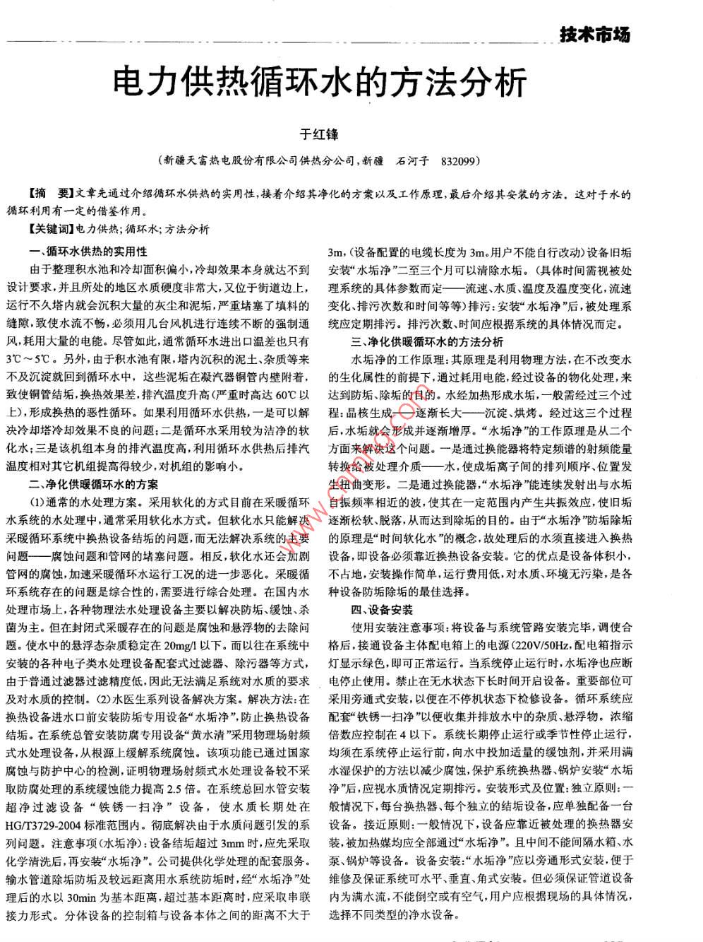 技術(shù)市場電力供熱循環(huán)水的方法分析于紅鋒(新疆天宙熱電股份有限公司供熱分公司,新疆石河子832099【摘要】文章先通過介紹循環(huán)水供熱的實(shí)用性,接著介紹其凈仳的方案以及工作原理,最后介紹其安裝的方法.這對于水的循環(huán)利用有一定的借鑒作用【關(guān)鍵詞】電力供熱;循環(huán)水;方法分析一、循環(huán)水供熱的實(shí)用性3m,(設(shè)備配置的電纜長度為3m用戶不能自行改動(dòng))設(shè)備舊垢由于整理積水池和冷卻面積偏小,冷卻效果本身就達(dá)不到安裝“水垢凈”二至三個(gè)月可以清除水垢。(具體時(shí)間需視被處設(shè)計(jì)要求,并且所處的地區(qū)水質(zhì)硬度非常大,又位于街道邊上,理系統(tǒng)的具體參數(shù)而定—一流速、水質(zhì)、溫度及溫度變化,流速運(yùn)行不久塔內(nèi)就會(huì)沉積大量的灰塵和泥垢嚴(yán)重堵塞了填料的變化、排污次數(shù)和時(shí)間等等)排污:安裝“水垢凈”后,被處理系縫隙,致使水流不暢,必須用幾臺(tái)風(fēng)機(jī)進(jìn)行連續(xù)不斷的強(qiáng)制通統(tǒng)應(yīng)定期排污。排污次數(shù)、時(shí)間應(yīng)根據(jù)系統(tǒng)的具體情況而定。風(fēng),耗用大量的電能。盡管如此,通常循環(huán)水進(jìn)出口溫差也只有凈化供暖循環(huán)水的方法分析3℃~5℃。另外,由于積水池有限,塔內(nèi)沉積的泥土、雜質(zhì)等來水垢凈的工作原理:其原理是利用物理方法,在不改變水不及沉淀就回到循環(huán)水中,這些泥垢在凝汽器銅管內(nèi)壁附著,的生化屬性的前提下,通過耗用電能經(jīng)過設(shè)備的物化處理,來致使銅管結(jié)垢,換熱效果差排汽溫度升高(嚴(yán)重時(shí)高達(dá)60℃以達(dá)到防垢、除垢的目的。水經(jīng)加熱形成水垢,一般需經(jīng)過三個(gè)過上),形成換熱的惡性循環(huán)。如果利用循環(huán)水供熱,一是可以解程:品核生成——逐漸長大—沉淀、烘烤。經(jīng)過這三個(gè)過程決冷卻塔冷卻效果不良的問題:二是循環(huán)水采用較為潔凈的軟后,水垢就會(huì)形成并逐漸增厚。“水垢凈”的工作原理是從二個(gè)化水;三是該機(jī)組本身的排汽溫度高,利用循環(huán)水供熱后排汽方面來解決這個(gè)問題。一是通過換能器將特定頻譜的射頻能量溫度相對其它機(jī)組提高得較少,對機(jī)組的影響小。轉(zhuǎn)換給被處理介質(zhì)——水,使成垢離子間的排列順序、位置發(fā)二、凈化供暖循環(huán)水的方案生扭曲變形。二是通過換能器,“水垢凈”能連續(xù)發(fā)射出與水垢(1)通常的水處理方案。采用軟化的方式目前在采暖循環(huán)自振頻率相近的波,使其在一定范圍內(nèi)產(chǎn)生共振效應(yīng),使舊垢水系統(tǒng)的水處理中,通常采用軟化水方式。但軟化水只能解決逐漸松軟、脫落,從而達(dá)到除垢的目的。由于“水垢凈防垢除垢采暖循環(huán)系統(tǒng)中換熱設(shè)備結(jié)垢的問題,而無法解決系統(tǒng)的主要的原理是“時(shí)間軟化水”的概念,故處理后的水須直接進(jìn)入換熱問題—腐蝕問題和管網(wǎng)的堵塞問題。相反,軟化水還會(huì)加劇設(shè)備,即設(shè)備必須靠近換熱設(shè)備安裝。它的優(yōu)點(diǎn)是設(shè)備體積小,管網(wǎng)的腐蝕,加速采暖循環(huán)水運(yùn)行工況的進(jìn)一步惡化。采暖循不占地,安裝操作簡單,運(yùn)行費(fèi)用低,對水質(zhì)、環(huán)境無污染,是各環(huán)系統(tǒng)存在的問題是綜合性的,需要進(jìn)行綜合處理。在國內(nèi)水種設(shè)備防垢除垢的最佳選擇處理市場上,各種物理法水處理設(shè)備主要以解決防垢、緩蝕、殺四、設(shè)備安裝菌為主。但在封閉式采暖存在的問題是腐蝕和懸浮物的去除問使用安裝注意事項(xiàng):將設(shè)備與系統(tǒng)管路安裝完畢,調(diào)使合題。使水中的懸浮態(tài)雜質(zhì)穩(wěn)定在20mg1以下。而以往在系統(tǒng)中格后,接通設(shè)備主體配電箱上的電源(220V50Hz,配電箱指示安裝的各種電子類水處理設(shè)備配套式過濾器、除污器等方式,燈顯示綠色,即可正常運(yùn)行。當(dāng)系統(tǒng)停止運(yùn)行時(shí),水垢凈也應(yīng)斷由于普通過濾器過濾精度低,因此無法滿足系統(tǒng)對水質(zhì)的要求電停止使用。禁止在無水狀態(tài)下長時(shí)間開啟設(shè)備。重要部位可及對水質(zhì)的控制。(2)水醫(yī)生系列設(shè)備解決方案。解決方法:在采用旁通式安裝,以便在不停機(jī)狀態(tài)下檢修設(shè)備。循環(huán)系統(tǒng)應(yīng)換熱設(shè)備進(jìn)水口前安裝防垢專用設(shè)備“水垢凈”防止換熱設(shè)備配套“鐵銹一掃凈”以便收集并排放水中的雜質(zhì)、懸浮物。濃縮結(jié)垢。在系統(tǒng)總管安裝防腐專用設(shè)備“黃水清采用物理場射頻倍數(shù)應(yīng)控制在4以下。系統(tǒng)長期停止運(yùn)行或季節(jié)性停止運(yùn)行式水處理設(shè)備,從根源上緩解系統(tǒng)腐蝕。該項(xiàng)功能已通過國家均須在系統(tǒng)停止運(yùn)行前,向水中投加適量的緩蝕劑,并采用滿腐蝕與防護(hù)中心的檢測,證明物理場射頻式水處理設(shè)備較不采水濕保護(hù)的方法以減少腐蝕保護(hù)系統(tǒng)換熱器、鍋爐安裝“水垢取防腐處理的系統(tǒng)緩蝕能力提高25倍。在系統(tǒng)總回水管安裝凈”后,應(yīng)視水質(zh