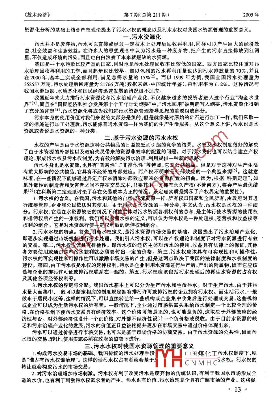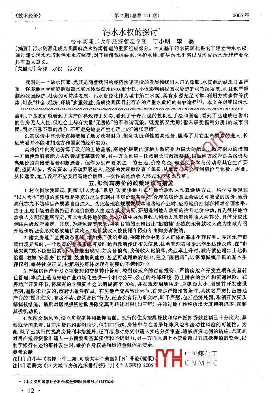 《技術經(jīng)濟》第7期(總第211期)2005年.污水水權的探討”哈爾濱理工大學經(jīng)濟管理學院丁小明李磊[摘要]污水資源化成為我國解決水資源管理的重要組成部分。本文基于污水資源化提出了建立污水水權,通過建立污水水權和污水水權制度,對于緩解我國缺水、保護水質(zhì)、解決污水出路以及形成污水治理產(chǎn)業(yè)化具有重大意義。[關鍵詞]資源水權污水權我國是-一個缺水國家,尤其是隨著我國的經(jīng)濟快速建設的發(fā)展和我國人口的膨脹,水資源的缺乏日益嚴重。許多地區(qū)受到資源型缺水和水質(zhì)型缺水的雙重干擾,不僅影響到我國水資源的可持續(xù)發(fā)展,而且也嚴重制約我國經(jīng)濟、社會的可持續(xù)發(fā)展。污水資源化作為城市第二水源,具有水源充足可靠、利用方式多樣等優(yōu)勢,可獲“社會、經(jīng)濟、環(huán)境”多重效益,是解決我國目前存在的嚴重水危機的有效途徑"。本文在對我國污水盈利,于是我們就看到了房產(chǎn)的異地轉(zhuǎn)手買賣,看到了千奇百怪的投機性手法和圈套,看到了已建成已售出.的住房無人入住,但社會上卻有大量“無房族”的不和諧現(xiàn)象。既無錢又無房(指未享受福利分房)的城市居民,面對只漲不跌的房價,不可避免地會產(chǎn)生心理上的‘通脹恐慌”。6.高房價中高地價直接增加了地方政府財力,但急功近利性的高地價,阻礙了其它生產(chǎn)要素的進人,長遠來看并不能增加地方和國家的經(jīng)濟實力。高房價中的高地價源于政府的土地壟斷,高地價短期內(nèi)使地方政府財力極大的增加。政府財力的增加一方面使政府有能力去改善城市基礎設施,另一方面也使--任政府長官政績赫赫,因而地方政府是高房價與高地價的直接受益者和制造者。但作為生產(chǎn)要素之一-的土地,價格高企,卻會使資本與勞動等其它生產(chǎn)要素,望而卻步。沒有資本與勞動要素進入,經(jīng)濟的發(fā)展就沒有了源泉,從而反過來會抑制房價與地價。因此,從長遠看,地方政府不應實行高地價政策,一次性的地價收人形式也應考慮改革。五、抑制高房價的政策建議與措施1樹立科學發(fā)展觀,貫徹“以人為本”思想,改變供地方式與地價款收人預算繳納方式??茖W發(fā)展觀和“以人為本”思想的實質(zhì)就是要充分地認識到并非房價越高越好,合理的房價是社會居民可接受的房價,地價高低亦應不妨礙生產(chǎn)要素自由進人。為此各地在規(guī)劃發(fā)展本地房地產(chǎn)業(yè)時,應將地價控制在相對合理水平。由于土地市場的壟斷特征和地價款收人由地方政府支配,要想遏制地方政府的拾升地價沖動,首先須將地價款收入支配權重新界定,可以考慮將地價款收入分成中央預算收人和地方政府預算收人兩部分,具體分成比例由兩級政府商定。其次,為避免透支未來;可將目前的土地出讓“招拍掛’'形 成的地價款收人改為由政府召開地價聽證會形式形成地價款收入,地價款收入按使用年限分年由購房者繳納。2.建立房地產(chǎn)監(jiān)視動態(tài)系統(tǒng),增加房產(chǎn)供給渠道,保障社會中低收人群體的基本生存權利。在房地產(chǎn)市場出現(xiàn)異常時,一個動態(tài)的監(jiān)視系統(tǒng)可及時地向政府傳遞相關信息,社會管理者可據(jù)此作出迅速反應,在“市場失靈”或不穩(wěn)定因素、不滿情緒出現(xiàn)時,如房價偏高,房價收人比偏高,失業(yè)率上升時,政府就應增加土地供給量,增加“安居房"供給量,鼓勵集資建房,甚至可動用政府財力,建立“廉租房”,以保障城鎮(zhèn)居民的基本生存權利,維持社會正義,化解弱勢群體對現(xiàn)有制度的不滿和對立。3.嚴格房地產(chǎn)開發(fā)立項管理和交易轉(zhuǎn)讓管理.控制房地產(chǎn)的過度投資。嚴格房地產(chǎn)開發(fā)立項和交易轉(zhuǎn)讓管理,本質(zhì)上是為房地產(chǎn)業(yè)市場化提供一個相對公平、公正的外部環(huán)境,防止?jié)撛诘纳a(chǎn)和流通風險。在房地產(chǎn)開發(fā)環(huán)節(jié),將現(xiàn)有的立項資本金比例提高至70%,并據(jù)規(guī)劃用地用途、總建面大小,限定其開發(fā)建設周期,逾期未開發(fā)的,政府無條件收回。在房地產(chǎn)交易轉(zhuǎn)讓環(huán)節(jié),首先是嚴格預售條件,其次要嚴厲打擊房地產(chǎn)商的“圍積住房、有房不賣、自買自倒”行為,經(jīng)查實有行為事實時,即子嚴懲,包括經(jīng)濟處罰,取消開發(fā)資質(zhì)等制裁措施。最后對居民投資性購房限定其再轉(zhuǎn)讓時限(如三年) ,并通過地方性稅收增大其持有成本,抑制其投機動機。4.預防金融風險,設立房貸條件和抵押限制?,F(xiàn)行的住房按揭貸款和房產(chǎn)抵押貸款總額已十分龐大,雖然就全國來看,目前房貸違約案例尚少,但如前所述,房貸中存在著呆壞帳風險和流動性風險的可能性。為此,除了已實行的提高房貸利率措施外,還可考慮對房貸申請人實施分類審查,縮減信貸比例的措施,尤其是對房產(chǎn)抵押貸款申請人-方面要調(diào)查其資信和還貸能力,另一方面原則上不貸放超過五成抵押值的資金,以利于銀行在違約事件發(fā)生時,維護自身權益和維持金融體系安全。參考文獻中國煤化工注[1]許小年《賣掉- -個上海,可換大半個美國》[N]香港《鏡報》注[2]屈騰龍《37大城市房價泡沫排行榜》[J]《個人理財》2005MYHCNMHG●(本