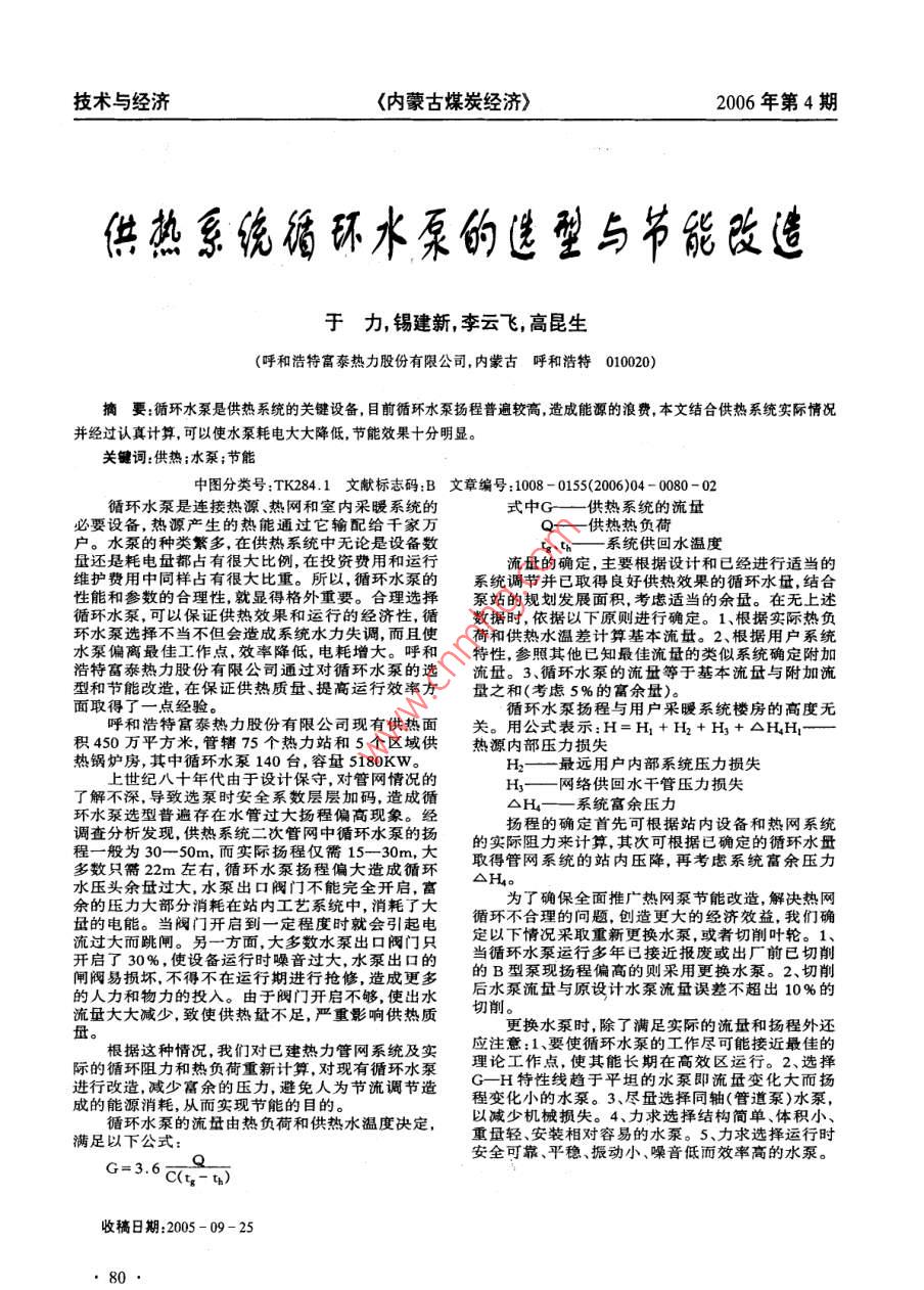 技術(shù)與經(jīng)濟(jì)<內(nèi)蒙古煤炭經(jīng)濟(jì)>2006年第4期供熱系統(tǒng)循環(huán)水泵的選型與節(jié)能改造于力, 錫建新,李云飛,高昆生(呼和浩特富泰熱力股份有限公司,內(nèi)蒙古呼和浩特 010020)摘要:循環(huán)水泵是供熱 系統(tǒng)的關(guān)鍵設(shè)備,目前循環(huán)水泵揚(yáng)程普遍較高,造成能源的浪費(fèi),本文結(jié)合供熱系統(tǒng)實(shí)際情況并經(jīng)過認(rèn)真計(jì)算,可以使水泵耗電大大降低,節(jié)能效果十分明顯。關(guān)鍵詞:供熱;水泵;節(jié)能中圖分類號(hào):TK284.1文獻(xiàn)標(biāo)志碼:B 文章編號(hào):1008 - 0155(2006)04 - 0080-02循環(huán)水泵是連接熱源、熱網(wǎng)和室內(nèi)采暖系統(tǒng)的式中G--供熱 系統(tǒng)的流量必要設(shè)備,熱源產(chǎn)生的熱能通過它輸配給千家萬Q-供熱熱 負(fù)荷戶。水泵的種類繁多,在供熱系統(tǒng)中無論是設(shè)備數(shù)qit-系 統(tǒng)供回水溫度量還是耗電量都占有很大比例,在投資費(fèi)用和運(yùn)行流量的確定,主要根據(jù)設(shè)計(jì)和已經(jīng)進(jìn)行適當(dāng)?shù)木S護(hù)費(fèi)用中同樣占有很大比重。所以,循環(huán)水泵的系統(tǒng)調(diào)節(jié)并已取得良好供熱效果的循環(huán)水量,結(jié)合性能和參數(shù)的合理性,就顯得格外重要。合理選擇泵站的規(guī)劃發(fā)展面積,考慮適當(dāng)?shù)挠嗔?。在無上述循環(huán)水泵,可以保證供熱效果和運(yùn)行的經(jīng)濟(jì)性,循數(shù)據(jù)時(shí),依據(jù)以下原則進(jìn)行確定。1、 根據(jù)實(shí)際熱負(fù)環(huán)水泵選擇不當(dāng)不但會(huì)造成系統(tǒng)水力失調(diào),而且使荷和供熱水溫差計(jì)算基本流量。2、根據(jù)用戶系統(tǒng)水泵偏離最佳工作點(diǎn),效率降低,電耗增大。呼和特性,參照其他已知最佳流量的類似系統(tǒng)確定附加浩特富泰熱力股份有限公司通過對(duì)循環(huán)水泵的選流量。3、循環(huán)水泵的流量等于基本流武與附加流型和節(jié)能改造,在保證供熱質(zhì)量、提高運(yùn)行效率方量之和(考慮5%的富余量)。面取得了一點(diǎn)經(jīng)驗(yàn)。循環(huán)水泵揚(yáng)程與用戶采暖系統(tǒng)樓房的高度無呼和浩特富泰熱力股份有限公司現(xiàn)有供熱面關(guān)。用公式表示:H=H+ H2+ H, +△HH-積450萬平方米,管轄75個(gè)熱力站和5個(gè)區(qū)域供熱源內(nèi)部壓力損失熱鍋爐房,其中循環(huán)水泵140臺(tái),容量5180KW。最遠(yuǎn)用戶內(nèi)部系統(tǒng)壓力損失上世紀(jì)八十年代由于設(shè)計(jì)保守,對(duì)管網(wǎng)情況的Hs一網(wǎng)絡(luò)供回水干管壓力損失了解不深,導(dǎo)致選泵時(shí)安全系數(shù)層層加碼,造成循△H一系統(tǒng)富 余壓力環(huán)水泵選型普遍存在水管過大揚(yáng)程偏高現(xiàn)象。經(jīng)揚(yáng)程的確定首先可根據(jù)站內(nèi)設(shè)備和熱網(wǎng)系統(tǒng)調(diào)查分析發(fā)現(xiàn),供熱系統(tǒng)二次管網(wǎng)中循環(huán)水泵的揚(yáng)的實(shí)際阻力來計(jì)算,其次可根據(jù)已確定的循環(huán)水量程一般為30- -50m,而實(shí)際揚(yáng)程僅需15- -30m, 大取得管網(wǎng)系統(tǒng)的站內(nèi)壓降,再考慮系統(tǒng)富余壓力多數(shù)只需22m左右,循環(huán)水泵揚(yáng)程偏大造成循環(huán)△H。水壓頭余量過大,水泵出口閥門不能完全開啟,富為了確保全面推廣熱網(wǎng)泵節(jié)能改造,解決熱網(wǎng)余的壓力大部分消耗在站內(nèi)工藝系統(tǒng)中,消耗了大循環(huán)不合理的問題,創(chuàng)造更大的經(jīng)濟(jì)效益,我們確量的電能。當(dāng)閥門開啟到一定程度時(shí)就會(huì)引起電定以下情況采取重新更換水泵,或者切削葉輪。1、流過大而跳閘。另-方面,大多數(shù)水泵出口閥門只當(dāng)循環(huán)水泵運(yùn)行多年已接近報(bào)廢或出廠前已切削開啟了30%,使設(shè)備運(yùn)行時(shí)噪音過大,水泵出口的的B型泵現(xiàn)揚(yáng)程偏高的則采用更換水泵。2、切削閘閥易損壞,不得不在運(yùn)行期進(jìn)行搶修,造成更多后水泵流量與原設(shè)計(jì)水泵流盤誤差不超出10%的的人力和物力的投入。由于閥門開啟不夠,使出水流量大大減少,致使供熱量不足,嚴(yán)重影響供熱質(zhì)更換水泵時(shí),除了滿足實(shí)際的流量和揚(yáng)程外還量。根據(jù)這種情況,我們對(duì)已建熱力管網(wǎng)系統(tǒng)及實(shí)應(yīng)注意:1、要使循環(huán)水泵的工作盡可能接近最佳的際的循環(huán)阻力和熱負(fù)荷重新計(jì)算,對(duì)現(xiàn)有循環(huán)水泵理論工作點(diǎn),使其能長(zhǎng)期在高效區(qū)運(yùn)行。2、選擇進(jìn)行改造,減少富余的壓力,避免人為節(jié)流調(diào)節(jié)造G--H特性線趨于平坦的水泵即流盤變化大而揚(yáng)程變化小的水泵。3、盡量選擇同軸(管道泵)水泵,成的能源消耗,從而實(shí)現(xiàn)節(jié)能的目的。循環(huán)水泵的流量由熱負(fù)荷和供熱水溫度決定,以減少機(jī)械損失。4、力求選擇結(jié)構(gòu)簡(jiǎn)單、體積小、滿足以下公式:重母輕、安裝相對(duì)容易的水泵。5、力求選擇運(yùn)行時(shí)安全可靠、平穩(wěn)、振動(dòng)小、噪音低而效率高的水泵。_QG=3.6 (-每收稿日期:2005 -09- 2580技術(shù)與經(jīng)濟(jì)<內(nèi)蒙古煤炭經(jīng)濟(jì)>2006年第4期TZ型振動(dòng)卸料離心脫水機(jī