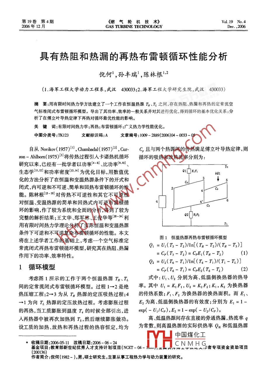 具有熱阻和熱漏的再熱布雷頓循環(huán)性能分析