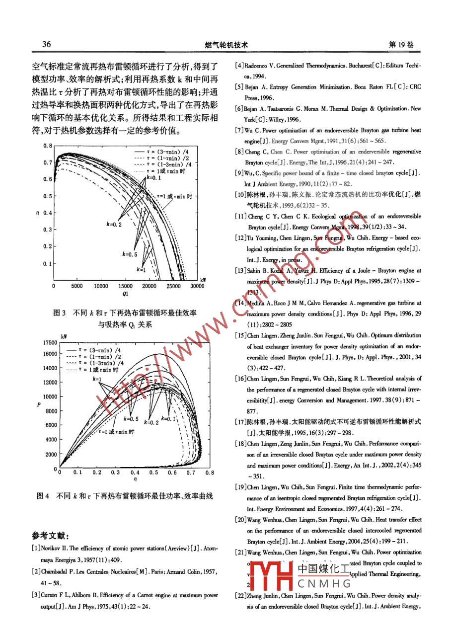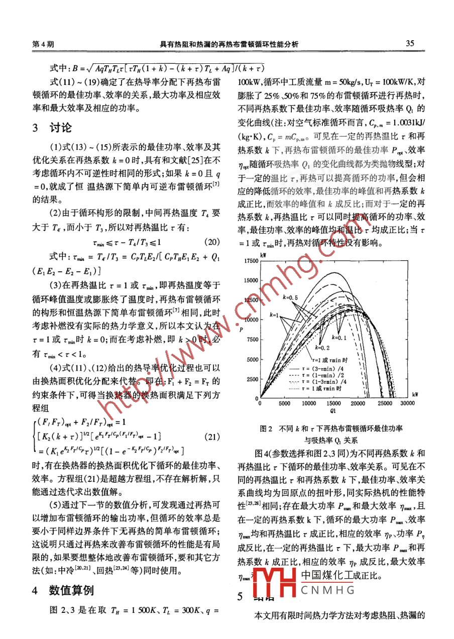第19卷第4期《燃氣輪機技術》2006年12月GAS TURBINE TECHNOLOGY具有熱阻和熱漏的再熱布雷頓循環(huán)性能分析倪何1,孫豐瑞1,陳林根12(1.海軍工程大學動力工程系,武漢430033;2.海軍工程大學研究生院,武漢430033摘要:用有限時間熱力學方法建立了一個工作在恒溫熱源Tn、T1之間,存在熱阻、熱漏和再熱的定常流空氣標準閉式布雷頓循環(huán)模型。導出了其功率效率的一般關系并對其進行優(yōu)化,得到循環(huán)的基本優(yōu)化關系;分析了在傅立葉導熱定律下再熱對循環(huán)最優(yōu)性能的影響。關鍵詞:有限時間熱力學;再熱;布雷頓循環(huán);廣義熱力學性能優(yōu)化。中圖分類號:K123文獻標識碼:A文章編號:1009-289(206)04-003-0自從 Novikov(1957)), Chambadal(1957)2,CurC且與兩個熱源間的傳熱滿足傅立葉導熱定律,則zon- Ahlbom(1975)將傳熱過程引入卡諾熱機循環(huán)循環(huán)的吸熱和放熱流率分別為:研究以來,已經有一批學者以功率)、比功率1生態(tài)學2和功率密度11為優(yōu)化目標,用數(shù)值優(yōu)Q1口KF1化的方法分析了在恒溫和變溫熱源條件下的開式和閉式,內可逆和不可逆、簡單和回熱布雷頓循環(huán)的性能。陳林根{-9對傳熱不可逆性和其它不可逆性對恒溫、變溫熱源的簡單和回熱式內可逆布雷頓循環(huán)的影響,作了較為系統(tǒng)和全面的分析,得到了較為完整的解析結果;王文華、鄭軍林、王俊華等x-利2用有限時間熱力學理論分析了實際恒溫和變溫熱源條件下可逆和不可逆復雜布雷頓循環(huán)的性能。本文將在上述學者工作的基礎上,考慮一個空氣標準定圖1恒溫熱源再熱布雷頓循環(huán)模型常流閉式再熱布雷頓循環(huán)模型,研究其在熱阻、熱漏Q1=U1(T3-T2)ln[(Tn-T2)(Tn-7)]作用下的功率效率特性。=CP(T3-T2)=CPE,(TH-T2)(1)Q2=U2(T6-T)ln[(76-T1)(T1-T)]1循環(huán)模型=CP(T6-TI)=CPE2 (T6-TL)(2)考慮圖1所示的工作于兩個恒溫熱源Tn、T式中:U1、U2分別為高、低溫側換熱器的熱導間的定常流閉式布雷頓循環(huán)模型。過程1→2是絕率。其中U1=K1F1,U2=K2F2;K1,K2為換熱器熱壓縮工程;2→3為從Tn熱源的定壓吸熱過程;4的傳熱系數(shù);F1、F2為換熱器的換熱面積。而E11為向T熱源的定壓放熱過程??紤]膨脹過程E2為高低溫側換熱器的有效度;分別為E1的再熱當工質膨脹到溫度T的時候全部引出,進p(-U1/C),E2=1-ex(-U2/C)。入再熱器中被再次加熱到T5,然后繼續(xù)膨脹做功高低溫熱源間存在直接的旁通熱漏熱流率q設工質的加熱、放熱和再熱過程的熱容恒定,均為為常數(shù)則高溫熱源的實際供熱率Q和低溫熱源中國煤化工*收稿日期:200605-11改稿日期:2006-06-24CNMHG基金項目:教育部新世紀優(yōu)秀人才支持計劃項目(NCEr-04以人非者專項資金資助項目00136作者簡介倪何(1982-),男,碩士研究生,主要從事工程熱力學與動力裝置的研究。34燃氣輪機技術第19卷的實際吸熱率Q1分別為二定律有QH=Q1+g: QL=Q2+CpInT,/T2+CpInT /T= CPInT6/T(6)循環(huán)有再熱段,設單位時間內工質在再熱器中將式(6)變形為的加熱量是循環(huán)吸熱率Q的k倍,而中間再熱點的T2/Ts=T/76(7)溫度T4=T3,則對于再熱過程有2基本優(yōu)化關系AQ1=C(7s-T4)=Cp(7s-r3)(4)式中:k為再熱系數(shù);r為中間再熱溫比。綜合公式(1)、(2)、(3)、(4)、(7)可得由熱力學第一定律,可得循環(huán)的功率P和效率Q2TL(k+r)η分別為:Q1 ITH+Q[K+r)(1-E2 )-tE1J/CP=Qn+k1-Q1=(1+k)Q1-Q27= P/( QH+ hQ1)(5)將式(8)代入式(5)中得到功率和效率與循環(huán)吸由于不考慮循環(huán)的內不可逆性,應用熱力學第熱率Q1的一般關系式:(1+k)r(TCF-Q1E1)+(k+r)[Q1(1+k)(1-E)-TCp(9)TTHCP+Q,[(k+r)(E?)-tE](1+k)r(TCP-Q1E1)+(k+r)[Q1(1+k)(1-E2)-TcP](1+k+q/Q1)τTCp+Q1[(k+r)(1-E21)-E1]}可見,對于給定的Q1和邊界條件,再熱布雷頓循環(huán)的功率P和效率n均為換熱器的有效度E1、E2的函數(shù),E=1-ep(-KF/C)。設熱導率之和為常數(shù)即U,+U2=K,F1+k2 F2=Ur在式(11)的約束條件下,可求出當(U1U)=12+Clnr+e(-U1Cp)k+)(ep(-U2Cr+√k+)Ur;(12)(U21U)w=1/2+ Cp In[exp(-Un/2C從r+√k+τ)/(r+p(-Un/2C)k+x)Ur時,有一定吸熱率Q1,再熱系數(shù)k和中間再熱溫比r下的最佳功率P和效率n:P=Q1[(1+k)(H1-Q2A)-(k+r)T](rTn-Q1A)(13)7=[(1+k)(T-QA)-(k+r)Tl(T-Q2A)(1+k+q/Q2)](14)將最佳功率P的公式(13)和效率η的公式(14)聯(lián)立,消去變量Q,可得再熱布雷頓循環(huán)的最佳功率、效率關系:PTn(1+k)=(Pa-7q[n(1+k)-(k+t)7-A(Pw-27q)](15)式中:A=1[k+2x+2e(-Uh2Cp)√k(k+x)1-exp(-UrCp)]-(k+r)HCp由(13)和(14)式可見:當Q=0或者Q1=[rTn-(k+r)T/(1+k)]MA時P甲=7=0。這表明再熱布雷頓循環(huán)的最佳功率P效率n對于高溫熱源的放熱率Q存在極值。可導出最大功率P=m及相應的效率m,最大效率m=及相應功率P√(k+r)T1-√rTn(1+k)]2/A(16)p=[√(k+r)-√r1n(1+k)]Hrrn(1+k)-√rTn1(1+k)(r+k)]+Al(17)q≠(k+τ)TL時(1+k)2-T1(k+r)[(k+r)T1-A]rTnT2(1+k)"2-B(1+k)+Aq[(k+)T -Aq]/[B(k+r)-AgThr(1+k)(18)囤q=(k+r)T時:[(1+k)T-(k+r)中國煤化工P={4(k+r)T時:(k+xgTHr(1+ k)CNMHG∴N+k)"-B(19)Aq=(k+)T時:[(1+k)rT-(k+r)T]212A(1+k)H+(k+)Tl第4期具有熱阻和熱漏的再熱布雷頓循環(huán)性能分析式中:B=√ AtHIR[rTn(1+k)-(k+r)+A](k+r式(11)~(19)確定了在熱導率分配下再熱布雷10kW循環(huán)中工質流量m=50kgs,Ur=1kWK,對頓循環(huán)的最佳功率效率的關系,最大功率及相應效膨脹了25%、50%和75%的布雷頓循環(huán)進行再熱時,率和最大效率及相應的功率。不同再熱系數(shù)下最佳功率、效率隨循環(huán)吸熱率Q的3討論變化曲線(注:對空氣標準循環(huán)而言,C,m=1.001k(kgK),Cn=mCm??梢娫谝欢ǖ脑贌釡乇萺和再(1)式(13)-(15)