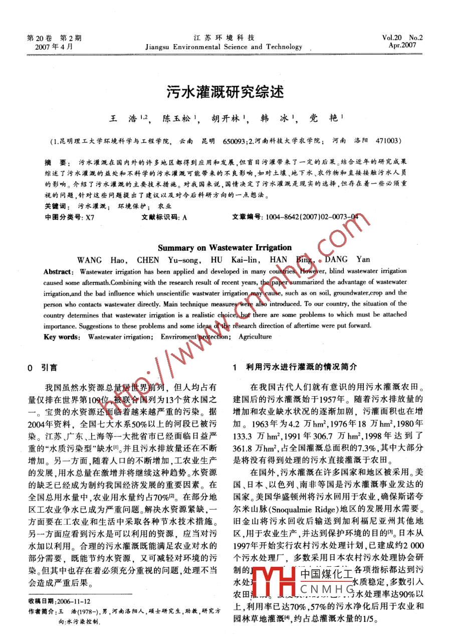 第20卷第2期江蘇環(huán)境科技Vol.20_ No.22007年4月Jiangsu Environmental Science and TechnologyApr.2007污水灌溉研究綜述王浩1.2, 陳玉松',胡開(kāi)林',韓冰',黨艷|(1.昆明理工大學(xué)環(huán)境科學(xué)與工程學(xué)院,云南昆明650093;2.河南科技大學(xué)農(nóng)學(xué)院; 河南洛陽(yáng)471003)摘要:污水灌溉在國(guó)內(nèi)外的許多地區(qū)都得到應(yīng)用和發(fā)展,但盲目污灌帶來(lái)了一定的后果。結(jié)合近年的研究成果綜述了污水灌溉的益處和不科學(xué)的污水灌溉可能帶來(lái)的不良影響,如對(duì)土壤、地下水、農(nóng)作物和直接接觸污水人員的影響。介紹了污水灌溉的主要技術(shù)措施。對(duì)我國(guó)來(lái)說(shuō),國(guó)情決定了污水灌溉是現(xiàn)實(shí)的選擇,但存在著一些必須重視的問(wèn)題,針對(duì)這些問(wèn)題提出了建議以及對(duì)今后科研方向的一點(diǎn)想法。關(guān)鍵詞:污水灌溉; 環(huán)境保護(hù); 農(nóng)業(yè)中圈分類號(hào): X7文獻(xiàn)標(biāo)識(shí)碼: A文章編號(hào): 1004- 8642(2007)02- 0070-04Summary on Wastewater IrrigationWANG Hao, CHEN Yu- -song,HU Kai-lin, HAN Bing, DANG YanAbstract: Wastewater irigation has been applied and developed in many countries. However, blind wastewater imigationcaused some aftermath.Combining with the research result of recent years, the paper summarized the advantage of wastewaterimigation,and the bad infuence which unscientific wastwater irigation may cause, such as on soil, groundwater,crop and theperson who contacts wastewater direcly. Main technique measures were also introduced. To our county, the situation of thecountry determines that wastewater irigation is a realistic choice, but there are some problems to which must be attachedimportance. Suggestions to these problems and some ideas of the research direction of aftertime were put forward.Key words: Wastewater imigation; Envriroment protection; Agriculture0引言1利用污水進(jìn)行灌溉的情況簡(jiǎn)介我國(guó)雖然水資源總量居世界前列,但人均占有在我國(guó)古代人們就有意識(shí)的用污水灌溉農(nóng)田。量?jī)H排在世界第109位,被聯(lián)合國(guó)列為13個(gè)貧水國(guó)之建國(guó)后的污水灌溉始于1957年。隨著污水排放量的--。寶貴的水資源還面臨著越來(lái)越嚴(yán)重的污染。據(jù)增加和農(nóng)業(yè)缺水狀況的逐漸加劇,污灌面積也在增2004年資料,全國(guó)七大水系50%以上的河段已被污加。1963 年為4.2萬(wàn)hm2, 1976年18萬(wàn)hm2, 1980年染。江蘇廣東、上海等一大批省市已經(jīng)面臨日益嚴(yán)133.3萬(wàn)hm', 1991年306.7萬(wàn)hm', 1998年達(dá)到了重的“水質(zhì)污染型”缺水川。并且污水排放量還在不斷361.8萬(wàn)hm2,占全國(guó)灌溉總面積的7.3%,其中大部分增加。另一方面,隨著人口的不斷增加,工農(nóng)業(yè)生產(chǎn)是將沒(méi)有得到處理的污水直接灌溉于農(nóng)田。的發(fā)展,用水總量在激增并將繼續(xù)這種趨勢(shì)。水資源在國(guó)外,污水灌溉在許多國(guó)家和地區(qū)被采用。美的缺乏已經(jīng)成為制約我國(guó)經(jīng)濟(jì)發(fā)展的重要因素。在國(guó)、日本、以色列、南非等國(guó)是污水灌溉事業(yè)發(fā)達(dá)的全國(guó)總用水量中,農(nóng)業(yè)用水量約占70%田。在部分地國(guó)家。美國(guó)華盛頓州將污水回用于農(nóng)業(yè),確保斯諾夸區(qū)工農(nóng)業(yè)爭(zhēng)水已成為嚴(yán)重問(wèn)題。解決水資源緊缺,一爾米山脈(SnoqualmieRidge)地區(qū)的發(fā)展用水需要。方面要在工農(nóng)業(yè)和生活中采取各種節(jié)水技術(shù)措施。舊金山將污水回收后輸送到加利福尼亞州其他地另一方面應(yīng)看到污水是可以利用的資源,應(yīng)當(dāng)對(duì)污區(qū),用于農(nóng)業(yè)生產(chǎn),并達(dá)到保護(hù)環(huán)境的目的凹。日本從水加以利用。合理的污水灌溉既能滿足農(nóng)業(yè)對(duì)水的1997年開(kāi)始實(shí)行農(nóng)村污水處理計(jì)劃,已建成約2000部分需要,既能節(jié)約水資源,又可減輕對(duì)環(huán)境的污個(gè)污水處理廠,多數(shù)采用日本農(nóng)村污水處理協(xié)會(huì)研染。但其中也存在著必須充分重視的問(wèn)題,處理不當(dāng)制的中國(guó)煤化工各項(xiàng)指標(biāo)都達(dá)到污會(huì)造成嚴(yán)重后果。水處E水質(zhì)穩(wěn)定, 多數(shù)引人農(nóng)田MH.CNMHC水處理率達(dá)90%以收稿日期:2006-11-12作者簡(jiǎn)介:王浩(1978-), 男,河南洛陽(yáng)人,碩士研究生,助教,研究方上,利用率已達(dá)70% ,57%的污水凈化后用于農(nóng)業(yè)和向:水污染控制.園林草地灌溉4約占總灌溉水量的1/5。74江蘇環(huán)境科技2007年4月2污水灌溉的益處健康。特別是重金屬等有毒物質(zhì)。重金屬對(duì)人的危害極大,世界八大公害之一的日本“疼疼病”事件就是2.1 緩解缺水狀況由鎘(Cd)污染引起的。并且被重金屬污染的土壤恢我國(guó)農(nóng)業(yè)每年缺水達(dá)300億m'。20世紀(jì)90年代,復(fù)十分困難。在我國(guó)由污水灌溉引起的重金屬污染因缺水造成的糧食減產(chǎn)達(dá)250 ~ 400億kg。隨著我國(guó)已經(jīng)在許多地方發(fā)生。如在甘肅的白銀市污水灌溉人口的不斷增長(zhǎng)和工農(nóng)業(yè)的發(fā)展,廢水的排放量越區(qū)已使土壤受到重金屬離子嚴(yán)重污染,需要采取換來(lái)越大。據(jù)有關(guān)部門統(tǒng)計(jì),2002年全國(guó)工業(yè)