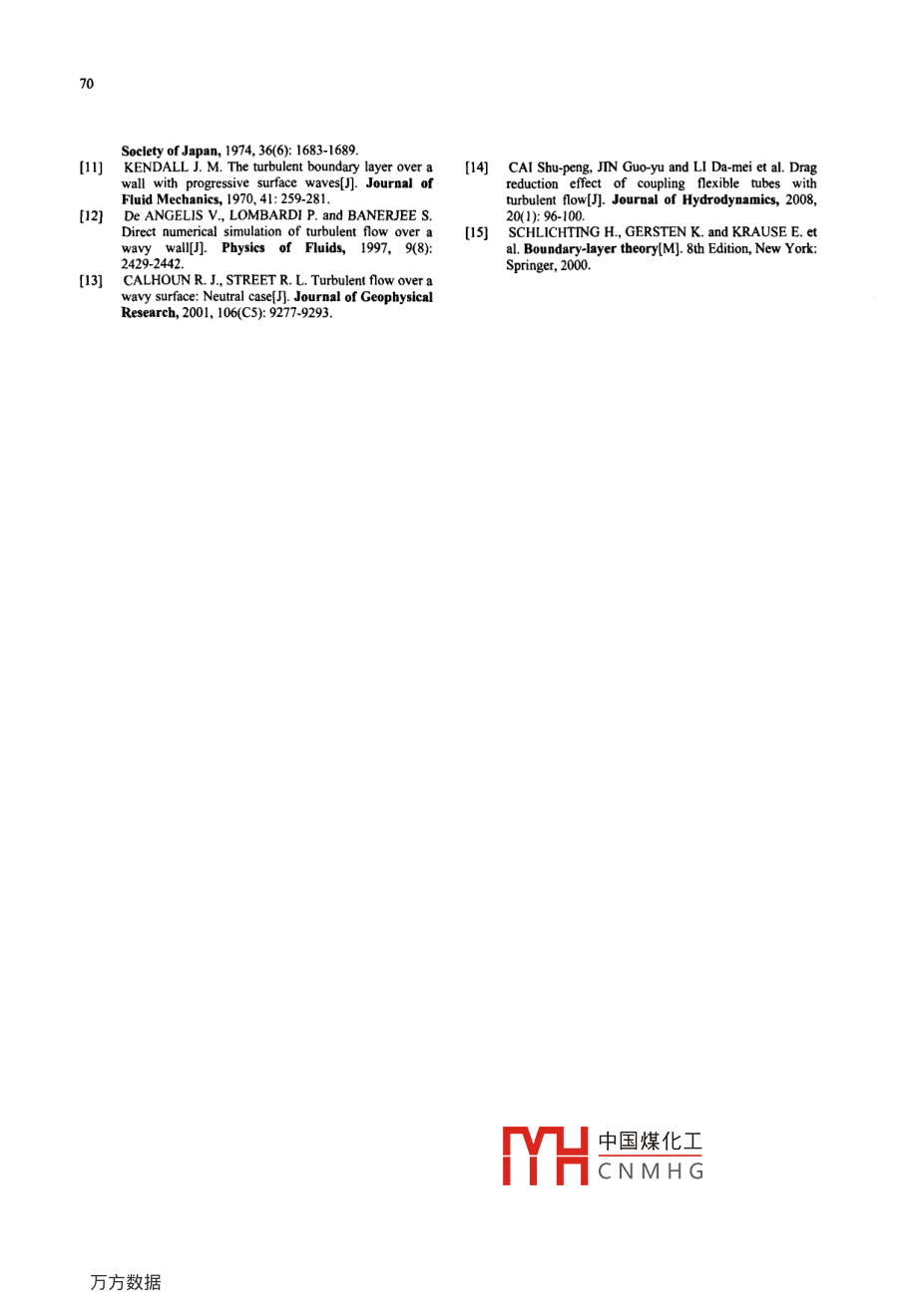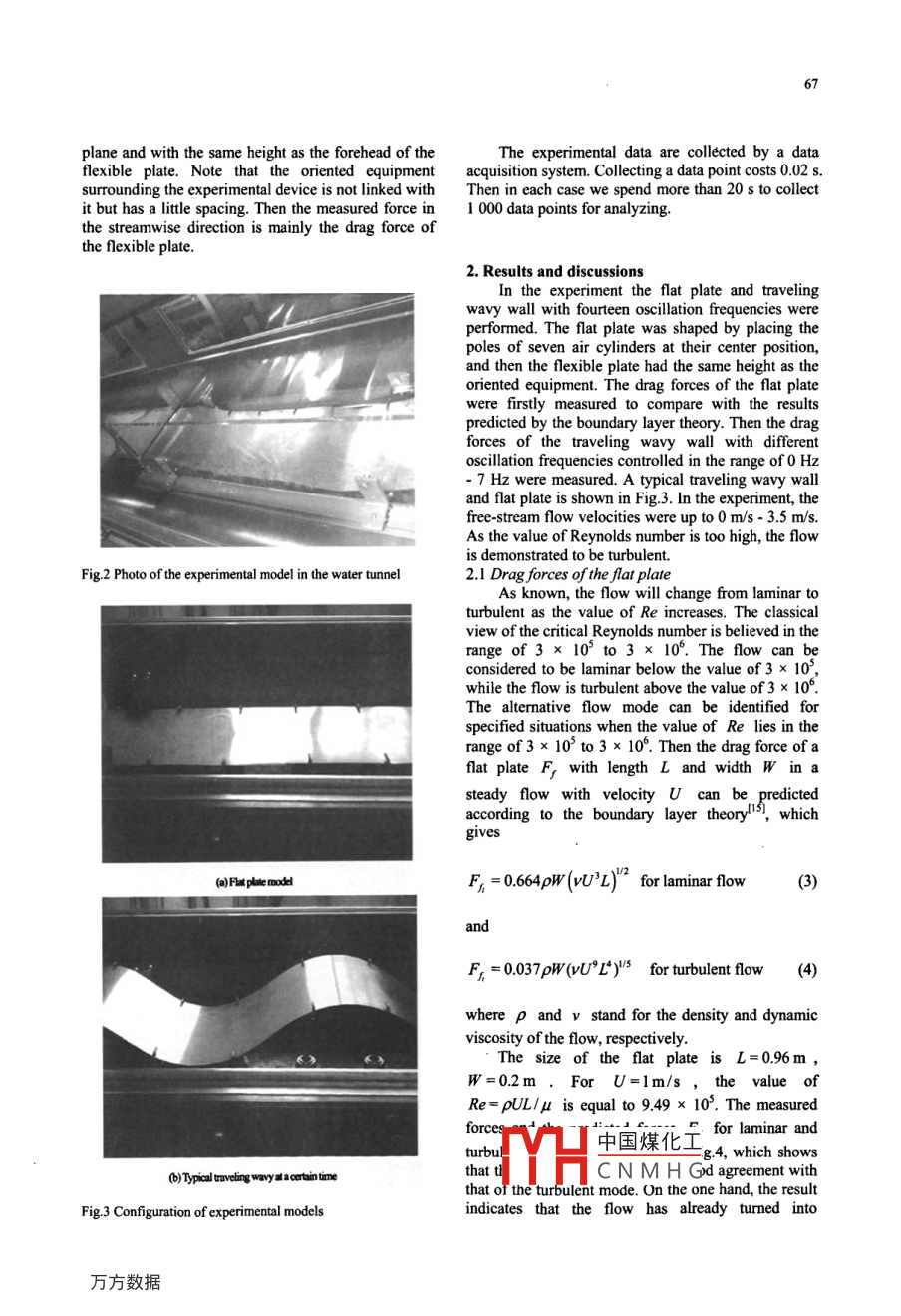 65Available online at www.sciencedirect.com中ScienceDirect+JIIDJoumal of HydrodynamicsELSEVIER201 1,23(1 ):65-70www. sciencedirect.com/science/journal/10016058DOI: 10.1016/S1001-658(10)60089-3WATER TUNNEL EXPERIMENTAL INVESTIGATION ON THE DRAGREDUCTION CHARACTERISTICS OF THE TRAVELING WAVY WALL°YAO YanDepartment of Engineering Mechanics, Shanghai Jiao Tong University, Shanghai 200240, ChinaBejjing Electromechanic Engineering Institute, Beijing 100074, China, E -mail: yaoyanyy@163.comLU Chuan-jingDepartment of Engineering Mechanics, Shanghai Jiao Tong University, Shanghai 200240. ChinaState Key Laboratory of Ocean Engineering, Shanghai Jiao Tong University, Shanghai 200030, ChinaSI TingDepartment of moder Mechanics, University of Science and Technology of China, Hefei 230027, ChinaZHU KunBeijing Electromechanic Engineering Institute, Beijig 100074, China(Received June 3, 2010, Revised December 25, 2010)Abstract: Drag reduction experiment of the traveling wavy wall at high Reynolds number is conducted. A suit of traveling wavywall device is developed. The drag forces of the traveling wavy wall with various wave speeds (c ) are measured under different(U ) in the KI5 cavitation water tunnel and are compared with that of the flat plate. The results show that the meandrag force of the traveling wavy wall have decreased and then increased with oscillation frequency increasing at the same flow speed.Under different flow speeds, when traveling wave wall reached to the minimum of drag force, the corresponding the ratio of the wallmotion phase speed c to flow speed U,c1U is slightly different. W ithin the parameters of the experiment, when c/U reachesa cetain value, the drag force of the traveling wavy wall can be less than that of the flat plate. The drag reduction can be up to 42%.Furthermore, as the value of c/U increases, the traveling wavy wall can restrain the separation and improve the quality of flowfield.Key words: flow control, drag reduction, traveling wavy wall, water tunnel testIntroductiondolphin'4. Then, much work has been performed toIt has been believed for a long time thatexplore. this problem. Important contributions byswimming velocities attained by fish are remarkablyLighthil3.4I and Wul5.6 have shed light on the inviscidhigh in relation to their available muscle power". Fishhydrodynamics of fish-like propulsion.swimming can be very instructive in disclosingIt has been proposed that the travelling wavemechanisms of unsteady flow control, which wasmotions result in reducing drag force and increasingraised first in the relation to swimming of live fish.propulsive efficiency by restraining separation'-9.Gray observed that an actively swimming dolphinExperiments were undertaken to investigate viscousonly consumes one seventh of the energy needed tolow past a travelling wavy wall. Taneda andtow a rigid body at the same speed, and suggested thatTomonarilol observed that the boundary layersubstantial drag reduction must occur in the liveseparates at the_ back of the wave crest for thetravel中國煤化工smaller than theexterrMYHlary layer does notsepar;C N M H Gbeing larger than* Biography: YAO Yan (1978-), Female, Ph. D. Candidate,the extemal flow velocity. Kena!" investigated theEngineer66effect of a travelling wavy wall on flow behaviour.cylinders by a number of windpipes. When the airNumerical simulations' have been carried out forcylinder is working, air is compressed into one gateviscous flow over a fixed wavy surface and confirmedand extruded from the other gate of the air cylinder.the previous experimental measurements.Either in or out is decided by the signals of theIn this article, a suit of traveling wavy wallelectromagnetic valve. When the valve is opened, thedevice based on the air cylinders with high frequencypole is moving upwards, while when the valve isis developed and the characteristics of drag reductionclosed, the pole is moving downwards. The controlat high Reynolds number are experimentallycircuit system can set the frequencies and switches ofinvestigated. The drag forces of the traveling wavyseven electromagnetic valves.wall with various wave speeds c are measured underEach air cylinders was with a successive phasedifferent free-stream flow velocities (U) in the K15difference of 90, and the wave was propagated in thewater tunnel and are compared with the drag force ofstreamwise direction. The motion equation of thethe flat plate, which is also calculated according to thetraveling wavy is described in the followingboundary layer theory. The theoretical predictionindicates that the flow in the experiment becomesy= asin(x-c)|turbulent,and the experimental method isdemonstrated to be valid. When the value of Streaches a certain value, it is also shown that the dragwhere a,a and C stand for the amplitude,force of the traveling wavy wall can be less than thatwavelength and phase speed of the traveling wavyof the flat plate. There are drag reduction methodswall, x,y for the displacement in the horizontalsimilar to the traveling wavy wall. Cai et al.l4)analyzed the mechanism of drag reducing effect byand vertical direction, and t for the time.coupling flexible tubes with turbulent flow based onThe wave length was 0.48 m, amplitude wasexperimental examination.50 mm. and the oscillation frequency could be variedintherange0Hzto7Hz.The experimental device was supported by a1. Experimental apparatus and methodssemi-mode balance in the test section. Although theThe experiment is conducted in KI5 cavitationbalance is designed to measure five components of thewater tunnel of Shanghai Ship and Shipping Researchload, the drag force in the horizontal direction isInstitute (SSSRI), which is a square water tunnel withespecially concerned in order to obtain the drag of themaximum speed up to 12 m/s. Size of the test sectiontraveling wavy wall. The whole model was placed in ais 0.6 mx 0.6 m x 2.6 m. And the non-uniformity ofwater tank, which connected with the floor of the testwat