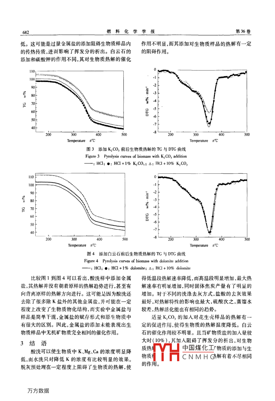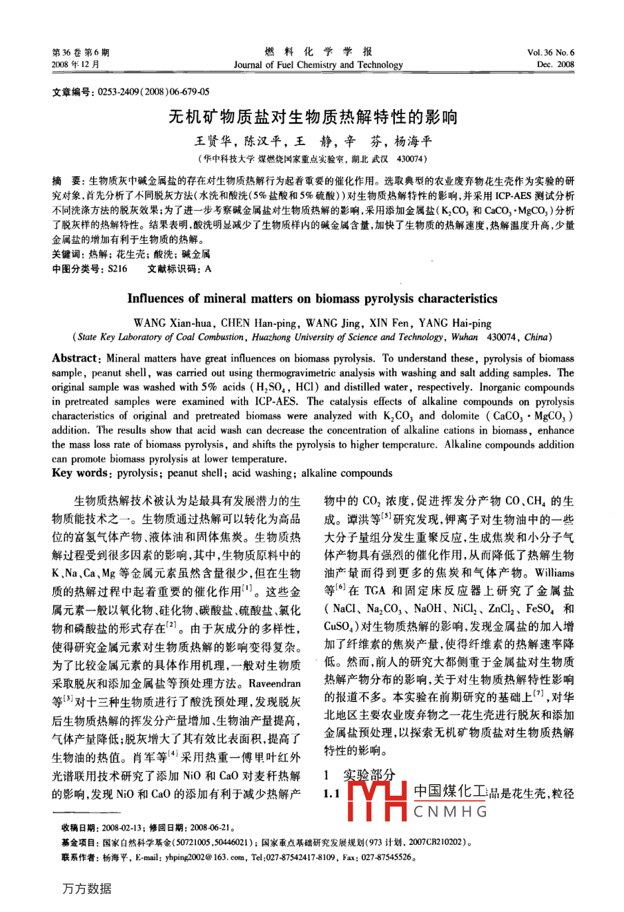 第36卷第6期燃料化學(xué)學(xué)報(bào)vo.36N0.60612月Journal of Fuel Chemistry and TechnologDec.2008文章編號:0253-2409(2008)0667905無機(jī)礦物質(zhì)鹽對生物質(zhì)熱解特性的影響王賢華,陳漢平,王靜,辛芬,楊海平(華中科技大學(xué)煤燃燒國家重點(diǎn)實(shí)驗(yàn)室,湖北武漢430074)摘要:生物質(zhì)灰中堿金屬鹽的存在對生物質(zhì)熱解行為起著重要的催化作用。選取典型的農(nóng)業(yè)廢棄物花生殼作為實(shí)驗(yàn)的研究對象,首先分析了不同脫灰方法(水洗和酸洗(5%鹽酸和5%硫酸))對生物質(zhì)熱解特性的影響,并采用 ICP-AES測試分析不同洗滌方法的脫灰效果;為了進(jìn)一步考察堿金屬鹽對生物質(zhì)熱解的影響采用添加金屬鹽(K2CO3和CaCO3MgCO3)分析了脫灰樣的熱解特性。結(jié)果表明酸洗明顯減少了生物質(zhì)樣內(nèi)的堿金屬含量,加快了生物質(zhì)的熱解速度,熱解溫度升高,少量金屬鹽的增加有利于生物質(zhì)的熱解。關(guān)鍵詞:熱解;花生殼;酸洗;堿金屬中圖分類號:S216文獻(xiàn)標(biāo)識(shí)碼:AInfluences of mineral matters on biomass pyrolysis characteristicsWANG Xian-hua, CHEN Han-ping, WANG Jing, XIN Fen, YANG HaState Key Laboratory of Coal Combustion, Huazhong University of Science and Technology, Wuhan 430074, China)Abstract: Mineral matters have great influences on biomass pyrolysis. To understand these, pyrolysis of biomasssample, peanut shell, was carried out using thermogravimetric analysis with washing and salt adding samples. Theoriginal sample was washed with 5% acids(H2S04, HCl)and distilled water, respectively. Inorganic compoundin pretreated samples were examined with ICP-AES. The catalysis effects of alkaline compounds on pyrolysischaracteristics of original and pretreated biomass were analyzed with K, CO, and dolomite( CaCO, MgCO,)addition. The results show that acid wash can decrease the concentration of alkaline cations in biomass enhancethe mass loss rate of biomass pyrolysis, and shifts the pyrolysis to higher temperature. Alkaline compounds additioncan promote biomass pyrolysis at lower temperature.Key words pyrolysis: peanut shell; acid washing; alkaline compounds生物質(zhì)熱解技術(shù)被認(rèn)為是最具有發(fā)展?jié)摿Φ纳镏械腃O2濃度,促進(jìn)揮發(fā)分產(chǎn)物CO、CH4的生物質(zhì)能技術(shù)之一。生物質(zhì)通過熱解可以轉(zhuǎn)化為高品成。譚洪等研究發(fā)現(xiàn),鉀離子對生物油中的一些位的富氫氣體產(chǎn)物、液體油和固體焦炭。生物質(zhì)熱大分子量組分發(fā)生重聚反應(yīng),生成焦炭和小分子氣解過程受到很多因素的影響,其中,生物質(zhì)原料中的體產(chǎn)物具有強(qiáng)烈的催化作用,從而降低了熱解生物K、Na、Ca、Mg等金屬元素雖然含量很少,但在生物油產(chǎn)量而得到更多的焦炭和氣體產(chǎn)物。 Williams質(zhì)的熱解過程中起著重要的催化作用們。這些金等6在TGA和固定床反應(yīng)器上研究了金屬鹽屬元素一般以氧化物、硅化物、碳酸鹽、硫酸鹽、氯化(NaCl、Na2CO3、NaOH、NiCl2、ZnCl2、FeSO4和物和磷酸鹽的形式存在21。由于灰成分的多樣性,CuSO4)對生物質(zhì)熱解的影響發(fā)現(xiàn)金屬鹽的加入增使得研究金屬元素對生物質(zhì)熱解的影響變得復(fù)雜。加了纖維素的焦炭產(chǎn)量使得纖維素的熱解速率降為了比較金屬元素的具體作用機(jī)理,一般對生物質(zhì)低。然而前人的研究大都側(cè)重于金屬鹽對生物質(zhì)采取脫灰和添加金屬鹽等預(yù)處理方法。 Raveendran熱解產(chǎn)物分布的影響關(guān)于對生物質(zhì)熱解特性影響等對十三種生物質(zhì)進(jìn)行了酸洗預(yù)處理,發(fā)現(xiàn)脫灰的報(bào)道不多。本實(shí)驗(yàn)在前期研究的基礎(chǔ)上,對華后生物質(zhì)熱解的揮發(fā)分產(chǎn)量增加生物油產(chǎn)量提高,北地區(qū)主要農(nóng)業(yè)廢棄物之一花生殼進(jìn)行脫灰和添加氣體產(chǎn)量降低;脫灰增大了其有效比表面積提高了金屬鹽預(yù)處理,以探索無機(jī)礦物質(zhì)鹽對生物質(zhì)熱解生物油的熱值。肖軍等采用熱重一傅里葉紅外特性的影響。光譜聯(lián)用技術(shù)研究了添加NO和CaO對麥稈熱解1實(shí)驗(yàn)部分的影響,發(fā)現(xiàn)NO和CaO的添加有利于減少熱解產(chǎn)1.1中國煤化工品是花生殼粒徑CNMHG收稿日期:200802-13;修回日期:200806-21?;痦?xiàng)目:國家自然科學(xué)基金(50721005,5046021);國家重點(diǎn)基礎(chǔ)研究發(fā)展規(guī)劃(973計(jì)劃,2007CB210202)聯(lián)系作者:楊海平,E-mal:yuping?002@163.com,Te:027875424178109,Fax:02787545526燃料化學(xué)學(xué)報(bào)36卷小于100目(小于0.154mm),其工業(yè)分析和元素分中冷卻30min,稱取質(zhì)量;然后繼續(xù)灼燒1h,冷卻,析見表1。稱量,直至兩次質(zhì)量之差小于0.001g時(shí)可認(rèn)為生表1樣品的工業(yè)分析和元素分析物質(zhì)已燃盡,此時(shí)所得殘余物即為生物質(zhì)灰。Table 1 Proximate and ultimate analyses of biomass material稱取生物質(zhì)灰0.1g左右放入消解罐中,依次Proximate analysis w,d/%Ultimate analysis w/%加入2mL硝酸和2mL氫氟酸(硝酸和氫氟酸均為M V A FC優(yōu)質(zhì)分析純),然后放入微波消解儀上消解22min8.8468.484.6917.9946.153.071.270.0749.44并冷卻30min。取出消解罐,往溶液中加入25mL硼酸,繼續(xù)微波消解10min,再冷卻30min,然后將1.2實(shí)驗(yàn)方法消解溶液全部轉(zhuǎn)移至容量瓶,定容到250mL,最后1.2.1脫灰預(yù)處理采用蒸餾水(DW)、鹽酸將定容后的溶液進(jìn)行 IC