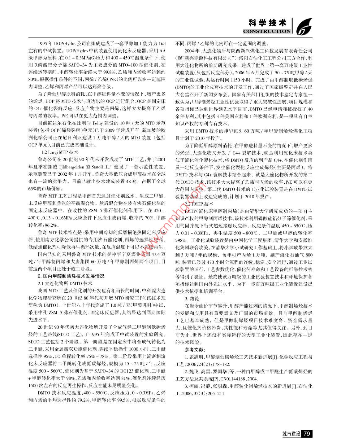 科學(xué)技術(shù)6ICONSTRUCTION甲醇制烯烴技術(shù)發(fā)展現(xiàn)狀及應(yīng)用閆輝'孫延輝11.中國神華煤制油化工有限公司北京100011摘要:由于乙烯及 丙烯是重要的化工原料,世界年需求量逐年增加,供需缺口也逐漸增大,傳統(tǒng)生產(chǎn)乙烯及丙烯的方法為石油路線,由于石油資源有限,近年非石油路線制備乙烯和丙烯的方法越來越受到重視,本文從工業(yè)開發(fā)角度對當(dāng)前國內(nèi)外比較先進的甲醇制烯烴技術(shù)進行了綜述。關(guān)鍵詞:甲醇;乙烯;丙烯乙烯和丙烯是現(xiàn)代化學(xué)工業(yè)中的重要基礎(chǔ)原料,世界年需求量藝 ,并建設(shè)了工業(yè)示范裝置。Mobil 公司基于流化床的工業(yè)示范裝越來越大。傳統(tǒng)制備乙烯和丙烯的方法是通過石腦油裂解獲得,就是置自 1982 年底運行至1985年末,成功地證明了流化床反應(yīng)系統(tǒng)可傳統(tǒng)的石油路線,而畢競石油資源有限,所以近些年世界各國開始致以應(yīng)用于MTG和MTO過程。力于非石油路線制備乙烯和丙烯的等低碳烯烴的研究開發(fā)工作,特Mobil甲醇制汽油技術(shù)的成功開發(fā)推動了甲醇制烯烴(MTO)、甲別是由煤或天然氣經(jīng)甲醇制低碳烯烴的工藝越來越受到世人的矚醇制丙烯 (NTP)等工藝的開發(fā)。目前,國外的工藝技術(shù)有由目。本文對當(dāng)前國內(nèi)外比較先進的甲醇制烯烴技術(shù)的工業(yè)開發(fā)情況UOP/Hydro公司共同開發(fā)的MTO工藝和由Lurgi公司開發(fā)的MTP進行了重點介紹。1.國外甲醇制烯烴技術(shù)發(fā)展情況1.1UOPMTO技術(shù)二十世紀(jì)八十年代初.美國美孚(Mobil)公司在研究采用沸石催1986年UCC發(fā)現(xiàn)采用SAP0-34(磷酸硅鋁分子篩)可以有效地化劑利用甲醇制汽油(MITG)I藝的過程中發(fā)現(xiàn)并發(fā)展了甲醇制烯烴將甲醇轉(zhuǎn)化為低碳烯烴,而后ucc將相關(guān)技術(shù)轉(zhuǎn)讓給了UOP公司。(MT0)工藝。Mobil 公司對反應(yīng)機理進行了細致的研究,不斷優(yōu)化催1992 年UOP和NorskHydro合作開發(fā)了以多孔性MTO-100 ( 主要成化劑,開發(fā)了使用新型沸石催化劑ZSM-5進行MTO和MTC反應(yīng)的分 為SAP0-34)為催化劑的UOP/Hydro工藝。管網(wǎng)的壓力非常的穩(wěn)定,維護和管理起來也非常的方便,出現(xiàn)問題的所設(shè)計和要求的發(fā)生 變化,因此而達到水泵在整個管網(wǎng)的運行中實情況很少發(fā)生,所以是一- 個應(yīng)該得到廣泛的推廣和應(yīng)用,同時還能帶際所需 要一致的高效 率區(qū)間內(nèi),從而達到了水泵的節(jié)能目的。水泵的來非常好的經(jīng)濟效益。比如在我國的某些地區(qū)的給水系統(tǒng)中,通過對葉輪 切削也是-個改變水泵性能的一-種非常簡單并且也很易行的方給水管網(wǎng)的結(jié)構(gòu)性狀和服務(wù)的區(qū)域地形進行了全面的分析和研究,法,現(xiàn)在在我國大部分地區(qū)的給水系統(tǒng)中已經(jīng)得到了廣泛的應(yīng)用。比當(dāng)居民的日常用水量增加的時候,水泵的給水量也應(yīng)該相應(yīng)的提高,如,250S-39型雙吸離心泵的額定流量是Q-=485m3/,H=39m,P=63.但是它的揚程也隨之相應(yīng)的下降。由于居民的日常用水量的變化時3k w .n=1450/min,葉輪的直徑是D)=367mm, 配用的電機是Y280-4非常的不規(guī)律的,所以在這個給水系統(tǒng)中管理水泵運行的人員非常型,功率為75KW。通過比較水泵的實際運行的參數(shù)和性能的曲線可的難做到及時的根據(jù)居民日常用水量的變化來調(diào)整水泵的運行參以看的出來,改配用的給水水泵在實際的運行效率是非常的低的,特數(shù)。但是在通過變頻控制技術(shù)的推廣和應(yīng)用后,能夠很好的解決這類別是在晚上的時候給水的流量非常的小,只有65%左右。因此,根據(jù)事情的發(fā)生。也保證了管網(wǎng)的恒壓供水,也很大程度的節(jié)約了電力的目 前給水系統(tǒng)中的管網(wǎng)給水的實際工況的要求,首先對給水泵進行消耗。比如某地的改造方案是預(yù)先測定了給水系統(tǒng)的管網(wǎng)運行的壓葉 輪的切削改造。精密的計算出這個水泵的比旋轉(zhuǎn)速度是124.45,再力,通過一個可編程控制器,按照時間段來達到自動控制變頻器的輸根據(jù)葉輪切削限量表可以確定這個水泵的最大切削量應(yīng)該控制在出頻率來改變給水系統(tǒng)中的水泵的旋轉(zhuǎn)速度,變頻器根據(jù)安裝在給15% 以內(nèi)。因此,將原來配置的水泵的葉輪切削了8%以后,在滿足水系統(tǒng)主要管網(wǎng)上的壓力傳感器,時刻的檢測著給水系統(tǒng)中水泵的給 水系統(tǒng)管網(wǎng)的運行參數(shù)的情況下,給水的水泵將運行在-一個非常壓力,通過精密的計算不斷地調(diào)節(jié)給水機組的運行轉(zhuǎn)數(shù),使水泵的旋高效率的區(qū)間內(nèi),從而可以達到節(jié)省能源的目的。水泵的葉輪經(jīng)過切轉(zhuǎn)速度滿足給水系統(tǒng)管網(wǎng)的運行需要,從而實現(xiàn)管網(wǎng)的恒定壓力給削以后 ,在實際的運行過程中,將出水的閥]完全的打開,給水泵的水,使給水管網(wǎng)長期的穩(wěn)定運行在一- 個非常恒定的壓力下,達到了水出口壓力基本 上降到了與管網(wǎng)的需求壓力成為了一只,運行的效率泵的經(jīng)濟運行。得到了非常大的提高,經(jīng)濟效率也很顯著。三、改變水泵的內(nèi)部結(jié)構(gòu)參考文獻:改變水泵的葉輪也
