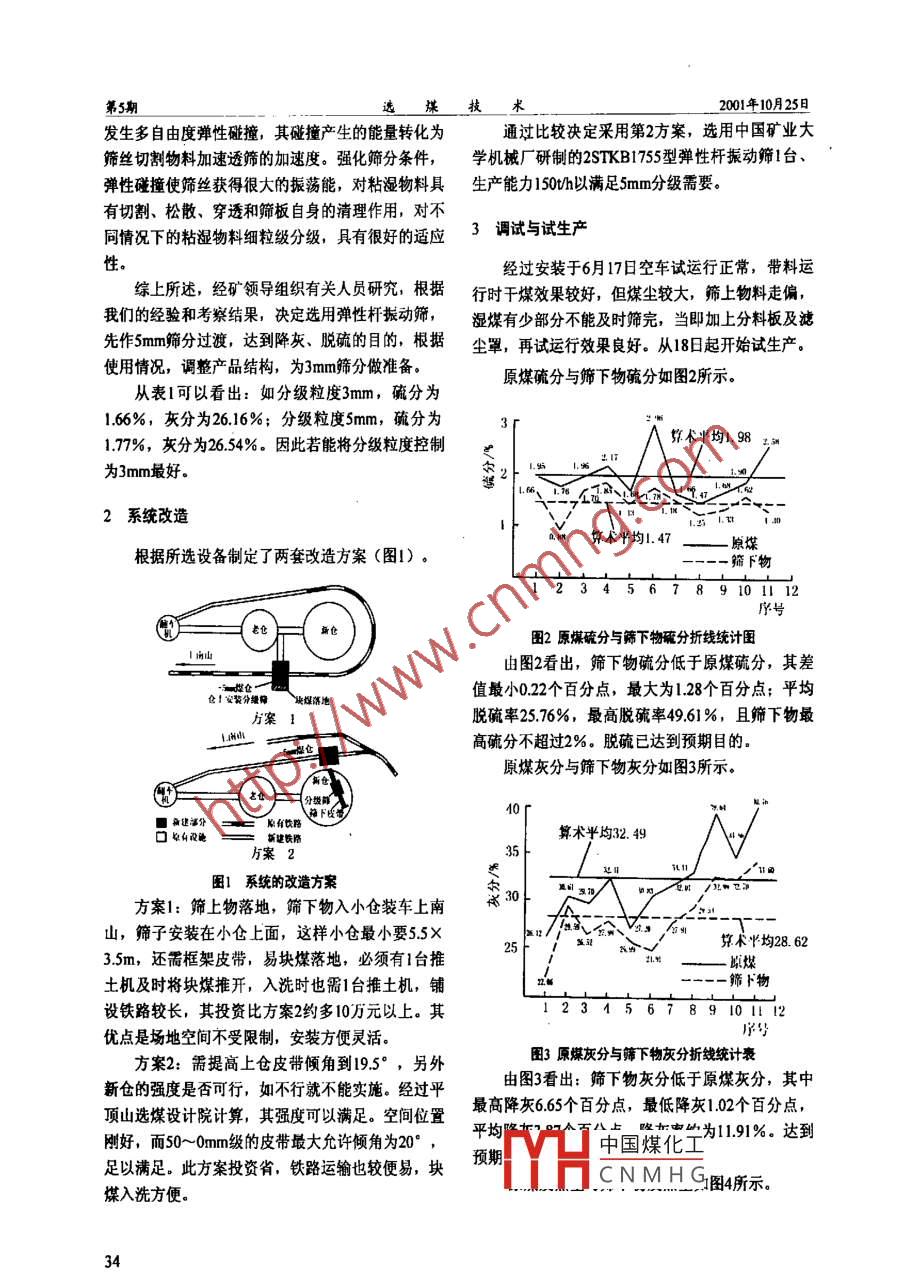 第5期選煤枝術(shù)No.52001年10月COAL PREPARATION TECHNOLOGY0ct.2001觀音堂煤礦原煤的深度篩分陳德帥張輝(義馬礦務(wù)局觀音堂煤礦河南省陜縣472123 )張成勇李大山(中國礦業(yè)大學(xué)機械廠江蘇省徐州市 221008)摘要介紹了觀音堂煤礦選用2STKB1755型彈性桿振動篩進行原煤深度篩分,達到降灰、脫硫目的,并分析了使用效果和經(jīng)濟效益.關(guān)鍵詞深度篩分彈性桿振動篩脫灰脫硫中圖分類號: TD941*.3文獻標識碼: A觀音堂煤礦原來主要生產(chǎn)冶煉精煤,由于精煤高時易糊篩、 壓篩,無法正常篩分。該篩進口價格市場疲軟,電煤市場看好,該礦前一階段改為銷售太高, 企業(yè)難于承受。電煤為主,但近來用戶要求原煤硫分必須小于風(fēng)力篩分:觀音堂礦曾經(jīng)用原煤做過3mm分級2%,否則拒收,而該礦原煤硫分-般都在2%以的試驗,效果不錯,但試驗中多次堵塞,而實際使上。為了滿足用戶要求,充分發(fā)揮選煤廠優(yōu)勢,將用該設(shè)備的大要山礦,自試運行開始都不能正常運洗精煤改為洗動力煤,各項指標均滿足用戶要求。行,每運行2h就要停下來處理故障,處理時間約但由于洗選成本較高,洗得多賠得多,為此礦領(lǐng)導(dǎo)2h,另外還有其它故障,不能正常生產(chǎn),且該設(shè)備根據(jù)原煤性質(zhì)(表1),又經(jīng)過多次調(diào)研決定上一投資較高。套深度篩分系統(tǒng),分級粒度3~5mm,篩上物入強力篩:據(jù)了解,該篩做過工業(yè)性試驗,篩分洗,篩下物直接做為商品煤。這樣減少了入洗量及效果較好,但就其原理來說,易產(chǎn)生篩分過程中的煤泥水系統(tǒng)的處理量,降低產(chǎn)品的硫分,達到用戶破碎作用,而觀音堂礦的煤易碎,這樣會產(chǎn)生過破的需求,同時又可降低加工成本。碎作用,使高硫煤的塊煤破碎后進入篩下物料,使表l原煤篩分表篩下物硫分增高,且設(shè)備安裝空間有限,故不可權(quán)。篩下物累計粒級/m彈簧篩:據(jù)了解,該篩分級粒度可到4mm,目產(chǎn)率吩硫分粒度產(chǎn)竄分前還沒有使用廠家的資料,義馬驢務(wù)局曾安裝- -臺>6 售19.29 39.40 5.03做過試驗,就使用情況看,干物料效果較好,但稍6~510.60 31.07 2.72 5 70.11 26.54有水分或濕物料,壓篩嚴重,篩孔易堵塞,振動力5~46.85 29.50 2.4763.26 26.22大。4~33.59 27.25 2.173 59.67 26.16 .59.67 26.16 1.66彈性桿振動篩:據(jù)考察淮北礦務(wù)局張莊礦矸石合計100.00 29.50 2.50電廠和兗州礦務(wù)局南屯礦使用的彈性桿振動篩,對粘濕物料,洗矸混煤的細粒級分級效果較好;義馬!深度篩分設(shè)備的選擇礦務(wù)局新安礦使用的6mm分級效果也較好,若水分根據(jù)目前篩分技術(shù)及工藝設(shè)備的發(fā)展,選擇理大時,該篩只是篩分效果略差,但未出現(xiàn)堵孔、壓想的深度篩分設(shè)備是很困難的,也是有限的。目前篩子現(xiàn)象,篩孔自清理效果不錯。彈性桿篩板用于用于原煤千法深度篩分設(shè)備有:梯流篩、馳張篩、義馬礦務(wù)局千秋礦原煤篩的改造做深度篩分效果也風(fēng)力篩、彈簧篩、強力篩、彈性桿振動篩等,這些較理想,具有較高的適應(yīng)性,且價格最低。篩型的應(yīng)用效果根據(jù)我們的應(yīng)用和了解簡述如下:彈性桿振動篩是中國礦業(yè)大學(xué)機械廠的專利產(chǎn)梯流篩:分級粒度下限可達3mm,篩濕煤時,品,據(jù)考察,這幾年使用彈性桿振動篩的局礦都取效果不好易堵孔,篩條易折斷,且產(chǎn)率低篩子價格得較高的企業(yè)效益和社會效益,推廣很快,該篩型較高。建立于中國煤化工利用剛度值很馳張篩:分級粒度下限可達6mm,篩分效果較大的彈YHCNMHG無約束間隙配好。據(jù)義馬礦務(wù)局石豪礦的使用情況,原煤水分較合,在篩體主振頻率的作用下,篩絲和篩板框架壁33第5期選__煤技術(shù)2001年10月25日發(fā)生多自由度彈性碰撞,其碰撞產(chǎn)生的能量轉(zhuǎn)化為通過比較決定采用第2方案,選用中國礦業(yè)大篩絲切割物料加速透篩的加速度。強化篩分條件,學(xué)機械廠研制的2STKB1755型彈性桿振動篩1臺、彈性碰撞使篩絲獲得很大的振蕩能,對粘濕物料具生產(chǎn) 能力150th以滿足5mm分級需要。有切割、松散、穿透和篩板自身的清理作用,對不3調(diào)試與試生產(chǎn)同情況下的粘濕物料細粒級分級,具有很好的適應(yīng)性。經(jīng)過安裝于6月17日空車試運行正常,帶料運綜上所述,經(jīng)礦領(lǐng)導(dǎo)組織有關(guān)人員研究,根據(jù)行時干煤效果較好,但煤塵較大,篩上物料走偏,我們的經(jīng)驗和考察結(jié)果,決定選用彈性桿振動篩,濕煤有少部分不能及時篩完,當(dāng)即加上分料板及濾先作5mm篩分過渡,達到降灰、脫硫的目的,根據(jù)塵單,再試運行效果良好。從18日起開始試生產(chǎn)。使用情況,調(diào)整產(chǎn)品結(jié)構(gòu),為3mm篩分做準備。原煤硫分與篩下物硫分如圖2所示。從表l可以看出:如分級粒度3mm,硫分為1.6%,灰分為26.16%;分級粒度Smm,硫分為算術(shù)中均1.981.77%,灰分為26.54%。因此若能將分級粒度控制217為3mm最好。查21.6、1.78 分472系統(tǒng)改造么1.好ima算術(shù)平均I.47.原煤根據(jù)所選設(shè)備制定了兩套改造方案(圖I)。12345678910112序號新倉團2原煤硫分與篩下物硫分折線統(tǒng)計圖I山由圖2看出,篩下物硫分低于原煤硫分,其差值最小0.22個百分點,最大為1.28個百分點;平均創(chuàng)|公裝分縫符塊煤潺地方案!脫硫率25.76%,最高脫硫率49.61%,且締下物最