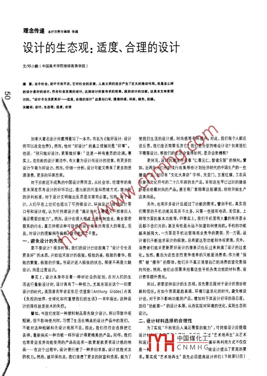 理念傳遞本欄目責任編輯 張魑設計的生態(tài)觀:適度、合理的設計文/鄧小鵬(中國美術學院繼續(xù)教育學院)摘要: 當今杜會,設計無處不在,它對社會的發(fā)展、人類文明的進步產(chǎn)生了巨大的推動作用。但是怎么樣的設計是好的設計.符合杜會發(fā)展的設計,達到設計所要尋求的效果,起到設計的功能,這是本文將要探臺討的?!霸O計令生活更美好一適 度、合理的設計”這是旬口號,提倡持續(xù)、環(huán)保、綠色、低碳。關鍵詞:設計、生態(tài)觀、適度、合理加拿大著名設計師戴博曼寫了一本書,書名為《做好設計:設計使我們生活的設計感、時尚感等有所提升。對此,我們每個人都應師可以改變世界),然而,他對“好設計"的真正理解則是"好事”。該反思,我們是否需要丟棄它?我們是否堅持唯設計論?如果我們他說:“別只做好設計,更要做好事!"這是一種有意思的論調。事不需要設計,那我們的生活會變得如何,是否會更糟糕?實上,在目前的設計潮流中,有大量為設計而設計的現(xiàn)象,有更多的更何況,設計的潮流存在著“仁著見仁、智者見智"的傾向。譬設計乍看為好設計,然而,仔細-分析, 設計可能又帶來了更多的資如,近兩年人們開始流行收集那些計劃經(jīng)濟時代的中國生產(chǎn)的一些源浪費、更多的環(huán)保危害。搪瓷產(chǎn)品,如印有"文化大革命”字樣、天安門五星紅旗、工農兵對于目前還不成熟的中國設計界而言,從社會學、倫理學的角形象等文化符號的二十幾年前的老產(chǎn)品,宣稱這些早已過時的搪瓷度來深度思考設計的好壞功過,提出新的尺度和思維方式,提出新杯是目前最時尚的產(chǎn)品。甚至有廠家順著這股潮流,紛紛開始生產(chǎn)的評判標準,對于設計文明做出反思是非常有必要。當然,對于設這類用品。計,人們早在上世紀也提出了可持續(xù)設計、環(huán)保設計.綠色設計等另外,也有許多設計遠超過了功能的需求。譬如手機,其實我口號和設計觀,認為可持續(xù)設計是“滿足當代人需要又不損害后人們需要的手機功能其實并不太多,只要-些接聽電話、 發(fā)信息、上滿足需要的能力”。然而,設計在很大程度上是和制造業(yè)、商業(yè)緊密網(wǎng)等方面的基本功能等,但事實上,我們手機里有大量的程序是永聯(lián)系的行業(yè),真正持續(xù)這種可持續(xù)的設計觀依然有很大的難度,況遠都不會打開的,甚至有些是永遠不知道如何使用的。手機的功能且,對設計的理解稍有偏頗,就可能失之千里。越來越強大,一方面是手機運營商商業(yè)競爭的需要另- -方面,設一、避免設計的失控計者們不斷追求設計的極致,總希望達到功能和外觀更強,另外,要不要設計?很多時候,我們的設計已經(jīng)脫離了“設計令生活消費者們追求更新更好設計的潛意識也反過來刺激了設計的過度更美好"的本質,開始追求設計的極致,極致的美,極致的奢華,極化。 當然,最后為這些惡性競爭埋單的只能是消費者,作為被"指致的繁復,極致的價值。當設計進入極致的狀態(tài),那便不再是欠缺揮"被"擺布"的群體,他們并不真正清楚自己的消費欲望究竟指設計,而是過度設計。向何處,然而,他們必須要承擔著這些手機各類功能的材料費、設事實上,設計本身存在著-種對社會的規(guī)劃,在對人們的生計費等額外費用?;钸M行重新設計時,設計具有了一種權力,尤其在現(xiàn)在這個一切要所以,若要堅持設計的生態(tài)觀,首先要克服對于設計的盲目依設計的時代。英國著名學者安東尼吉登斯(Anthony Giddes) 在其賴和信任。在如今資源越趨衰竭、環(huán)境日益惡化的時代,避免唯設《失控的世界:全球化如何重塑我們的生活> -書中指出,這種設計論, 對于并不影響功能的產(chǎn)品,增加對于其設計好壞的容忍度,計的強權就是技術的失控?;貧w“功能第一”的設計本原,從而實現(xiàn)對環(huán)境的優(yōu)化實現(xiàn)生態(tài)的譬如,當我們發(fā)現(xiàn)- -種塑料制品原先缺少設計,所以導致外觀設計。粗陋,但不影響使用時,習慣了生活在精美的設計產(chǎn)品中的我們,二、 設計材料選擇的合理性不能對這種粗陋和無設計視而不見,因此,我們往往會選擇把它為了實現(xiàn)“不損害后人滿足需要的能力" ,可持續(xù)設計應提倡丟掉,重新購買一種功能-樣但設計得更精美的產(chǎn)品。同樣,我們設計^中國煤化工過“藝術地再生'“從藝術也常常會丟棄尚能使用的產(chǎn)品而追求一款更新款更有設計感的物和設循環(huán)再利用方式不僅僅....在這個過程中,設計便行使了一種棄舊求新,設計優(yōu)勝劣汰是一種YHc N M H G續(xù)設計提出了更高的要的權力。然而,就環(huán)保而言,我們浪費了更多的財富和資源,就為了求。要實現(xiàn)“藝術地再生"首先必須提高設計師們(下轉第53頁)2.將數(shù)碼攝影圖像通過電腦進行重像同構。重像同構是平面新奇,拍攝出來的肌理清晰真實,光影關系細膩,可以增加合成的廣告圖形創(chuàng)意常用的方法,幾種不同的形象按照-定的內在聯(lián)系與真實效果。 (圖9)邏輯相互重合,系統(tǒng)合成,構成- -個新的形象, 就稱為重像。(3)通過四、結語.重像合成可以將不同的數(shù)碼攝影圖像組合成新的超現(xiàn)實的數(shù)碼圖攝影在平面廣告設計中的應用非常廣泛,追溯其歷史,自從攝像,也使原始的數(shù)碼攝影圖像有了二次生