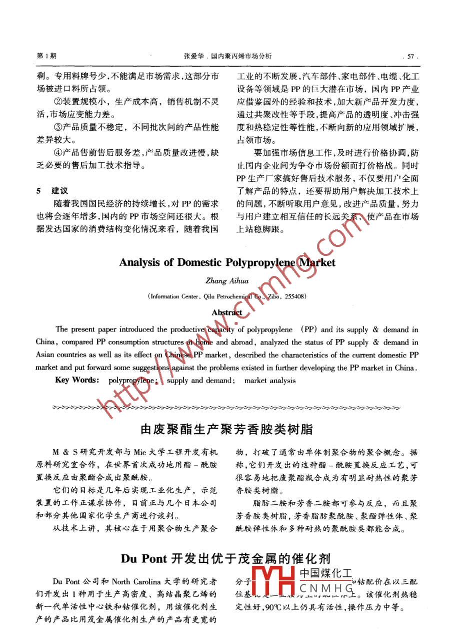 綜述合成樹脂及塑料,2000,17(1):54CHINA SYNTHETIC RESIN AND PLASTICS國內(nèi)聚丙烯市場分析張愛華(齊魯石油化工股份有限公司信息中心,淄博,255408)介紹了我國聚丙烯的生產(chǎn)能力及供需狀況,對國內(nèi)外聚丙烯的消費(fèi)結(jié)構(gòu)進(jìn)行了比較,分析了亞洲各國的供需狀況及對我國聚丙烯市場的影響,指出了目前國內(nèi)聚丙烯市場的特點(diǎn)及存在的問題,并提出建議。關(guān)鍵詞:聚丙烯供應(yīng)與需求市場分析聚丙烯(PP)是重要的塑料制品原料,以其優(yōu)等。良的加工性能和相對低廉的價格,受到各行業(yè)的2國內(nèi)消費(fèi)結(jié)構(gòu)與國外消費(fèi)結(jié)構(gòu)的比較重視。近幾年來,國內(nèi)各PP生產(chǎn)廠家都在積極謀2.1國內(nèi)消費(fèi)結(jié)構(gòu)求通過擴(kuò)建裝置、更新技術(shù)和新產(chǎn)品的開發(fā),不斷在我國,目前PP樹脂的應(yīng)用領(lǐng)域主要是農(nóng)向新的應(yīng)用領(lǐng)域擴(kuò)展,發(fā)展勢頭喜人。同時也應(yīng)業(yè),用于編織袋、打包帶、捆扎繩、農(nóng)用塑料袋、包看到,國外產(chǎn)品以其優(yōu)異的質(zhì)量、低廉的價格、優(yōu)裝袋防水布等,其他領(lǐng)域應(yīng)用目前還相對較少。質(zhì)的服務(wù)在搶占我國的市場。尤其最近2年,受亞隨著我國工業(yè)的不斷發(fā)展和PP改性、增強(qiáng)技術(shù)的洲金融危機(jī)的沖擊,周邊國家加大了對我國的出開發(fā),汽車建筑、電器、設(shè)備等領(lǐng)域?qū)⑹荘P樹脂口,極大地沖擊了我國市場,使國內(nèi)的生產(chǎn)企業(yè)受的巨大潛在市場。我國PP消費(fèi)結(jié)構(gòu)情況見表4到了嚴(yán)峻的挑戰(zhàn)2.2國外消費(fèi)結(jié)構(gòu)在工業(yè)比較發(fā)達(dá)的國家,P注塑制品的應(yīng)用1我國的PP生產(chǎn)能力及供需狀況在消費(fèi)中占據(jù)首位,尤其是汽車和家電工業(yè)發(fā)展1.1生產(chǎn)能力較快的國家更是如此。PP消費(fèi)市場的擴(kuò)大主要由從70年代末,我國的P產(chǎn)業(yè)發(fā)展異常迅速,于共聚物應(yīng)用的開發(fā),共聚物開辟了新市場,并在陸續(xù)引進(jìn)了大批生產(chǎn)裝置。到目前為止,我國PP原有的應(yīng)用領(lǐng)域取代了一些均聚物。今后共聚物生產(chǎn)廠家有70多家,裝置100余套,生產(chǎn)能力約的生產(chǎn)將繼續(xù)增長,以適應(yīng)改進(jìn)透明度、沖擊強(qiáng)度2.3Mt/a,其中一部分為引進(jìn)技術(shù)建的具有一定和熱穩(wěn)定性的要求。表5~表7是一些主要工業(yè)規(guī)模的裝置(見表1),另一部分為我國消化吸收國家和地區(qū)的消費(fèi)結(jié)構(gòu)國外技術(shù)自行開發(fā)的裝置(見表2)。2.3國內(nèi)外消費(fèi)結(jié)構(gòu)的比較1.2供需將國內(nèi)外消費(fèi)構(gòu)成做一下比較不難看出,在盡管我國PP生產(chǎn)發(fā)展迅速,但始終趕不上需歐、美、日本等發(fā)達(dá)國家及地區(qū)主要消費(fèi)領(lǐng)域是注求的高速增長。1990年國內(nèi)產(chǎn)量為378kt,自給率塑、纖維、膜和片材,而我國主要是農(nóng)用編織品、農(nóng)為63.9%;到1998年國內(nèi)產(chǎn)量達(dá)2033kt,自給率用薄膜等。因此,我們除了繼續(xù)生產(chǎn)普通的均聚為56.5%,自給率依然很低(見表3)。而進(jìn)口量產(chǎn)品滿足農(nóng)業(yè)領(lǐng)域的需求外,還必須利用好近年1990年為28kt,1998年達(dá)1544k之多,這就說明國內(nèi)的市場雖然發(fā)展迅速,但很大部分被國外中國煤化工產(chǎn)品占領(lǐng)了,而且進(jìn)口部分主要是價格較高的專CNMHG山東機(jī)械工業(yè)學(xué)校,直從事報(bào)調(diào)研工作,論文曾獲齊魯石油化工股份用料,如洗衣機(jī)專用料、雙向拉伸聚丙烯(BOPP)有限公司科技進(jìn)步2等獎及中國石油化工集團(tuán)公司科技專用料、纖維級專用料、汽車及電子電器專用料進(jìn)步4等獎等獎項(xiàng)。張愛華.國內(nèi)聚丙烯市場分析表1我國引進(jìn)的PP裝置生產(chǎn)能力企業(yè)名稱投產(chǎn)日期/年設(shè)計(jì)能力kt·a1現(xiàn)有能力At·a使用技術(shù)上海石油化工股份有70海蒙特 Spheripol工藝限公司塑料事業(yè)部(環(huán)管)液相本體-氣相法撫順乙烯化工有限公司海蒙特 Spheripol工藝(環(huán)管)液相本體-氣相法天津聯(lián)合化學(xué)有限公司海蒙特 SpheripoL藝(環(huán)管)液相本體一氣相法中原石油化工有限海蒙特 Spheripol藝責(zé)任公司(環(huán)管)液相本體一氣相法茂名石化乙烯工業(yè)海蒙特 Spheric工藝公司(環(huán)管)液相本體-氣相法齊魯石油化工股份海蒙特 Spheripol工藝有限公司(環(huán)管)液相本體一氣相法大連西太平洋石油海蒙特$ phenicol藝化工有限公司(環(huán)管)液相本體-氣相法新獨(dú)山子石油化海蒙特 Spheripol工藝工總廠乙烯廠(環(huán)管)液相本體一氣相法揚(yáng)子石油化工股三井油化 HypoL藝份有限公司(釜式)液相本體一氣相法盤錦乙烯工業(yè)公1990(釜式)液相本體-氣相法廣州石油化工總廠乙烯廠1996井油化Hyo藝(釜式)液相本體一氣相法廣州石油化工總廠北京燕山石油化工有限公司三井油化溶劑法遼陽石油化纖公司Amoco液相法合計(jì)1270表2我國自行設(shè)計(jì)的PP生產(chǎn)能力在新產(chǎn)品開發(fā)方面的研究成果,大力開發(fā)共聚產(chǎn)企業(yè)名稱投產(chǎn)日期年設(shè)計(jì)能力/品和進(jìn)行PP改性,以提高PP樹脂的性能,適應(yīng)注塑