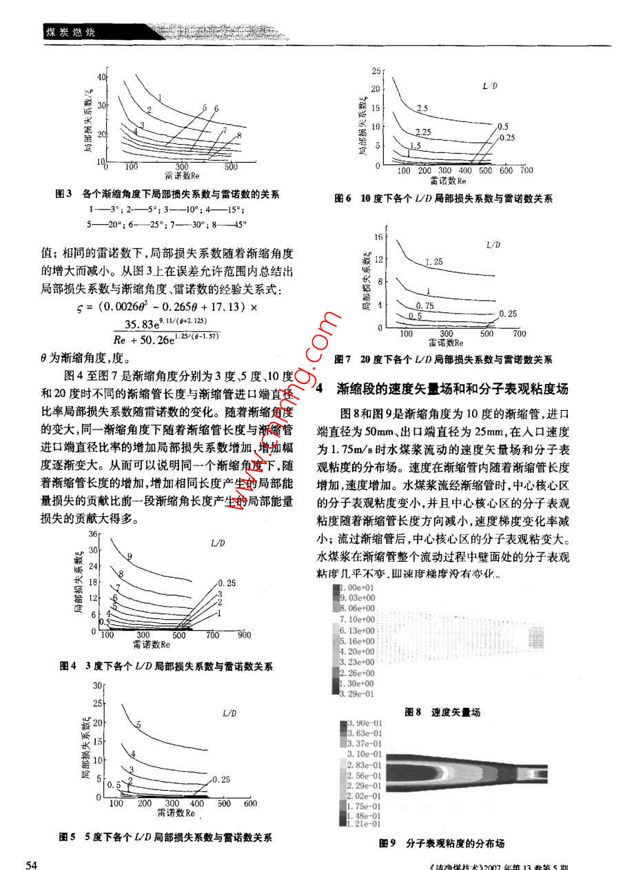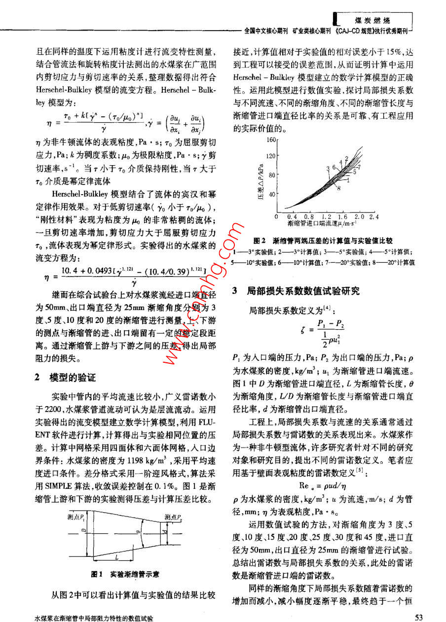 煤炭燃繞水煤漿在漸縮管中局部阻力特性的數(shù)值試驗(yàn)趙國(guó)華,陳良勇,段鈺鋒(東南大學(xué)潔凈煤發(fā)屯及燃燒技術(shù)教育部重點(diǎn)實(shí)驗(yàn)室,江蘇南京210096)摘要:針對(duì)質(zhì)量濃度為5708%神華水煤漿,利用管流法和旋轉(zhuǎn)粘度計(jì)法測(cè)得其流變模型。運(yùn)用FLUEⅥT軟件提供的非牛頓流體模塊對(duì)水煤漿流經(jīng)漸縮管進(jìn)行模擬計(jì)算,比較計(jì)算壓差和實(shí)驗(yàn)壓差,證明計(jì)算模型的正確性。基于計(jì)算模型的正確性,對(duì)水煤漿在漸縮管中不同流速、不同漸縮角度的工況下進(jìn)行數(shù)值試驗(yàn),得出局部損失系數(shù)與雷諾數(shù)和漸縮角度的經(jīng)驗(yàn)公式;在漸縮角度不變的情況下,改變漸縮管長(zhǎng)度與漸縮管進(jìn)口端直徑比率,得出各個(gè)相應(yīng)比率下的局部損失系數(shù)與雷諾數(shù)的關(guān)系。關(guān)鍵詞:水煤漿;漸縮管;局部損失系數(shù);數(shù)值實(shí)驗(yàn)中圖分類號(hào):TQ051.21文獻(xiàn)標(biāo)識(shí)碼:A文章編號(hào):10066772(2007)050052-04水煤漿是一種新型煤基流體潔凈環(huán)保燃料既在不同流速、不同的漸縮角度、不同的漸縮管長(zhǎng)度與保留了煤的燃燒特性,又具備了類似重油的液態(tài)燃漸縮管進(jìn)口端直徑比率對(duì)局部損失系數(shù)進(jìn)行研究。燒應(yīng)用特點(diǎn),是目前中國(guó)一項(xiàng)現(xiàn)實(shí)的潔凈煤技術(shù)。首先采用管流法和旋轉(zhuǎn)粘度計(jì)法相結(jié)合得出符合隨著水煤漿需求量的增大,對(duì)水煤漿管道輸送研究 Herschel- Bulkley模型的流變方程,建立合理的數(shù)學(xué)的重要性日益提升。為了使水煤漿管道輸送得到順模型進(jìn)行計(jì)算,將計(jì)算值與實(shí)驗(yàn)測(cè)得壓差比較,在誤利進(jìn)行,對(duì)管道的設(shè)計(jì)和優(yōu)化提出了更髙的要求。差允許的范圍內(nèi)驗(yàn)證模型的正確性,之后采用此模合理的管道設(shè)計(jì)參數(shù)是管道設(shè)計(jì)和優(yōu)化的前提,管型進(jìn)行數(shù)值試驗(yàn),改變流速、漸縮角度漸縮管長(zhǎng)度道在工作過程中存在沿程阻力損失和局部阻力損與漸縮管進(jìn)口端直徑比率得出局部損失系數(shù)與各自失)。管道的設(shè)計(jì)和優(yōu)化中常遇到管路的漸縮阻的關(guān)系,并總結(jié)適合工程應(yīng)用的經(jīng)驗(yàn)公式。力系數(shù),合理確定漸縮阻力系數(shù)是使設(shè)計(jì)達(dá)到實(shí)際應(yīng)用要求和最優(yōu)化的關(guān)鍵現(xiàn)有的設(shè)計(jì)手冊(cè)或資料1實(shí)驗(yàn)與水煤漿流變方程的確定中,均采用了漸縮段的進(jìn)出口面積有關(guān)的系數(shù)進(jìn)行在水煤漿綜合試驗(yàn)臺(tái)上進(jìn)行實(shí)驗(yàn),運(yùn)用管流法計(jì)算,只是對(duì)于水、氣體和類似這種介質(zhì)的流體比較和旋轉(zhuǎn)粘庋計(jì)法相結(jié)合得出水煤漿的流變模型。管合理,真正的對(duì)于水煤漿這種非牛頓流體在特定的流法對(duì)水煤漿在管道內(nèi)的恒定剪切流動(dòng),可實(shí)測(cè)其流速下,此系數(shù)是不合理的。一些學(xué)者對(duì)水煤漿壓降和流量并推算剪切應(yīng)力與應(yīng)變速度的關(guān)系,確管道輸送提出許多模型,推動(dòng)水煤漿管道輸送數(shù)值定流變特性,此方法一般測(cè)得中、高的剪切速率模擬的發(fā)展。運(yùn)用數(shù)值模擬和數(shù)值試驗(yàn)的手段對(duì)水下水煤漿的流變方程;旋轉(zhuǎn)粘度計(jì)法測(cè)得水煤漿低煤漿流經(jīng)漸縮管進(jìn)行局部損失系數(shù)研究目前還比較剪切速率下的流變方程。實(shí)驗(yàn)在25℃恒溫下對(duì)質(zhì)少見。筆者首次運(yùn)用數(shù)值模擬和數(shù)值試驗(yàn)的方法對(duì)量濃度為57.08%神華水煤漿進(jìn)行管徑分別為水煤漿在漸縮管中流動(dòng)的局部損失系數(shù)進(jìn)行研究。25mm、32mm40mm和50mm直管流變特性測(cè)量,并收搞日期:2007-05-09基金項(xiàng)目:國(guó)家垂點(diǎn)基礎(chǔ)研究發(fā)展計(jì)劃(973計(jì)劃)資助頂目(2004cB217701)作者簡(jiǎn)介:趙國(guó)華(183-),男,江蘇南通人碩土,主要從事屎的潔凈燃燒與氣化等方面的學(xué)習(xí)與研究。L爆炭燃全國(guó)中文核心期刊礦業(yè)類核心期刊《 CAJ-CD規(guī)范》執(zhí)行優(yōu)秀期刊且在同樣的溫度下運(yùn)用粘度計(jì)進(jìn)行流變特性測(cè)量,接近,計(jì)算值相對(duì)于實(shí)驗(yàn)值的相對(duì)誤差小于15%,達(dá)結(jié)合管流法和旋轉(zhuǎn)粘度計(jì)法測(cè)出的水煤漿在廣范圍到工程可以接受的誤差范圍,從而證明計(jì)算中運(yùn)用內(nèi)剪切應(yīng)力與剪切速率的關(guān)系,整理數(shù)據(jù)得出符合 Herschel- Bulkley模型建立的數(shù)學(xué)計(jì)算模型的正確Herschel- Bulkley模型的流變方程。 Herschel-Bulk-性。運(yùn)用此模型進(jìn)行數(shù)值實(shí)驗(yàn)探討局部損失系數(shù)ley模型為與不同流速、不同的漸縮角度、不同的漸縮管長(zhǎng)度與7+ky-(r0/o)”漸縮管進(jìn)口端直徑比率的關(guān)系是可靠、有工程應(yīng)用的實(shí)際價(jià)值的。m為非牛頓流體的表觀粘度,Pa·s;T為屈服剪切應(yīng)力,Pa;k為稠度系數(shù);Ho為極限粘度,Pa·s;y剪切速率,5。當(dāng)r小于T0介質(zhì)保持剛性,當(dāng)T大于ro介質(zhì)是冪定律流體Herschel- Bulkl