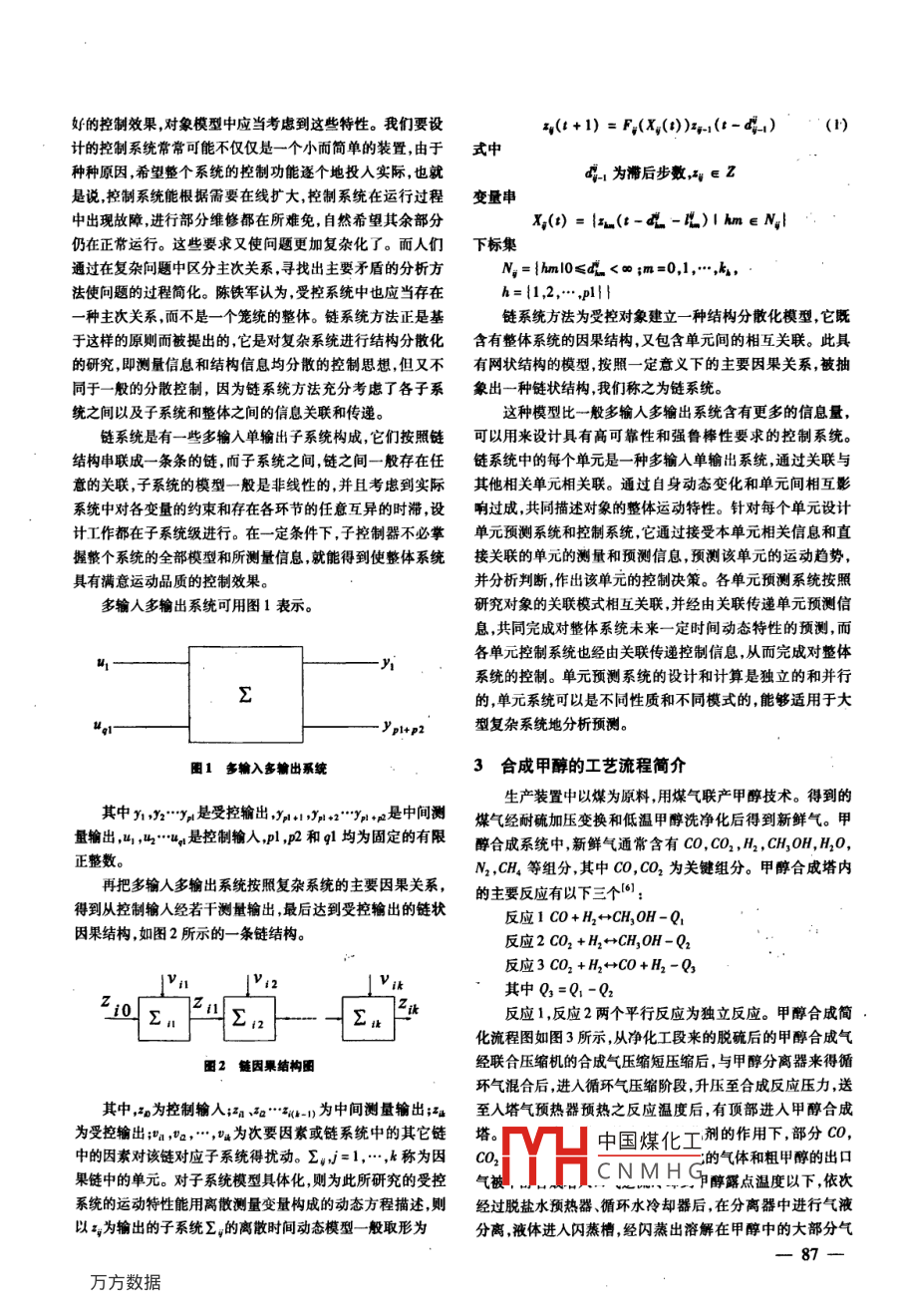第25卷第8期計(jì)算機(jī)仿真2008年8月文章編號(hào):1006-9348(2008)08-0086-04甲醇合成過(guò)程控制的算法設(shè)計(jì)沈艷河,陳鐵軍,李新瑞,姜海波(鄭州大學(xué)電氣工程學(xué)院河南鄭州450001)摘要:分析了甲醇合成機(jī)理得出以煤氣聯(lián)產(chǎn)甲醇具有系統(tǒng)滯后大動(dòng)態(tài)特性復(fù)雜且存在大千擾的特點(diǎn)為了增加甲醇產(chǎn)量和降低能耗,并提高系統(tǒng)的控制能力增強(qiáng)系統(tǒng)的靈活性和可靠性。引人鏈系統(tǒng)控制方法以甲醇合成回路經(jīng)濟(jì)效益最大單位甲醇能耗最低為控制目標(biāo)找到影響甲醇單耗和產(chǎn)量的主要因素建立有產(chǎn)量和能耗兩條主要因果鏈組成的互相關(guān)聯(lián)的鏈系統(tǒng)模型。設(shè)計(jì)了甲醇合成過(guò)程的鏈預(yù)估算法和鏈控制系統(tǒng)。仿真顯示為甲醇合成系統(tǒng)建立的鏈系統(tǒng)模型穩(wěn)定性和抗干擾能力強(qiáng),容錯(cuò)性好控制精確。有很好的應(yīng)用前景和市場(chǎng)潛力。關(guān)鍵詞:甲醇合成;鏈系統(tǒng);預(yù)估中圖分類號(hào):TP391文獻(xiàn)標(biāo)識(shí)碼:AAlgorithm Design of Process Control in Methanol SynthesisSHEN Yan-he, CHEN Tie-jun, LI Xin-rui, JIANG Hai -boSchool of Electric Engineering, Zhengzhou University, Zhengzhou Henan 450001, China)ABSTRACT: The mechanism of methanol synthesis is analyzed. It can be found that the system of methanol gas co-generation has large delay, complex dynamic characteristics and large disturbance. In order to increase methanol out-put and reduce energy consumption and improve the ability to control and enhance the flexibility and reliability, achain control algorithm is introduced. The algorithm takes the most economic benefit of synthesis circuit and the mini-num energy consumption of unit methanol as the control target, and finds out two major factors that affect the energyconsumption and output, and builds a chain system model consisting of two related chains. The paper dprediction arithmetic and the chain control system for the methanol synthesis process. The simulation demonstratesthat the chain system model has strong stability, and anti-interference, fault-tolerant ability. It has a very goodapplication prospect and the market potentialKEYWORDS: Methanol synthesis; Chain system; Prediction的合理應(yīng)用。由于甲醇合成反應(yīng)的大滯后,系統(tǒng)動(dòng)態(tài)特性復(fù)1引言雜,具有大干擾等問題,使得前述控制方法所建立的模型和甲醇合成過(guò)程的控制受到多方面的關(guān)注出現(xiàn)多種控制控制方案在實(shí)際應(yīng)用中仍未達(dá)到滿意效果。方案?;趯<医?jīng)驗(yàn)的甲醇合成塔控制方案,采用離散控制本文從產(chǎn)量和甲醇單耗兩方面綜合考慮,以經(jīng)濟(jì)和社會(huì)系統(tǒng)中的PD控制模塊實(shí)現(xiàn)常規(guī)控制采用專家經(jīng)驗(yàn)及相關(guān)綜合效益最高為控制目標(biāo)。采用鏈系統(tǒng)控制方法,分析甲醇的算法實(shí)現(xiàn)先進(jìn)的控制,使得催化劑的使用壽命有所延合成機(jī)理找出影響甲醇產(chǎn)量和能耗的主要因果關(guān)系鏈,建長(zhǎng),經(jīng)濟(jì)效益有所提高?;诜蔷€性神經(jīng)網(wǎng)絡(luò)的甲醇合成塔立一種鏈系統(tǒng)結(jié)構(gòu)模型該模型對(duì)大滯后的甲醇合成系統(tǒng)有控制方案采用非線性神經(jīng)網(wǎng)絡(luò)結(jié)構(gòu)模型,并用數(shù)學(xué)方法直很強(qiáng)的穩(wěn)定性抗干擾能力和容錯(cuò)性。模型中甲醇合成系統(tǒng)接去求解,使得模型具有很強(qiáng)的表達(dá)能力又避免了冗長(zhǎng)的訓(xùn)是由互相關(guān)聯(lián)的兩條因果鏈組成第一條鏈?zhǔn)菧囟孺湹诙氝^(guò)程。現(xiàn)在已經(jīng)有人設(shè)計(jì)并實(shí)現(xiàn)了基于遺傳算法和神條是氣流量鏈。對(duì)鏈系統(tǒng)結(jié)構(gòu)建立動(dòng)態(tài)數(shù)學(xué)模型并經(jīng)過(guò)預(yù)經(jīng)網(wǎng)絡(luò)的在線優(yōu)化軟件包,但該軟件應(yīng)用的成功與否仍然估和中國(guó)煤化工價(jià)是依賴于建立的甲醇合成過(guò)程模型的正確建立和優(yōu)化算法CNMHG基金項(xiàng)目:河南省杰出人才創(chuàng)新基金(5210010)實(shí)際系統(tǒng)的運(yùn)動(dòng)特性往往很復(fù)雜,一般都存在非線性收稿日期:2007-06-25修回日期:2007-07-18各種因素受到約束,它們之間存在互異的滯后等,為了獲得86好的控制效果對(duì)象模型中應(yīng)當(dāng)考慮到這些特性。我們要設(shè)(+1)=F(x(a)x1(t-4:)(1)計(jì)的控制系統(tǒng)常??赡懿粌H僅是一個(gè)小而簡(jiǎn)單的裝置由于式中種種原因,希望整個(gè)系統(tǒng)的控制功能逐個(gè)地投入實(shí)際,也就41為滯后步數(shù),;v∈Z是說(shuō)控制系統(tǒng)能根據(jù)需要在線擴(kuò)大,控制系統(tǒng)在運(yùn)行過(guò)程變量串中出現(xiàn)故障進(jìn)行部分維修都在所難免,自然希望其余部分X()=|z(t--)|Am∈Nl仍在正常運(yùn)行。這些要求又使問題更加復(fù)雜化了。而人們下標(biāo)集通過(guò)在復(fù)雜問題中區(qū)分主次關(guān)系,尋找出主要矛盾的分析方N=hmn|0≤<∞im=0,1,…,k法使問題的過(guò)程簡(jiǎn)化。陳鐵軍認(rèn)為,受控系統(tǒng)中也應(yīng)當(dāng)存在1,2,…,plll種主次關(guān)系,而不是一個(gè)籠統(tǒng)的整體。鏈系統(tǒng)方法正是基鏈系統(tǒng)方法為受控對(duì)象建立一種結(jié)構(gòu)分散化模型,它既于這樣的原則而被提出的,它