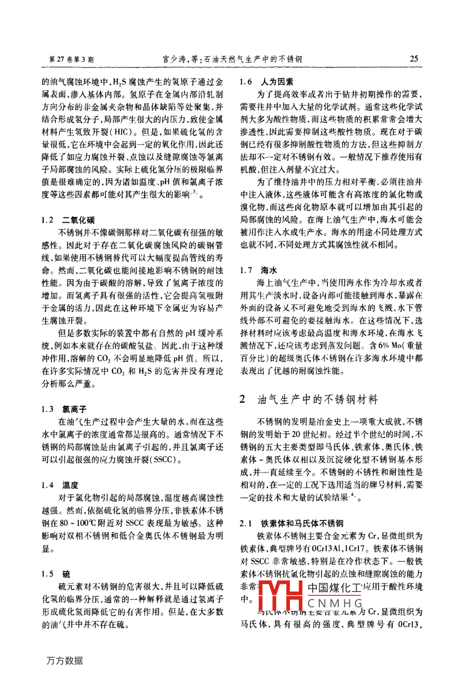 第27卷第3期天然氣與石油Vol 27. No. 32009年6月Natural Gas And oilJun.2009石油天然氣生產(chǎn)中的不銹鋼宮少濤,李為衛(wèi),張奕,王冉,馮耀榮(中國石油管材研究所石油管力學(xué)與環(huán)境行為重點(diǎn)實(shí)驗(yàn)室陜西西安710065)要:隨著石油天然氣工業(yè)的發(fā)展,耐蝕性差的碳鋼和低合金鋼材料已難以滿足生產(chǎn)需要,因此耐蝕性優(yōu)良的不銹鋼材料就成為一個油氣工業(yè)選材的研究熱點(diǎn)。闡述了油氣生產(chǎn)中硫化氫、二氧化碳、氟離子、溫度、硫、海水及人工操作這些影響腐蝕的因素,介紹了適合于油氣生產(chǎn)中使用的鐵素體不銹鋼、馬氏體不銹鋼、奧氏體不銹鋼及雙相不銹鋼。關(guān)鍵詞:石油;天然氣;腐蝕環(huán)境;不銹鋼文章編號:10065539(2009)03002403文獻(xiàn)標(biāo)識碼:A鋼的使用越來越多121。0前言另外,緩蝕劑或多或少的都對環(huán)境存在危害,從環(huán)境的角度考慮,也使不銹鋼的使用量逐步增加。油氣生產(chǎn)過程中,材料往往處于高溫高壓環(huán)境本文對油氣生產(chǎn)中的腐蝕因素和使用的不銹鋼材料和氣、水、烴、固共存的多相流腐蝕介質(zhì)中,H2S,作了介紹。CO2,O2,Cl和地層水、土壤是最主要的腐蝕介質(zhì)。腐蝕是金屬材料主要失效形式之一,石油和天然氣1油氣生產(chǎn)中影響腐蝕的因素開發(fā)與加工行業(yè)歷來是腐蝕比較嚴(yán)重的幾個行業(yè)之而且?guī)缀跎婕暗礁鞣N腐蝕類型。而未來的石油石油天然氣本身對金屬材料并沒有腐蝕性,而工業(yè)將面臨油井開采后期含水量的提高深井超深且在一定程度上,石油對腐蝕還有抑制作用,當(dāng)油膜井的開發(fā)將會導(dǎo)致溫度/壓力進(jìn)一步提高、強(qiáng)腐蝕環(huán)很厚時(shí)就可以全面的抑制腐蝕但是,當(dāng)油膜很薄并境油井的開發(fā)和注CO2驅(qū)采油技術(shù)應(yīng)用會導(dǎo)致且孤立地存在于腐蝕液中時(shí),這種抑制作用就會大CO2,H2S和C1含量上升等問題都將使石油管的大減弱。而真正會對金屬材料產(chǎn)生腐蝕風(fēng)險(xiǎn)的是石內(nèi)外腐蝕更趨嚴(yán)重。油天然氣中含有的腐蝕性雜質(zhì)(如硫化氫、氯離子、然而,目前在油氣生產(chǎn)中主要采用的是碳鋼材氧、二氧化碳等等)。料,對于這些強(qiáng)腐蝕環(huán)境,在服役多年的老井和開采腐蝕性更強(qiáng)的油氣井時(shí)常常需要使用大量的緩蝕1.1硫化氫劑。而采用碳鋼+緩蝕劑方案,會遇到許多不可預(yù)通常,依據(jù)硫化氫含量,油氣工業(yè)生產(chǎn)的液體和見的換管停產(chǎn)作業(yè)等失效風(fēng)險(xiǎn)。清管等運(yùn)行作業(yè)氣體可分為“甜性”和“酸性”兩種環(huán)境。甜性環(huán)境未考慮而且緩蝕劑的加注有效性存在不確定性,有即油氣產(chǎn)品不含硫化氫或其含量很少可忽略不計(jì)。較高風(fēng)險(xiǎn)和安全隱患。所以采用耐蝕性能優(yōu)良的不但甜性環(huán)境也可能含有大量的二氧化碳會加速碳銹鋼材料就成為腐蝕防護(hù)的主要方向之一。雖然其鋼的腐蝕酸性環(huán)境即油氣產(chǎn)品中的硫化氫含量很次性投資高但從長遠(yuǎn)的經(jīng)濟(jì)角度來看因?yàn)榫S護(hù)高。成本低重量減少(因不需要增加腐蝕余量),以及硫化氫對金屬材料的主要危害,就是在一定的使用壽命更長的特點(diǎn),采用不銹鋼材料可以為石油條件下使金屬脆化,在拉應(yīng)力的作用下導(dǎo)致材料產(chǎn)工業(yè)帶來巨大的經(jīng)濟(jì)效益。因此,油氣工業(yè)中不銹生“6mV中國煤化工。另外,在含H2S收稿日期:2009034.6CNMHG作者簡介:宮少濤(1980-),男陜西西安人,工程師,本科,現(xiàn)主要從事油氣輸送管的材料與焊接研究工作。電話(029)88726272第27卷第3期宮少濤,等:石油天然氣生產(chǎn)中的不銹鋼的油氣腐蝕環(huán)境中,H2S腐蝕產(chǎn)生的氫原子通過金1.6人為因素屬表面,滲入基體內(nèi)部。氫原子在金屬內(nèi)部沿軋制為了提高效率或者出于鉆井初期操作的需要方向分布的非金屬夾雜物和品體缺陷等處聚集,并需要往井中加入大量的化學(xué)試劑。通常這些化學(xué)試結(jié)合形成氫分子,局部產(chǎn)生很大的內(nèi)壓力,致使金屬劑大多為酸性物質(zhì),而這些物質(zhì)的積累常常會增大材料產(chǎn)生氫致開裂(HC)。但是,如果硫化的含滲透性,因此需要抑制這些酸性物質(zhì)。現(xiàn)在對于碳量很低,它在環(huán)境中會起到一定的氧化作用,因此還鋼已經(jīng)有很多抑制酸性物質(zhì)的方法,但這些抑制方降低了如應(yīng)力腐蝕開裂、點(diǎn)蝕以及縫隙腐蝕等氯離法卻不一定對不銹鋼有效。一般情況下推薦使用有子局部腐蝕的風(fēng)險(xiǎn)。實(shí)際上硫化氫分壓的極限臨界機(jī)酸,但注入劑量不宜過大值是很難確定的,因?yàn)橹T如溫度、pH值和氯離子濃為了維持油井中的壓力相對平衡,必須往油井度等這些因素都可能對其產(chǎn)生很大的影響3。中注入液體,這些液體可能含有高濃度的氯化物或溴化物,而這些鹵化物原本就可以增加由其引起的1.2二氧化碳局部腐蝕的風(fēng)險(xiǎn)。在海上油氣生產(chǎn)中,海水可能會不銹鋼并不像碳鋼那樣對二氧化碳有很強(qiáng)的敏被用作注入水或生產(chǎn)水。海水的用途不同處理方式感性。因此對于存在二氧化碳腐蝕風(fēng)險(xiǎn)的碳鋼管也就不同,不同處理方式其腐蝕性就不相同