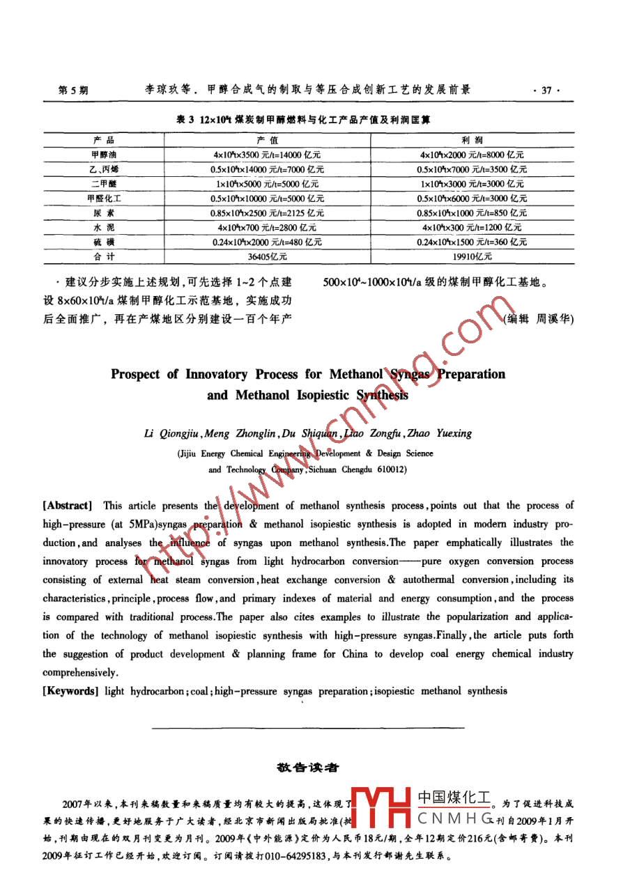 中外能源第5期SINO-GLOBAL ENERGY甲醇合成氣的制取與等壓合成創(chuàng)新工藝的發(fā)展前景李瓊玖,孟仲林,杜世權(quán),廖宗富,趙月興基玖能源化工工程開發(fā)設(shè)計(jì)科技公司,四川成都610012)摘要介紹了甲醇合成工藝的進(jìn)展,指出現(xiàn)代T業(yè)生產(chǎn)采用壓力為5MPa的高壓造氣等壓合成甲醇工藝,分析了合成氣對甲醇合成的影響。重點(diǎn)闡述了輕烴轉(zhuǎn)化制甲醇合成氣的創(chuàng)新工藝一三一段(即外熱蒸汽轉(zhuǎn)化、換熱轉(zhuǎn)化和自熱轉(zhuǎn)化)純氧轉(zhuǎn)化工藝的特點(diǎn)、原理、工藝流程及主要物耗能耗指標(biāo),并與傳統(tǒng)工藝進(jìn)行了對比。舉例說明了高壓合成氣等壓合成甲醇技術(shù)的推廣應(yīng)用。最后對我國煤炭能源化工綜合發(fā)展的產(chǎn)品開發(fā)和規(guī)劃框架提出了建議。關(guān)鍵詞輕烴煤炭高壓造氣等壓合成甲醇1前言積縮小的反應(yīng)。因此增加壓力、降低反應(yīng)溫度均有甲醇是重要的有機(jī)化工原料,是碳一化學(xué)、有利于提高甲醇的平衡轉(zhuǎn)化率。根據(jù)理論計(jì)算,當(dāng)氣機(jī)化工及精細(xì)化工的基礎(chǔ)原料,又是優(yōu)良的能源載體組成為CO+25H2,溫度為250℃,壓力從5MPa增體。發(fā)達(dá)國家甲醇產(chǎn)量僅次于乙烯、丙烯和苯,居第加至100MPa時(shí),其轉(zhuǎn)化率能提高10%;而當(dāng)壓力在四位。我國隨著煤炭替代石油轉(zhuǎn)化制甲醇工藝的發(fā)5MPa,溫度從350℃降低到250℃時(shí),其轉(zhuǎn)化率可從展,甲醇產(chǎn)量將躍為第一位15%提高到68%。由此可見,降低溫度對轉(zhuǎn)化率的甲醇分子結(jié)構(gòu)具有氧化、重排、聚合的有機(jī)反影響較增加壓力更為顯著,所以甲醇合成催化劑發(fā)應(yīng)特性,它可廣泛用于生產(chǎn)塑料、合成纖維、合成橡展成低溫、低壓高活性銅系催化劑?,F(xiàn)代工業(yè)生產(chǎn)膠、染料、涂料、香料、醫(yī)藥和農(nóng)藥等。甲醇還是一種廣泛采用轉(zhuǎn)化溫度為250℃,壓力為MPa的甲醇重要的有機(jī)溶劑。甲醇的主要衍生物有:甲醛、醋合成工藝,在高壓造氣下等壓合成甲醇,可不用合酸、甲胺類、氯甲烷類、對苯二甲酸二甲酯、甲基丙成氣壓縮機(jī)。烯酸甲酯、合成燃料(MTBE)等。這些產(chǎn)品又可形成從表1可看出,采用銅系催化劑的工藝合成條各自的系列產(chǎn)品。今后隨著石油開采量的日漸減件溫和、能耗低、合成率高、副反應(yīng)少,粗甲醇中的少,甲醇汽油將會(huì)發(fā)展成為需求量最大的替代燃雜質(zhì)含量低,易于精餾得到AA級精甲醇。但銅催料,特別在我國,用煤炭替代石油、天然氣轉(zhuǎn)化制甲化劑對原料氣中硫化物和氯離子的凈化要求高,必醇汽油的消耗量將很大。須控制在0.06-0.1ygg,否則會(huì)使催化劑中毒,縮2甲醇合成工藝與合成氣優(yōu)化短催化劑壽命。21甲醇合成工藝表1兩種催化劑的甲醇合成操作條件對比目前甲醇合成工業(yè)生產(chǎn)幾乎都采用CO、CO2H2加壓催化法。隨著合成工藝技術(shù)的不斷進(jìn)步,現(xiàn)催化劑|反應(yīng)溫合成壓出塔甲醇副產(chǎn)物含量AgB度汽力MP含量%甲酸甲酯三甲醚高級醇在甲醇合成巳從鋅鉻催化劑的高溫、高壓催化發(fā)展鉻系35042030351030023成銅系催化劑的低溫、低壓的復(fù)合氣體固相催化反銅系230-29應(yīng)過程。其化學(xué)反應(yīng)式::H中國煤化工究員,1950年畢業(yè)于C0+2H,,OH+90.67kJ/molCNMH兔飛設(shè)、生產(chǎn)工程技米工C02+3H,CH3OH+H0+49.52kJ/mol作,主編《合成氯與磯一化學(xué))、《醇醚燃料與化工產(chǎn)品雙鰱工程技在COCO2加H2合成甲醇時(shí),為可逆、放熱、體術(shù))專著,發(fā)表論文百多篇。E- mail hongxingcancan@sina,cwn中外能源SINO-GLOBAL ENERGY2008年第13卷22甲醇合成氣優(yōu)化性氣體的角色,所以后期弛放氣量較大合成甲醇的原料氣中,主要含有CO、H2、CO2以②CO2含量對甲醇合成的影響及少量的N2、Ar、CH等惰性氣體。合成氣成分對甲控制適當(dāng)?shù)腃O2含量有以下好處:①有利于提醇合成的影響很大。高甲醇的產(chǎn)率;②可減緩CO與H2合成甲醇的劇烈221氫碳比對甲醇合成的影響反應(yīng),有利于穩(wěn)定床層溫度,保護(hù)催化劑活性;③由甲醇合成采用銅基催化劑,在壓力50MPa、溫于有水的生成,可抑制二甲醚的生成;④有利于防度220-270℃的反應(yīng)條件下,由CO、CO2與H2反應(yīng)止結(jié)蠟。生成粗甲醇,同時(shí)也生成烴類、酮類、醚類、醇類等據(jù)有關(guān)資料介紹,氧化銅還原后,催化劑存在副產(chǎn)物?;钚灾行?活性中心為一價(jià)銅離子與ZnO形成的固新鮮氣的氫碳比,用(H2-CO2)/(CO+CO2)(物質(zhì)的熔體。CO2等弱氧化性物質(zhì)的存在有助于形成一價(jià)量比,下同)表示,代表了CO、CO2H2等有效成分含銅和反應(yīng)的穩(wěn)定,單純的CO加H2反應(yīng)會(huì)使活性中量的比值,一般該值控制在2.05-215。氫碳比控制心一價(jià)銅向零價(jià)銅轉(zhuǎn)變,從而使催化劑活性下降。過低,容易使副反應(yīng)增加,加速催化劑活性的衰退但CO2含量過高,會(huì)出現(xiàn)熱燒結(jié)現(xiàn)象。水分壓越高還將引起積炭;氫碳比偏高,則將造成H2積累,惰則催化劑活性越低,因而活性會(huì)過早衰退。另外,性氣的含量增加,導(dǎo)致弛放氣量增加,消耗增加CO2含量過高,粗甲醇中的甲醇含量就偏低,使得實(shí)際生產(chǎn)中,人