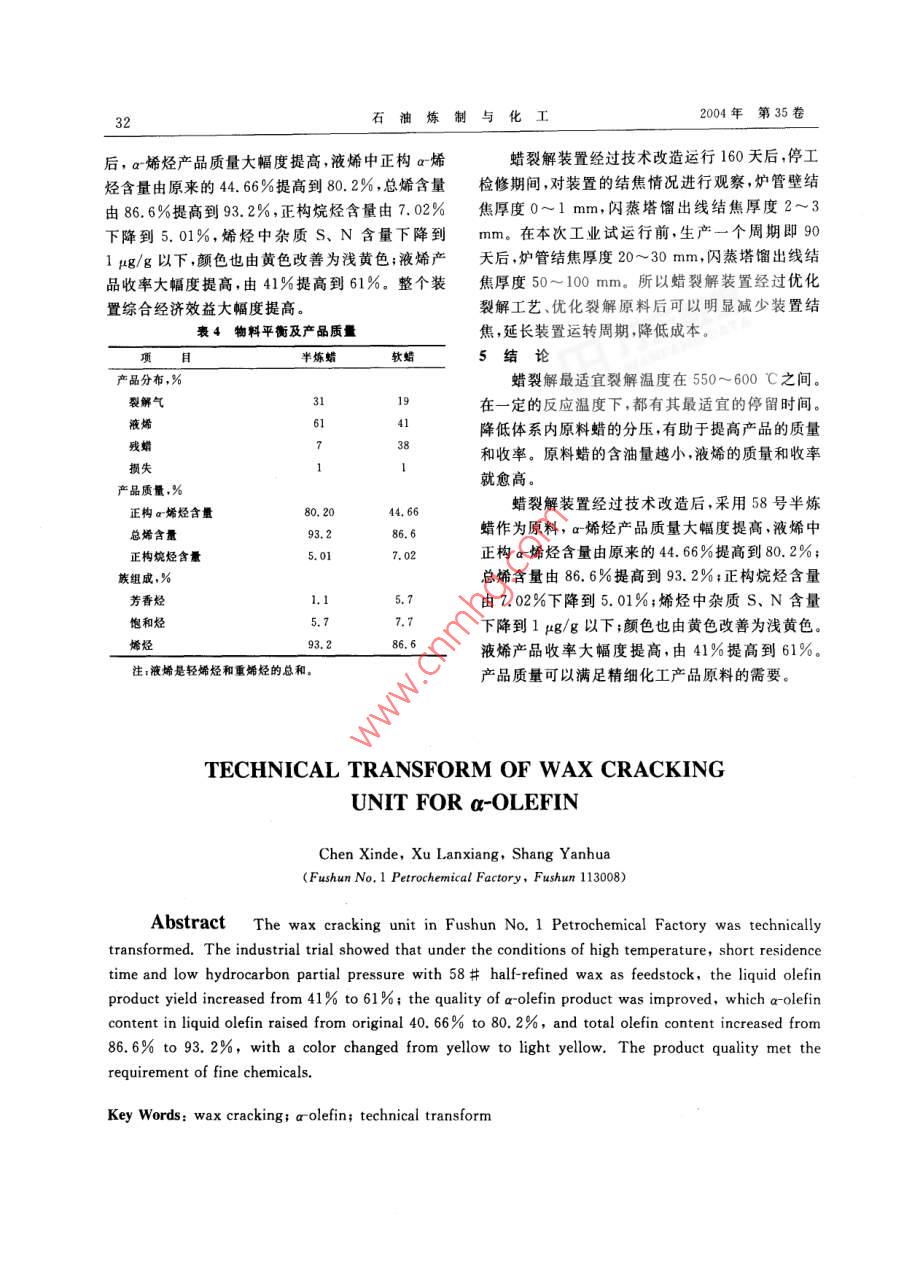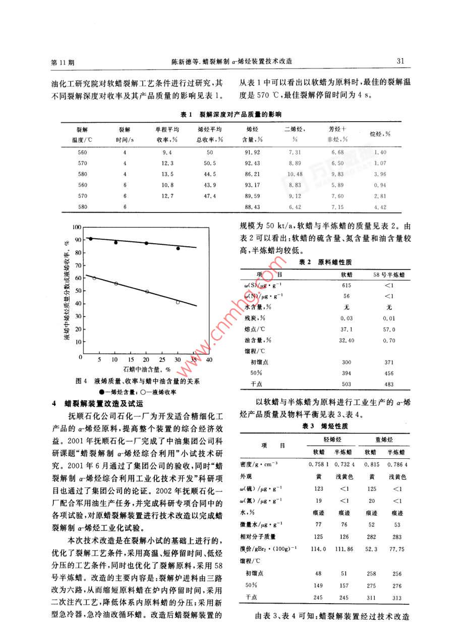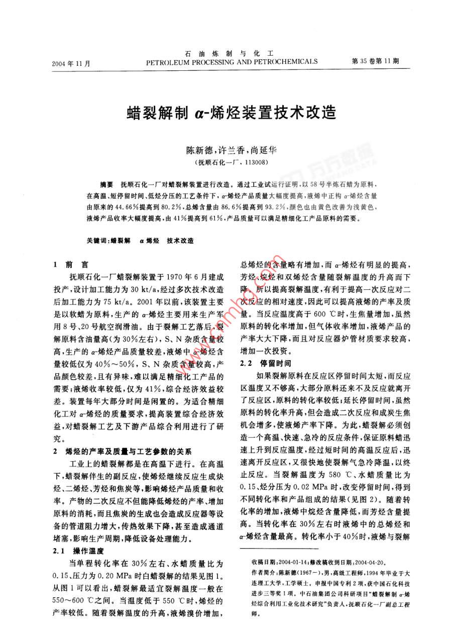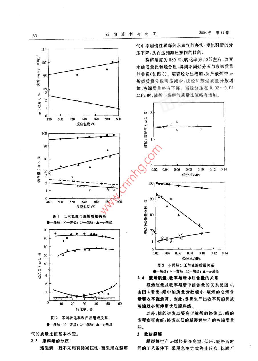 石油煉制與化工2004年11月PETROLEUM PROCESSING AND PETROCHEMICALS第35卷第11期蠟裂解制a-烯烴裝置技術(shù)改造陳新德,許蘭香,尚延華(撫順石化-廠。1130080)摘要撫順石化一廠對蠟裂解裝置進(jìn)行改造。通過工業(yè)試運(yùn)行證明,以58號(hào)半煉石蠟為原料,在高溫、短停留時(shí)間、低烴分壓的工藝條件下,o烯烴產(chǎn)品質(zhì)量大幅度提商,液烯中正構(gòu)a烯烴含量由原來的44. 66%提高到80.2% .總烯含量由86. 6%提高到93. 2% ,顏色也由黃色改善為淺黃色,液烯產(chǎn)品收率大幅度提高,由41%提高到61%,產(chǎn)品質(zhì)量可以滿足精細(xì)化工產(chǎn)品原料的需要。關(guān)鍵詞:蠟裂解a烯烴 技術(shù)改造1前言總烯烴的含量略有增加,而a烯烴有明顯的提高,撫順石化一廠蠟裂解裝置于1970年6月建成芳烴、烷烴和雙烯烴含量隨裂解溫度的升高而下投產(chǎn),設(shè)計(jì)加工能力為30 kt/a,經(jīng)過多次技術(shù)改造降。所以提高裂解溫度,有利于提高一次反應(yīng)對二后加工能力為75 kt/a. 2001 年以前,該裝置主要次反應(yīng)的相對速度,因此可以提高液烯的產(chǎn)率及質(zhì)是以軟蠟為原料,生產(chǎn)的a烯烴主要用來生產(chǎn)軍量。當(dāng)反應(yīng)溫度高于600 C時(shí),生焦量增加,雖然用8號(hào)、20號(hào)航空潤滑油。由于裂解工藝落后,裂原料的轉(zhuǎn)化率增加,但氣體收率增加,液烯產(chǎn)品的解原料含油量高(為30%左右), S、N雜質(zhì)含量較產(chǎn)率大大下降,而且對反應(yīng)器爐管材質(zhì)要求較高,高,生產(chǎn)的a-烯烴產(chǎn)品質(zhì)量較差,液烯中a烯烴含增加一次投資。量較低僅為40%~50%,S. N雜質(zhì)含量較高,產(chǎn)2.2停留時(shí)間.品顏色較差,且有異味,難以滿足精細(xì)化工產(chǎn)品的如果裂解原料在反應(yīng)區(qū)停留時(shí)間太短,而反應(yīng)需要;液烯收率較低,僅為41%,綜合經(jīng)濟(jì)效益較區(qū)溫度又不夠高,大部分原料還來不及反應(yīng)就離開差。裝置每年大部分時(shí)間是閑置的。為適合精細(xì)了反應(yīng)區(qū),原料的轉(zhuǎn)化率較低;延長停留時(shí)間,雖然化工對a烯烴的質(zhì)量要求,提高裝置綜合經(jīng)濟(jì)效原料的轉(zhuǎn)化率升高,但會(huì)造成二次反應(yīng)和成炭生焦益,對蠟裂解工藝及下游產(chǎn)品綜合利用進(jìn)行了研機(jī)會(huì)增多,使液烯產(chǎn)率下降。為此,蠟裂解必須創(chuàng)究。造一個(gè)高溫、快速、急冷的反應(yīng)條件,保證原料蠟迅2烯烴的產(chǎn)率及質(zhì)與工藝參數(shù)的關(guān)系速上升到反應(yīng)溫度,經(jīng)過短時(shí)間的高溫反應(yīng)后,迅工業(yè)上的蠟裂解都是在高溫下進(jìn)行。在高溫速離開反應(yīng)區(qū),又很快地使裂解氣急冷降溫,以終下,蠟裂解伴生的副反應(yīng),使烯烴繼續(xù)反應(yīng)生成炔止反應(yīng)。當(dāng)裂解溫度為580 C、水蠟質(zhì)量比為烴、二烯烴、芳烴和焦炭等,影響烯烴產(chǎn)品質(zhì)量和收0.15烴分壓為0.02MPa時(shí),改變停留時(shí)間,得到率。產(chǎn)物的二次反應(yīng)不但能降低烯烴的產(chǎn)率、增加不同轉(zhuǎn)化率和產(chǎn)品組成的結(jié)果(見圖2)。隨著轉(zhuǎn)原料的消耗,而且焦炭的生成也會(huì)造成反應(yīng)器等設(shè)化率的增加,液烯中烷烴含量降低,而芳烴含量提備的管道阻力增大,傳熱效果下降,甚至造成通道高。當(dāng)轉(zhuǎn)化率在30%左右時(shí)液烯中的總烯烴和堵塞,影響生產(chǎn)周期,降低設(shè)備處理能力。a烯烴含量最高。轉(zhuǎn)化率小于40%時(shí),液烯與裂解2.1操作溫度當(dāng)單程轉(zhuǎn)化率在30%左右、水蠟質(zhì)量比為收稿日期200-01-14:修改稿收到日期2004-04-20。0. 15、壓力為0. 20 MPa時(shí)白蠟裂解的結(jié)果見圖1。作者簡介:陳新德(1967-).男,高級(jí)工程師,1994年畢業(yè)于大從圖1可以看出,蠟裂解最適宜裂解溫度一般在連理工大學(xué),工學(xué)碩士。申報(bào)中國專利2項(xiàng),獲中國石化科技550~600 C之間。當(dāng)溫度低于550 C時(shí),烯烴的進(jìn)步三等獎(jiǎng)1項(xiàng)。中石油集團(tuán)公司科研項(xiàng)目“蠟裂解制o烯烴綜合利用工業(yè)化技術(shù)研究"負(fù)責(zé)入,撫順石化一廠副總工程產(chǎn)率較低。隨著裂解溫度的升高,液烯溴價(jià)增加,幣。2004年第35卷3(石油煉制與化工氣中添加惰性稀釋劑水蒸氣的辦法,使原料蠟的分壓下降,從而達(dá)到減壓操作的目的。裂解溫度為580 C、轉(zhuǎn)化率為30%左右、改變105 t水蠟質(zhì)量比和烴分壓,得到不同烴分壓與液烯質(zhì)量的關(guān)系(如圖3)。隨著烴分壓增加,所產(chǎn)液烯中ar)5 F烯烴質(zhì)量分?jǐn)?shù)明顯減少,烷烴和芳烴質(zhì)量分?jǐn)?shù)增加,液烯質(zhì)量略有下降。當(dāng)烴分壓在0. 02~0.0485MPa時(shí),液烯與裂解氣質(zhì)量比值略有增加。480 500520540560580 600反應(yīng)溫度/心C00 r90 F0.02 0.04 0.06 0.08 0.10 0.12 0.14烴分樂/MPa00pr80 500 520540560580 60。90-反應(yīng)溫度心C圖1反應(yīng)溫度與液烯質(zhì)量關(guān)系新80●-烯烴; X-芳烴:O-烷烴:▲-a烯烴90 t80 t烴分壓/MPa圖3不同烴分壓 與液烯質(zhì)量關(guān)系●姍烴;X-芳烴;O-烷烴;▲-r烯烴2.4液烯質(zhì)量、收率與蠟中油含的關(guān)系液烯質(zhì)量及收率與蠟中油含量的關(guān)系見圖4.由圖4看出,蠟中油質(zhì)量分?jǐn)?shù)越小,液烯的總烯含量和收率就愈高。因此,要