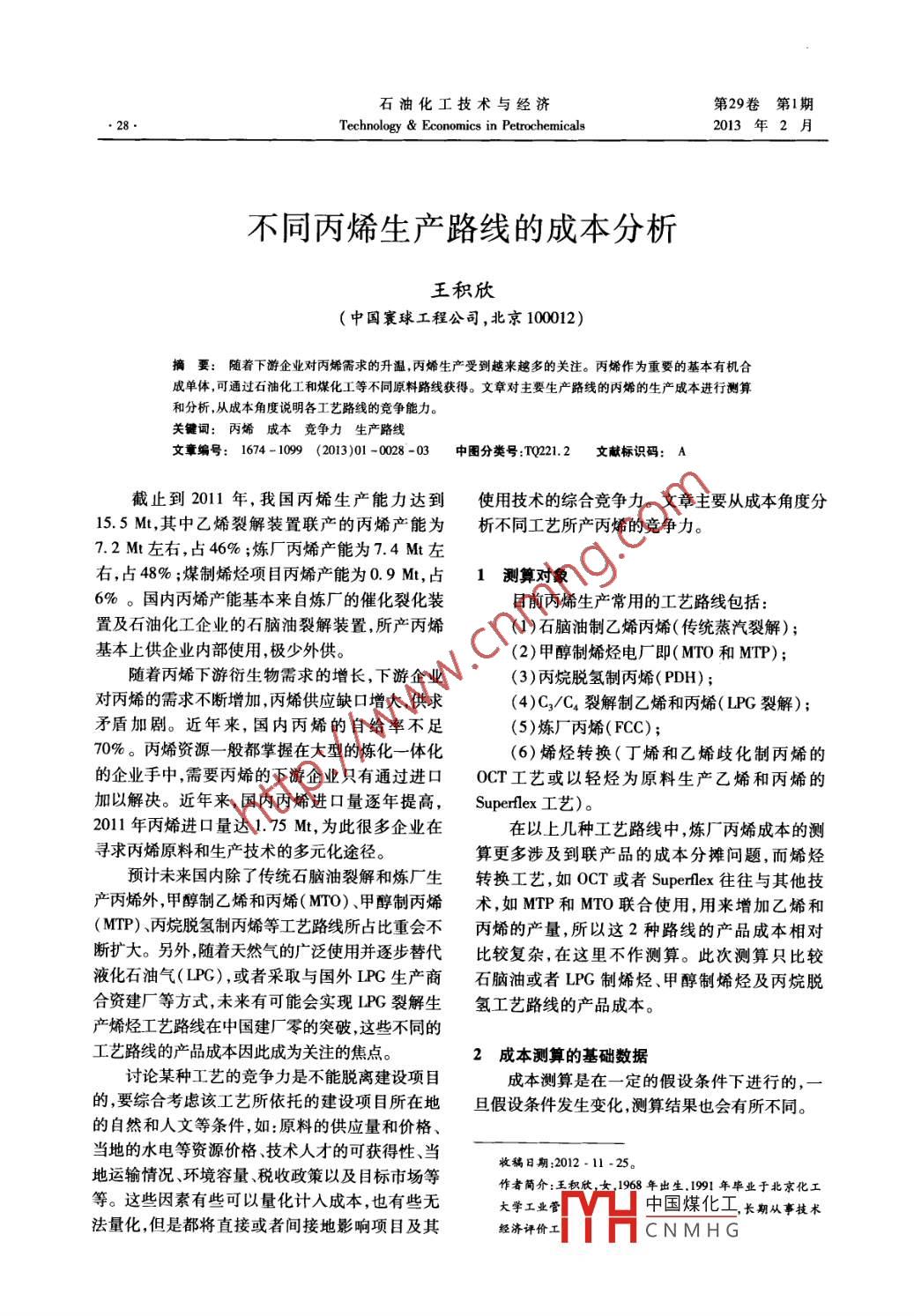 石油化工技術(shù)與經(jīng)濟第29卷第1期Technology Economics in Petrochemicals013年2月不同丙烯生產(chǎn)路線的成本分析王積欣(中國寰球工程公司,北京100012)摘要:隨著下游企業(yè)對丙烯需求的升溫丙烯生產(chǎn)受到越來越多的關(guān)注。丙烯作為重要的基本有機合成單體,可通過石油化工和煤化工等不同原料路線獲得。文章對主要生產(chǎn)路線的丙烯的生產(chǎn)成本進行測算和分析,從成本角度說明各工藝路線的競爭能力。關(guān)鍵詞:丙烯成本競爭力生產(chǎn)路線文章編號:1674-1099(2013)01-0028-03中圖分類號:TQ221.2文獻標(biāo)識碼:A截止到2011年,我國丙烯生產(chǎn)能力達到使用技術(shù)的綜合競爭力。文章主要從成本角度分5.5Mt,其中乙烯裂解裝置聯(lián)產(chǎn)的丙烯產(chǎn)能為析不同工藝所產(chǎn)丙烯的競爭力。7.2Mt左右,占46%;煉廠丙烯產(chǎn)能為7.4Mt左右,占48%;煤制烯烴項目丙烯產(chǎn)能為0.9Mt,占1測算對象6%。國內(nèi)丙烯產(chǎn)能基本來自煉廠的催化裂化裝目前丙烯生產(chǎn)常用的工藝路線包括:置及石油化工企業(yè)的石腦油裂解裝置,所產(chǎn)丙烯(1)石腦油制乙烯丙烯(傳統(tǒng)蒸汽裂解);基本上供企業(yè)內(nèi)部使用,極少外供。(2)甲醇制烯烴電廠即(MTO和MTP);隨著丙烯下游衍生物需求的增長,下游企業(yè)(3)丙烷脫氫制丙烯(PDH);對丙烯的需求不斷增加,丙烯供應(yīng)缺口增大,供求(4)C3C4裂解制乙烯和丙烯(LPG裂解);矛盾加劇。近年來,國內(nèi)丙烯的自給率不足(5)煉廠丙烯(FCC);70%。丙烯資源一般都掌握在大型的煉化一體化(6)烯烴轉(zhuǎn)換(丁烯和乙烯歧化制丙烯的的企業(yè)手中,需要丙烯的下游企業(yè)只有通過進口OCT工藝或以輕烴為原料生產(chǎn)乙烯和丙烯的加以解決。近年來,國內(nèi)丙烯進口量逐年提高, Superflex工藝)。201l年丙烯進口量達1.75Mt,為此很多企業(yè)在在以上幾種工藝路線中,煉廠丙烯成本的測尋求丙烯原料和生產(chǎn)技術(shù)的多元化途徑算更多涉及到聯(lián)產(chǎn)品的成本分?jǐn)倖栴},而烯烴預(yù)計未來國內(nèi)除了傳統(tǒng)石腦油裂解和煉廠生轉(zhuǎn)換工藝,如OCT或者 Superflex往往與其他技產(chǎn)丙烯外,甲醇制乙烯和丙烯(MTO)、甲醇制丙烯術(shù),如MTP和MTO聯(lián)合使用,用來增加乙烯和(MTP)、丙烷脫氫制丙烯等工藝路線所占比重會不丙烯的產(chǎn)量,所以這2種路線的產(chǎn)品成本相對斷擴大。另外,隨著天然氣的廣泛使用并逐步替代比較復(fù)雜,在這里不作測算。此次測算只比較液化石油氣(LPG),或者采取與國外IPG生產(chǎn)商石腦油或者LPG制烯烴、甲醇制烯烴及丙烷脫合資建廠等方式,未來有可能會實現(xiàn)IPG裂解生氫工藝路線的產(chǎn)品成本。產(chǎn)烯烴工藝路線在中國建廠零的突破,這些不同的工藝路線的產(chǎn)品成本因此成為關(guān)注的焦點。2成本測算的基礎(chǔ)數(shù)據(jù)討論某種工藝的競爭力是不能脫離建設(shè)項目成本測算是在一定的假設(shè)條件下進行的,的,要綜合考慮該工藝所依托的建設(shè)項目所在地旦假設(shè)條件發(fā)生變化,測算結(jié)果也會有所不同。的自然和人文等條件,如:原料的供應(yīng)量和價格當(dāng)?shù)氐乃姷荣Y源價格技術(shù)人才的可獲得性、當(dāng)收稿日期:2012-11-25地運輸情況、環(huán)境容量、稅收政策以及目標(biāo)市場等作者簡介:王積欣,女1968年出生,1991年畢業(yè)于北京化工等。這些因素有些可以量化計入成本,也有些無大學(xué)工業(yè)管中國煤化工長期從事技術(shù)法量化,但是都將直接或者間接地影響項目及其經(jīng)濟評價工CNMHG第1期(2013)王積欣.不同丙烯生產(chǎn)路線的成本分析2.1測算范圍及口徑近年國內(nèi)甲醇的產(chǎn)能、產(chǎn)量、進口量和開工率考慮到乙烯和丙烯一般都是作為企業(yè)內(nèi)部的情況見圖2。中間產(chǎn)品,而不是作為最終產(chǎn)品直接出售,因此這里測算的乙烯和丙烯成本是指生產(chǎn)成本。具體成本要素包括:原材料、化學(xué)品、輔助材料、副產(chǎn)品扣050530除、燃料及公用工程、人工福利、折舊費、維修費及這25其他制造費用等。一般來說影響成本的主要因素是原材料和投資,這也是此次測算關(guān)注的重點,而其他因素,如人050500員工資、水電價格等影響較小,各工藝路線按同樣20072008200920102011年份數(shù)額考慮,測算口徑以單位丙烯+乙烯計。四產(chǎn)能:口產(chǎn)量,四進口量:一開工率2.2原料價格圖2近年甲醇產(chǎn)能、產(chǎn)量、進口量及開工率變化各種工藝路線所用的原料各不相同(具體見表1),保證原料價格在同一水平上測算是關(guān)鍵所在。從圖2可以看出:目前國內(nèi)甲醇裝置開工率不高,近3~4年不足50%。這些年甲醇已由供表1各種工藝路線的主要原料給不足過渡到供求平衡,目前產(chǎn)能過剩,而進口量工藝路線主要原料卻逐年提高。進口甲醇基本上以天然氣為原料,石腦油裂解石腦油原料價格較低,其生產(chǎn)成本也就比較低,對國內(nèi)甲丙烷脫氫丙烷醇市場造成很大沖擊。國內(nèi)甲醇價格越來越受到甲醇制烯烴甲醇進口甲醇價格的影響,可以認(rèn)為國內(nèi)甲醇價格是LPG裂解丙烷、丁烷、石腦油由進口價格決定的。隨著國際原油價格的一路走各種工藝路線的原料集中在石腦油、甲醇、丙高,煤的價格趨勢逐漸與原油價格趨勢相一致。烷、丁烷上,