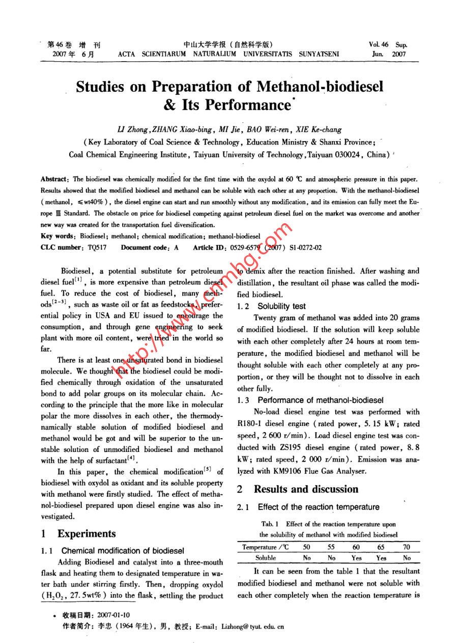 第46卷增刊中山大學(xué)學(xué)報(bào)( 自然科學(xué)版)Vol 46 Sup.2007年6月ACTA SCIENTIARUM NATURALIUM UNIVERSITATIS SUNY ATSENIJun. 2007Studies on Preparation of Methanol-biodiesel& Its PerformanceL Zhong , ZHANG Xiao-bing, MI Jie, BAO Wei-ren, XIE Ke-chang( Key Laboratory of Coal Science & Technology , Education Ministry & Shanxi Province;Coal Chemical Engineering Institute , Taiyuan University of Technology,Taiyuan 030024, China) 'Results showed that the modified biodiesel and methanol can be soluble with each other at any proportion. w ith the methanol-biodiesel( methanol,≤w140% ), the diesel engine can start and run smoothly without any modifcation, and its emission can flly meet the Eu-rope皿Standard. The obstacle on price for biodiesel competing against petroleum diesel fuel on the market was overcome and anothernew way was created for the transportation fuel diversification.Key words; Biodiesel; methanol; chemical mdification; methanl-idieselCLC number: TQ517Document code: A Article ID: 0529-6579 (2007) S1-0272-02Biodiesel, a potential substitute for petroleum to demix after the reaction finished. After washing anddiesel fuel'1 , is more expensive than petroleum dieseldistiltion, the resultant oil phase was called the modi-fuel. To reduce the cost of biodiesel, many meth- fied biodiesel.odsl2-31 , such as waste oil or fat as festocks, prefer 1.2 Solbility testential policy in USA and EU issued to encourage theTwenty gram of methanol was added into 20 gramsconsumption,and through gene engineering to seekof modified biodiesel. If the solution will keep solubleplant with more oil content, were tried in the world sowith each other completely after 24 hours at room tem-faperature, the modified biodiesel and methanol will beThere is at least one unsaturated bond in biodieselthought soluble with each other completely at any pro-molecule. We thought that the biodiesel could be modi-fied chemically through oxidation of the unsaturatedportion, or they will be thought not to dissolve in eachbond to add polar groups on its molecular chain. Ac-other fully.1.3 Performance of methanol-biodieselcording to the principle that the more like in molecularNo-load diesel engine test was performed withpolar the more dissolves in each other, the thermody-namically stable solution of modified biodiesel andR180-1 diesel engine (rated power, 5. 15 kW; ratedmethanol would be got and will be superior to the un-speed, 2 600 r/ min). Load diesel engine test was con-stable solution of unmodified biodiesel and methanolducted with ZS195 diesel engine ( rated power, 8. 8with the help of surfactant4].kW; rated speed, 2 000 r/min). Emission was ana-In this paper, the chemical modificationof lyzed with KM9106 Flue Gas Analyser.biodiesel with oxydol as oxidant and its soluble property2 Results and discussionwith methanol were firstly studied. The effect of metha-nol-biodiesel prepared upon diesel engine was also in- 2. 1 Effect of the reaction temperaturevestigated.Tab.1 Effect of the reaction temperature upon1 Experimentsthe solubility of methanol with modifed biodieselTemperature/ 50560 6:701.1 Chemical modification of biodieselSolubleNioNoAdding Biodiesel and catalyst into a three -mouthflask and heating them to designated temperature in wa-It can be seen from the table 1 that the resultantter bath under sirring frstly. Then, dropping oxydol modifed biodiesel and methanol were not soluble with(H2O2, 27. 5wt% ) into the flask, stling the producteach other completely when the reaction temperature is收稿日期: 2007-01-10作者簡介:李忠(1964 年生),男,教授; E-mail: Lizhong@ tyut. edu. cn增刊李忠等: 甲醇生物柴油的合成和性能研究273higher than 65 Cor lower than 60 C. This is becauseunderstood becquse of the heating value of the metha-of the reaction rate is slower when the temperature is. nol-biodiesel is only about 70% of petroleum diesel fu-lower and the reactants can not react completely in theel. However, the emission of methanol-biodiesel candesignated time, or the oxydol is decomposed when the easily meet the Europe I Standard but the petroleumtemperature is higher and there is not enough oxydol in-diesel fuel cant at the same work condition.cluded in the reaction. So, the appropriate reaction3,Conclusionstemperature should be 60 C。2.2 Effect of the quantity of oxydolThe resultant biodiesel modified by oxydol at 60CAccording to computation, the mole ratio of and atmospheric pressure was able to form stable solu-oxydol/biodiesel is 1: 1 when weight ratio of oxydolVtion with methanol at any proportion.biodiesel is 60% , it means that the quantity of oxydolWith the methanol-biodiesel ( methanol, ≤must equal or exceed 60wt% in order to ensure all thew40%), the diesel engine can start and run smoothlybiodiesel can be oxidized. Table 2 shows that methanolwithout any modification. Its emission was superiorand modified biodiesel were soluble with each other though dynamic performance was inferior to petroleumcompletely when oxydol added less than 60wt%. Thisdiesel fuel.is because the oxidized part of the biodiesel can act as asolubilizer. So the most economical quantity of oxydolReferences :is 28wt% according to the data in table 2.[1] CERPEN JON VAN. Biodiesel processing and produc-Table 2 Effect of quantity of the oxydol upon thetion [J]. Fuel Processing Technology, 2005, 86: 1097- 1107.solubility of methanol to modified biodieselH20/wt% 6_5(403028264 [2] FELIZARDO PEDRO, CORREIA M J0ANA NEIVA,RAPOSO IDALINA, et al. Production of biodiesel.fromSolubleYes Yes Yes_ Yes YesVo Nowaste frying oils [J]. Waste Management, 2006, 26:487 -494.2.3 Performance of methanol-biodiesel[3] JIA Hu-sen, XU Yi-nong. World biodiesel uilizationThe no-load test results showed that the diesel en-and development strategies in China [ J ]. Jourmal ofgine started very hard and was not able to run smoothlyPlant Ecology, 2006, 30 (2): 221 - 230. (in Chi-when the methanol in methanol-biodiesel e