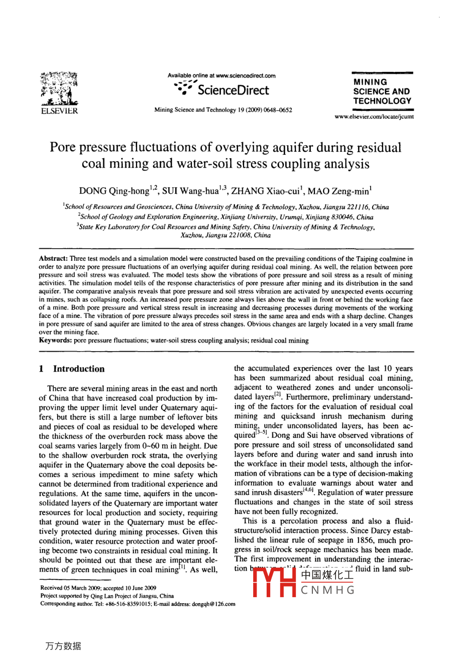 onlineatwww.sclencedirect.comMININGScienceDirectSCIENCE ANDTECHNOLOGYELLSEVIERMining Science and Technology 19(2009)0648-0652www.elsevier.com/locate/jcumtPore pressure fluctuations of overlying aquifer during residualcoal mining and water-soil stress coupling analysisDONG Qing-hong"2, SUI Wang-hua", ZHANG Xiao-cui, MAO Zeng-min'aschool of Geology and Exploration Engineering, Xinjiang Universiry, Urumgi, Xinjiang 830046. Chinachool of Resources and Geosciences, China University of Mining Technology, Xuzhou, Jiangsu 221116, ChinaState Key Laboratory for Coal Resources and Mining Safety, China University of Mining Technology,Xuzhou, Jiangsu 221008, ChinaAbstract: Three test models and a simulation model were constructed based on the prevailing conditions of the Taiping coalmine inrder to analyze pore pressure fluctuations of an overlying aquifer during residual coal mining. As well, the relation between poreressure and soil stress was evaluated. The model tests show the vibrations of pore pressure and soil stress as a result of minictivities. The simulation model tells of the response characteristics of pore pressure after mining and its distribution in the sandquifer. The comparative analysis reveals that pore pressure and soil stress vibration are activated by unexpected events occurringin mines, such as collapsing roofs. An increased pore pressure zone always lies above the wall in front or behind the working faceof a mine. Both pore pressure and vertical stress result in increasing and decreasing processes during movements of the workingace of a mine. The vibration of pore pressure always precedes soil stress in the same area and ends with a sharp decline. Changespore pressure of sand aquifer are limited to the area of stress changes, Obvious changes are largely located in a very small framever the mining face.Keywords: pore pressure fluctuations; water-soil stress coupling analysis; residual coal mining1 Introductionthe accumulated experiences over the last 10 yearshas been summarized about residual coal mining,There are several mining areas in the east and northdjacent to weathered zones and under unconsoli-of China that have increased coal production by im- dated layers". Furthermore, preliminary understandproving the upper limit level under Quaternary aqui- ing of the factors for the evaluation of residual coalfers, but there is still a large number of leftover bits mining and quicksand inrush mechanism duringand pieces of coal as residual to be developed where mining, under unconsolidated layers, has been ac-the thickness of the overburden rock mass above the quired. Dong and Sui have observed vibrations ofcoal seams varies largely from 0-60 m in height. Due pore pressure and soil stress of unconsolidated sandto the shallow overburden rock strata, the overlying layers before and during water and sand inrush intoaquifer in the Quaternary above the coal deposits be- the workface in their model tests, although the inforcomes a serious impediment to mine safety which mation of vibrations can be a type of decision-makingcannot be determined from traditional experience andinformation to evaluateregulations. At the same time, aquifers in the uncon- sand inrush disasters". Regulation of water pressuresolidated layers of the Quatermary are important water fluctuations and changes in the state of soil stressresources for local production and society, requiringhave not been fully recognized.that ground water in the Quaternary must be effec.This is a percolation process and also a fluidtively protected during mining processes. Given this structure/solid interaction process. Since Darcy estab-condition, water resource protection and water proof- lished the linear rule of seepage in 1856, much pro-ng become two constraints in residual coal mining. It gress in soil rock seepage mechanics has been madeshould be pointed out that these are important eleThe first improvement in understanding the interac-ments of green techniques in coal mining". As well, tion b中國(guó)煤化工mlmsReceived 05 March 2009: accepted 10 June 2009CNMHGProject supported by Qing Lan Project of Jiangsu, ChinaCorrespondingauthorteL:+86-516-83591015:E-mailaddressdonggh@126.comDONG Qing-hong et alPore pressure fluctuations of overlying aquifer during residual coal mining andsidence was provided by Terzaghi, who establishedthe one-dimensional, elastic, saturated porous media 3 Soil and water pressure fluctuation testconsolidation model and the well-known formula foreffective stress! So far. the formula is still the basicAn ideal model for pore pressure and stress tests isprinciple for porous media and fluid interaction. Biot presented in Fig. 2. In the model, all formations areextended Terzlaghi's work to a three-dimensional horizontal for ease of assembly; the thickness of theconsolidation problem, which is an isotropic and ani- overburden rock mass is 20 m and that of the sandsotropic elastic consolidation theory of porous media aquifer 15 m. The mining thickness of each slice is 2under the condition of small deformation of solids m. according to our ideal model, a similar experiand non-compressibleAn equivalent con- mental model was established with a scale of 1: 100tinuum model and a fracture network model have, for Its similarity has been discussed by Sui and Dong innow, become two basic models for studying the role 20084. Fig 3 is the monitoring system of our modelof soil and water coupling1-2. Tests in laboratoria (a-h are the sensor locations and numbers ) Part 3 isand computer simulations are two of the most impor- the sand aquifer including pore pressure sensors a-gtant means to reveal the process of seepage and wa- and a load sensor h above it. One section of a softter/soil interactionwater bag is packaged by unconsolidated sandBased on the geological situation of the Taiping particular particle size to simulate the confined aqui-oal mine in Jining, China, three test models and a fer and being loaded by a stabilit