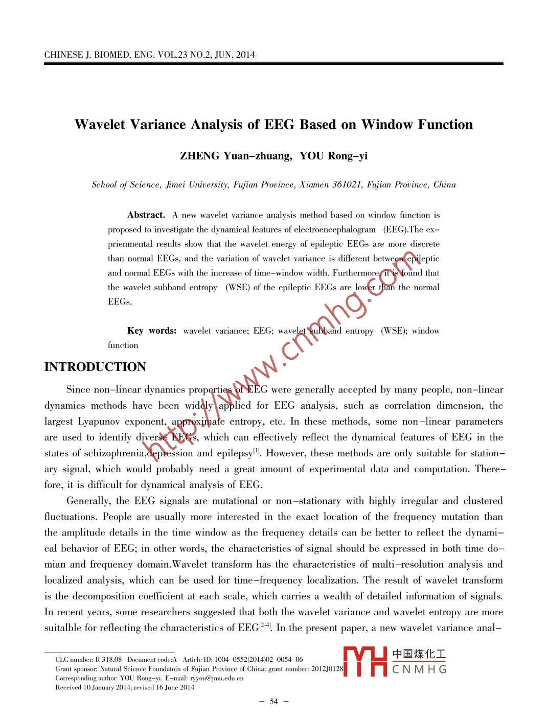 CHINESE J. BIOMED. ENG. VOL.23 NO.2, JUN.2014Wavelet V ariance Analysis of EEG Based on Window FunctionZHENG Yuan-zhuang, YOU Rong-yi .School of Science, Jimei University, Fuyjian Province, X iamen 361021, Fuyjian Province, ChinaAbstract. A new wavelet variance analysis method based on window function is .proposed to investigate the dynamical features of electroencephalogram (EEG).The ex-prienmental results show that the wavelet energy of epileptic EEGs are more discretethan normal EEGs, and the variation of wavelet variance is different between epilepticand normal EEGs with the increase of time-window width. Furthermore, it is found thatthe wavelet subband entropy (WSE) of the epileptic EEGs are lower than the normalEEGs.Key words: wavelet variance; EEG; wavelet subband entropy (WSE); windowfunctionINTRODUCTIONSince non-linear dynamics properties of EEG were generally accepted by many people, non-lineardynamics methods have been widely applied for EEG analysis, such as correlation dimension, thlargest Lyapunov exponent, approximate entropy, etc. In these methods, some non -linear parametersare used to identify diverse EEGs, which can effectively reflect the dynamical features of EEG in thestates of schizophrenia,depression and epilepsy!". However, these methods are only suitable for station-ary signal, which would probably need a great amount of experimental data and computation. There-fore, it is difficult for dynamical analysis of EEG.Generally, the EEG signals are mutational or non -stationary with highly irregular and clusteredfluctuations. People are usually more interested in the exact location of the frequency mutation thanthe amplitude details in the time window as the frequency details can be better to reflect the dynami-cal behavior of EEG; in other words, the characteristics of signal should be expressed in both time do-mian and frequency domain. W avelet transform has the characteristics of multi -resolution analysis andlocalized analysis, which can be used for time -frequency localization. The result of wavelet transformis the decomposition coefficient at each scale, which carries a wealth of detailed information of signals.In recent years, some researchers suggested that both the wavelet variance and wavelet entropy are moresuitalble for reflecting the characteristics of EEGR-4. In the present paper, a new wavelet variance anal-中國煤化工CLC number: R 318.08 Document code:A Article ID: 1004-0552(2014)02- -0054-06Grant sponsor: Natural Science Foundatoin of Fujian Province of China; grant number: 2012J0128.MYHCNMHGCorresponding author: YOU Rong -yi. E- -mail: ryyou@jmu.edu.cnReceived 10 January 2014; revised 16 June 2014-54-Chinese Journal of Biomedical Engineering (English Edition) V olume 23 Number 2, June 2014ysis method based on window function is proposed for studying the dynamical features of EEGs in bothepileptic and normal states.WA VELET VARIANCE AND WAVELET SUBBAND ENTROPY OF EEGThe wavelet varianceIn probability theory and statistics, variance measures how far a set of numbers is spread out.Thewavelet variance is a significantly characteristic index in multi -resolution analysis, which decomposesthe variance of a time series into several components associated with different scales. The waveletvariance can measure the discrete level of signals at different scales.The discrete wavelet transform (DWT) of a signal f(t) ∈L?(R) is defined as Equation (1):c{(k)= | f(),()dt(1)where ψ,()=2° ψ(2j-h) is the wavelet family. According to Parseval's theorem, the wavelet transformon the basis of orthogonal wavelet has the property of energy conservation. Then, the wavelet energy atresolution level j is approximated by the wavelet coefficients as Equation (2):E;=E |()2.The wavelet variance at resolution level j is defined as Equation (3)5-6:V}= vr{c{(k)}(3)so the wavelet variance at resolution level j can be estimated by Equation (4):VF=σ=H 2 lc()(4)The wavelet variance is generally regarded as an effective substitution for the sample varaiance ofstochastic process. From Equation (2) and (4), we can see that the wavelet variance is the average en-ergy at one wavelet scale. Therefore, the wavelet variance measures how far the number betweenwavelet energy and their expected values is spread out.The wavelet subband entropyWith regard to a given signal f(),wavelet coefficients c() at each scale j are squared and normal-ized according to Equation (5)7:C;(n)=-c(m)}2(5)Zc(m}where c; is the cofficient at scale j, is the number of coefficients at scale j. Then the wavelet subbandentropy (WSE) is computed according to Shannon entropy theory as Equation (6): .中國煤化工WSE:log(N)MHCNMHG(6)-55一CHINESE J. BIOMED. ENG. VOL.23 NO.2, JUN.2014Equation (5) enhances the contribution of high-amplitude signal values in relation to lower-amplitudesignal values, so that the WSE is more sensitive to the characteristics of brain activity.ANALYSIS OF EEG BASED ON WINDOW FUNCTIONIn light of the definition of wavelet variance and WSE, the calculation of wavelet variance and theWSE are based on the energy distribution in wavelet sub-bands, so that the estimation of wavelet en-ergy distribution plays an important role in the calculation. In essence, the calculation of the waveletenergy distribution is similar to the W elch approach, which is usually used to calculate spectrum inthe frequency domain by FFTB8-91. For Welch spectrum estimation, a signal is usually segmented andwindowed with some functions such as Hamming, Blackman, etc. Then all individual segment's spectraare averaged to obtain a more reliable and smooth spectrum estimation. However, without a windowsmoothing strategy, so this estimation will be easily affected by noise, artifacts, eventually leading to anunstable calculation of wavelet variance spectrum and WSE. Furthermore, EEG data is almost alwayscontaminated by some artifacts which is not only generated by the body (such as eye-induced artifacts,ECG artifacts, EMG- -indu