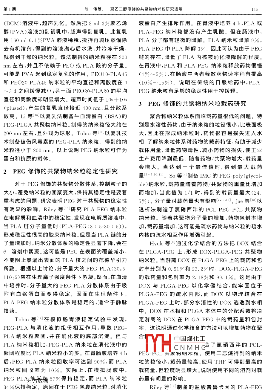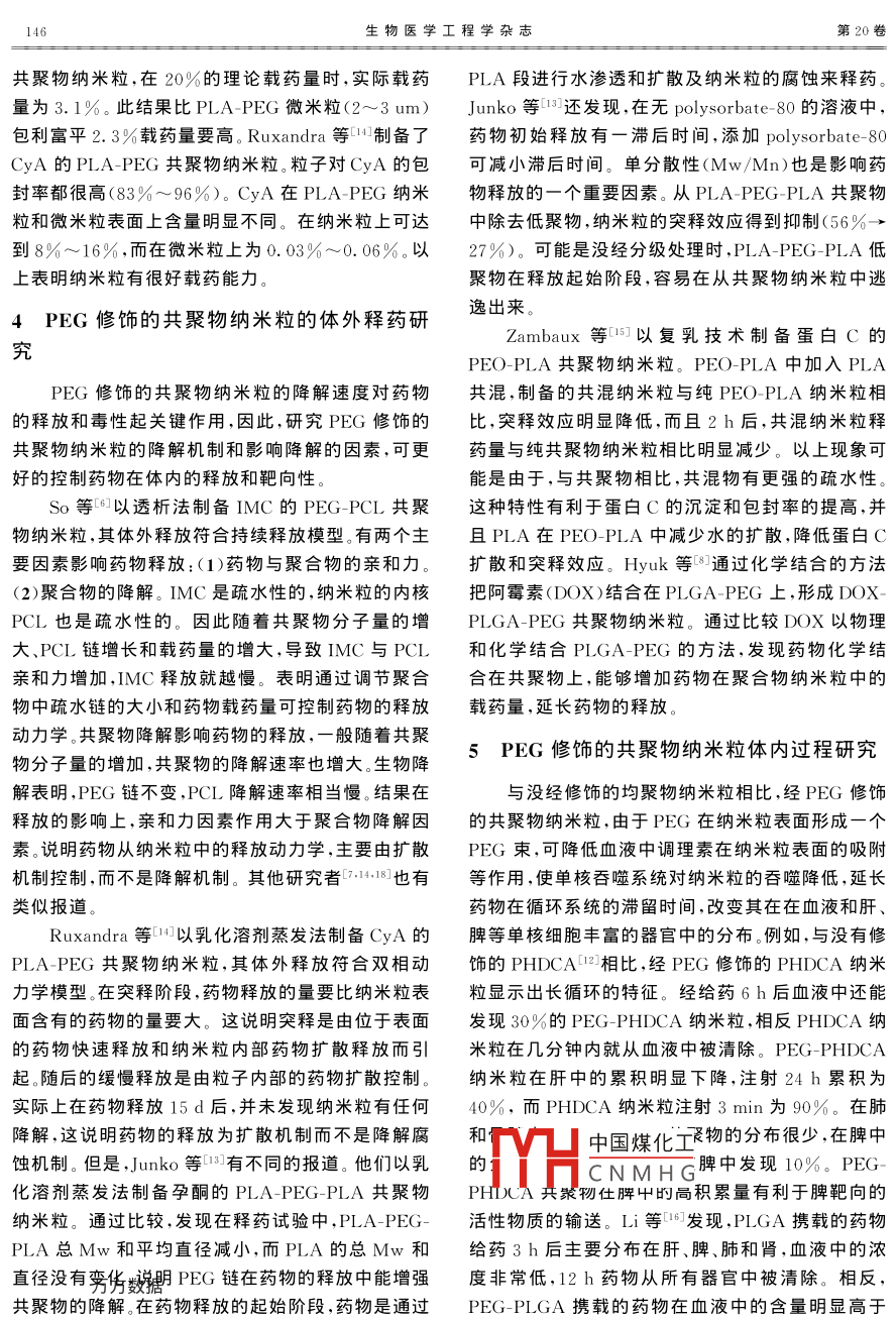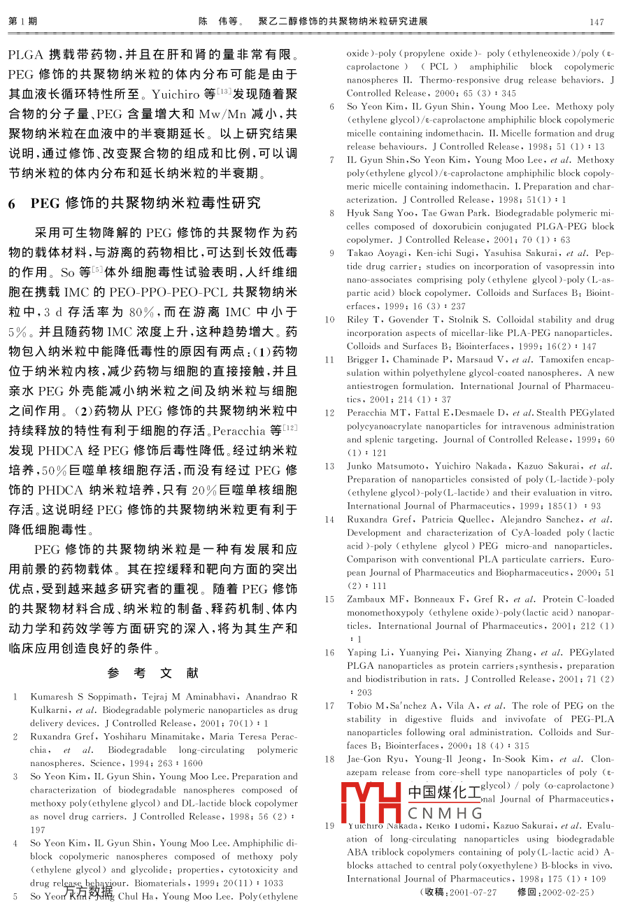 生物醫(yī)學(xué)工程學(xué)雜志2003;20(1): 143~147J Biomed Eng .聚乙二醇修飾的共聚物納米粒研究進展陳偉綜述楊祥良審校(華中科技大學(xué)藥物研究所,武漢430074)摘要可生物降解的聚合物納米粒作為藥物輸送載體有很多優(yōu)勢,如可控釋、靶向等。但是,由于聚合物納米粒經(jīng)靜脈給藥后,數(shù)秒或數(shù)分鐘內(nèi)會被內(nèi)皮網(wǎng)狀系統(tǒng)清除而無法普遍應(yīng)用。為了克服這-缺點,越來越多的研究者引入親水性組分聚乙二醇(PEG)對聚合物進行修飾,以避免其被內(nèi)皮網(wǎng)狀系統(tǒng)攝取。聚乙二醇的引入不僅會影響聚合物納米粒的生物降解行為,而且會影響藥物的釋放、體內(nèi)分布等行為。本文綜述了聚乙二醇修飾的共聚物納米粒的制備、穩(wěn)定性.載藥、體外釋藥、體內(nèi)分布、毒性等方面的研究進展,并對其前景進行預(yù)測。關(guān)鍵詞聚乙二醇修飾的共聚物 納米粒 藥物釋 放系統(tǒng).Researches on PEG -modified Copolymer NanoparticleChen Wei Yang Xiangliang(Pharmaceuical Institute ,Hua Zhong University of Science and Technology, Wuhan 430074)Abstract Biodegradable polymeric nanoparticles acting as drug carrier have important potential applications .such as site- specific drug delivery and controllable drug delivery. However, these carriers cannot generally be usedbecause they are eliminated by the reticulo endothelial system within seconds or minutes after intravenous injec-tion. To overcome this limitation, more and more researchers introduce hydrophilic polyethylene glyeol (PEG) tomodify polymeric nanoparticles for avoiding their uptake by reticulo -endothelial system. Introducing PEG not onlychanges polymer nanoparticles' biodegradation in vivo, but also influences drug's properties such as drug release,in vivo biodistribution, et al. In this paper are reviewed the researches of PEG-modified copolymer nanoparticles,including their preparation and size distribution, stability, drug incorporation, drug release. in vivo biodistribu-tion,in vitro cytotoxicty. A prospect for the researches and developments of the PEG modified copolymernanoparticles was also made.Key words PEG- modified copolymer .NanoparticleDrug release system在過去的幾十年里,將生物可降解的納米粒發(fā)道[3~19]。研究表明,親水性PEG修飾的納米粒,用于展成為高效的藥物釋放體系引起人們的廣泛興靜 脈給藥時,血液清除和RES攝取顯著減小。并且趣[1。以生物可降解的聚合物為載體,將生物活性物PEG引入會影響納米粒的生物降解行為,調(diào)節(jié)釋藥質(zhì)以最佳的速率和劑量,轉(zhuǎn)運到特定靶位,發(fā)揮控釋方式。從藥物活性角度出發(fā)分析,這種由PEG形成靶向作用是近年來研究的主要目標(biāo)。載藥納米粒大微環(huán)境,也將有利于多肽和蛋白質(zhì)藥物在儲存和給多是通過靜脈給藥,從而達到藥物靶向作用的目的。藥過程中保持其活性。納米粒的制備可溯源至1916但事實上,血管內(nèi)注射納米粒一般難以主動作用于年,Birron Back等制備了第一個納米球體系一聚丙靶位,納米粒會從血管中迅速清除并被網(wǎng)狀內(nèi)皮系烯酰胺納米粒。此后人們致力于選擇合適的聚合物統(tǒng)(RES)攝取([2]。RES的攝取作用,對于與RES有材中國煤化工方法。本文將對PEG修關(guān)的疾病是有利的,但多數(shù)疾病并不在此系統(tǒng)中。因飾MYHCN M H或藥及藥物釋放.體內(nèi)分此研究如何減少RES攝入是研究者關(guān)注的問題。最布、毒性寺萬面所作的努刀作一綜述。近研究趨勢之-是對納米粒載體修飾,引入第二組1PEG修飾的共聚物納米粒制備方法研究分。聚乙二醇(PEG)有許多優(yōu)勢而且得到FDA批準(zhǔn)可用于大秀殷據(jù)有鑒于此,近年來,有大量關(guān)于將1. 1透析法PEG作為親水組分引入納米粒載體的研究報將PEG修飾的共聚物和藥物溶于有機溶劑i 44生物醫(yī)學(xué)工程學(xué)雜志第20卷中,在室溫下攪拌-段時間。把溶液裝在細(xì)胞透析膜性鹽酸普魯卡因的聚乳酸聚乙二醇PLA-PEG共中,放入超純水中透析。然后超聲并離心,得到的溶聚物納米粒。將共聚物和藥物溶于5 ml乙腈,此有液冷凍干燥,就獲得了干燥的納米粒。與其它方法相機相加入到15 ml水中,在室溫下攪拌,直到有機溶比,該法得到的納米粒的粒徑小,粒度分布窄,表現(xiàn)劑全部蒸發(fā),得到含納米粒溶液。該法制得的納米粒為單峰分布[3~9]。而且此法步驟簡單,可避免使用其徑小于156 nm,粒徑隨PLA鏈的增長而增加,納米它的表面活性劑[2](通常非生物降解),得到的納米粒單分散性好。分子量相同時,PLA均聚物納米粒粒不含有機溶劑。So等[3~7]以透析方法制備了消炎的粒徑(124 nm)比PLA PEG共聚物(28 nm)大得痛(IMC)的聚乙二醇聚乳酸(PEG/DL-lactide)、聚多。共聚物中PLA:PEG≤30:5時,納米粒的粒徑乙二醇-聚羥基乙酸(PEG poly(glycolide))、普朗尼保持不變。當(dāng)PLA:PEG>30:5時,納米粒徑會隨克~聚己內(nèi)酯(PEO- PPO- PEO- PCL).聚乙二醇~聚著溶于有機相中的PLA-PEG共聚物增加而增加。己內(nèi)酯(PEG _PCL)等共聚物納米粒。以PEG/DL-以.上現(xiàn)象的原因為,在PLA-PEG(3: 5-30: 5)納米lactide[3] 為例,將PEG/DL-lactide共聚物和IMC粒中,由線性PLA形成內(nèi)核有自由空間,因此藥物溶于10 ml二甲基甲酰胺(DMF)溶劑中,在室溫下能結(jié)合進入內(nèi)核不影響納米粒的粒徑;而PLA-攪拌一段時間。把溶液裝在細(xì)胞透析膜中放入3L.PEG(75 : 5-110 : 5)內(nèi)核沒有足夠的空間容納藥超純水中透析24h。然后超聲并離心,