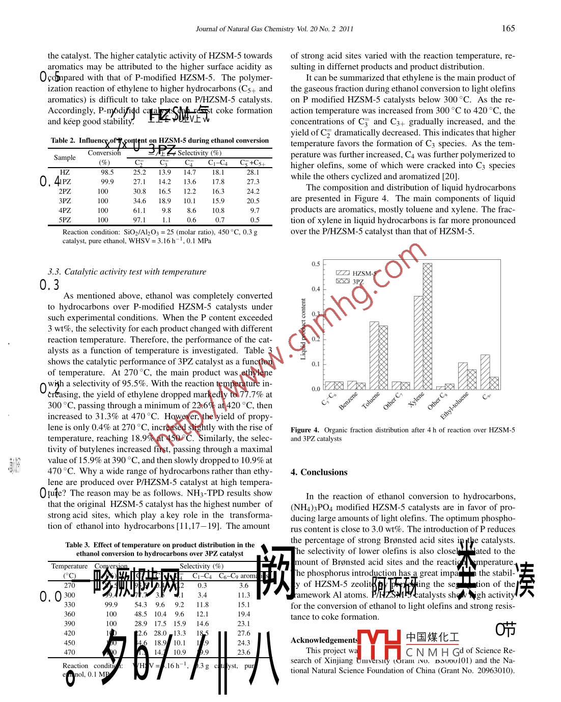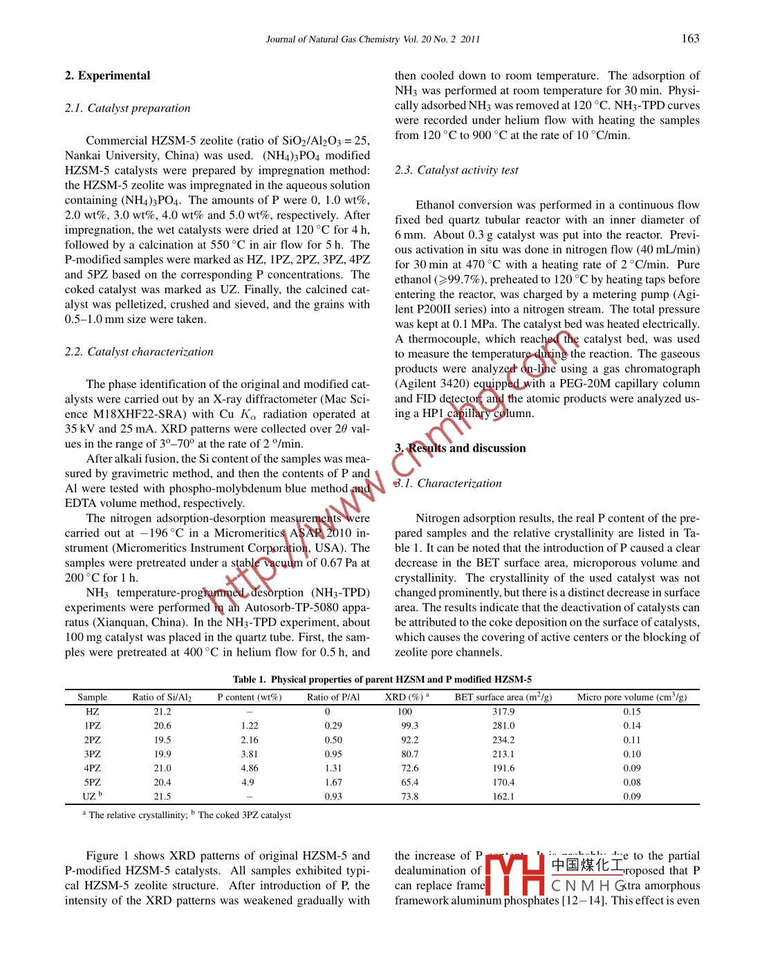 Availableonlineatwww.sciencedirect.comJoumal ofScience DirectNatural GasChemistryELSEVIERJournal of Natural Gas Chemistry 20(2011)162-166Effects of P content in a p/hzsm-5 catalyst on theconversion of ethanol to hydrocarbonsLirsity, Urumgi 830046, Xinjiang, ChineAbstractA series of P/HZSM-5 catalysts prepared by impregnation method were used for ethanol conversion to lower olefins. The catalysts werecharacterized by X-ray diffraction(XRD), NH3-temperature-programmed desorption(NH3-TPD)and N2 adsorption-desorption measurementsIt was found that the P/HZSM-5 catalysts showed high activity and selectivity toward light olefins. The selectivities of propylene and butylenecan be improved with the introduction of phosphorus P). When the content of reached 3.0 wt%, more thanropylene in the gaseousproducts was obtained over the P/HZSM-5 catalyst 4t 450.Ctroductid of P modified the strong Bronsted acid sites of the originalHZSM-5 catalysts and P/HZSM-5 catalysts could resist coke forgood stabilityKey wordsethanol; P/HZSM-5; hydrocarbons; modific1. Introductionofifork al atoftment [8]. Several studies reported that P-modifiedLight olefins, such as ethylene, propylene and bulylene HZSM-5 catalysts were active for ethanol conversion to ethyare important raw materials in the petrochemical industrylene 19-11]. Tynjala et al. [9] found that ethylene was theTraditional crude oil (mainly naphtha)cracking can not meet final product over P-modified HZSM-5 catalysts containingthe great demand due to oil supply crisis. It has driven much 2.2 wt% and 2.7 wt% P, and no higher hydrocarbons wereeffort to seek alternative and renewable sources. Ethanol observed at high reaction temperature(643 K). Zhang et alis particularly attractive since it is a renewable agricultural supported in their work that no higher hydrocarbons werresource and it can be obtained easily by fermentation of formed during ethanol dehydration, but not all the P-modifiddnAHZSM-5 catalysts favored dehydration of ethanol to ethylIt has been reported that as solid acid catalysts, HZSM-5 at high reaction temperature [10]. Ramesh et al. [11] investizeolites are widely used for conversion of ethanol to light gated the influence of H PO4 loading on the catalytic perforolefins [1-7. These studies revealed that the distribution mance of modified HZSM-5 catalysts, and found that higherof various products depends on the concentration of Bronsted hydrocarbons were produced to a significant extent duringacid sites on the catalyst. The acidity of HzsM-5 with lowerethanol conversion However no further studies were carriedSiO2/Al2O3 ratio suppressed the formation of C2, C3 and C4, out on ethanol conversion to C2-C4 olefins over P/HZSM-5but favored more C6+ aromatics as well as Cl-5 paraffins. catalysts. In this paper, we investigated the effects of Pcon-The selectivities of propylene and ethylene were improved tent on the selectivity of light olefins derived from ethanolprominently over metal-exchanged HZSM-5over P/HZSM-5 catalysts prepared by impregnation methodhe introduction of phosphorus on H-MFI zeoliFurthermore, the correlation between the production of C2-4stabilize the mfi zeolite structure by preventing theolefins and the acidity of the catalysts was also studiedCorrespondingauthor.Tel:+86-991-8581012-808:E-mail:yinglu@xju.edu.cnFor This project was supported by the Doctor Fund of Science Research of Xinjiang University(Gr中國(guó)煤化工 lal Natural Scienceundation of China( Grant No. 20963010)CNMHGCopyright(2011, Dalian Institute of Chemical Physics, Chinese Academy of Sciences. All rights reservedoi:10.1016/S1003-9953(1060163-6Journal of Natural Gas Chemistry VoL. 20 No. 2 201I2. Experimentalthen cooled down to room temperature. The adsorption ofNH3 was performed at room temperature for 30 min. PhysiCatalyst preparationcally adsorbed NH3 was removed at 120C. NH3-TPD curveswere recorded under helium flow with heating the samplesCommercial HZSM-5 zeolite (ratio of Sio2/Al2 O3=25from 120C to 900C at the rate of 10C/minNankai University, China) was used. (NH4)3 PO4 modifiedHZSM-5 catalysts were prepared by impregnation method: 2.3. Catalyst activity testthe HZSM-5 zeolite was impregnated in the aqueous solutioncontaining(NH4)3 PO4. The amounts of P were 0, 1.0 wt%Ethanol conversion was performed in a continuous flow2.0 wt%, 3.0 wt%, 4.0 wt% and 5.0 wt%, respectively. Ater fixed bed quartz tubular reactor with an inner diameter ofImpregnation, the wet catalysts were dried at 120'C for 4 h, 6 mm. About 0.3 g catalyst was put into the reactor. Previ-followed by a calcination at 550C in air flow for 5 h. The ous activation in situ was done in nitrogen flow(40 mL/min)P-modified samples were marked as HZ, IPZ, 2PZ, 3PZ, 4Pz for 30 min at 470 C with a heating rate of 2C/min. Pureand 5PZ based on the corresponding P concentrations. The ethanol (>99.7%), preheated to 120C by heating taps beforecoked catalyst was marked as UZ. Finally, the calcined cat- entering the reactor, was charged by a metering pump(Agialyst was pelletized, crushed and sieved, and the grains with lent P200lI series) into a nitrogen stream. The total pressure0.5-1.0 mm size were takenwas kept at O I MPa. The catalyst bed was heated electricallyA thermocouple, which reached the catalyst bed, was used2.2. Catalyst characterizationto measure the temperature during the reaction. The gaseousproducts were analyzed on-line using a gas chromatographThe phase identification of the original and modified cat-(Agilent 3420)equipped with a PEG-20M capillary columnalysts were carried out by an X-ray diffractometer( Mac Sci- and FID detector; and the atomic products were analyzed usence Ml8XHF22-SRA) withradiation operated at ing a HPI capillary column35 kV and 25 mA. XRD patterns were collected over 20 val-ues in the range of3°-70° at the rate of2%min3. Results and discussionAfter alkali fusion, the Si content of the samples was measured by gravimetric method, and then the contents of P andAl wer