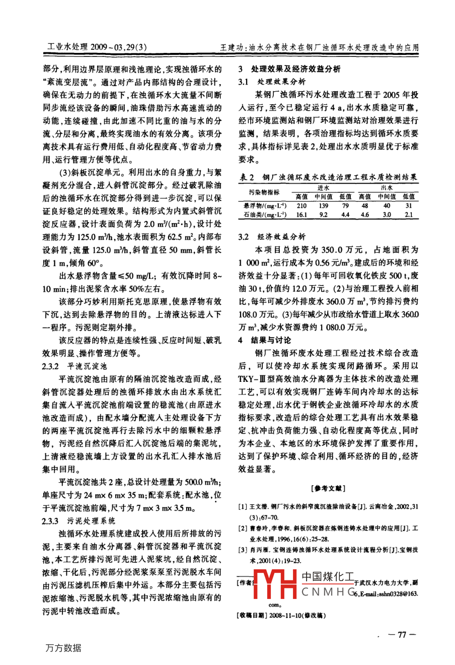 第29卷第3期工業(yè)水處理Vol 29 No.32009年3月Industrial Water TreatmentMar..2009油水分離技術(shù)在鋼廠濁循環(huán)水處理改造中的應(yīng)用王建功(天津水運工程科學(xué)研究所,天津300456)[摘要]循環(huán)冷卻水水質(zhì)狀況直接影響到鋼廠濁循環(huán)水的應(yīng)用,如何有效去除循環(huán)水中的油類和氧化鐵皮是整個處理過程的技術(shù)關(guān)鍵。作者通過對某鋼廠濁循環(huán)水處理工程的技術(shù)改造設(shè)計及運行實際效果的分析闡述了油水分離技術(shù)的過程與原理設(shè)計參數(shù),以及該項技術(shù)在濁循環(huán)水處理中的應(yīng)用及效果[關(guān)鍵詞]油水分離;濁循環(huán)水;改造工程[中圖分類號]TQ085:412[文獻(xiàn)標(biāo)識碼]B[文章編號]1005-829X(2009)03-007503Application of the separation of oil from water to the treatment reform ofturbid circulating water in steelworks(Tianyin Research Institute of Water Transport Engineering and Science, Tianjin 300456, China)Abstract: The water quality of circulating cooling water affects directing the application of turbid circulatingwater in steelworks. How to remove the oils and Fe0, from the circulating water is the sticking point of thetreatment process. The process and principle, design parameters, the application of the technique to the turbidcirculating water treatment, and its effect are expounded based on the analysis on the technical reform desiand running effect of the turbid circulating water treatment engineering at a steelworksKey words: separation of oil from water; turbid circulating water; reform engineering鋼廠連鑄生產(chǎn)過程中排放的冷卻水由于受到1項目概述生產(chǎn)作業(yè)、機(jī)械設(shè)備擾動的影響,加上生產(chǎn)過程中11原處理工藝流程及存在的技術(shù)問題使用了一定量潤滑劑、清潔劑和穩(wěn)定劑,使得冷卻原處理工藝流程見圖1水的含油量大,且乳化程度高,并含有一定量的重金屬離子,導(dǎo)致冷卻水水質(zhì)差而不能滿足循環(huán)使?jié)嵫h(huán)水→集水池一隔油池→平流沉淀池→回用水池→回用至生產(chǎn)車間用的要求。國內(nèi)各鋼廠盡管配套建立了濁循環(huán)水污泥池處理設(shè)施,但在處理工藝選擇上多采用以平流隔圖1原處理工藝流程油沉淀池為主體的隔油、沉淀處理流程,工藝相對原工藝存在的主要問題:(1)原有隔油池除油效簡單,處理效果一般,不能滿足生產(chǎn)用濁循環(huán)水水果較差,由于隔油池工藝設(shè)計簡單,僅能去除部分浮質(zhì)標(biāo)準(zhǔn)的要求,為此,筆者結(jié)合濁循環(huán)水的污染特油不能有效去除乳化油,導(dǎo)致出水水質(zhì)中石油類含性,選取以油水分離技術(shù)為主體的隔油、破乳工藝量高于回用標(biāo)準(zhǔn)要求。(2)平流沉淀池設(shè)計停留時間對已有的工程進(jìn)行改造,保證冷卻水經(jīng)處理后滿較小,抗沖擊負(fù)荷能力一般,單純依靠重力沉降作用足濁循環(huán)水水質(zhì)標(biāo)準(zhǔn)的要求,既能避免直接排放不能有效去除顆粒物和鐵粉,難于穩(wěn)定保證出水水對受納水體造成嚴(yán)重的污染,又可以節(jié)約大量的質(zhì)符中國煤化工水源自生產(chǎn)車間的水資源有利于走企業(yè)“增產(chǎn)節(jié)污、循環(huán)經(jīng)濟(jì)、節(jié)能鋼坯CNMHG處理后的污水必須減排”的可持續(xù)發(fā)展之路,具有良好的工程經(jīng)濟(jì)效進(jìn)代卻后萬能凹用寸生廣,原系統(tǒng)未考慮處益和環(huán)境效益。理出水的冷卻要求,導(dǎo)致有效出水量不能滿足生產(chǎn)75一經(jīng)驗交流工業(yè)水處理2009-03,29(3)高峰期的補水量。(4)自動化程度較低,日常維護(hù)管TKY-Ⅲ型油水分離器污水中的浮油經(jīng)過油水分離理煩瑣,工人勞動強度大需提高其自動化程度。后排入儲油箱,污水與投加的絮凝劑快速混合后再1.2改造工程設(shè)計水量及水質(zhì)加入助凝劑后進(jìn)入斜管沉淀部分,乳化油、懸浮物和濁循環(huán)污水原有處理工程的設(shè)計量為3600氧化鐵皮被沉淀分離,上清液排入平流沉淀池沉淀沿h,考慮生產(chǎn)循環(huán)水的來水不均勻性及未來生產(chǎn)分離懸浮物,出水冷卻后回用于生產(chǎn)發(fā)展的需要,改造工程設(shè)計接收處理能力按5000油水分離器、平流沉淀池排放的污泥定時排入}/h,按4套獨立處理單元進(jìn)行設(shè)計,每個單元的設(shè)泥漿坑,經(jīng)初步靜置處理后泵入板框壓濾機(jī)進(jìn)行脫計處理能力為1250mh,實際運行過程中可以根水處理,脫水后的污泥集中外運處置。據(jù)處理量靈活運行。濁循環(huán)水經(jīng)過TKY-Ⅲ型油水分離器進(jìn)行隔鋼廠濁循環(huán)污水是生產(chǎn)過程中冷卻鋼坯的循環(huán)油絮凝、混合、破乳沉淀后,實現(xiàn)油、水、懸浮物的冷卻水,主要來自鑄坯二次冷卻水、輥道冷卻水、鑄有效分離出水達(dá)到水質(zhì)排放要求油水分離器運行坯切割機(jī)冷卻水及渣?;?污水中含有大量氧化一段時間后,要定期進(jìn)行反沖洗,反沖洗水依靠重力鐵皮及少量浮油、乳化油等,水溫較高,濁循環(huán)水的排入泥漿坑進(jìn)行沉淀,上清液外排至濁循環(huán)水處理主要污染物的濃度、要求處理后的循環(huán)水質(zhì)標(biāo)準(zhǔn)見系統(tǒng)。表12.2工藝參數(shù)的確定1鋼廠濁循環(huán)水水質(zhì)和出水標(biāo)準(zhǔn)設(shè)計接收處理量:設(shè)計處理能力為5000m3h主要指標(biāo)石油類/(mgL")s(mgL) pH COD(mL)4套并