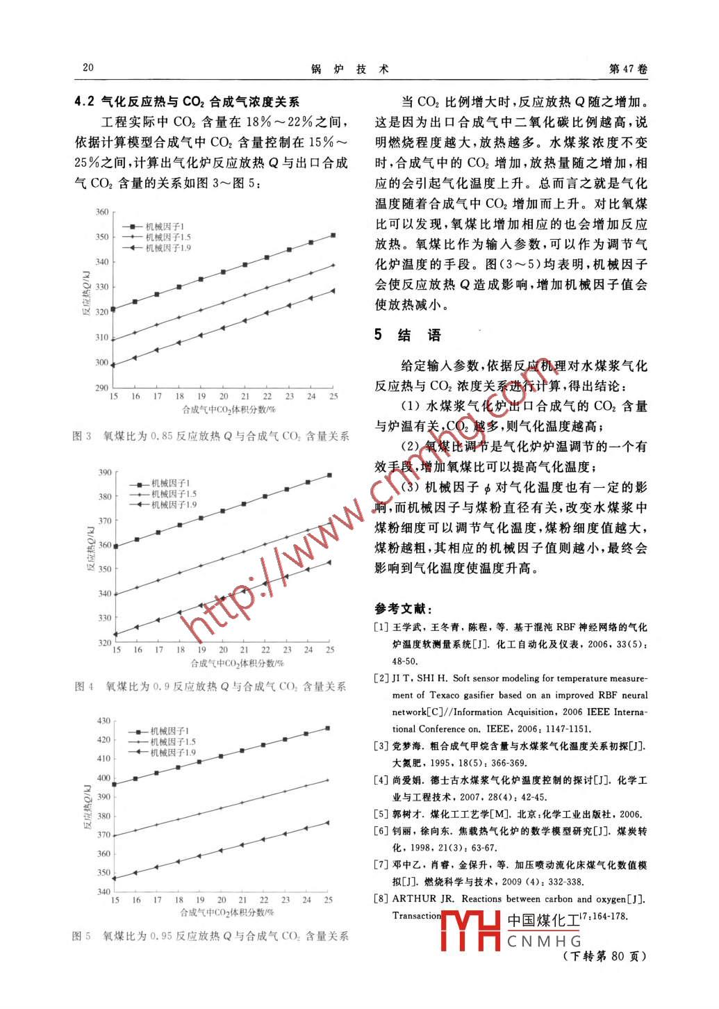 第47卷第2期鍋爐技術(shù)Vol. 47, No. 22016年3月BOILER TECHNOLOGYMar.,2016合成氣中CO2含量與水煤漿氣化溫度關(guān)系研究趙軍,余岳峰(上海交通大學(xué)機(jī)械與動(dòng)力工程學(xué)院,上海200240)摘要:為了研究合成氣中CO2含量與氣化爐溫度的關(guān)系,將氣化爐分為3個(gè)區(qū)域:水分蒸發(fā)及揮發(fā)分熱解區(qū)、燃燒區(qū)及氣化區(qū)。水煤漿和氧氣相繼經(jīng)過這3個(gè)區(qū)域發(fā)生一系列物理、化學(xué)反應(yīng)最終生成合成氣。建立計(jì)算模型得到整個(gè)氣化過程反應(yīng)放熱Q與合成氣中CO2的關(guān)系。結(jié)論表明:合成氣中CO2含量越多,氣化爐溫度越髙;增大氧煤比,可使氣化爐溫度升髙;較粗的煤粉,可使氣化爐溫度高。因此合成氣CO2含量可作為判斷爐溫的依據(jù),氧煤比和煤粉細(xì)度可以作為調(diào)節(jié)爐溫的手段。關(guān)鍵詞:氣化爐;溫度測量;CO2含量;氧煤比中圖分類號(hào):TQ54文獻(xiàn)標(biāo)識(shí)碼:A文章編號(hào):1672-4763(2016)02-0017-040前言水煤漿和氧氣經(jīng)過噴嘴進(jìn)入氣化爐時(shí),高速噴人的氧氣使水煤漿破碎、霧化。由于氣化爐內(nèi)氣化爐溫度測量一直是氣化爐的安全穩(wěn)定耐火襯里高溫輻射使得霧化的水煤漿和氧氣迅運(yùn)行的關(guān)鍵,但是傳統(tǒng)的溫度直接測量成本過速蒸發(fā)、熱解、再經(jīng)過燃燒和氣化,最終生成了合高,有學(xué)者提出了采用神經(jīng)網(wǎng)絡(luò)軟測量法2,這成氣。合成氣主要成分為H2、CO、CO2、H2O,與種軟測量是通過選取氧煤比、氣化壓力、水煤漿熔渣進(jìn)入急冷室冷卻。冷卻后的合成氣進(jìn)入煤流量及溫度等多種參數(shù)作為變量,通過大量實(shí)驗(yàn)氣冷卻和凈化裝置數(shù)據(jù)來訓(xùn)練出爐溫與這些變量的關(guān)系。但是這因此,也可以把水煤漿氣化概括為3個(gè)階種方法對實(shí)驗(yàn)數(shù)據(jù)要求極為苛刻,且得出的關(guān)系段,即水分蒸發(fā)及煤的熱解,碳的燃燒和揮發(fā)分式缺乏理論支撐,也有的學(xué)者提出通過合成氣中的燃燒煤的氣化,3個(gè)階段相繼進(jìn)行的CH含量來預(yù)測氣化溫度,但是工業(yè)生產(chǎn)實(shí)2水煤漿氣化模型踐表明,煤氣化中不能以CH為標(biāo)準(zhǔn)控制氣化爐溫,因?yàn)镃H4變化非敏感,即使很小的氣化溫度水煤漿氣化主要分為3個(gè)階段,依據(jù)不同階變化也會(huì)引起CH大幅度變化。筆者認(rèn)為水段,可以將氣化爐分為3個(gè)區(qū)域分別為:水分的煤漿和氧氣在進(jìn)入氣化爐后經(jīng)過一系列物理、化蒸發(fā)及揮發(fā)分的熱解區(qū)域、揮發(fā)分燃燒及碳的燃學(xué)反應(yīng)通過建立方程組求解出每種反應(yīng)的反應(yīng)燒區(qū)域及氣化產(chǎn)生合成氣區(qū)域。量繼而得出氣化爐中總反應(yīng)熱變化,以反應(yīng)放熱水煤漿、氧氣量作為溫度變化的標(biāo)準(zhǔn),反應(yīng)放熱增加,其爐溫上升。因此,作出反應(yīng)熱與出口合成氣中CO2含水分蒸發(fā)及揮發(fā)分熱解區(qū)量的關(guān)系對預(yù)測鍋爐溫度具有重要意義。1水煤漿氣化原理及過程氣化區(qū)水煤漿氣化爐是氣流床氣化爐的一種,它把水煤漿和純氧一起經(jīng)噴嘴噴入氣化,具體工作過合成氣程如下:中國煤化工CNMHG收稿日期:2015-12-10作者簡介:趙軍(1990-),男,碩士生,主要從事氣流床氣化技術(shù)方面的研究鍋爐技術(shù)第47卷2.1水分蒸發(fā)及揮發(fā)分熱解區(qū)響,其取值介于1和2之間。文獻(xiàn)[冂]給出了一種熱解的過程相對氣化時(shí)間很短,可以視為瞬反應(yīng)機(jī)理常數(shù)φ的確定方法:間完成。清華大學(xué)釗麗提出一種熱解模型,認(rèn)d=(2z+2)/(z+2)d≤0.005cm為熱解產(chǎn)物為固定碳,CO,H2、CH4、N2、H2S并2x+2。。(100d-0.05)假定10%的以水分釋放。根據(jù)假設(shè)及煤的干燥z+2無灰基分析結(jié)果建立一個(gè)七元一次的方程組,可0.005cm≤d≤0.1cm表示為:中=1.00.1mm