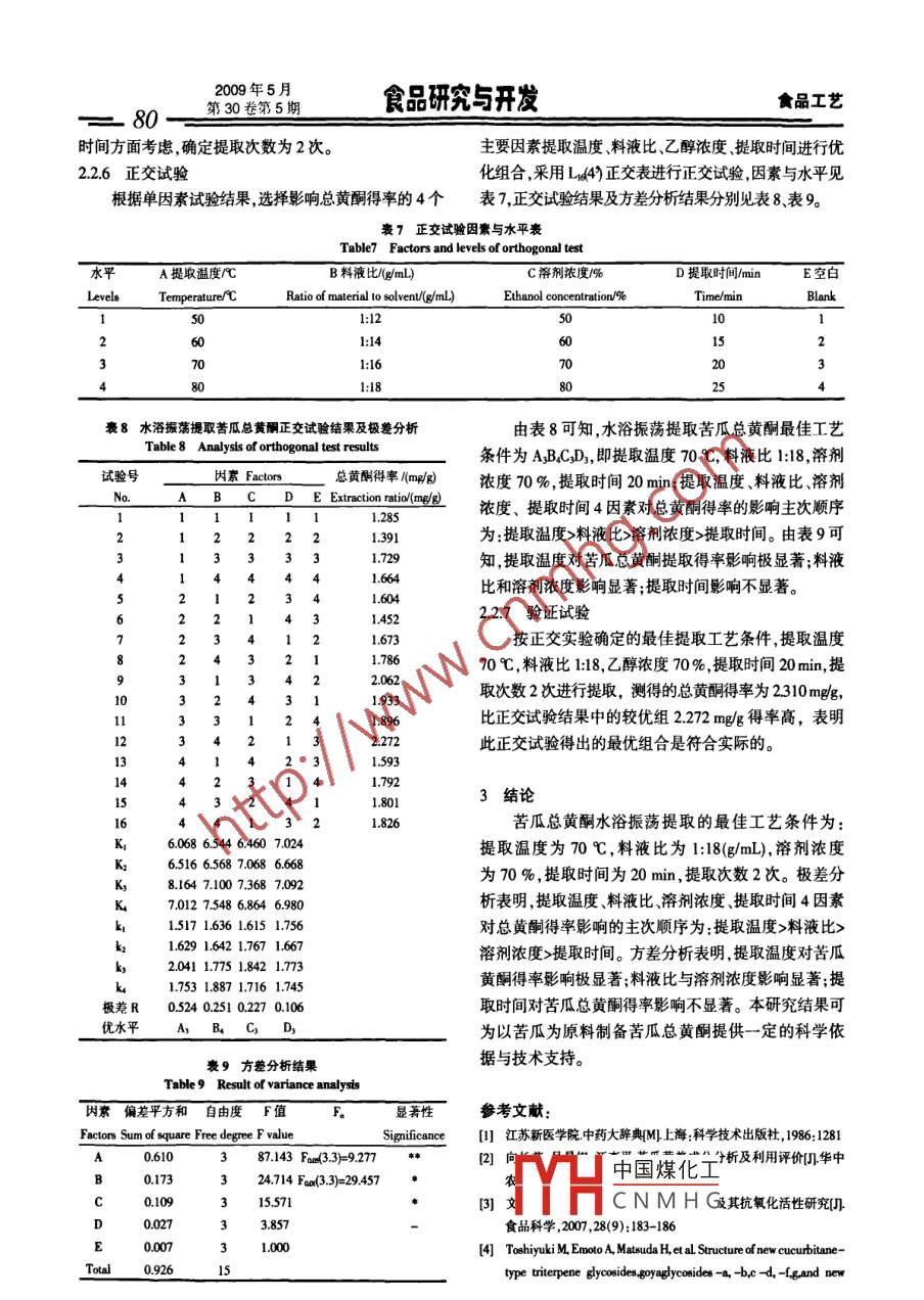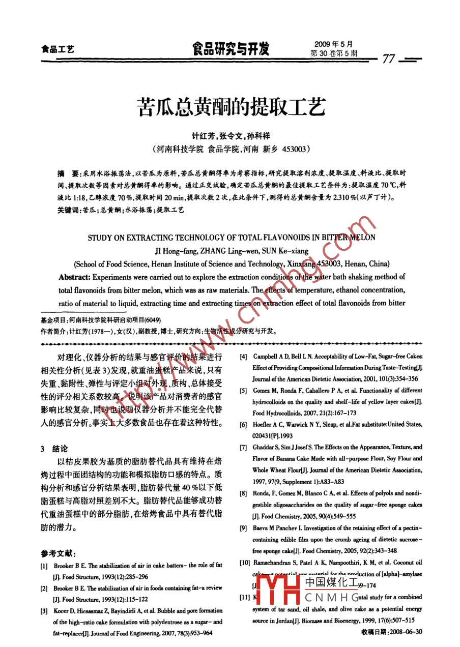 食品工藝食品研究與開發(fā)2009年5月第30卷第5期77苦瓜總黃酮的提取工藝計紅芳,張令文,孫科祥河南科技學(xué)院食品學(xué)院河南新鄉(xiāng)453003)摘要:采用水浴振蕩法,以苦瓜為原料,苦瓜總黃酮得率為考察指標(biāo),研究提取溶劑濃度、提取溫度、料液比、提取時間、提取次數(shù)等因素對總黃酮得率的彩響。通過正交試驗,確定苦瓜總黃酮的最佳提取工藝條件為:提取溫度70℃,料液比1:18,乙醇濃度70%提取時間20min,提取次數(shù)2次,在此條件下,測得的總黃酮含量為2310%(以蘆丁計)關(guān)鍵詞:苦瓜;總黃酮;水浴振蕩;提取工藝STUDY ON EXTRACTING TECHNOLOGY OF TOTAL FLAVONOIDS IN BITTER MELONJI Hong-fang, ZHANG Ling-wen, SUN Ke-xiang(School of Food Science, Henan Institute of Science and Technology, Xinxiang 453003, Henan, China)Abstract: Experiments were carried out to explore the extraction conditions of the water bath shaking method oftotal flavonoids from bitter melon, which was as raw materials. The effects of temperature, ethanol concentration,ratio of material to liquid, extracting time and extracting times on extraction effect of total flavonoids from bitter基金項目:河南科技學(xué)院科研啟動項目(6049)作者簡介:計紅芳(19078),女(漢)副教授博士,研究方向:生物活性成分研究與開發(fā)。對理化、儀器分析的結(jié)果與感官評價的結(jié)果進行{4 Campbell A D, Bell LN. Acceptability of Low- at, Sugar-free Cake相關(guān)性分析(見表3)發(fā)現(xiàn)就重油蛋糕產(chǎn)品來說,只有失重、黏附性彈性與評定小組對外觀、質(zhì)構(gòu)、總體接受Journal of the American Dietetic Association, 2001, 101033354-356性的評分相關(guān)系數(shù)較高。說明該產(chǎn)品對消費者的感官[] Gomez M, Ronda F, Caballero P A, et al. Functionality of differenthydrocolloids on the quality and shelf-life of yellow layer cakes[I影響比較復(fù)雜,同時也說明儀器分析并不能完全代替人的感官分析。事實上大多數(shù)食品也存在著這種特性。1 Hoefler A C, Warwick N Y,se, et al.Fat substitute: United States02043P19933結(jié)論[7 Ghaddar S, SimJJosefS. The Effects on the Appearance, Texture, and以桔皮果膠為基質(zhì)的脂肪替代品具有維持在焙Flavor of Banana Cake Made with all-purpose Flour, Soy Flour and烤過程中面團結(jié)構(gòu)的功能和模擬脂肪口感的特點。質(zhì)Whole Wheat Flour) Joumal of the American Dietetic Association,構(gòu)分析和感官分析結(jié)果表明脂肪替代量40%以下低1997, 97(9, Supplement 1):A83-A83[8]Ronda, F, Gomez m, Blanco C A, et al. Effects of polyols and nondi脂蛋糕與高脂對照差別不大。脂肪替代品能夠成功替gestible oligosaccharides on the quality of sugar-free sponge cakes代重油蛋糕中的部分脂肪,在焙烤食品中具有替代脂U. Food Chemistry, 2005, 90(4): 549-555肪的潛力。9 Baeva M Panchev L. Investigation of the retaining effect of a pectincontaining edible film upon the crumb ageing of參考文獻:free sponge cake). Food Chemistry, 2005, 92(02): 343-348[ Brooker B E. The stabilization of air in cake batters-the role of fatO] Ramachandran S, Patel A K, Nampoothiri, K M, et al. Coconut oilFood Structure,199(12:285-296fae the auction of [ alphah-amylase[2] Brooker B E The stabilization of air in foods containing fat-a re中國煤化工9174U]. Food Structure, 1993(12): 115-1CN Gtal study for a combined[3] Kocer D. Hicsasmaz Z, Bayindidi A, et al. Bubble and pore formationsystem of tar sand, oil shale, and olive cake as a potential energyof the high-ratio cake formulation with polydextrose as a sugar-andsource in Jordan(J) Biomass and Bioenergy. 1999, 17(6): 507-515fal-replacerJ Joumal of Food Engineering, 2007, 780)953-964收稿日期:2008062009年5月第30卷第5期食品研究與開發(fā)食品工藝78melon were discussed. The optimum extraction conditions of total flavonoids by using orthogonal experimenwere obtained as ethanol concentration 70 % ratio of material to liquid 1: 18, extraction at 70C for 2 times and20min for each time. Yield of rude total flavonoids is 2.310 %(as rutin)Key words: bitter melon; total flavonoids; water bath shaking; extracting technology苦瓜( Momordica charantia I-),又稱癩瓜、涼瓜,葫14苦瓜總黃酮的提取工藝流程蘆科苦瓜屬,一年生蔓生草本植物,原產(chǎn)熱帶、亞熱帶地區(qū)南宋時傳人我國,在我國南方多有種植叫苦瓜原料粉碎一石油酸脫脂一水浴振蕩提取+過濾上滑液營養(yǎng)豐富,含有蛋白質(zhì)粗纖維、氨基酸維生素、礦物→定容→減壓濃縮至干→苫瓜總黃酮質(zhì)等多種營養(yǎng)成分,其中vc含量居于瓜類蔬菜之首;測總黃酮含量苦瓜還有很高的藥用價值,《滇南本草》稱其能“除邪熱解勞乏,清心明目”,“主治煩熱消渴引飲,風(fēng)熱赤1.5苦瓜總黃酮含量的測定眼,中暑下痢"《泉州本草》?,F(xiàn)代研究表明,苦瓜中含1.51工作曲線的繪制有生物堿、三萜類、黃酮類、多糖、皂苷類等多種生物活采用NaNO2-Al(NO3)3-NaOH體系絡(luò)合化學(xué)吸光性成分,具有降血糖、抗癌、抗病毒、抗生育、增強免法。疫力等功效嗎。隨著人們對苦瓜營養(yǎng)成分和藥用價值1.52總黃酮含量的測定認(rèn)識的逐步深人,苦瓜越來越受到國內(nèi)外消費者的青量取10mL定容后的提取液于25mL容量瓶中,睞,成為眾多學(xué)者的研究熱點其余步驟與工作曲線的繪制方法相同。目前,對苦瓜中的多糖、皂苷等生物活性成分研1.53苦瓜總黃酮得率的計算究報道的較多,而對苦瓜中黃酮類物質(zhì)研究報道的較總黃酮得率mgg)=提取液中總黃酮含量/所用脫少以。開展苦瓜黃酮類物質(zhì)的提取分離研究工作,