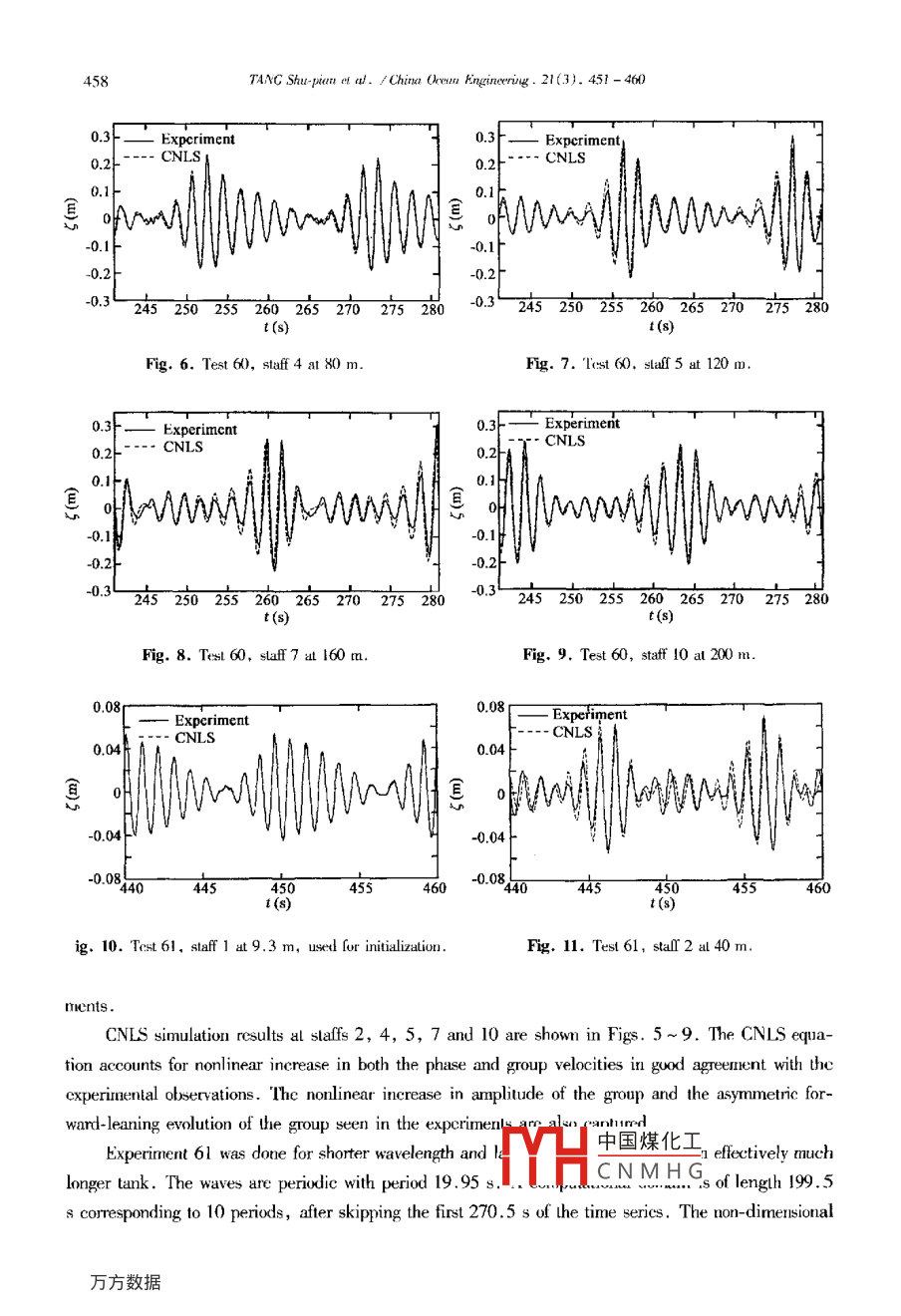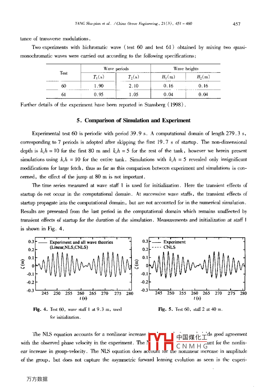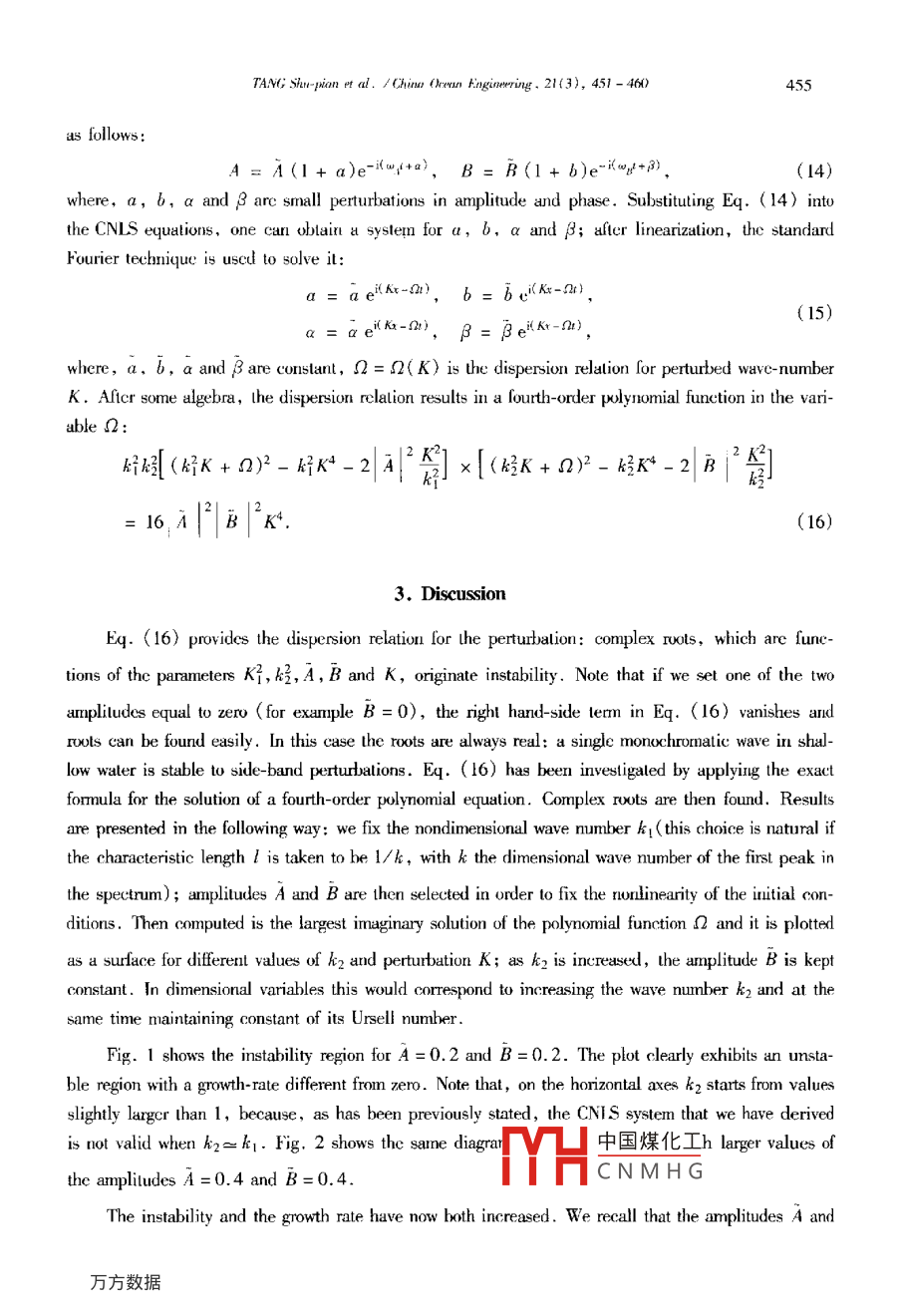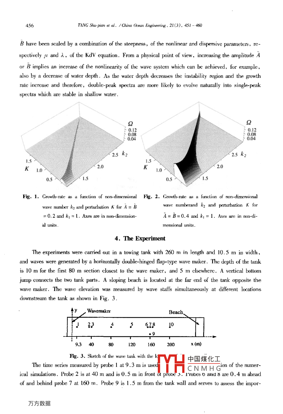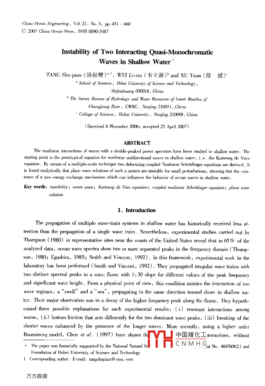 China Ocern Finginepring, Vol.21, No.3, pp. 451- 460C 2007 China Ocean Press, ISSN 0890-5487Instability of Two Interacting Quasi-MonochromaticWaves in Shallow Water*TANC Shu-pian (湯叔梗)°.l,WEI Li-xin (書立新)盧and XU Yuan (徐援)“且School of Sciences,llebei University of Science and Tehnology ,Shijiazhuang 050018, China”The Surey Bureoau of Hydrology ard Wuter Resures of louer Reaches ofChangjiang Riter, CWRC,Nanjing 210011, ChinaColage of Sciences,Hohai Unirersity, Nanjing 210098, China(Received 6 November 2006; acrepled 25 April 2007)ABSTRACTThe nonlinear inleractiuns of waves with a double- peaked power spetum have been studied in shallow water. 'Thestarting poinl is dhe prololypical eqpuation for nonlinear uridirectional wavcs in shallow water, i.e. the Korteweg de: Vriesecquation. By mears o[ a muliple- scale technique two defocusing coupled Nonlinear Schridinger equations are derived. IIis found analyically lhal plare wave solutions of such a system are unstable: for small px:turbations, showing that the cxis-tence of a new energy exchange mechanism which can influence the behavior of occan wavcs in shallw water.Key words: intbility; ocean wue; Koreweg de lries equntion; coupled nonlinear Schridinger equation; plane uanxesolution1. IntroductionThe propagation of multiple wave-train systems in shalow water has historically received less at-tention than the propagation of a single wave train. Nevertheless, experimental studies carried out byThompson ( 1980) in representative sites near the coasts of the United States reveal that in 65% of the .analyzed datu, ocean wave spectra show two or more separaled peaks in the frequency dornain (Thomp-son,1980; Egashira, 1985; Smith and Vinccnt, 1992). In this framework, experimental work in thelaboralory has been performed (Smith and Vincent, 1992) . They propagated iregular wave trains withtwo distinct spectral peaks in a wavc lune with 1: 30 slope for different valucs of the peak frequeneyand significant wave height. From a physical point of view, this condition mimics the interaction of twowave regimes, a“swell” and a“sea” ,propagating in the same direction toward shore in shallow wa-ter. Thcir major observation was in a decay of the higher frequency peak along the flumc. They hypoth-esizxd three possible explanations for such experimental results: (i) resonant inleractions amongwaves, (i) botton friction that acls differently for the two dominant wave peaks, ( ii) breaking of theshorter waves enhanced by the presence of the longer waves. More recently, using a higher orderBoussinesq model, Chen et al. ( 1997) have shown .中國煤化Interacions, without* The paper was financialy suponted by he Nalinal Natural SoYH. C N MH Gu No. 40476062) andFoundation of Hebei Universily of Science and Technology1 Cnorresponding author. E-mail: tangshupian@ sina. com452TANG Shu-pian et al. / Chin (kewn Enpineering. 21(3). 451 - 460invoking bottom friction or wave breaking,is sufficient w account for the decay of the high frequencypeak. Even though these numerical simulations of the Boussinesq equation can qualitatively reproducethe experimental results, data on the occurence of double peaked spectra in the North Sea have beenanalyoed (Soares, 1991) ,indicating that they appeur to have similar probability of occurence than inthe North Atlantic, as previously reported, the basic physical mechanisms of interaction of wave trainswith double peaked spectra in shallow water are far from being completely understood.A great deal of progress in understanding wave propagation in shallow water has been achieved by .investigating the Korteveg -de Vries (KdV) equation, which can be considered as the basic weakly non-linear model for unidirectional shallow water waves. The analytical properties of the KdV equation ( itis integrable by the Inversc Scatlering Trnsform ( Ablowitz and Scgur, 1981)) have improved basicknowledge of the nonlinear dynamics of water waves (Mei, 1993; Osbome and Petti, 1994 ; Osbormeet al.,1991; Osborne et al. 1998). A one-dimensional and a horizontally two dimensional randornwave transformnation models based on a spectral wave equation with a probabilistic bore-type energy dis-sipation term, and examines the validity of the wave models by comparing the predictions with the ob-servations. The model solves the spatial evolution of complex Fourier amplitudes from which energyspectra are calculated ( Mase and Kitano, 2000). In particular after the seminal work by Zabusky andKruskal ( 1965), extensive studies have been carried out on the evolution of a sine wave in shallow wa-ter (Mei, 1993). However, less attention has been paid to the evolution of two nonochromatic waveswith different wave numbers. In this paper discussed is a fundamental instability that occurs betweentwo quasi-monochromatic interacting wave trains. Furthermore, the focus herein is not to model oceanwaves but to study leading order eleels using he sinplest weakly nonlinear and dispersive model in .shallow water. The subject is therefore an investigation of the basic nonlinear interaction that may lakeplace between two separated narow banded wave spectra in shallow water. For this aimn, in suitableassumptions, and with a multiple-scale technique, we derive a system of two Coupled NonlinearSchridinger (CNIS) equations from the KdV equation. Plane wave solutions of such a systerm are thensludied analyically by a stlandard linear stabilty analysis, resulting in the presence of an instahility re-gion.2. The Plane Wave Solution of CNLS Equations'The KdV equation can be formally derived from the Euler equations for water waves ( Mei, 1993;Whitham,1973) under the assumption that waves are small ( but finite amplitude) and long whenwomnpared with the water depth at rest. In a frame of reference moving with the velocity co=V gh,where h is the water dcpth and g is gravity acceleration, the KdV equation in non-dinensional formreads:中國煤化工ζ+ μ5ζx + Aζx(1).