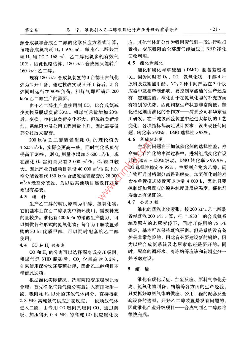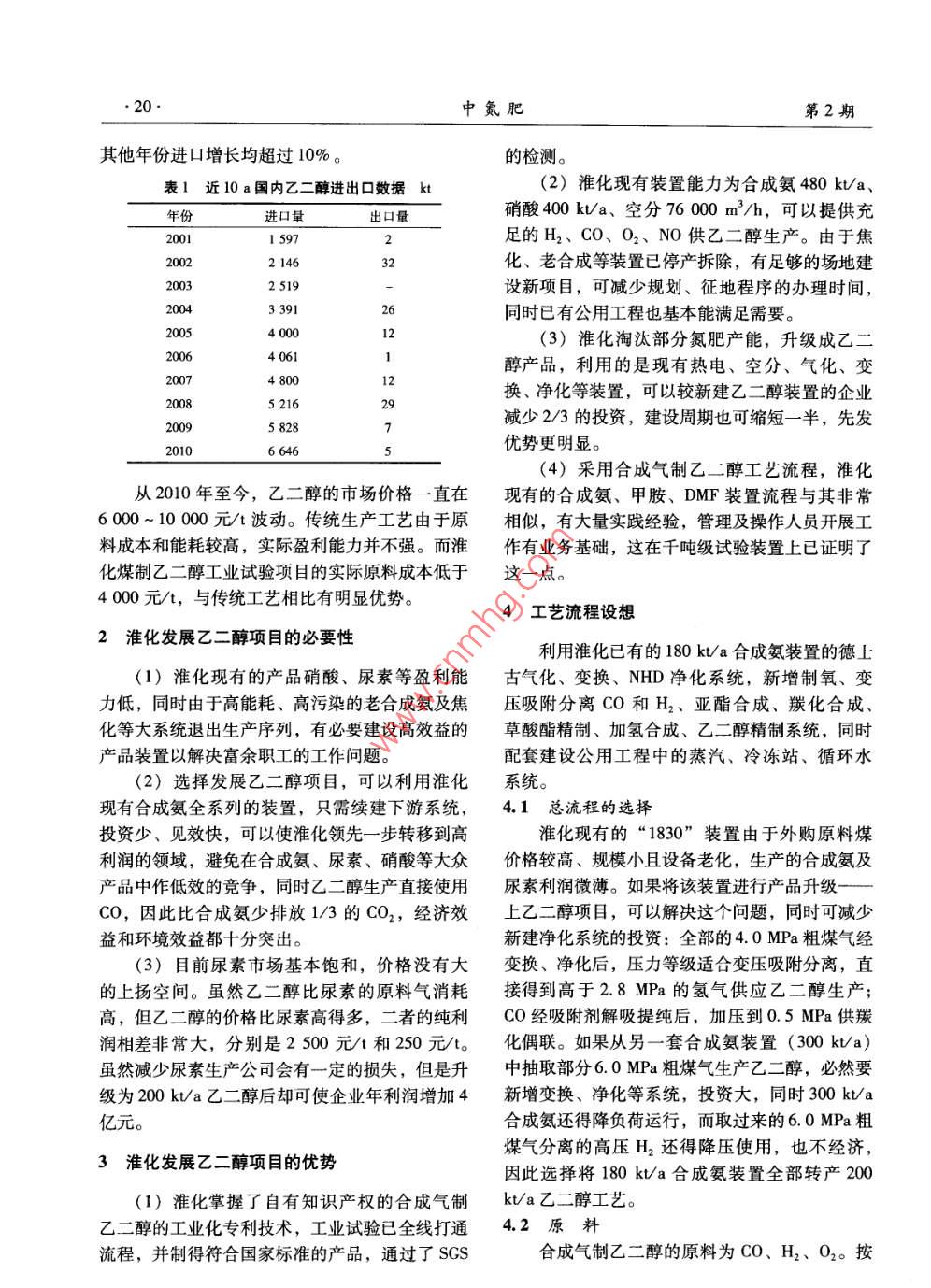第2期中氮肥2012年3月M-Sized Nitrogenous Fertilizer ProgressMar.2012淮化引入乙二醇項(xiàng)目進(jìn)行產(chǎn)業(yè)升級(jí)的前景分析馬寧(安徽淮化集團(tuán)有限公司,安徽淮南232038)[中圖分類(lèi)號(hào)]TQ23.162[文獻(xiàn)標(biāo)識(shí)碼]B[文章編號(hào)]1004-9932(2012)02-0019-030引言升級(jí)現(xiàn)在的主方向是合成氣制乙二醇。安徽淮化集團(tuán)有限公司(簡(jiǎn)稱(chēng)淮化)作為1乙二醇的市場(chǎng)現(xiàn)狀老的中氮企業(yè),主要產(chǎn)品目前仍然以尿素、硝乙二醇是一種重要的有機(jī)化工原料,主要用酸、合成氨這些大眾產(chǎn)品為主,盈利水平較低。來(lái)生產(chǎn)聚酯纖維(PET)、塑料、橡膠、聚酯漆,根據(jù)化工行業(yè)的發(fā)展趨勢(shì),淮化逐步向化工材料也大量用作溶劑和防凍劑等。傳統(tǒng)的乙二醇生產(chǎn)進(jìn)行產(chǎn)業(yè)升級(jí),2009年和2010年分別進(jìn)行了流方法是走石油化工路線,即由石油加工得到乙化床甲醇制丙烯(FMTP)和合成氣制乙二醇烯,乙烯氧化生成環(huán)氧乙烷,環(huán)氧乙烷進(jìn)一步水(MEG)2項(xiàng)工業(yè)試驗(yàn)項(xiàng)目,均取得了圓滿的成合生產(chǎn)乙二醇。功??紤]到FMTP項(xiàng)目投資較大,且淮化沒(méi)有甲乙二醇是國(guó)內(nèi)短缺的化學(xué)品:2008年我國(guó)醇產(chǎn)品,立即發(fā)展此項(xiàng)目很困難,因此淮化產(chǎn)業(yè)乙二醇總生產(chǎn)能力為2710kt,實(shí)際產(chǎn)量大約為1950kt;2010年國(guó)內(nèi)總生產(chǎn)能力約為4200kt[收稿日期]201140908進(jìn)口約6640kt;2011年預(yù)計(jì)進(jìn)口會(huì)超過(guò)7000作者簡(jiǎn)介]馬寧(1976—),男,江蘇南京人,工程師,乙kt。表1為近10a我國(guó)乙二醇進(jìn)出口數(shù)據(jù)。從表二醇試驗(yàn)中心副主任。中數(shù)據(jù)可看出需求增長(zhǎng)十分迅速,除2006年,從表3可以看出:配制時(shí)加入的堿越多,即劑生產(chǎn)出的型煤灰熔點(diǎn)低、熱穩(wěn)定性差,入爐后pH越高,提取越完全,粘結(jié)劑質(zhì)量較好,有效容易爆裂,造成帶出物多。通過(guò)試驗(yàn),篩選出氧腐鈉含量也越高。但過(guò)高的pH會(huì)造成溶液較化鋁含量≥26%、二氧化硅含量≥55%的粘土作稠,流不動(dòng),不好添加,同時(shí)造成堿液浪費(fèi)。綜為輔助粘結(jié)劑進(jìn)行配套使用,使用時(shí)單獨(dú)添加,合考量,最終選擇pH為12.5(堿液與腐殖酸礦添加比例為2.5%。與添加純腐殖酸鈉粘結(jié)劑的粉的質(zhì)量比為24:1)。型煤對(duì)比,熱穩(wěn)定性合格率由85%提高至9%5.4對(duì)鈣、鎂的控制灰熔點(diǎn)提高30~50℃鈣、鎂主要來(lái)源于腐殖酸和水,我公司將原6粘結(jié)劑配制工藝優(yōu)化后的情況來(lái)配制用的一次水改成回收的冷凝液,既節(jié)約了能源又解決了水中鈣、鎂對(duì)粘結(jié)劑影響的問(wèn)題。2008年7月開(kāi)始,我公司將優(yōu)化后的粘結(jié)腐殖酸礦粉由于采購(gòu)渠道的不同,質(zhì)量波動(dòng)大。劑配制工藝用于裝置生產(chǎn),腐殖酸粘結(jié)劑添加量我公司選擇了幾家鈣、鎂含量低的供應(yīng)商作為長(zhǎng)與優(yōu)化前一樣,即控制漚粉中的腐鈉含量在2%期合作伙伴,并將腐殖酸礦粉中的水不溶物作為以上,結(jié)果型煤的冷強(qiáng)度從原來(lái)的50kg/個(gè)提高重點(diǎn)控制指標(biāo),粘結(jié)劑質(zhì)量明顯好轉(zhuǎn)。到65kg/個(gè),合格率也從原來(lái)的80%提高到5.5粘土的配套使用88%,熱穩(wěn)定性合格率由原來(lái)的85%提髙到由于福建本地煤灰熔點(diǎn)低、揮發(fā)分低、矸石90%以上,型煤質(zhì)量明顯提高,對(duì)穩(wěn)定造氣工藝含量高、固定碳含量高,所以用純腐殖酸鈉粘結(jié)起到了重要的作用。20中氮第2期其他年份進(jìn)口增長(zhǎng)均超過(guò)10%。的檢測(cè)。表1近10a國(guó)內(nèi)乙二醇進(jìn)出口數(shù)據(jù)kt(2)淮化現(xiàn)有裝置能力為合成氨480kU/a、年份進(jìn)口量出口量硝酸400ka、空分76000m3/h,可以提供充2001597足的H2、CO、O2、NO供乙二醇生產(chǎn)。由于焦32化、老合成等裝置已停產(chǎn)拆除,有足夠的場(chǎng)地建20032519設(shè)新項(xiàng)目,可減少規(guī)劃、征地程序的辦理時(shí)間,3391同時(shí)巳有公用工程也基本能滿足需要。(3)淮化淘汰部分氮肥產(chǎn)能,升級(jí)成乙二醇產(chǎn)品,利用的是現(xiàn)有熱電、空分、氣化、變換、凈化等裝置,可以較新建乙二醇裝置的企業(yè)5216減少2/3的投資,建設(shè)周期也可縮短一半,先發(fā)0106646優(yōu)勢(shì)更明顯。(4)采用合成氣制乙二醇工藝流程,淮化從2010年至今,乙二醇的市場(chǎng)價(jià)格一直在現(xiàn)有的合成氨、甲胺、DMF裝置流程與其非常6000~10000元/t波動(dòng)。傳統(tǒng)生產(chǎn)工藝由于原相似,有大量實(shí)踐經(jīng)驗(yàn),管理及操作人員開(kāi)展工料成本和能耗較高,實(shí)際盈利能力并不強(qiáng)。而準(zhǔn)作有業(yè)務(wù)基礎(chǔ),這在千噸級(jí)試驗(yàn)裝置上已證明了化煤制乙二醇工業(yè)試驗(yàn)項(xiàng)目的實(shí)際原料成本低于這一點(diǎn)。4000元/t,與傳統(tǒng)工藝相比有明顯優(yōu)勢(shì)。4工藝流程設(shè)想2淮化發(fā)展乙二醇項(xiàng)目的必要性利用淮化已有的180k/a合成氨裝置的德土(1)淮化現(xiàn)有的產(chǎn)品硝酸、尿素等盈利能古氣化、變換、NHD凈化系統(tǒng),新增制氧、變力低,同時(shí)由于高能