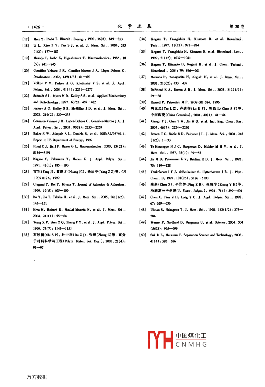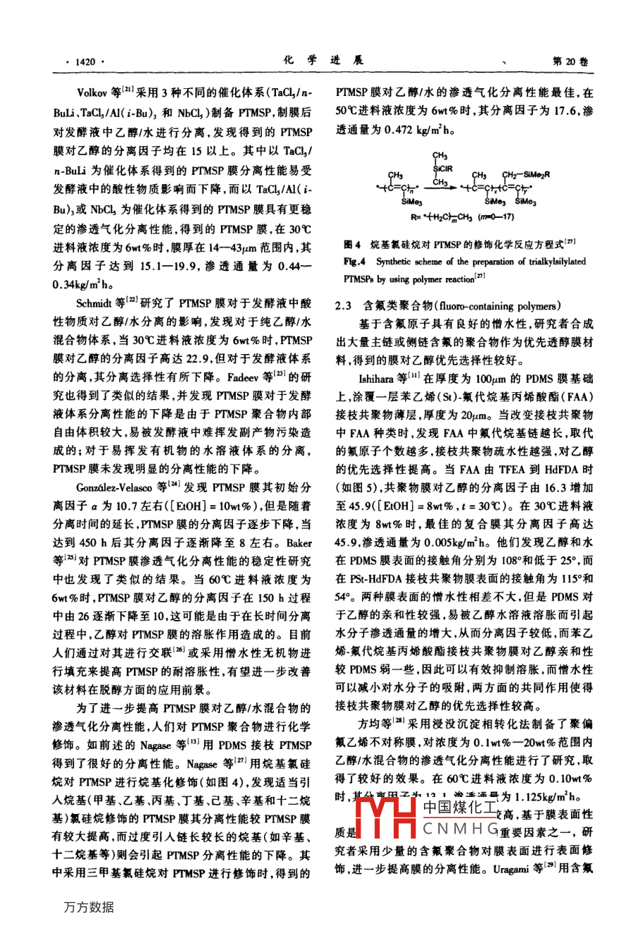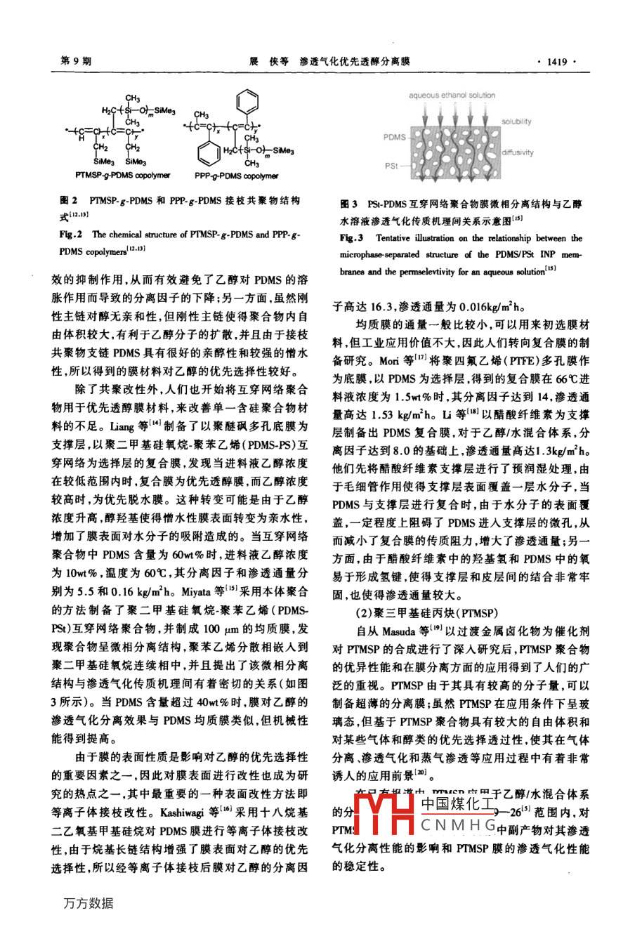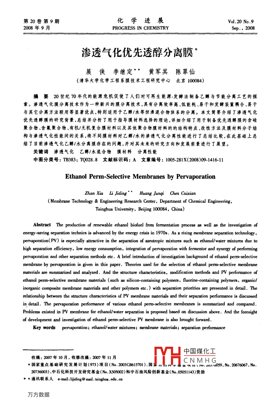 第20卷第9期化學(xué)進(jìn)展Vol 20 No. 92008年9月PROGRESS IN CHEMISTRY滲透氣化優(yōu)先透醇分離膜展俠李繼定∵·黃軍其陳翠仙(清華大學(xué)化學(xué)工程系膜技術(shù)工程研究中心北京10004)摘要20世紀(jì)70年代的能源危機(jī)促使了人們對(duì)可再生能源發(fā)酵法制備乙醇與節(jié)能分離工藝的探索。滲透氣化膜分高技術(shù)作為一種新興的膜分離技術(shù),具有分離效率高、低能耗、易于和發(fā)酵裝置橢合、易于與其它分離方法聯(lián)用等顯著優(yōu)點(diǎn),特別適用于乙醇/水等恒沸混合物體系的分離。本文簡(jiǎn)要介紹了滲透氣化優(yōu)先透醇膜的研究背景,總結(jié)并分析了用于指導(dǎo)膜材料選擇的理論,詳細(xì)介紹了用于制備優(yōu)先透醇膜的含硅聚合物、含氟聚合物、有機(jī)/無(wú)機(jī)復(fù)合膜材料以及其他聚合物膜材料的的結(jié)構(gòu)特點(diǎn)、改性方法及膜材料分子結(jié)構(gòu)與滲透氣化性能間的關(guān)系,將不同膜材料對(duì)乙醇/水的滲透氣化分離性能進(jìn)行了總結(jié)比軟,在此基礎(chǔ)上總結(jié)了目前滲透氣化乙醇/水分離膜存在的問(wèn)題,并對(duì)其未來(lái)的研究方向和發(fā)展前景進(jìn)行了展望。關(guān)鍵詞滲透氣化乙醇/水混合物膜材料分離性能中圖分類號(hào):TB383;TQ028.8文獻(xiàn)標(biāo)識(shí)碼:A文章編號(hào):1005-281X(2008)091416-11Ethanol Perm-Selective Membranes by PervaporationZhan Xia Li Jiding Huang Jungi Chen CuixianMembrane Technology Engineering Research Center, Department of Chemical EngineeringTsinghua University, Beijing 100084, China)Abstract The production of renewable ethanol biofuel from fermentation process as well as the investigation ofenergy-saving separation technics is advanced by the energy crisis in 19709. As a rising membrane separation technologypervaporation( PV)is especially attractive in the separation of azeotropic mixtures such as ethanol/water mixtures due tohigh separation efficiency, low energy consumption, integration of pervaporation with fermentor and synergy of performingpervaporation and other separation methods etc. A brief introduction of investigation background of ethanol perm-selectivemembrane by pervaporation is given in this paper. Theories used for the selection of ethanol perm-selective membranematerials are summarized and analyzed. And the structure characteristics, modification methods and Pv performance ofthanol perm selective membrane materials (such as silicon-containing polymers, fluorine-containing polymers, organic/inorganic composite membrane materials and other polymers etc. )with separation priorities are presented in detail. Threlationship between the structure characteristics of PV membrane materials and their separation performance is discussedin detail. The pervaporation performance of various ethanol perm-selective membranes is summarized and comparedProblems existed in PV membrane for ethanol/ water separation is proposed based on discussion above. And the foresightof development and investigation of ethanol perm-selective Pv membrane is also brought forwardKey words pervaporation; ethanol/water mixtures; membrane materials; separation performance中國(guó)煤化工收稿:2007年10月,收修改稿:2007年11月CNMHG國(guó)家重點(diǎn)基礎(chǔ)研究發(fā)展計(jì)劃(973)項(xiàng)目(No,2003CB61570)、國(guó)泵十基宣日1.a1059,No.20676067,N20736003)、中石化科技開(kāi)發(fā)研究基金(NX505002)和中石油風(fēng)險(xiǎn)創(chuàng)新基金(N,05051143)資助通訊聯(lián)系人 e-mail: lidding@ mail. tsinghua,咖h,c第9期展俠等滲透氣化優(yōu)先透醇分離膜14171引言首先提出,定義為內(nèi)聚能密度的平方根,它可以表征分子間的作用力的大小。作為膜材料選擇性的初步隨著全球能源危機(jī)和環(huán)境危機(jī)的到來(lái),迫使人評(píng)估,采用溶解度參數(shù)理論對(duì)膜材料進(jìn)行選擇是非們尋求新能源來(lái)代替石油等不可再生能源。其中生常簡(jiǎn)便有效的。物乙醇燃料( alcohol biofuel)作為一種清潔能源,不僅除了以上常用的3種膜材料選擇理論和預(yù)測(cè)方污染較低,且是一種可再生能源,引起世界各國(guó)的廣法以外,還有表面熱力學(xué)法、液相色譜法、接觸角法、泛關(guān)注。目前歐美和日本等發(fā)達(dá)國(guó)家已經(jīng)不同程定性親憎水理論和極性參數(shù)等方法。度地將生物乙醇代替部分石油,并致力于大規(guī)模生結(jié)合膜材料的各種選擇理論和表1中乙醇、水產(chǎn)生物乙醇燃料以緩解能源危機(jī)。的溶解度參數(shù)等物理量進(jìn)行分析可知:乙醇分子的在生物發(fā)酵制備乙醇過(guò)程中,隨著發(fā)酵液中乙極性與水分子相比較弱,其溶解度參數(shù)及各分量均醇濃度的增大(5w%-8wt%),微生物發(fā)酵菌中毒較低,且動(dòng)力學(xué)半徑較大,因此呈非極性或弱極性、失效對(duì)生成乙醇的發(fā)酵反應(yīng)有強(qiáng)烈抑制作用,用溶解度參數(shù)較小、表面能低、疏水性強(qiáng)、自由體積較滲透氣化膜分離技術(shù)就地將發(fā)酵液中的乙醇分離出大、滲透性較好的聚合物材料,與乙醇分子間的相互來(lái),可以避免乙醇對(duì)反應(yīng)的抑制作用提高發(fā)酵罐的作用力較大,與乙醇的相溶性較好,對(duì)乙醇的優(yōu)先吸生產(chǎn)能力,并可獲得高濃度乙醇。滲透氣化附溶解性較好,均有可能用作滲透氣化優(yōu)先透醇分( pervaporation)作為膜分離技術(shù)的一個(gè)新的分支,在離膜材料。用于液體混合物的分離時(shí),突出
