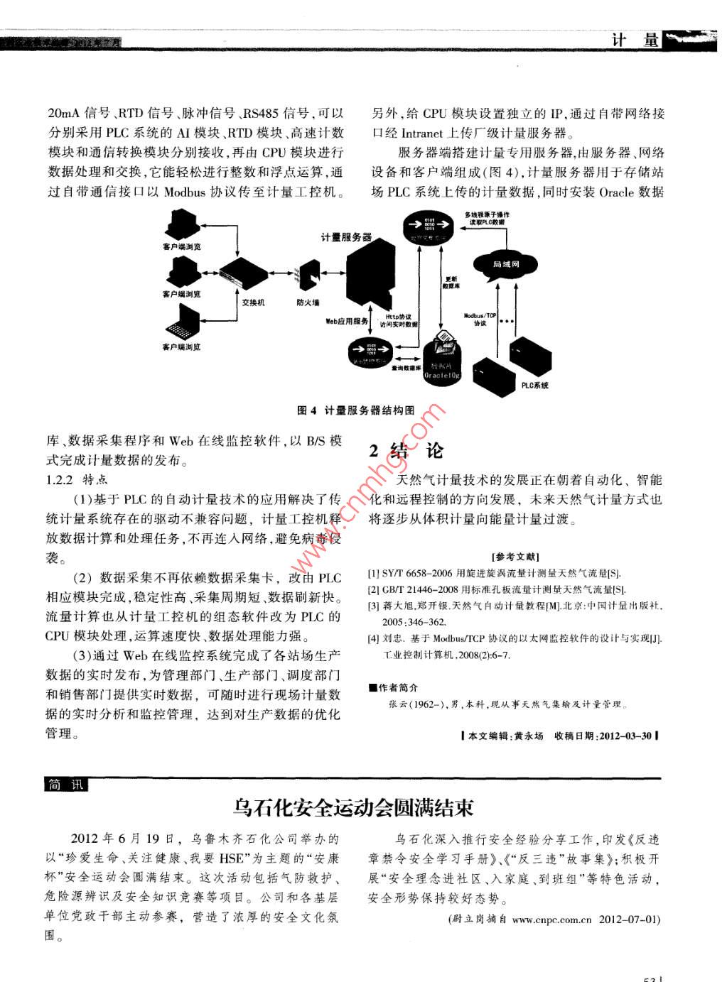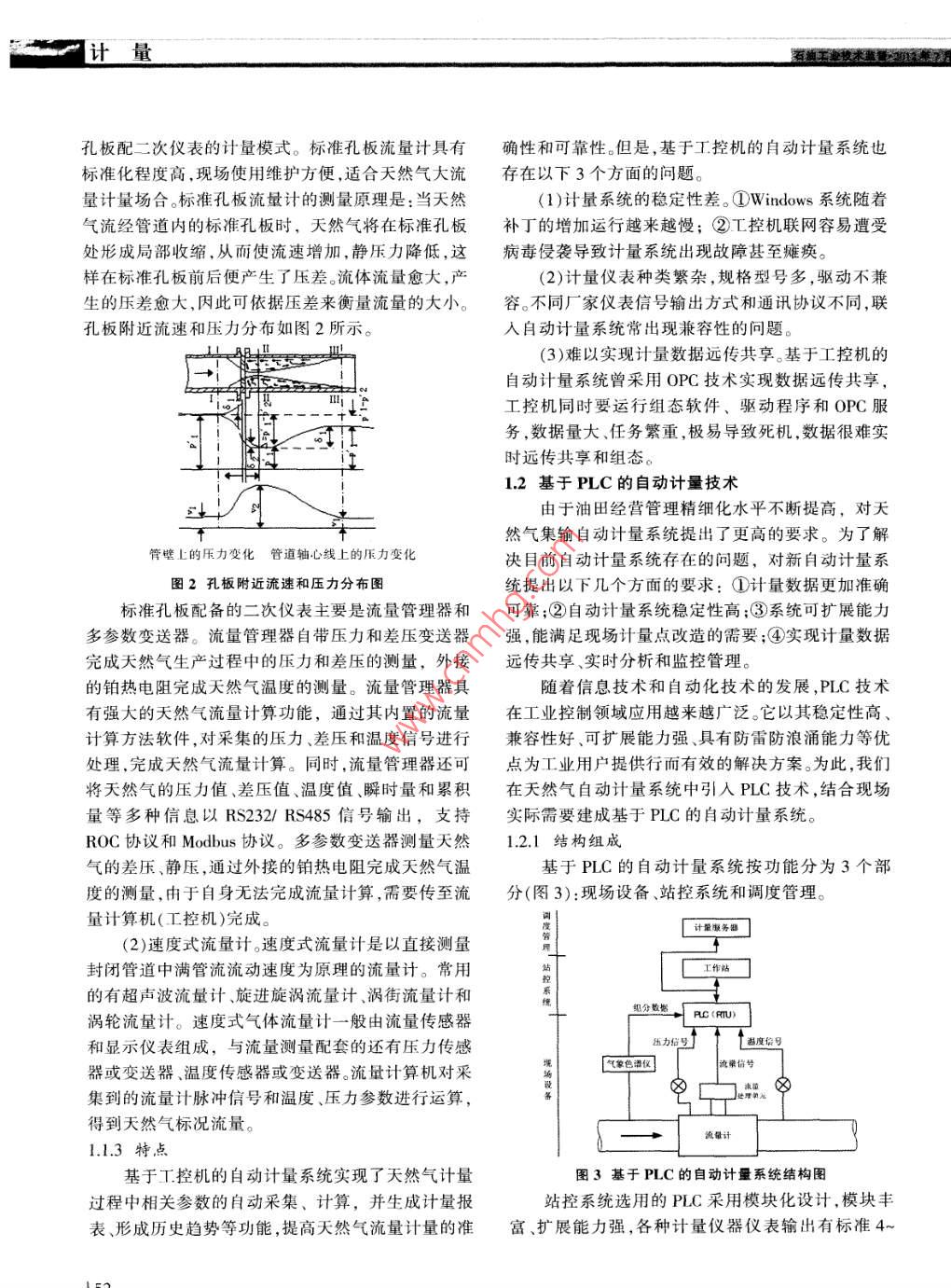 計(jì)量天然氣集輸計(jì)量技術(shù)的發(fā)展張?jiān)凄u潤(rùn)廖德云王存?zhèn)ブ袊?guó)石化中原油田分公司天然氣產(chǎn)銷(xiāo)廠(chǎng)(河南濮陽(yáng)457162)摘要隨著天然氣市場(chǎng)和業(yè)務(wù)的發(fā)展,計(jì)量技術(shù)顯得越來(lái)越重要。為降低生產(chǎn)成本、加強(qiáng)銷(xiāo)售監(jiān)督、優(yōu)化計(jì)量管理,中原油田天然氣產(chǎn)銷(xiāo)廠(chǎng)不斷提高計(jì)量技術(shù)水平,逐步實(shí)現(xiàn)計(jì)量精細(xì)化管理。關(guān)鍵詞天然氣自動(dòng)計(jì)量PLC流量計(jì)Abstract With the development of natural gas market and business, measuring technology appears to be more and more important. Inorder to reduce the production cost, strengthen the sale supervision, optimize measuring management, the natural gas production andsale factory in Zhongyuan oilfields constantly improve the measuring technology and gradually realize the fineness management ofKey words natural gas; automatic measurement; PLC; flowmeter天然氣作為一種清潔、高效的能源,其開(kāi)發(fā)利用基本形式之一,工控機(jī)作為計(jì)量系統(tǒng)的核心,實(shí)時(shí)采越來(lái)越受到重視。天然氣產(chǎn)銷(xiāo)廠(chǎng)是中原油田分公司集現(xiàn)場(chǎng)的壓力、差壓、溫度、熱值、流量等天然氣工況下屬的集天然氣勘探、開(kāi)發(fā)、生產(chǎn)、集輸為一體的專(zhuān)參數(shù),通過(guò)工控機(jī)組態(tài)軟件完成天然氣流量計(jì)算,并業(yè)化單位。天然氣計(jì)量包括天然氣集輸過(guò)程中壓力、具有存儲(chǔ)歷史數(shù)據(jù)、報(bào)表和歷史趨線(xiàn)、報(bào)警和流程動(dòng)溫度、熱值、流量(能量流量和質(zhì)量流量)的測(cè)量,是畫(huà)等功能,如連人網(wǎng)絡(luò)也可以將計(jì)量數(shù)據(jù)向管理層整個(gè)生產(chǎn)經(jīng)營(yíng)過(guò)程中一項(xiàng)很重要的基礎(chǔ)工作,是生延伸產(chǎn)、經(jīng)營(yíng)中重要的控制參數(shù),計(jì)量數(shù)據(jù)的準(zhǔn)確性直接基于工控機(jī)的自動(dòng)計(jì)量系統(tǒng)按功能主要分為兩影響企業(yè)效益。同時(shí),準(zhǔn)確計(jì)量還是集輸管網(wǎng)安全運(yùn)個(gè)部分(圖1):現(xiàn)場(chǎng)設(shè)備和站控系統(tǒng)行的“眼睛”,是指導(dǎo)我們科學(xué)合理組織、調(diào)配、控制(1)站控系統(tǒng):包括流量計(jì)算機(jī)、數(shù)據(jù)采集鏈路和巡線(xiàn)的依據(jù)。天然氣產(chǎn)銷(xiāo)廠(chǎng)計(jì)量技術(shù)的發(fā)展經(jīng)歷T作站等;了人工取數(shù)、電話(huà)匯報(bào),基于工業(yè)控制計(jì)算機(jī)(以下(2)現(xiàn)場(chǎng)設(shè)備:主要是進(jìn)行天然氣參數(shù)測(cè)量的各簡(jiǎn)稱(chēng)工控機(jī))的自動(dòng)計(jì)量技術(shù)以及基于PLC的自動(dòng)種計(jì)量?jī)x表。計(jì)量技術(shù)發(fā)展3個(gè)階段。1.1.2儀表選型1計(jì)量技術(shù)發(fā)展根據(jù)天然氣集輸氣量和運(yùn)行壓力,選用的計(jì)量?jī)x表主要分為差壓式流量計(jì)和速度式流量計(jì)。早期計(jì)量技術(shù)采用機(jī)械式計(jì)量?jī)x表,比如雙波工作站紋管差壓計(jì),通過(guò)從記錄曲線(xiàn)上取值的方式進(jìn)行計(jì)量,存在計(jì)量數(shù)據(jù)準(zhǔn)確性受人為因素影響,匯報(bào)不及站控系統(tǒng)組分?jǐn)?shù)據(jù)時(shí)等缺點(diǎn)。后來(lái)發(fā)展成變送器配積算儀的計(jì)量方式,流量計(jì)算機(jī)這種方式避免了從記錄曲線(xiàn)上取值帶來(lái)的人為附加壓力信號(hào)溫度信號(hào)氣象色譜儀流量信號(hào)誤差。隨著計(jì)算機(jī)技術(shù)和自動(dòng)控制技術(shù)的應(yīng)用,發(fā)展成基于工控機(jī)的自動(dòng)計(jì)量系統(tǒng)和基于PLC的自動(dòng)計(jì)量系統(tǒng)。流量計(jì)1.1基于工控機(jī)的自動(dòng)計(jì)量技術(shù)1.1.1結(jié)構(gòu)組成圖1基于工控機(jī)的自動(dòng)計(jì)量系統(tǒng)結(jié)構(gòu)圖基于工控機(jī)的自動(dòng)計(jì)量技術(shù)是計(jì)量技術(shù)發(fā)展的(1)孔板流量計(jì)。天然氣集輸系統(tǒng)大多采用標(biāo)準(zhǔn)計(jì)量孔板配二次儀表的計(jì)量模式。標(biāo)準(zhǔn)孔板流量計(jì)具有確性和可靠性。但是,基于工控機(jī)的自動(dòng)計(jì)量系統(tǒng)也標(biāo)準(zhǔn)化程度高,現(xiàn)場(chǎng)使用維護(hù)方便,適合天然氣大流存在以下3個(gè)方面的問(wèn)題量計(jì)量場(chǎng)合。標(biāo)準(zhǔn)孔板流量計(jì)的測(cè)量原理是:當(dāng)天然(1)計(jì)量系統(tǒng)的穩(wěn)定性差。① Windows系統(tǒng)隨著氣流經(jīng)管道內(nèi)的標(biāo)準(zhǔn)孔板時(shí),天然氣將在標(biāo)準(zhǔn)孔板補(bǔ)丁的增加運(yùn)行越來(lái)越慢;②工控機(jī)聯(lián)網(wǎng)容易遭受處形成局部收縮,從而使流速增加,靜壓力降低,這病毒侵襲導(dǎo)致計(jì)量系統(tǒng)出現(xiàn)故障甚至癱瘓樣在標(biāo)準(zhǔn)孔板前后便產(chǎn)生了壓差。流體流量愈大,產(chǎn)(2)計(jì)量?jī)x表種類(lèi)繁雜,規(guī)格型號(hào)多,驅(qū)動(dòng)不兼生的壓差愈大,因此可依據(jù)壓差來(lái)衡量流量的大小。容。不同廠(chǎng)家儀表信號(hào)輸出方式和通訊協(xié)議不同,聯(lián)孔板附近流速和壓力分布如圖2所示。人自動(dòng)計(jì)量系統(tǒng)常出現(xiàn)兼容性的問(wèn)題。(3)難以實(shí)現(xiàn)計(jì)量