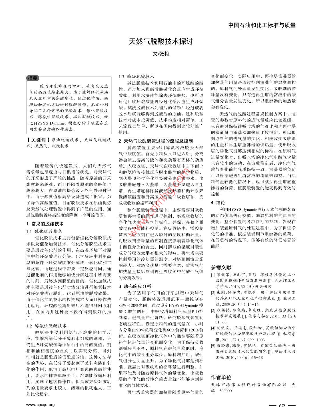 中國石油和化工標(biāo)準(zhǔn)與質(zhì)量天然氣脫酸技術(shù)探討文脹張艷1.3堿法脫酸技術(shù)變化而變化。實際應(yīng)用中,再生塔重沸器的隨著開采難度的增加,原油及天然法脫酸技術(shù)利用石油中的環(huán)烷酸的酸加熱蒸氣用量是通過控制重沸氣的溫度調(diào)控氣的高酸值越來越大。為了能夠降低原油性,通過加入強(qiáng)堿后酸堿化合反應(yīng)生成環(huán)烷的。原料氣的處理量發(fā)生變化,吸收劑的循及天然氣中的高酸度值,通過化學(xué)法、物酸鹽。利用水洗就能除去環(huán)烷酸鹽,也可以環(huán)量沒有變化,只有進(jìn)再生塔的富液中的酸理法和其他方法進(jìn)行脫酸操作,本文分別通過回收環(huán)烷酸鹽再經(jīng)過化學(xué)反應(yīng)生成環(huán)烷氣組分含量發(fā)生變化,所以重沸器的加熱量介紹了幾種常見的脫酸技術(shù):催化脫酸技酸。堿洗脫酸技術(shù)處理后的餾粉油經(jīng)過破乳會有變化。術(shù)、醇氨法脫酸技術(shù)、堿法脫酸技術(shù),脫水后就能夠得到脫酸后的原油。這種脫酸天然氣的脫酸過程常規(guī)控制方案中,裝過 HYSYS Dynamic模型分析了裝置在應(yīng)技術(shù)對成本投資低,技術(shù)難度相對簡單,工置的參數(shù)對原料氣的進(jìn)氣量反應(yīng)比較遲緩。用需要注意的各種因素。藝流程也簡單,所以在國內(nèi)得到比較好推廣只有通過保持進(jìn)吸收塔的氣液比和進(jìn)再生塔使用。的富液量與重沸器加熱量比較恒定,可以根【關(guān)鍵詞】原油脫酸技術(shù);天然氣脫酸技2天然氣脫酸裝置過程的流程及控制據(jù)原料氣的進(jìn)氣量的變化,相應(yīng)改變吸收劑術(shù);天然氣;脫酸技術(shù)脫酸裝置主要采用醇氨溶液脫去天然的用量和再生塔重沸器的供熱量,使出吸收氣中酸度值。首先原料從入口進(jìn)入后,分離塔的凈化氣能夠達(dá)到相應(yīng)的標(biāo)準(zhǔn)。在原料氣器會除去游離的液體和夾雜帶有固體的雜質(zhì)進(jìn)量變化時,出吸收塔的凈化氣中酸氣含量只有較小的波動,在參數(shù)穩(wěn)定后,凈化氣氣隨著經(jīng)濟(jì)的快速發(fā)展,人們對天然氣后進(jìn)入吸收塔,天然氣在吸收塔中自下而上質(zhì)與變化前的氣質(zhì)保持一致。重沸器的負(fù)荷的開采形成了嚴(yán)峻的挑戰(zhàn)。隨著原油的開采到達(dá)塔頂經(jīng)過凈化器經(jīng)過分離后脫去水。出可以根據(jù)進(jìn)再生塔富液的流量來調(diào)整。當(dāng)原難度越來越難,而且伴隨著原油的高酸值吸收塔底進(jìn)入閃蒸罐,閃蒸罐升溫進(jìn)入再生料氣量較低的情況下,也可減少再生塔底重越來越大。在原油的提煉級天然氣處理過程塔,再生塔底排除貧液經(jīng)換熱器和循環(huán)泵降沸器的負(fù)荷,使脫酸裝置的能耗得到有效的中,由于酸度值很高給設(shè)備造成了損害。為低溶液溫度和升高壓力后返回吸收塔頂,完控制了降低高酸度值脫酸技術(shù)在原油提煉成吸收劑的循環(huán)利用4結(jié)論及天然氣處理裝置中得到了廣泛的應(yīng)用,通整個脫酸裝置流程中,主要需要對吸收利用 HYSYS Dynamic進(jìn)行天然氣脫酸裝置過脫酸裝置將高酸度值降到一個可控范圍。塔和再生塔的操作進(jìn)行控制,實現(xiàn)吸收塔的的動態(tài)仿真進(jìn)行模擬,隨著原料的氣流量的1常見的脫酸技術(shù)凈化氣達(dá)到天然氣的標(biāo)準(zhǔn),并保證在整個脫變化,整個裝置的各項指標(biāo)的控制,發(fā)現(xiàn)在酸過程中的能耗控制。在吸收塔中,需控制增加裝置原料氣的處理過程中,為了保證凈1.1催化脫酸技術(shù)催化脫酸技術(shù)主要包括催化分解脫酸技貧氨的吸收劑在進(jìn)入塔時的溫度和循環(huán)量化氣的標(biāo)準(zhǔn),依據(jù)裝置調(diào)節(jié)重沸器的負(fù)荷,對吸收劑循環(huán)量的控制直接影響著凈化氣體在低負(fù)荷的情況下,能夠有效的降低裝置的術(shù)以及催化加氫技術(shù)。催化分解脫酸技術(shù)主中酸性介質(zhì)的含量,同時溶液的溫度對酸性能耗要是通過催化劑的作用,在高溫環(huán)境下對原油中的環(huán)烷酸進(jìn)行分解。化學(xué)反應(yīng)中利用高成分的吸收效果有很大的影響。再生塔主要溫的條件下環(huán)烷酸能夠分解成一氧化碳和一控制塔頂?shù)睦鋮s器的溫度,對塔頂回流量影氧化碳,而這過程中需要一定反應(yīng)時間,通響較大。對塔底熱量也需要注意,重沸氣的參考文獻(xiàn)加熱量直接影響到再生吸收劑中的酸性氣體的時間,最終達(dá)到脫酸的目的。催化加氫技的分離效果宋健軍,田元宇,王彭,塔設(shè)備性能的工業(yè)四因素模糊評價法及其應(yīng)用田.太原理工大術(shù)主要是通過催化劑對餾分油進(jìn)行加氫技術(shù)3動態(tài)響應(yīng)分析學(xué)學(xué)報,2010,32(5):518-519對環(huán)烷酸進(jìn)行脫出,達(dá)到原油的脫酸效果為了適用于氣田的開采過程中天然氣2朱剛,顧安忠,羅曉武,用于邊際氣田開發(fā)于催化加氫技術(shù)的投資成本大而且操作費產(chǎn)量變化,脫酸裝置適用范圍一般控制在的浮式野花天然氣生產(chǎn)儲卸裝置能源工用也高,環(huán)烷酸脫離出來后不能得到回收利83%-120%之間。通過設(shè)定 HYSYS Dynamic模程,20,20(4):14-16用,在國內(nèi)并這種技術(shù)沒有得到很好的推型(增加圖片)中吸收塔原料氣流量PID控]顏錫銘,李曉鷗,李東勝,潤發(f
