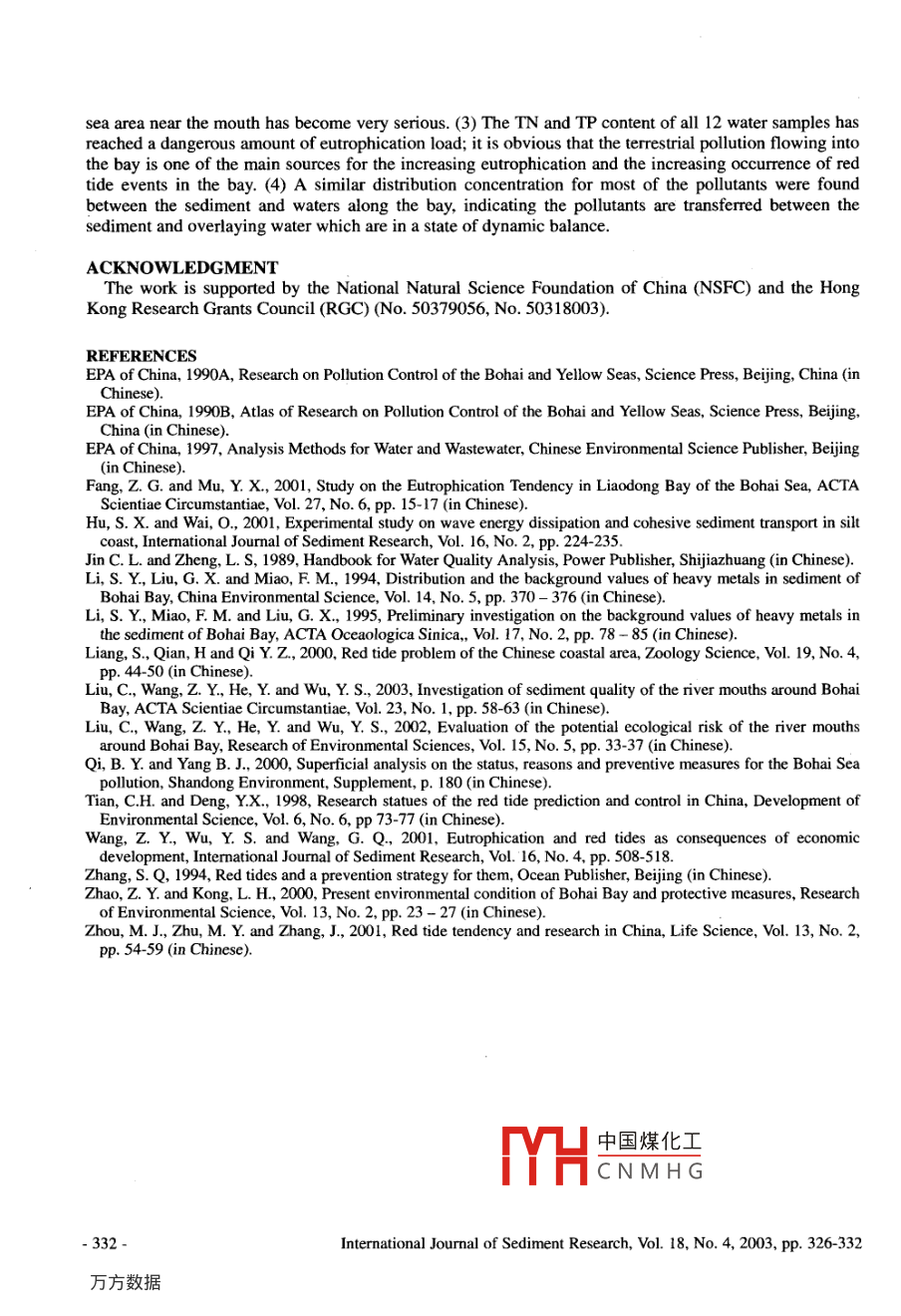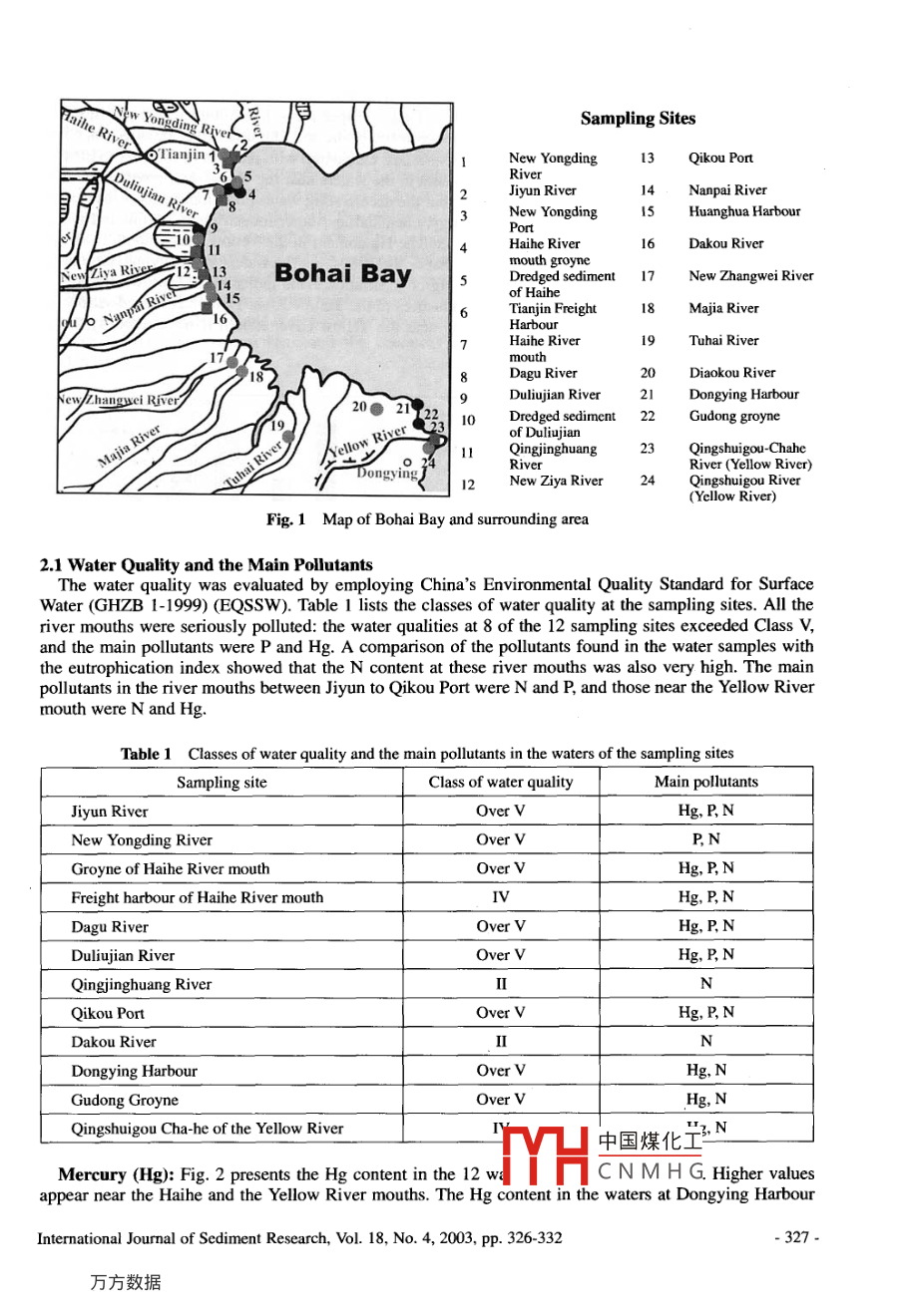 Technical NotesWATER POLLUTION IN THE RIVER MOUTHS AROUND BOHAI BAYCheng LIu', Zhao-Yin WANGI.2 and Yun HE'ABSTRACTTwelve water samples were collcted and analyzed. The samples were taken from the rivermouths around Bohai Bay including the Jiyun, New Yongding, Haihe, Dagu, Duliujian,Qingjinghuang, Qikou, Dakou, and Yellow Rivers, and tested for concentrations of heavy metals,arsenic, total nitrogen (TN) and total phosphorus (TP). The results show that the river mouths arepolluted and the water quality exceeds Class V of the Environmental Quality Standard for SurfaceWater (EQSSW). The main pollutants are Hg, nitrogen (N) and phosphorus (P). The concentrationsof the other pollutants are within Class II of the Standard. The Hg content in the Haihe River mouthis now 10 times higher than it was 20 years ago, indicating that the accelerating water pollution hasreached an alarming level. The high concentrations of N and P cause eutrophication of the waters.Analysis indicates that the terrestrial pollutants and nutrients are the main cause of frequentlyoccurring red tides in the Bohai Sea.Key Words: River mouth, Water quality, Pollution, Red tide, Bohai Bay1 INTRODUCTIONBohai Bay is in the northwest part of the Bohai Sea. Many large cities and industrial hubs are locatedaround the bay, including Beijing, Tianjin, Tangshan, Cangzhou, Huanghua, Binzhou and Dongying. Thearea has experienced quick economic development and urbanization and has become one of China'spolitical, economic and cultural centers. The rapid development and corresponding human activities havehad severe influences on the water environment. Recent investigations show that a large part of thecoastal waters of Bohai Bay have been polluted with concentrations of pollutants exceeding Class II ofthe Sea Water Quality Standard (GB 3097-1997) of China (Zhao et al., 2000). The pollution hasdeteriorated the ecology and reduced biodiversity of the waters. From 1983 to 1993, the number of fishspecies decreased from 85 to 74 in the estuary (Qi et al., 2000). The pollutants mainly originate inland,and are transported by the rivers flowing into the bay. These account for 87% of the total pollutants in thebay. Forty rivers carry 95% of the terrestrial-source pollutants and nutrients into the Bohai Bay (Zhao etal, 2000). This paper reports a recent field investigation of the bay and the results of analysis of thesamples taken from the river mouths around the bay.2 WATER QUALITY IN THE RIVER MOUTHS AROUND BOHAI BAYDuring June 6 to 10, 2001, the authors conducted a field investigation at the mouths of the NewYongding, Jiyun, Haihe, Dagu, Dulijian, Qingjinghuang, New Ziya, Nanpai, Dakou, New Zhangwei, .Majia, Tuhai and Yellow Rivers. These are the most important rivers flowing into the Bohai Bay. Twelvewater samples and 24 sediment samples at 19 river mouths were taken (Fig. 1). The water samples wereanalyzed for concentrations of Hg, Cu, Zn, As, Pb, total nitrogen (TN) and total phosphorus (TP) (Liu etal., 2002; Liu et al., 2003).Dr, Asso. Prof, International Research and Training Center on Erosion and Sedimentation, Beijing 100044,China, E-mail: chliu@ iwhr.comProf, Dept. of Hydraulic Engineering, Tsinghua University & International Research and Training Center onErosion and Sedimentation, Beijing, 100084, China, E-m中國煤化工3 China Institute of Water Resources and Hydropower ReseE-mail: he_ yun@ mail.hf.ah.cnfYHCNMH GNote: The manuscript of this paper was received in June 2002.The revised version was received in Nov. 2002.Discussion open until Dec.2004-326-Intermational Journal of Sediment Research, Vol. 18, No. 4, 2003, pp. 326-332Nw YOyonpdingRiveSampling SitesQTianjin 1New YongdingQikou PortRiverKQul5Jiyun RiverNanpai RiverHuanghua HarbourPortHaihe River6Dakou River11mouth groyneKeNZiya Rives 12Bohai BayDredged sedimentNew Zhangwei Riverof Haie....Tianjin Freight8Majia River16Harbour9Tuhai River,17mouth182Dagu RiverDiaokou RiverDuliujian RiverDongying HarbourFerw/zhangwci River20 e10Dredged sediment 22Gudong groyneof DuliujianQingjinghuang23Qingshuigou-ChaheRiver (Yellow River)Dongying, I1New Ziya RiverQingshuigou River(Yellow River)Fig. 1 Map of Bohai Bay and surrounding area2.1 Water Quality and the Main PollutantsThe water quality was evaluated by employing China's Environmental Quality Standard for SurfaceWater (GHZB 1-1999) (EQSSW). Table 1 lists the classes of water quality at the sampling sites. All theriver mouths were seriously polluted: the water qualities at 8 of the 12 sampling sites exceeded Class V,and the main pollutants were P and Hg. A comparison of the pollutants found in the water samples withthe eutrophication index showed that the N content at these river mouths was also very high. The mainpollutants in the river mouths between Jiyun to Qikou Port were N and P, and those near the Yellow Rivermouth were N and Hg.Table 1 Classes of water quality and the main pollutants in the waters of the sampling sitesSampling siteClass of water qualityMain pollutantsOver VHg, P, NNew Yongding RiverP, NGroyne of Haihe River mouthHg, P,NFreight harbour of Haihe River mouthI\Duliyjian RiverQingjinghuang RiverINHg, NGudong GroyneQingshuigou Cha-he of the Yellow River中國煤化工Mercury (Hg): Fig. 2 presents the Hg content in the 12 wTYHC N M H G. Higher valuesappear near the Haihe and the Yellow River mouths. The Hg content in the waters at Dongying HarbourInternational Jourmal of Sediment Research, Vol. 18, No.4, 2003, pp. 326-332-327.and Gudong Groyne was as high as 2.59 μg/L and 1.71 ug/L respectively, much higher than 1.0 μg/L,which is Class V of the EQSSW. The Hg content between the Haihe and Duliujian river mouths rangedform 0.71 to 1.13 μg/L, which shows relatively higher values. Compared with the data of the 1980s (EPAof China, 1990A; EPA of China, 1990B), the Hg content in the waters near the Haihe river mouth is nowroughly 10 times that of 20 years ago. This reflects that the accelerating water pollution, which is cause